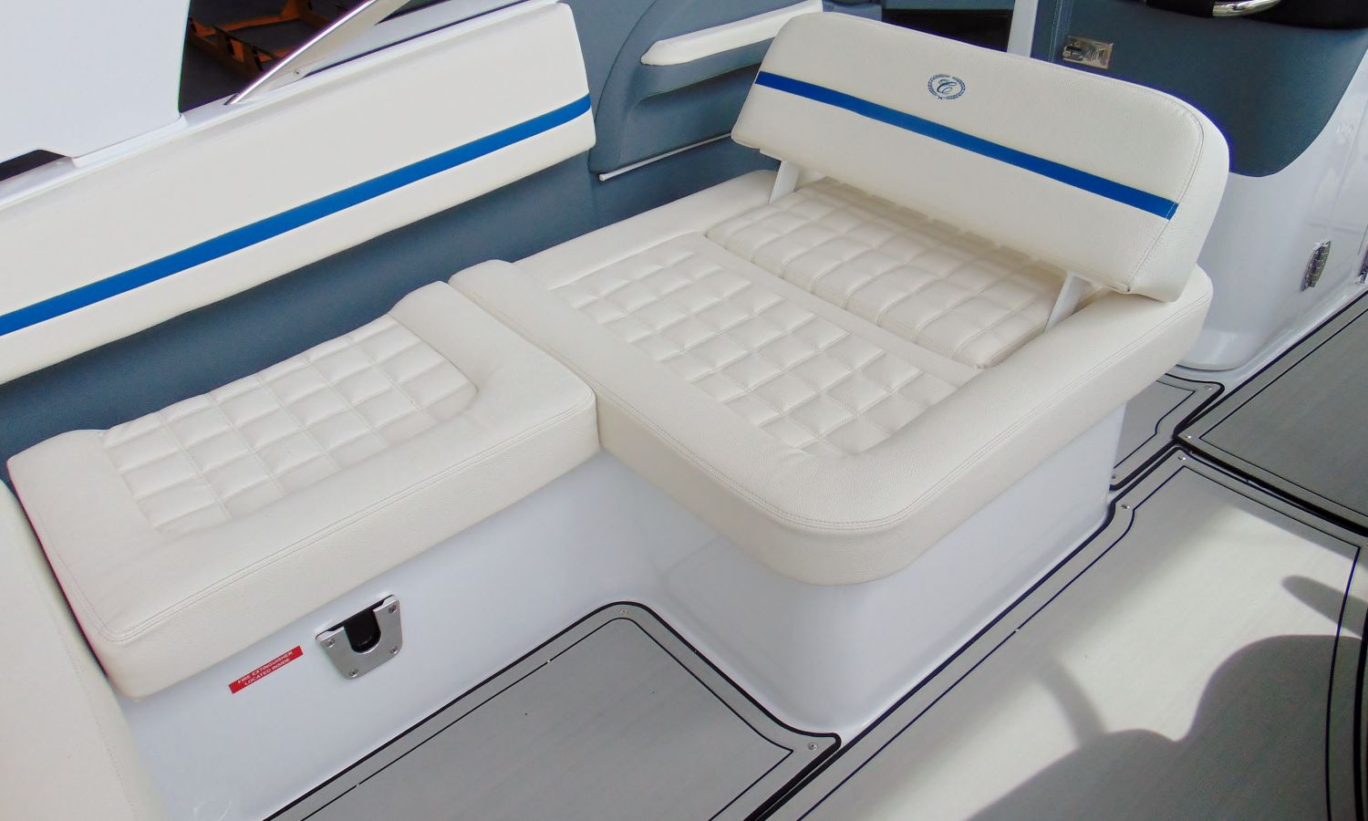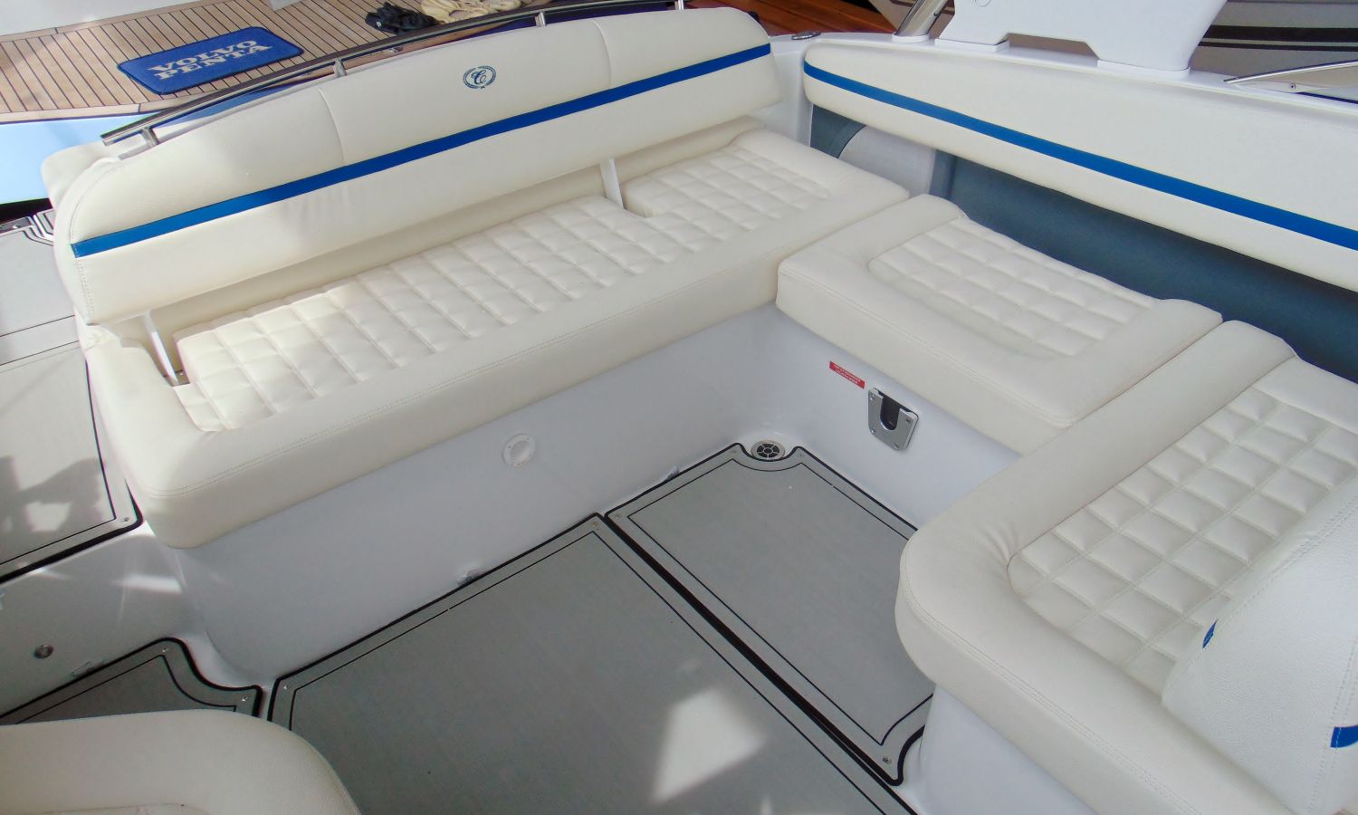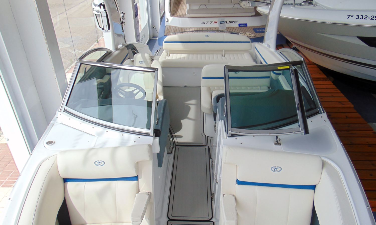 PACIFIC BLUE HULL WITH WHITE LINE (EDGE STRIPE) - BOW ANCHOR CANVAS AND COCKPIT COVER PACIFIC BLUE - TAIL POSITION INDICATOR - STAINLESS STEEL BOW LIGHTS - ENGINE ROOM HOOD WITH ELECTRIC OPENING - BATHROOM HATCH - TRITON WAKEBOARD SUPPORTS - SWIMMING PLATFORM SHOWER - BOW CUSHION CENTRAL SUPPLEMENT - COCKPIT TABLE - INTERIOR LED COCKPIT LIGHTS - TOILET SINK - GRAY SYNTHETIC MATERIAL ON COCKPIT FLOOR - STERN SOLARIUM EXTENSION - BATTERY CHARGER - AUTOMATIC EXTINGUISHING SYSTEM - ELECTRIC WINDLASS WITH ANCHOR AND CHAIN - DUAL BATTERY DISCONNECT - SHIPYARD-COSTA-BRAVA TRANSPORT.
