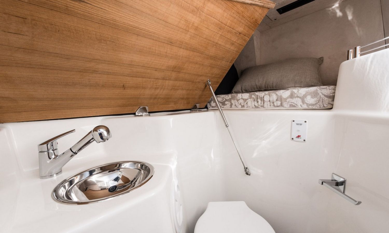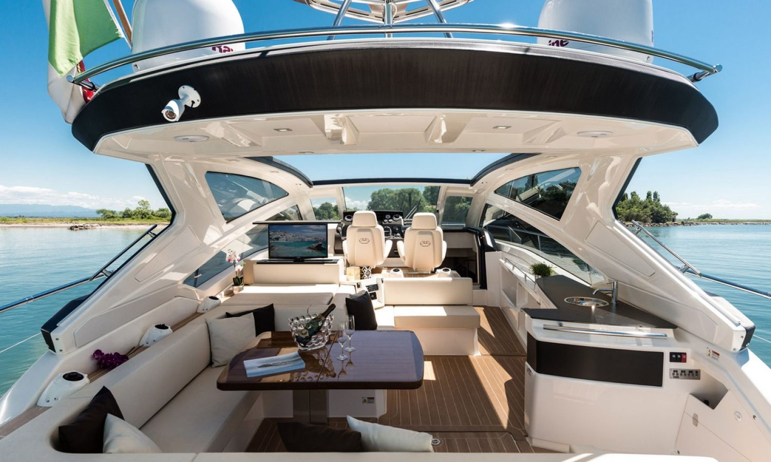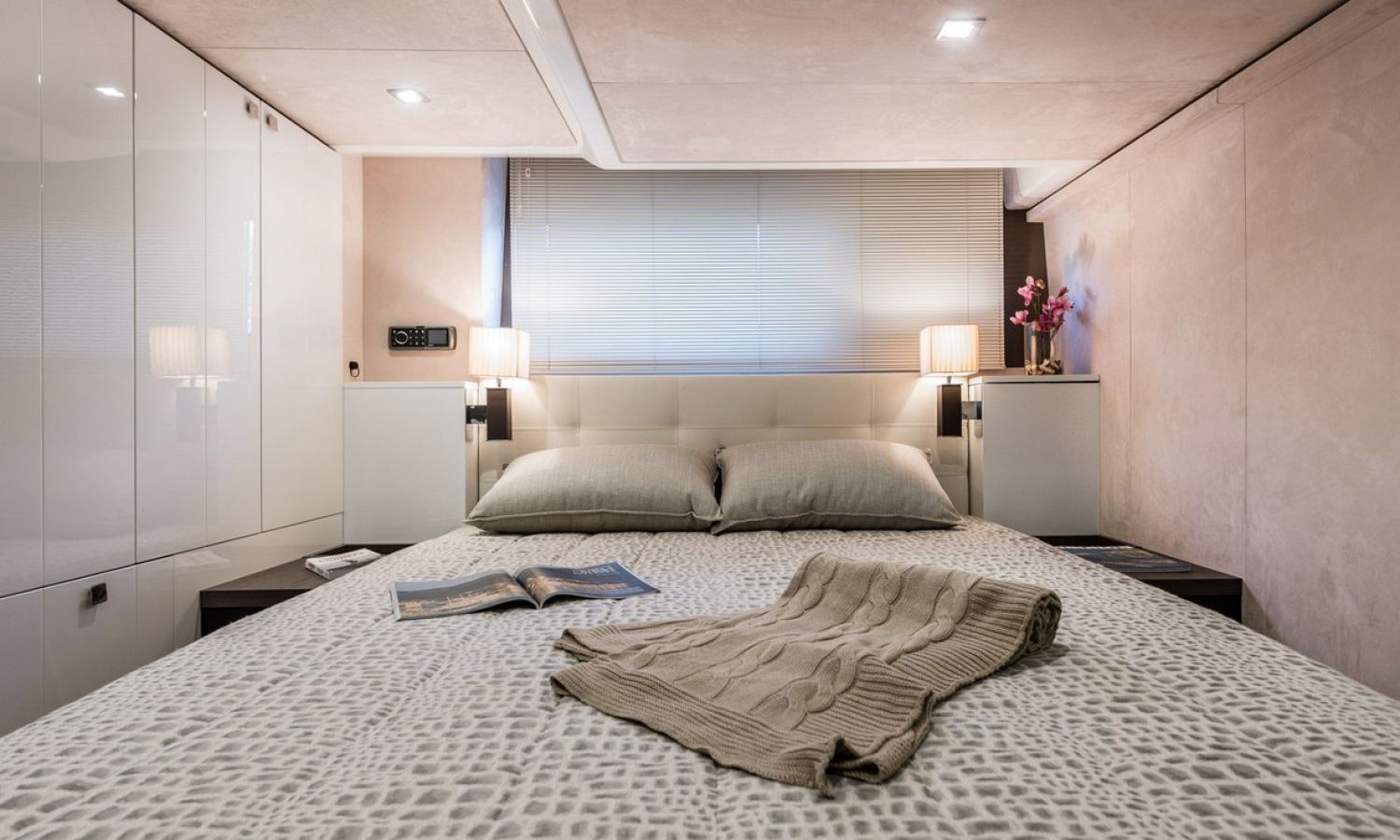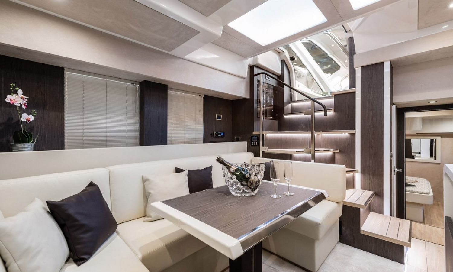 The boat offers a full standard equipment and is fitted with 3 cabins and 2 bathrooms, there is also the possibility of adding a crew cabin. You will enjoy a pleasent stay with the full equipped kitchen and the bright lounge offered by the soft top. Outside the large deck and the wide cockpit with the sunbathing area will provide great moments of leisure.