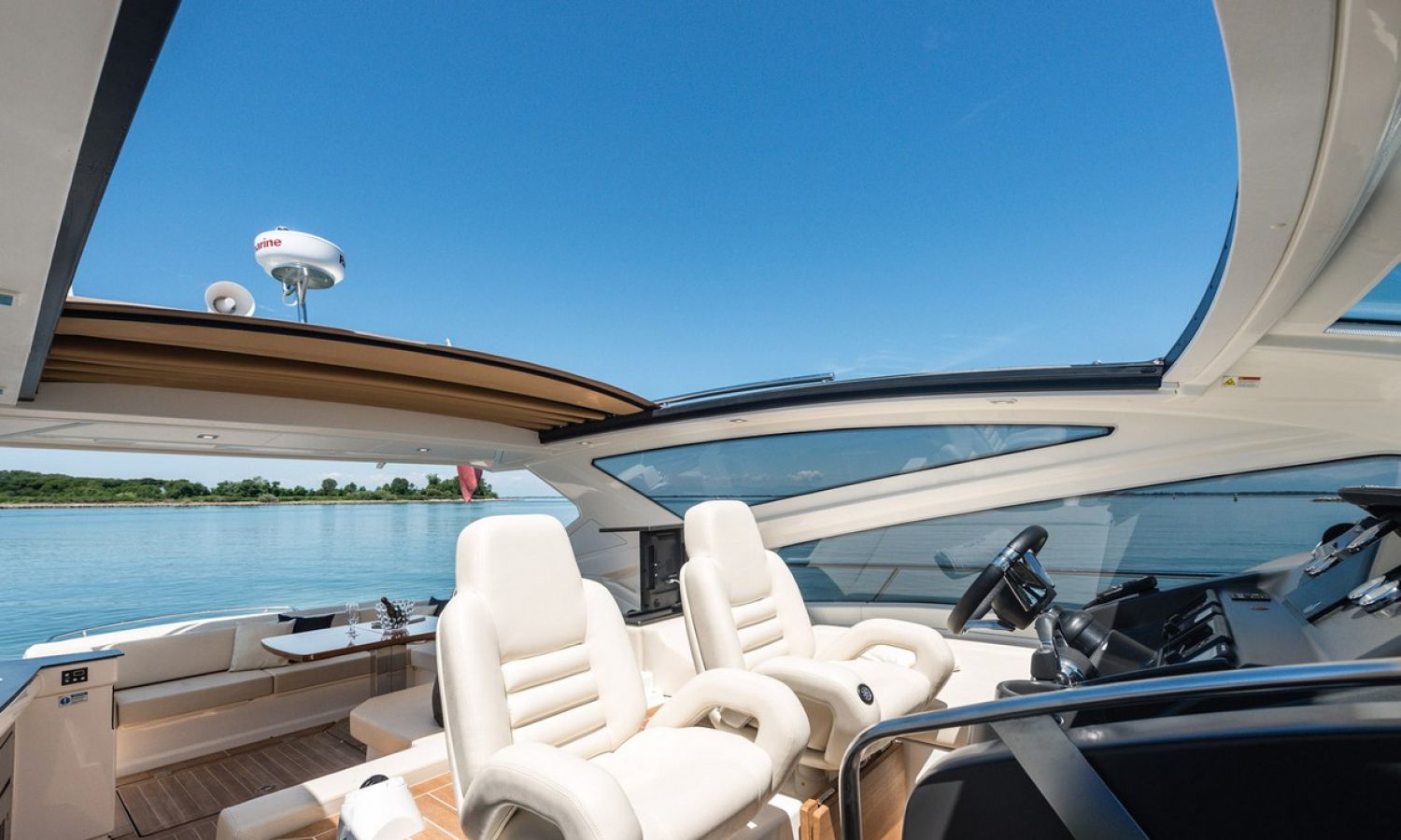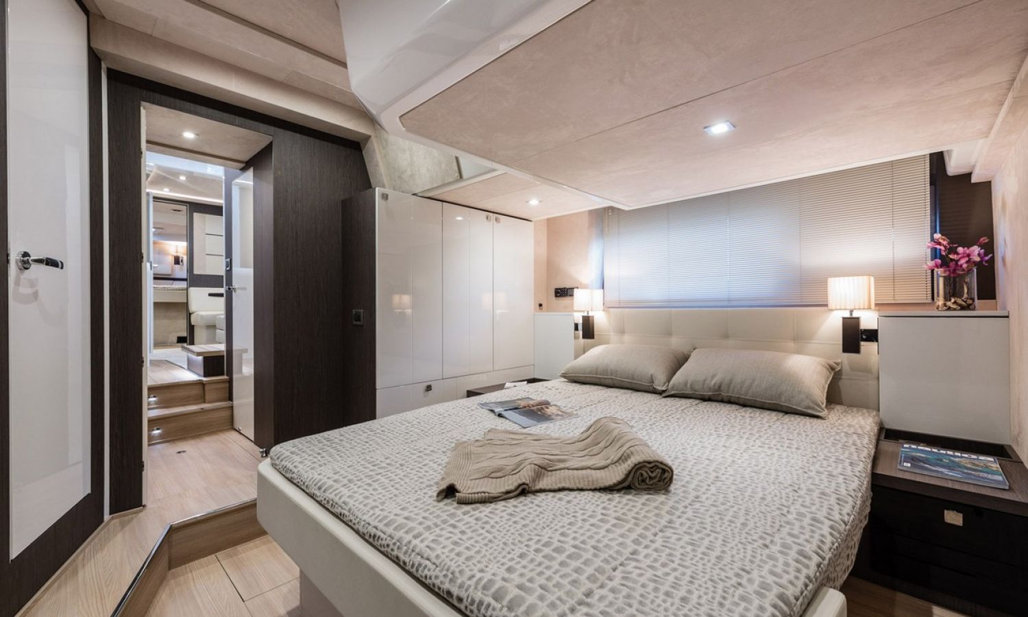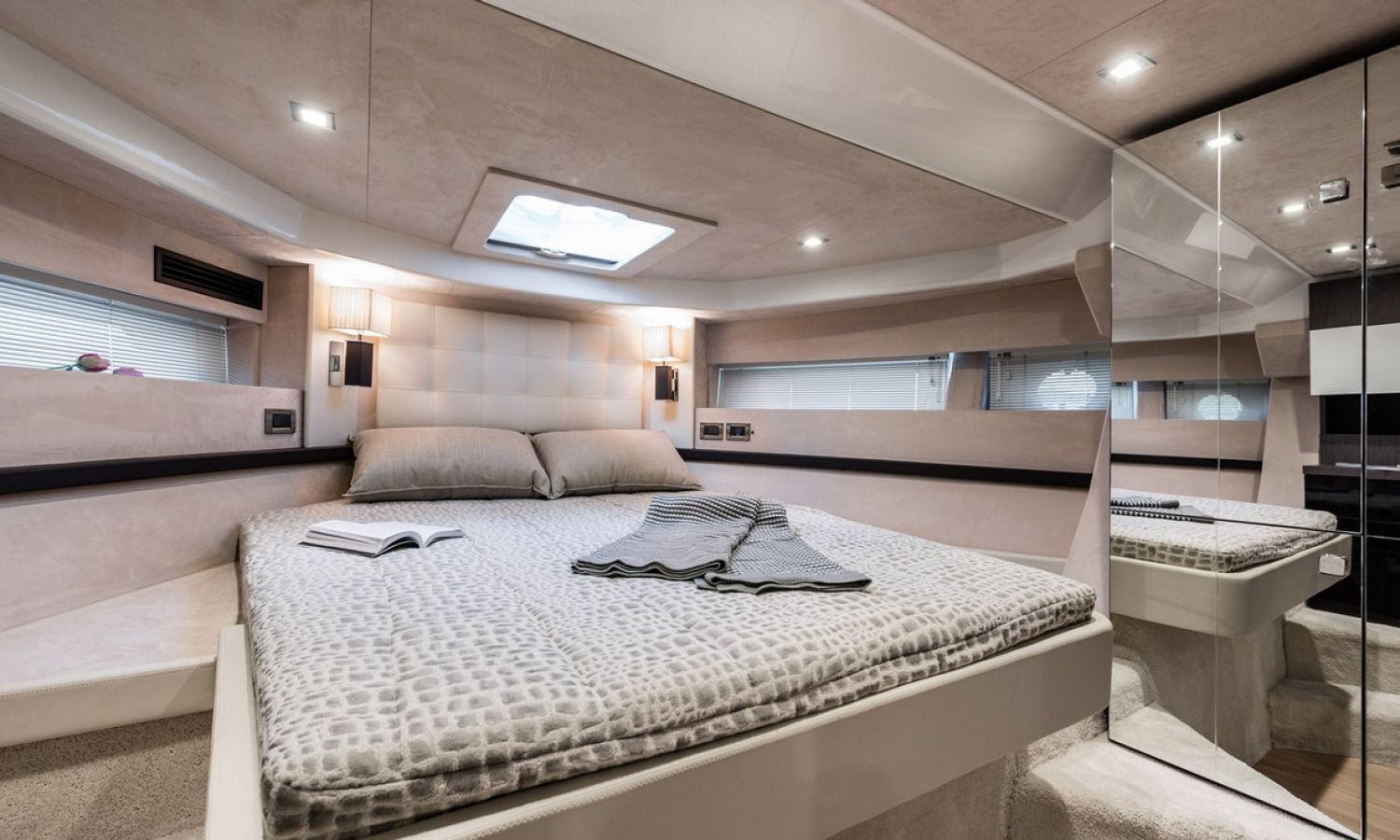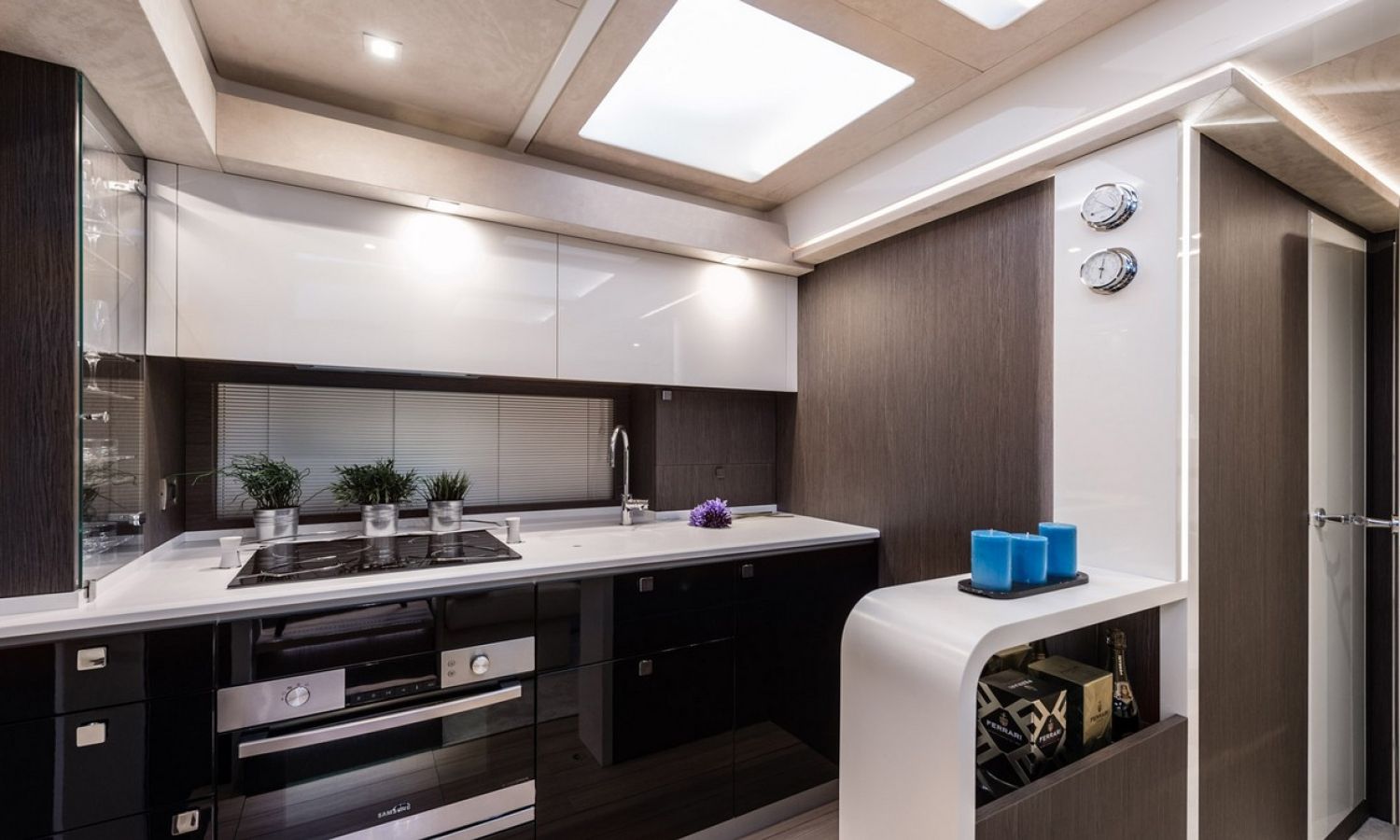 The boat offers a full standard equipment and is fitted with 3 cabins and 2 bathrooms, there is also the possibility of adding a crew cabin. You will enjoy a pleasent stay with the full equipped kitchen and the bright lounge offered by the soft top. Outside the large deck and the wide cockpit with the sunbathing area will provide great moments of leisure.