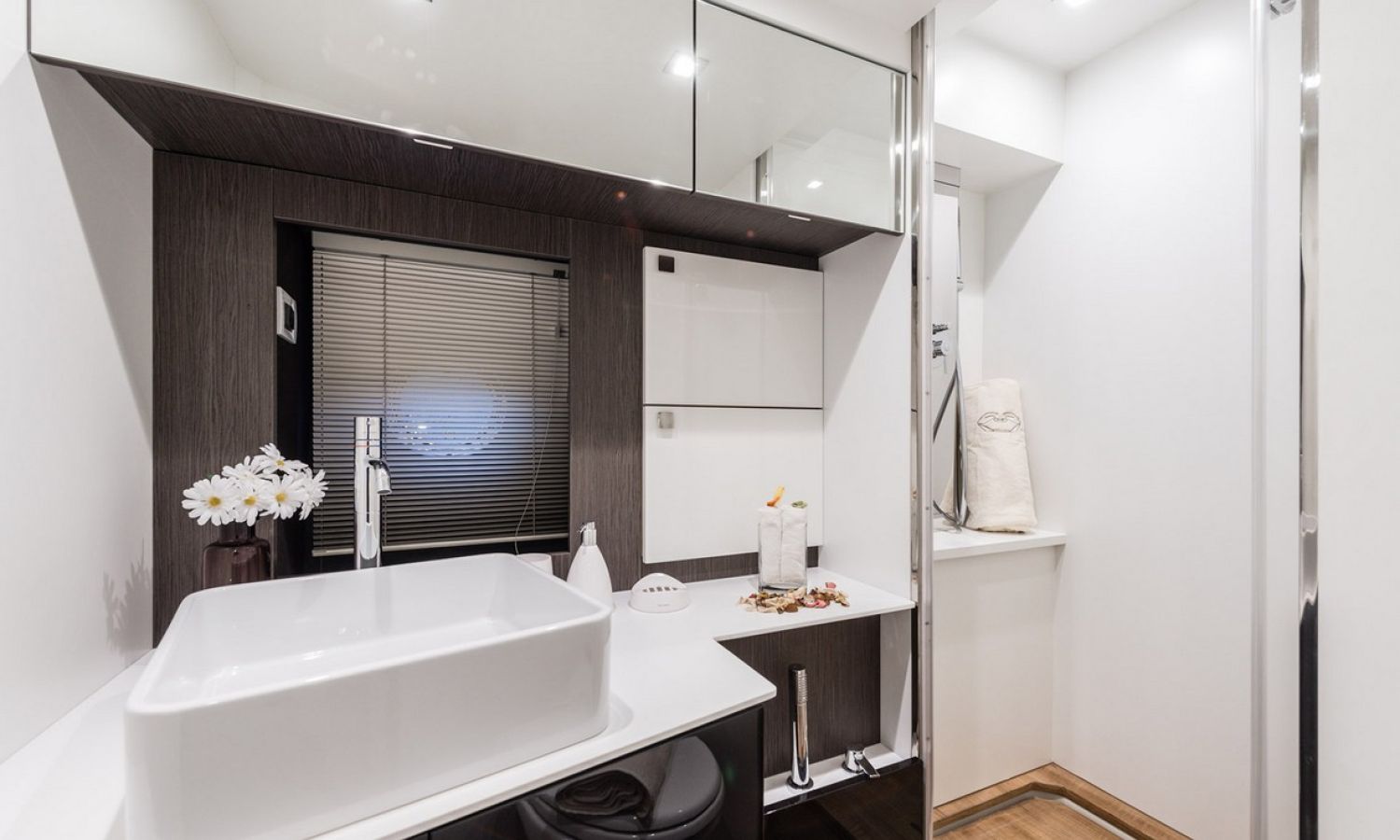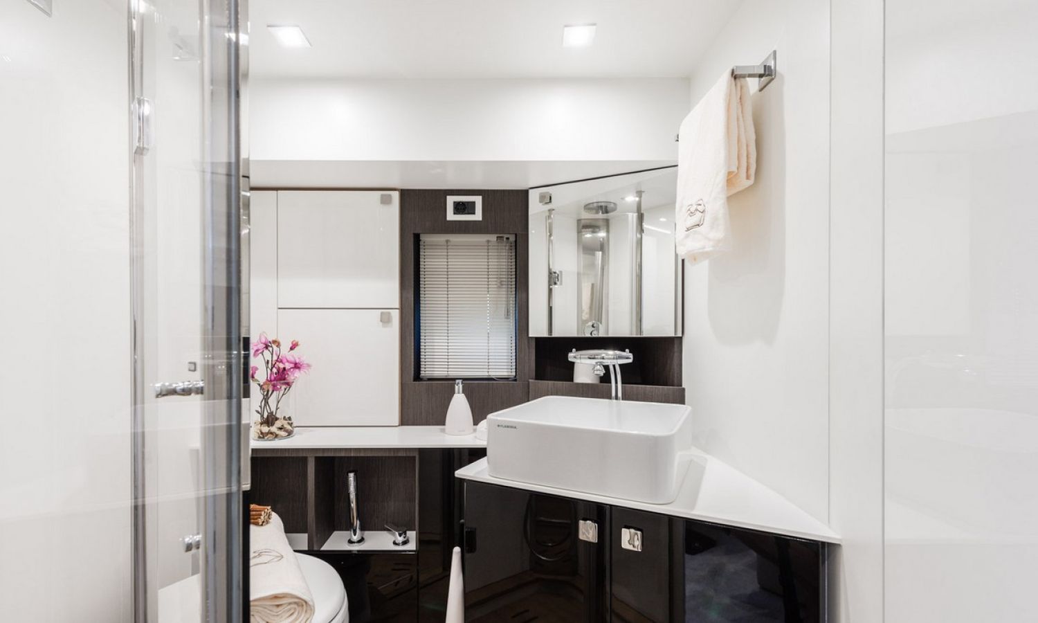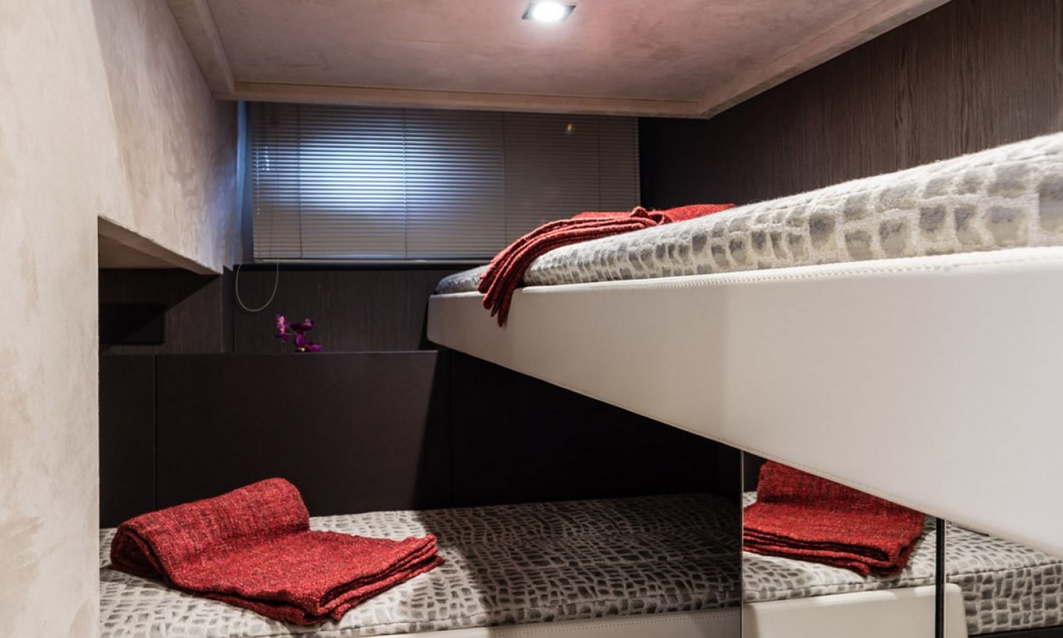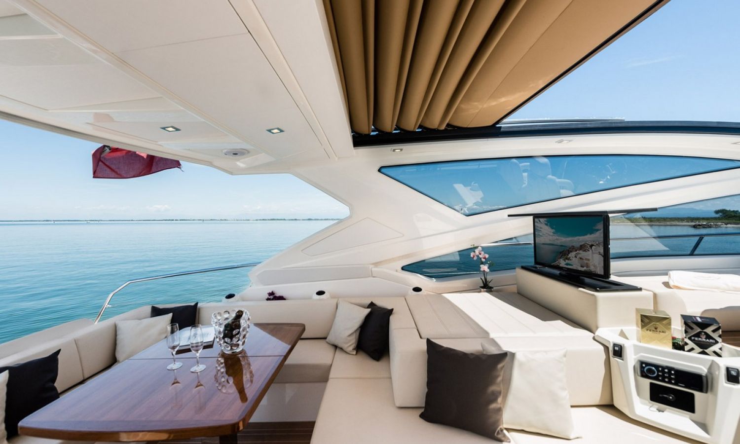 The boat offers a full standard equipment and is fitted with 3 cabins and 2 bathrooms, there is also the possibility of adding a crew cabin. You will enjoy a pleasent stay with the full equipped kitchen and the bright lounge offered by the soft top. Outside the large deck and the wide cockpit with the sunbathing area will provide great moments of leisure.