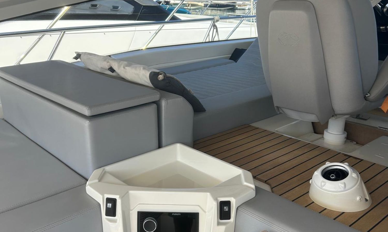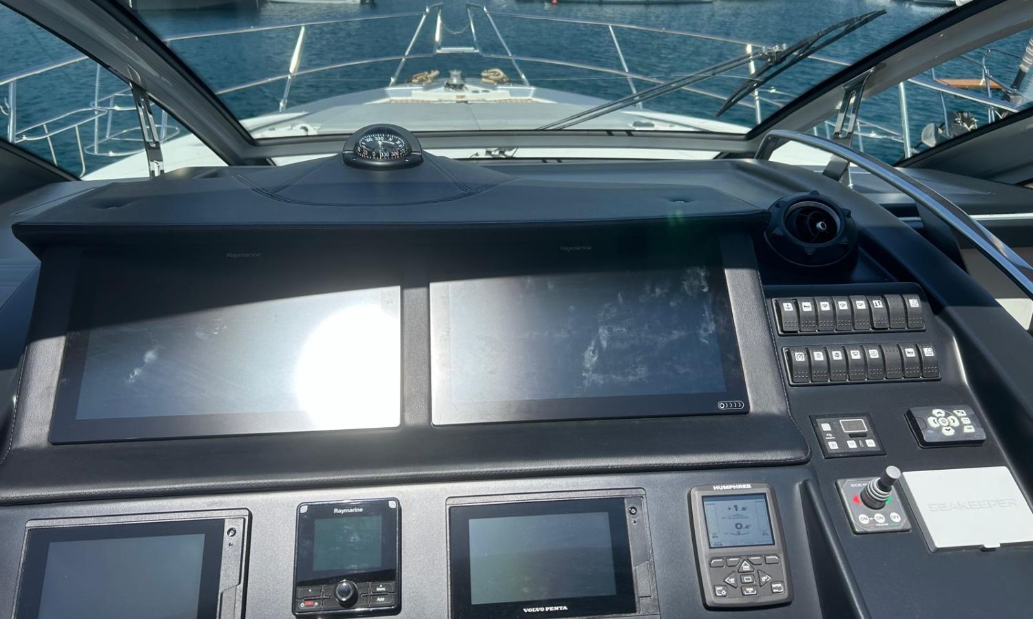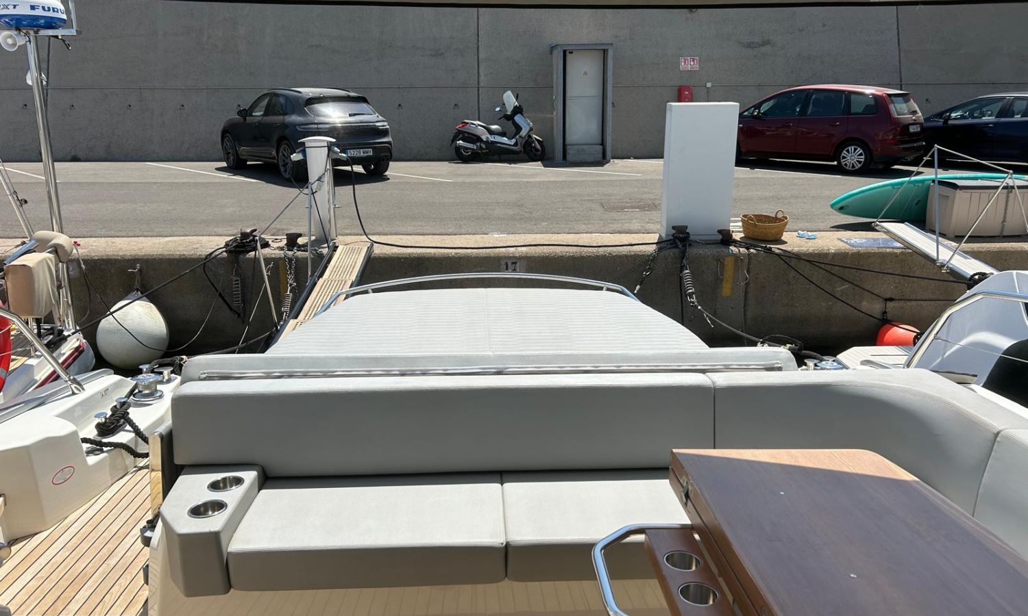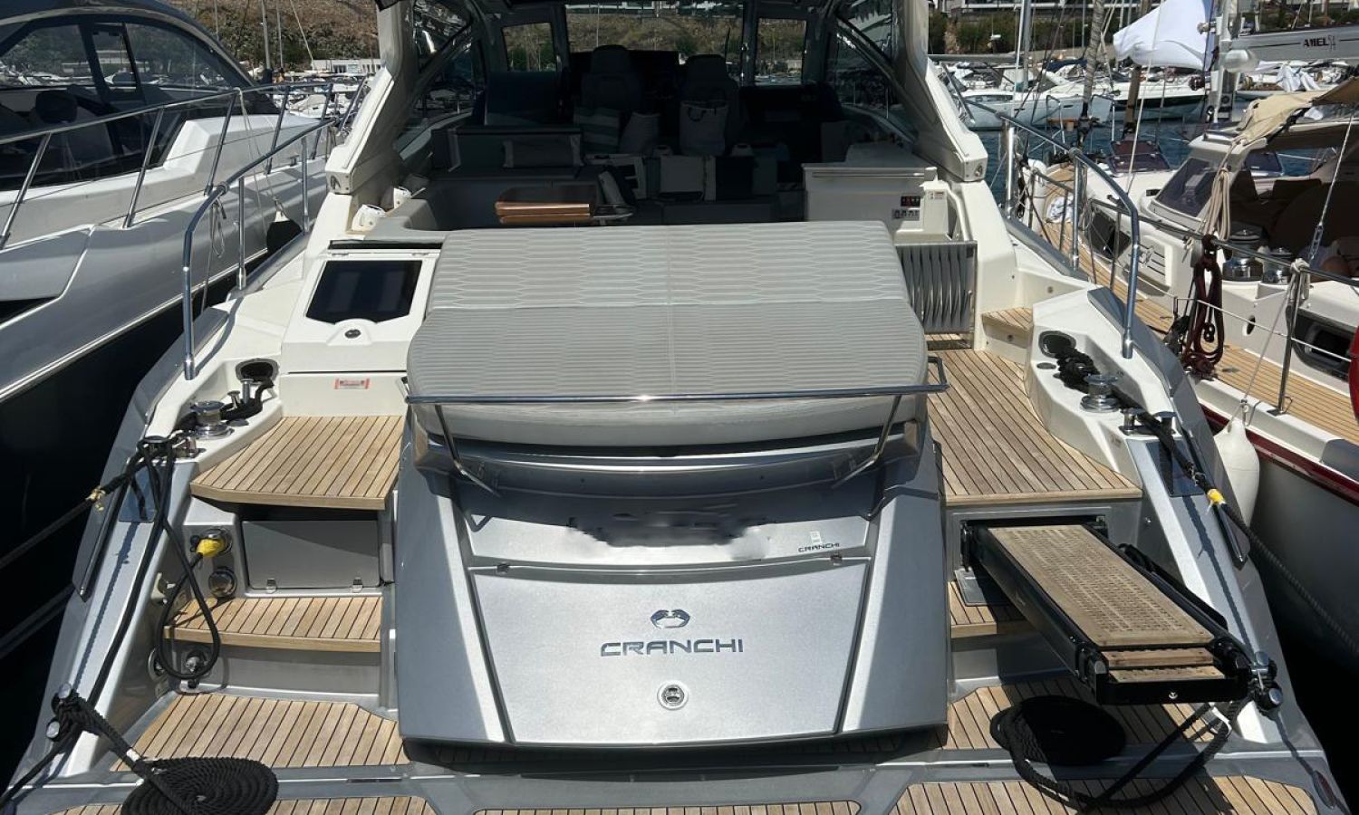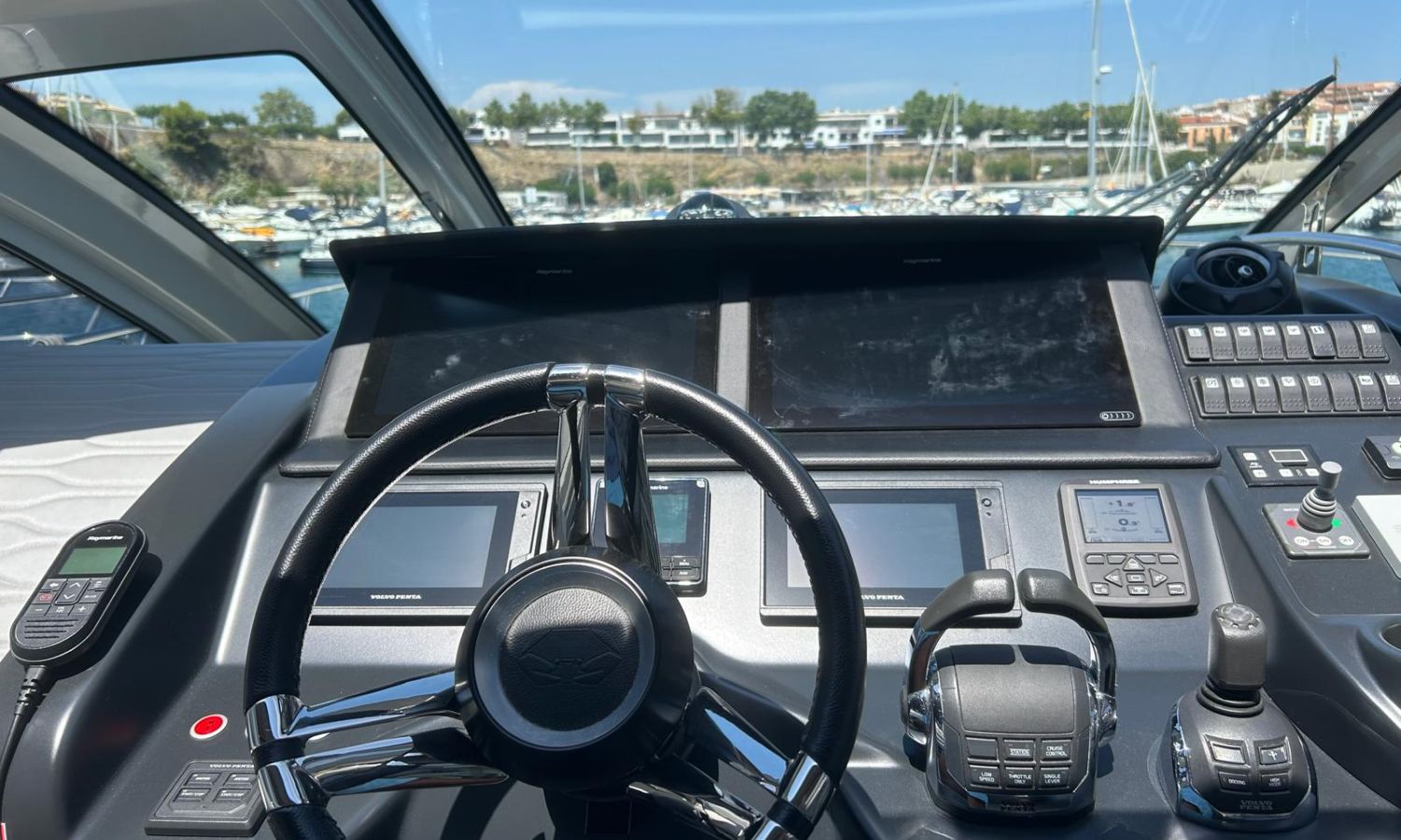 Black hard top - Kit haulage/launching for tender - Joystick control system - Electronic steering and electronic engine controls - Air conditioning 48.000 BTU in the cabins and 24.000 BTU in the cockpit, with heat pump - Crew cabin with WC and sink - Camper hood - Stern sunbathing area with cover - Electronic safe - Automatic Trim Control - Bow thruster - Search light - Generator upgrade from 13 to 20 kW - Cockpit refrigerator 65 l - Electric grill in the cockpit - Ice-maker - Teak cockpit table - Bow lights and underwater lights - Hydraulic foldaway passerelle - Electric anchor winch, chain and stainless steel Ultramarine anchor - Radio Bluetooth/USB in the living room - Radio Bluetooth/USB in master cabin - Radio Bluetooth/USB in the cockpit and bow - Gyroscopic stabilizer Seakeeper 6 - Hydraulic platform - Teak laid cockpit, platform and side stringers - Electric stern sunshade awning - Electric foldaway cockpit TV LED 28" - 2 Stern winches with warping bells - 220 V shore power - Cabins' floor in oak staves - Combi oven with microwave - Dishwasher - 4-burners cooktop in glass-ceramics - Exterior upholstery Silvertex silver colour - Hull, platform, part of the deck and garage painted in colour medusa grey - 2 GPS/Plotter - VHF - Echosounder (temperature and depth) - Autopilot - 2 Double cabins and 1 single cabin - 2 Complete bathrooms - Waste water tank - Water heater 40 l - Battery charger - Interceptor Humphree trim tabs - Bow and stern shower - Antifouling.Boat description
