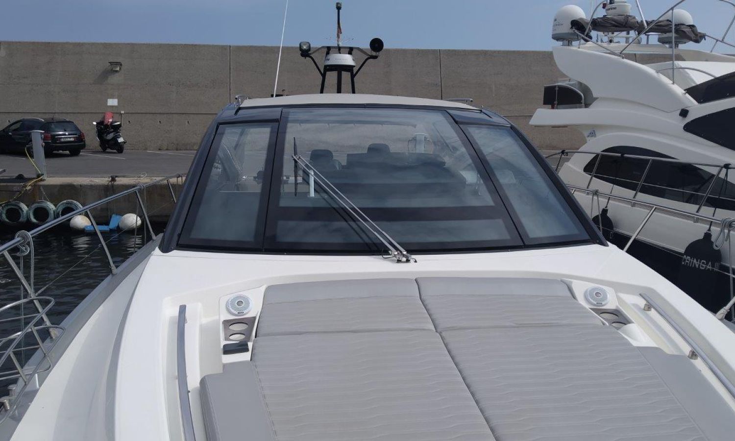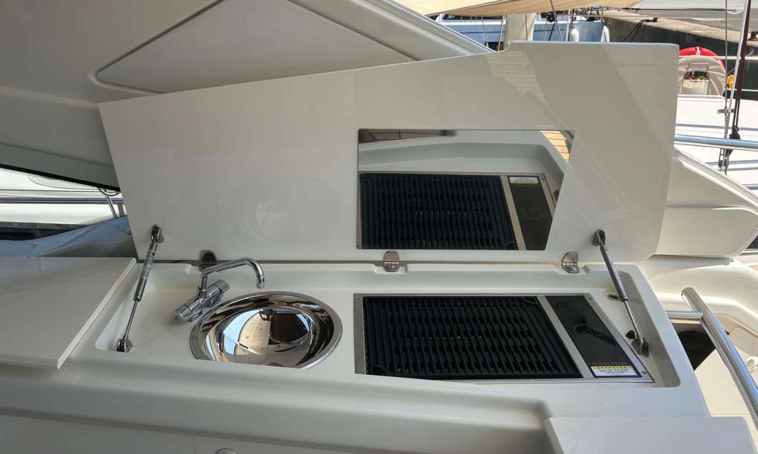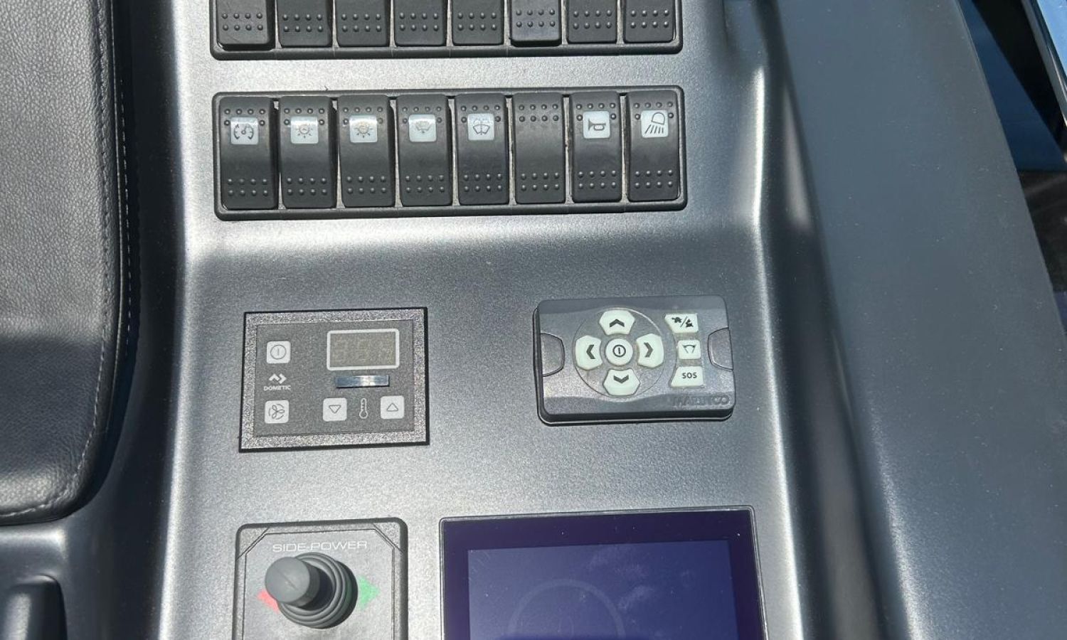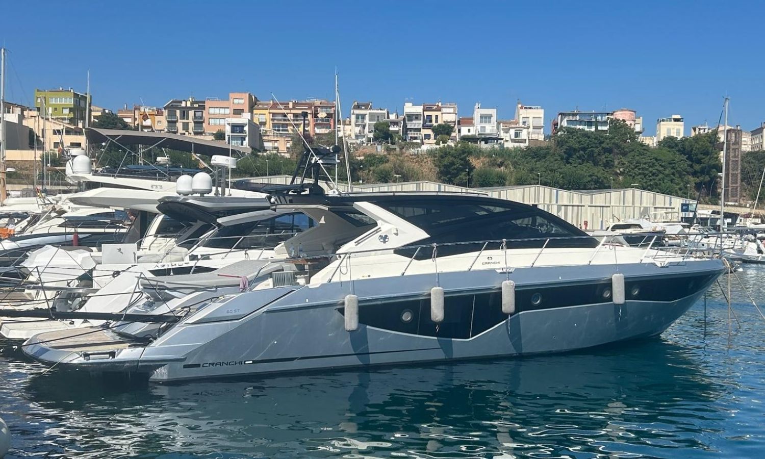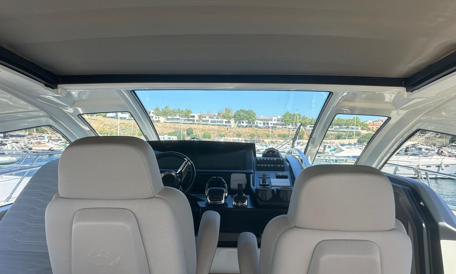 Black hard top - Kit haulage/launching for tender - Joystick control system - Electronic steering and electronic engine controls - Air conditioning 48.000 BTU in the cabins and 24.000 BTU in the cockpit, with heat pump - Crew cabin with WC and sink - Camper hood - Stern sunbathing area with cover - Electronic safe - Automatic Trim Control - Bow thruster - Search light - Generator upgrade from 13 to 20 kW - Cockpit refrigerator 65 l - Electric grill in the cockpit - Ice-maker - Teak cockpit table - Bow lights and underwater lights - Hydraulic foldaway passerelle - Electric anchor winch, chain and stainless steel Ultramarine anchor - Radio Bluetooth/USB in the living room - Radio Bluetooth/USB in master cabin - Radio Bluetooth/USB in the cockpit and bow - Gyroscopic stabilizer Seakeeper 6 - Hydraulic platform - Teak laid cockpit, platform and side stringers - Electric stern sunshade awning - Electric foldaway cockpit TV LED 28" - 2 Stern winches with warping bells - 220 V shore power - Cabins' floor in oak staves - Combi oven with microwave - Dishwasher - 4-burners cooktop in glass-ceramics - Exterior upholstery Silvertex silver colour - Hull, platform, part of the deck and garage painted in colour medusa grey - 2 GPS/Plotter - VHF - Echosounder (temperature and depth) - Autopilot - 2 Double cabins and 1 single cabin - 2 Complete bathrooms - Waste water tank - Water heater 40 l - Battery charger - Interceptor Humphree trim tabs - Bow and stern shower - Antifouling.Boat description