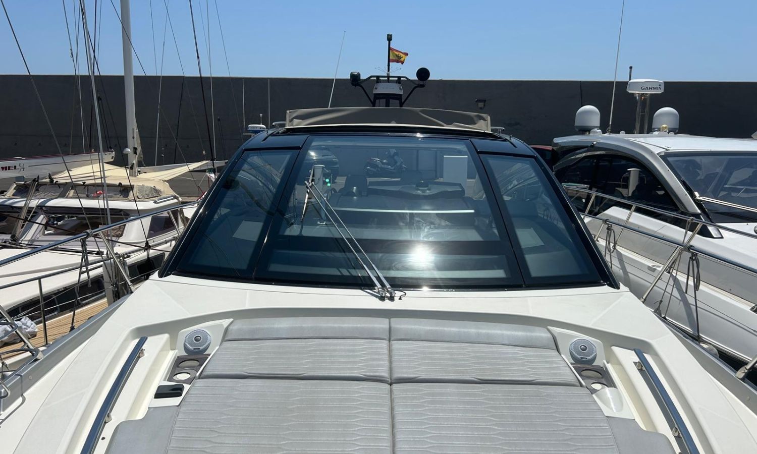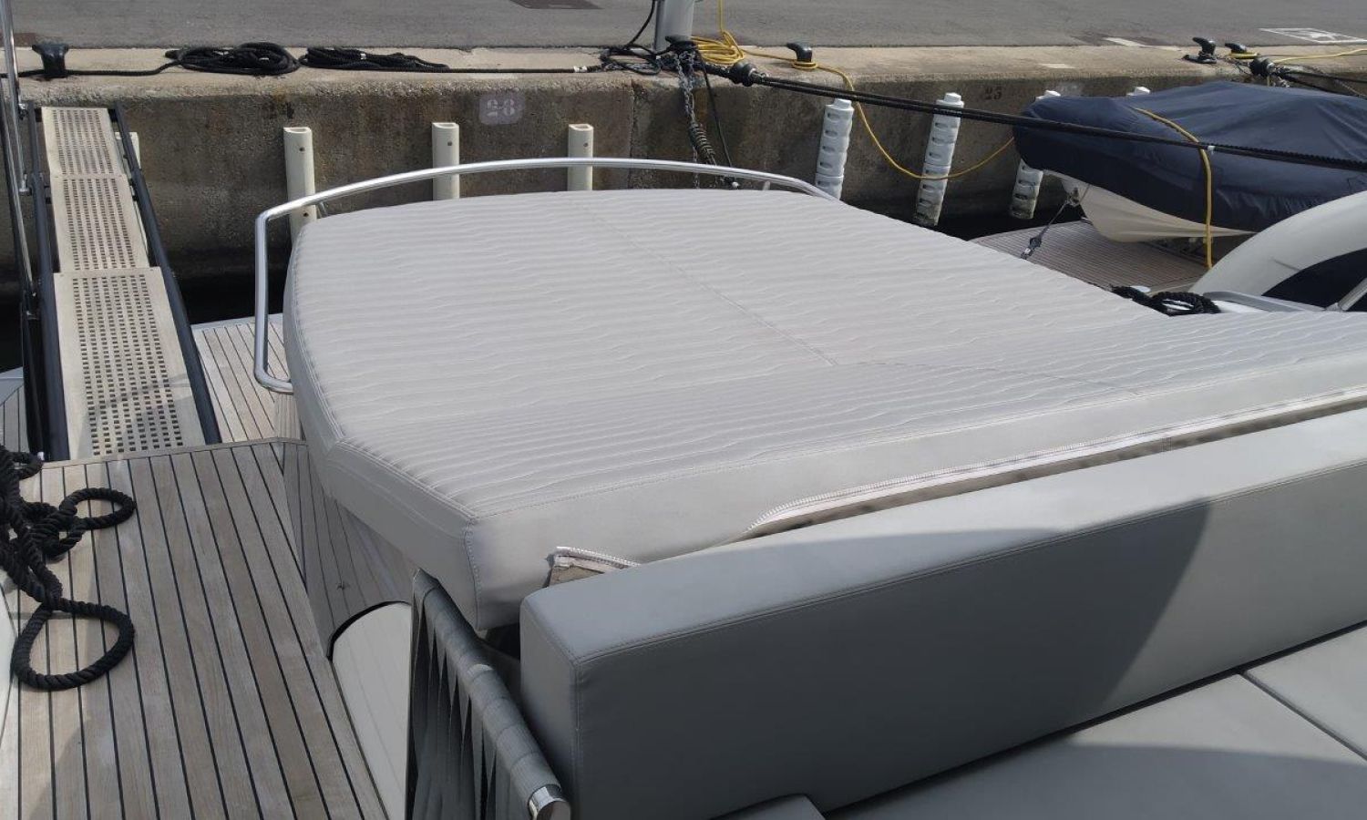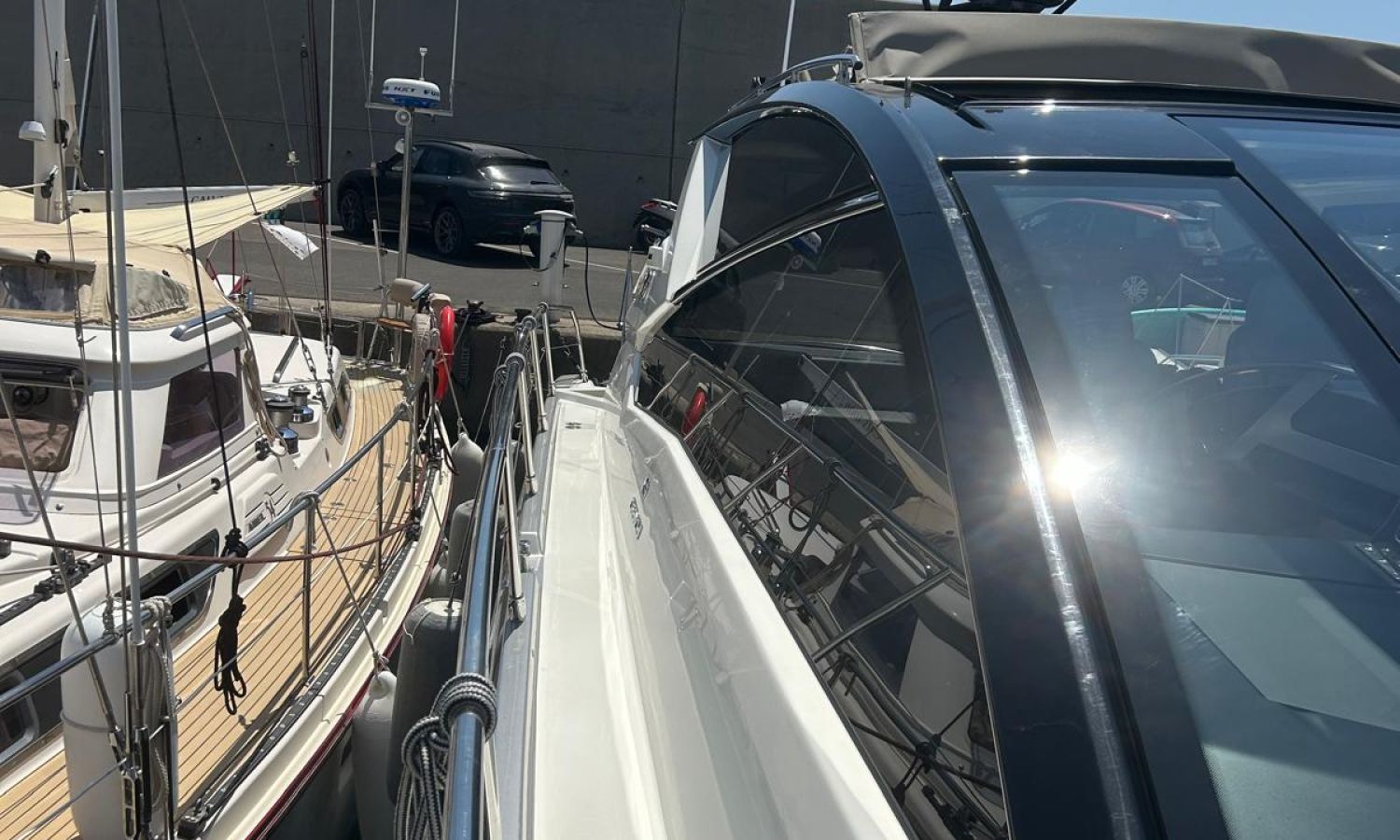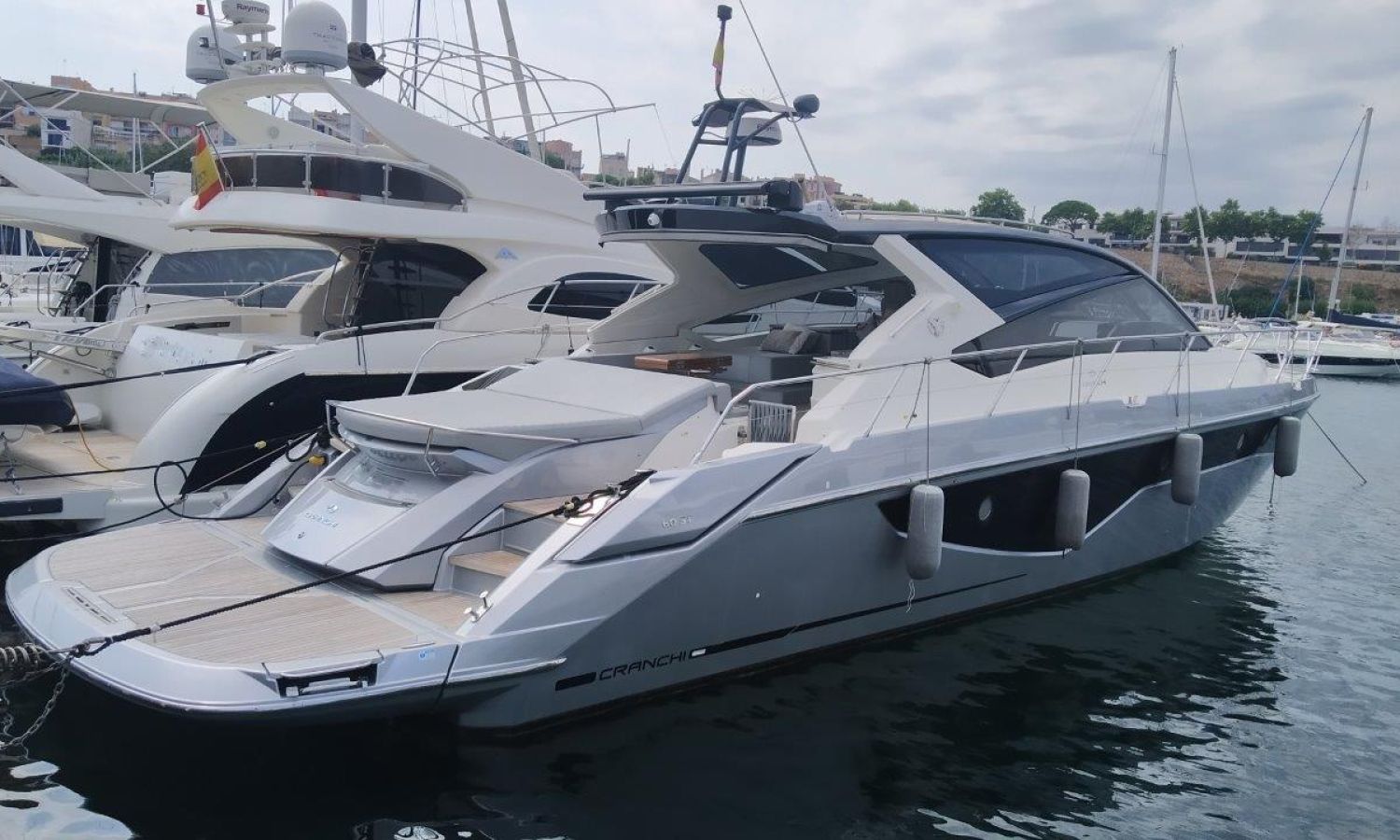 Black hard top - Kit haulage/launching for tender - Joystick control system - Electronic steering and electronic engine controls - Air conditioning 48.000 BTU in the cabins and 24.000 BTU in the cockpit, with heat pump - Crew cabin with WC and sink - Camper hood - Stern sunbathing area with cover - Electronic safe - Automatic Trim Control - Bow thruster - Search light - Generator upgrade from 13 to 20 kW - Cockpit refrigerator 65 l - Electric grill in the cockpit - Ice-maker - Teak cockpit table - Bow lights and underwater lights - Hydraulic foldaway passerelle - Electric anchor winch, chain and stainless steel Ultramarine anchor - Radio Bluetooth/USB in the living room - Radio Bluetooth/USB in master cabin - Radio Bluetooth/USB in the cockpit and bow - Gyroscopic stabilizer Seakeeper 6 - Hydraulic platform - Teak laid cockpit, platform and side stringers - Electric stern sunshade awning - Electric foldaway cockpit TV LED 28" - 2 Stern winches with warping bells - 220 V shore power - Cabins' floor in oak staves - Combi oven with microwave - Dishwasher - 4-burners cooktop in glass-ceramics - Exterior upholstery Silvertex silver colour - Hull, platform, part of the deck and garage painted in colour medusa grey - 2 GPS/Plotter - VHF - Echosounder (temperature and depth) - Autopilot - 2 Double cabins and 1 single cabin - 2 Complete bathrooms - Waste water tank - Water heater 40 l - Battery charger - Interceptor Humphree trim tabs - Bow and stern shower - Antifouling.Boat description