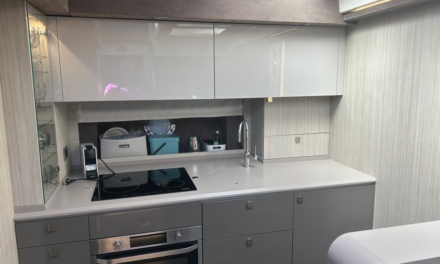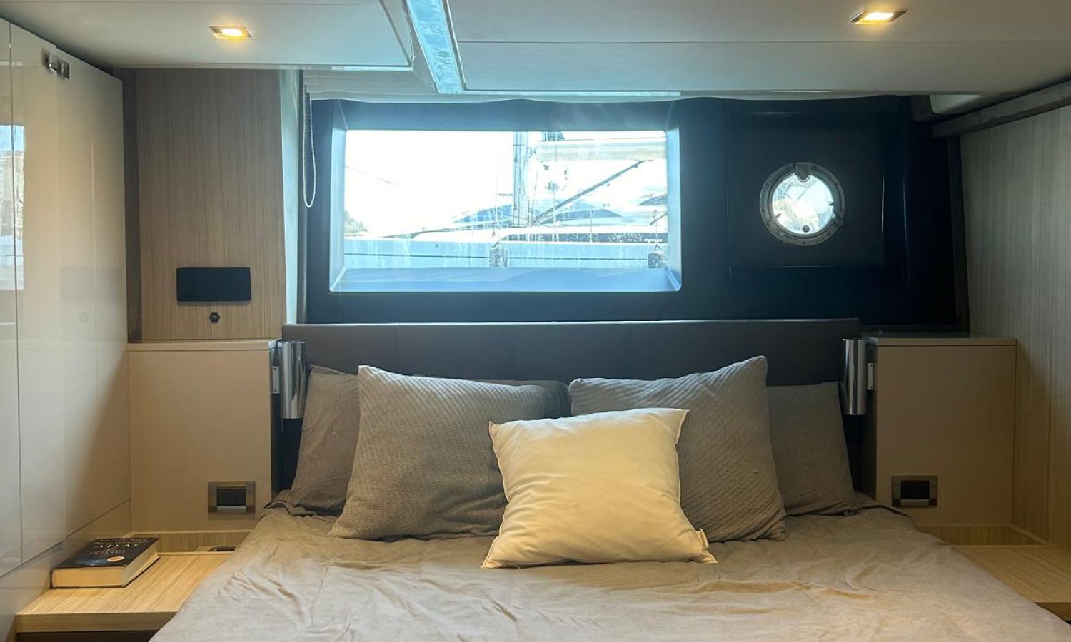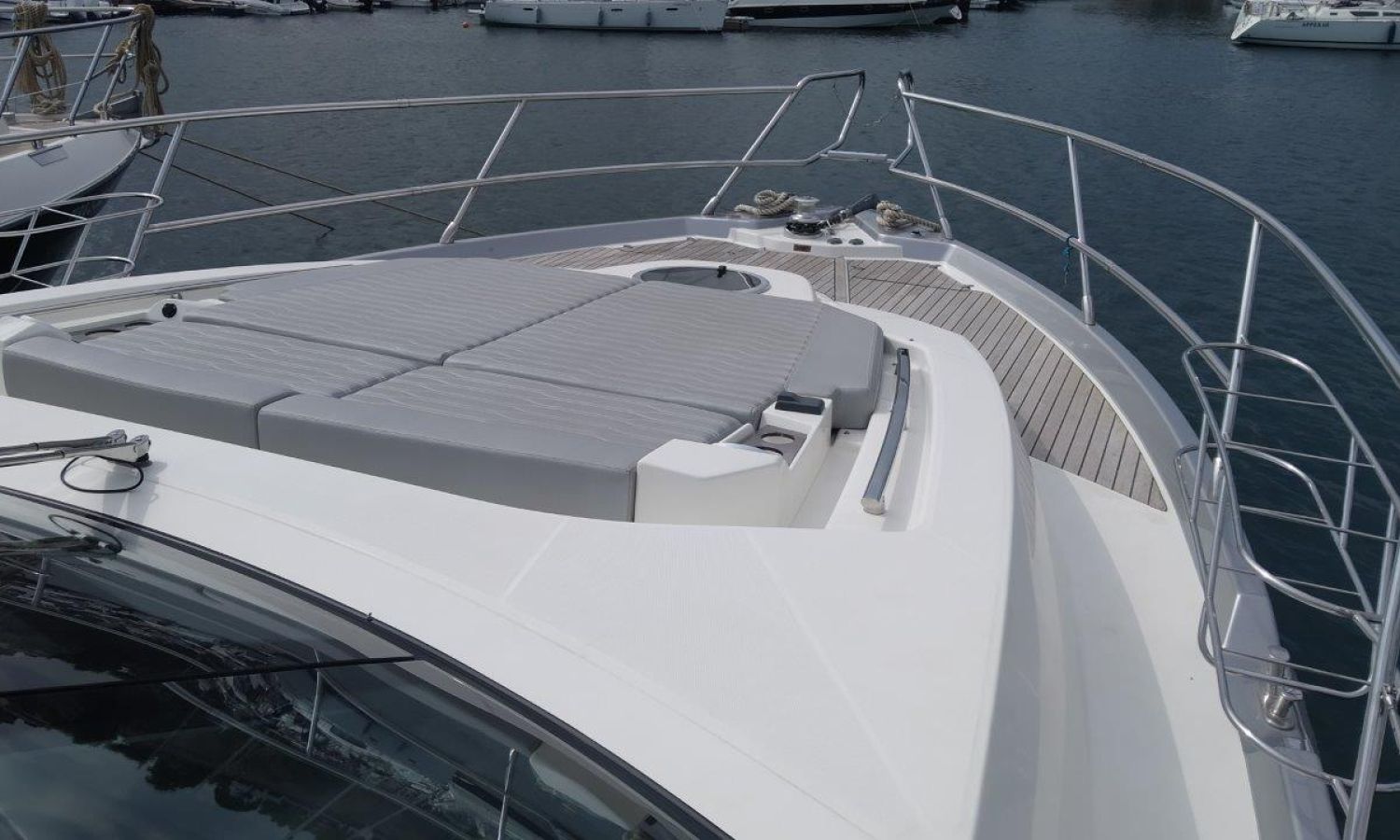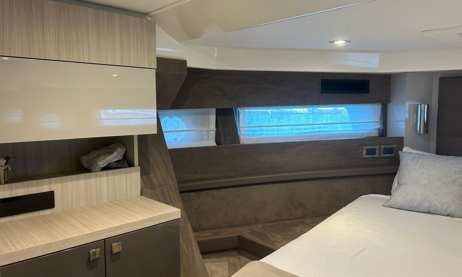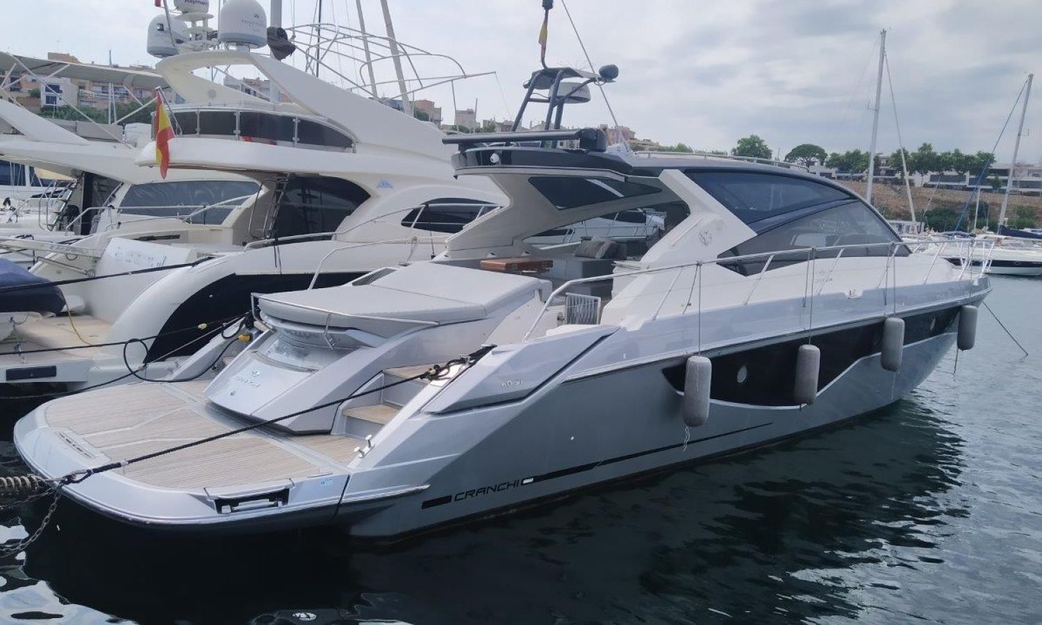 Black hard top - Kit haulage/launching for tender - Joystick control system - Electronic steering and electronic engine controls - Air conditioning 48.000 BTU in the cabins and 24.000 BTU in the cockpit, with heat pump - Crew cabin with WC and sink - Camper hood - Stern sunbathing area with cover - Electronic safe - Automatic Trim Control - Bow thruster - Search light - Generator upgrade from 13 to 20 kW - Cockpit refrigerator 65 l - Electric grill in the cockpit - Ice-maker - Teak cockpit table - Bow lights and underwater lights - Hydraulic foldaway passerelle - Electric anchor winch, chain and stainless steel Ultramarine anchor - Radio Bluetooth/USB in the living room - Radio Bluetooth/USB in master cabin - Radio Bluetooth/USB in the cockpit and bow - Gyroscopic stabilizer Seakeeper 6 - Hydraulic platform - Teak laid cockpit, platform and side stringers - Electric stern sunshade awning - Electric foldaway cockpit TV LED 28" - 2 Stern winches with warping bells - 220 V shore power - Cabins' floor in oak staves - Combi oven with microwave - Dishwasher - 4-burners cooktop in glass-ceramics - Exterior upholstery Silvertex silver colour - Hull, platform, part of the deck and garage painted in colour medusa grey - 2 GPS/Plotter - VHF - Echosounder (temperature and depth) - Autopilot - 2 Double cabins and 1 single cabin - 2 Complete bathrooms - Waste water tank - Water heater 40 l - Battery charger - Interceptor Humphree trim tabs - Bow and stern shower - Antifouling.Boat description