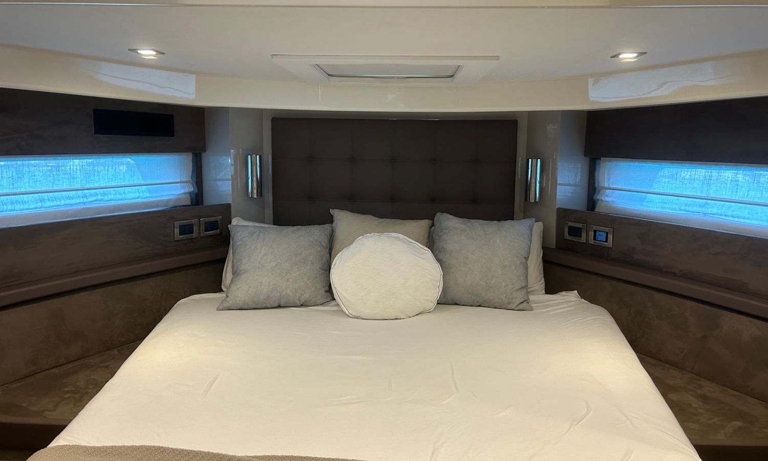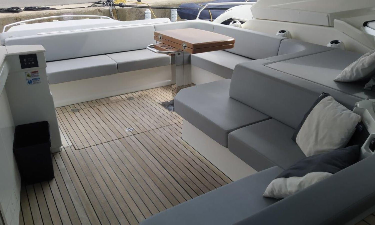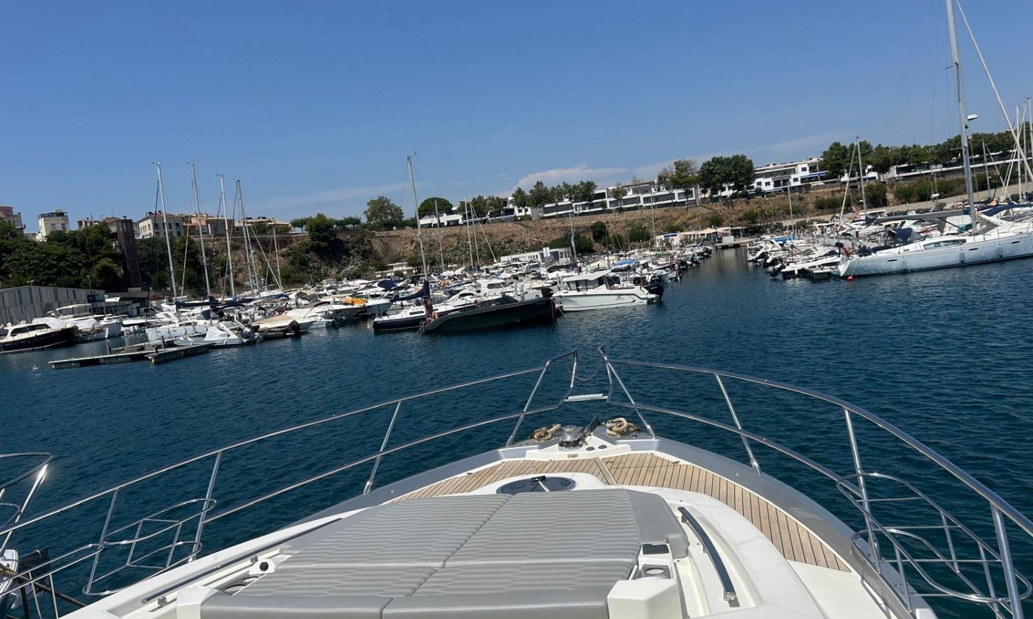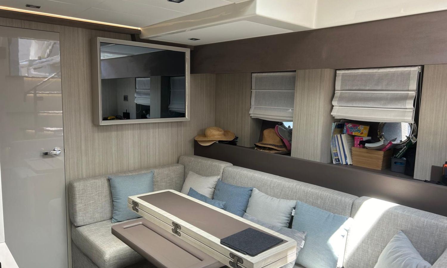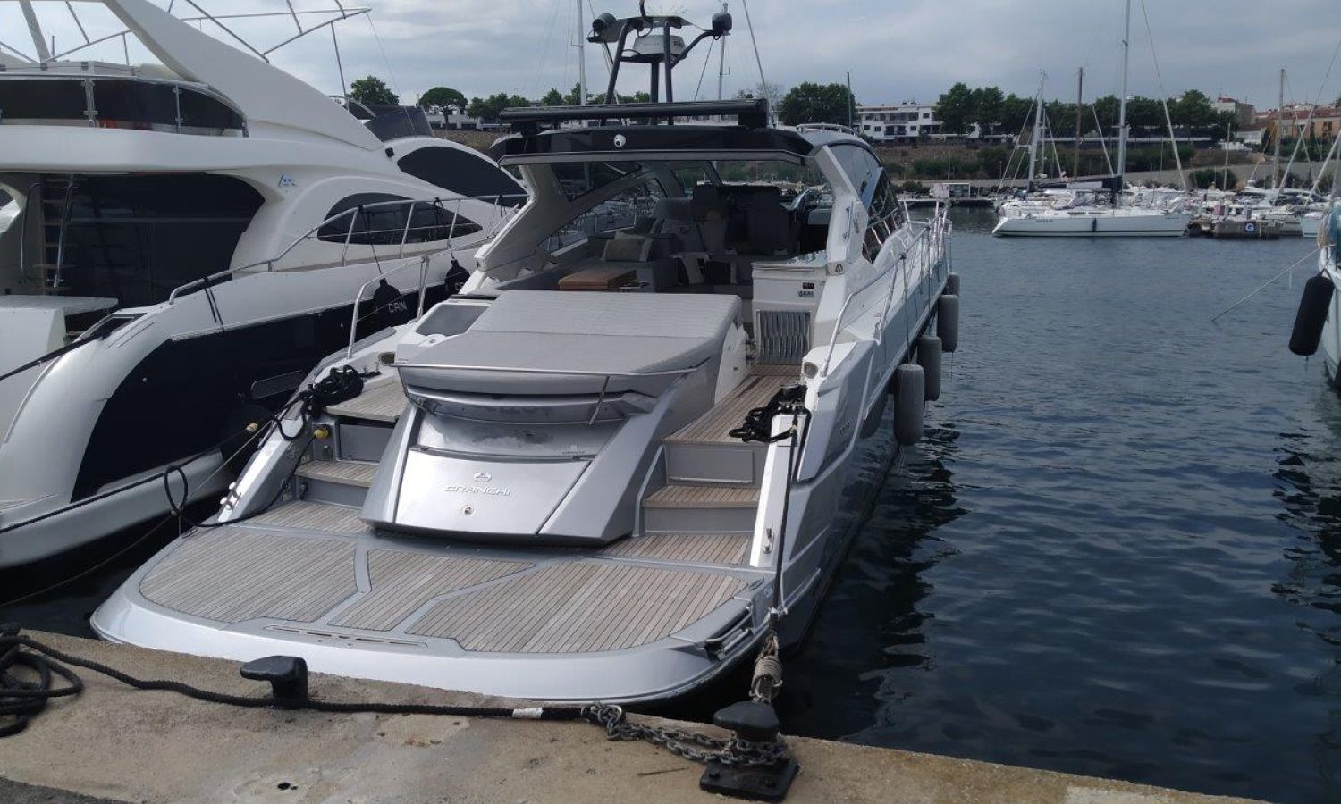 Black hard top - Kit haulage/launching for tender - Joystick control system - Electronic steering and electronic engine controls - Air conditioning 48.000 BTU in the cabins and 24.000 BTU in the cockpit, with heat pump - Crew cabin with WC and sink - Camper hood - Stern sunbathing area with cover - Electronic safe - Automatic Trim Control - Bow thruster - Search light - Generator upgrade from 13 to 20 kW - Cockpit refrigerator 65 l - Electric grill in the cockpit - Ice-maker - Teak cockpit table - Bow lights and underwater lights - Hydraulic foldaway passerelle - Electric anchor winch, chain and stainless steel Ultramarine anchor - Radio Bluetooth/USB in the living room - Radio Bluetooth/USB in master cabin - Radio Bluetooth/USB in the cockpit and bow - Gyroscopic stabilizer Seakeeper 6 - Hydraulic platform - Teak laid cockpit, platform and side stringers - Electric stern sunshade awning - Electric foldaway cockpit TV LED 28" - 2 Stern winches with warping bells - 220 V shore power - Cabins' floor in oak staves - Combi oven with microwave - Dishwasher - 4-burners cooktop in glass-ceramics - Exterior upholstery Silvertex silver colour - Hull, platform, part of the deck and garage painted in colour medusa grey - 2 GPS/Plotter - VHF - Echosounder (temperature and depth) - Autopilot - 2 Double cabins and 1 single cabin - 2 Complete bathrooms - Waste water tank - Water heater 40 l - Battery charger - Interceptor Humphree trim tabs - Bow and stern shower - Antifouling.Boat description