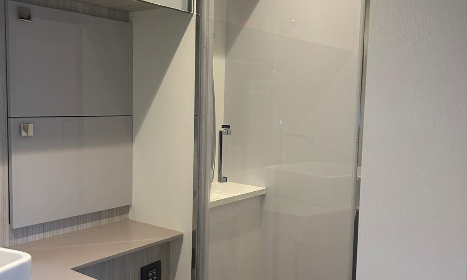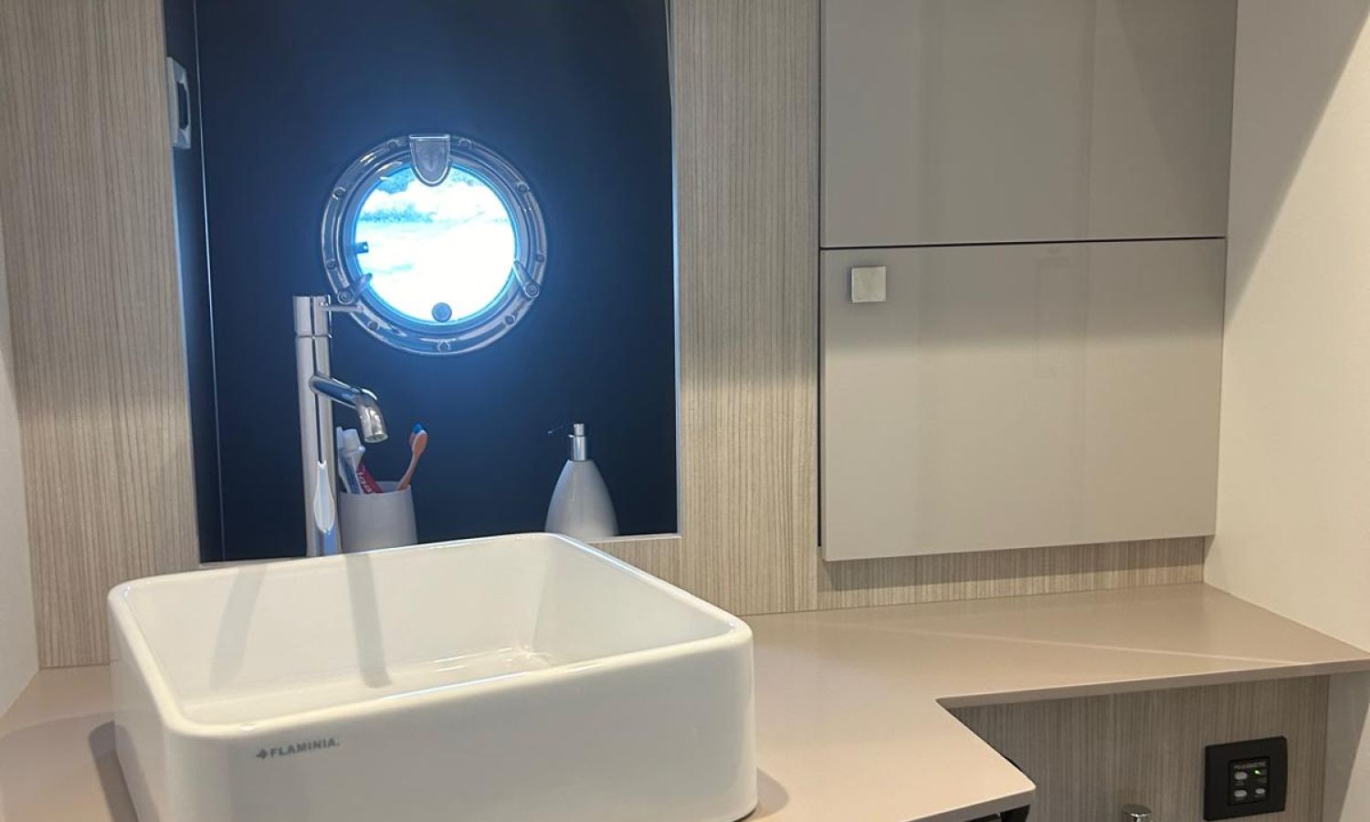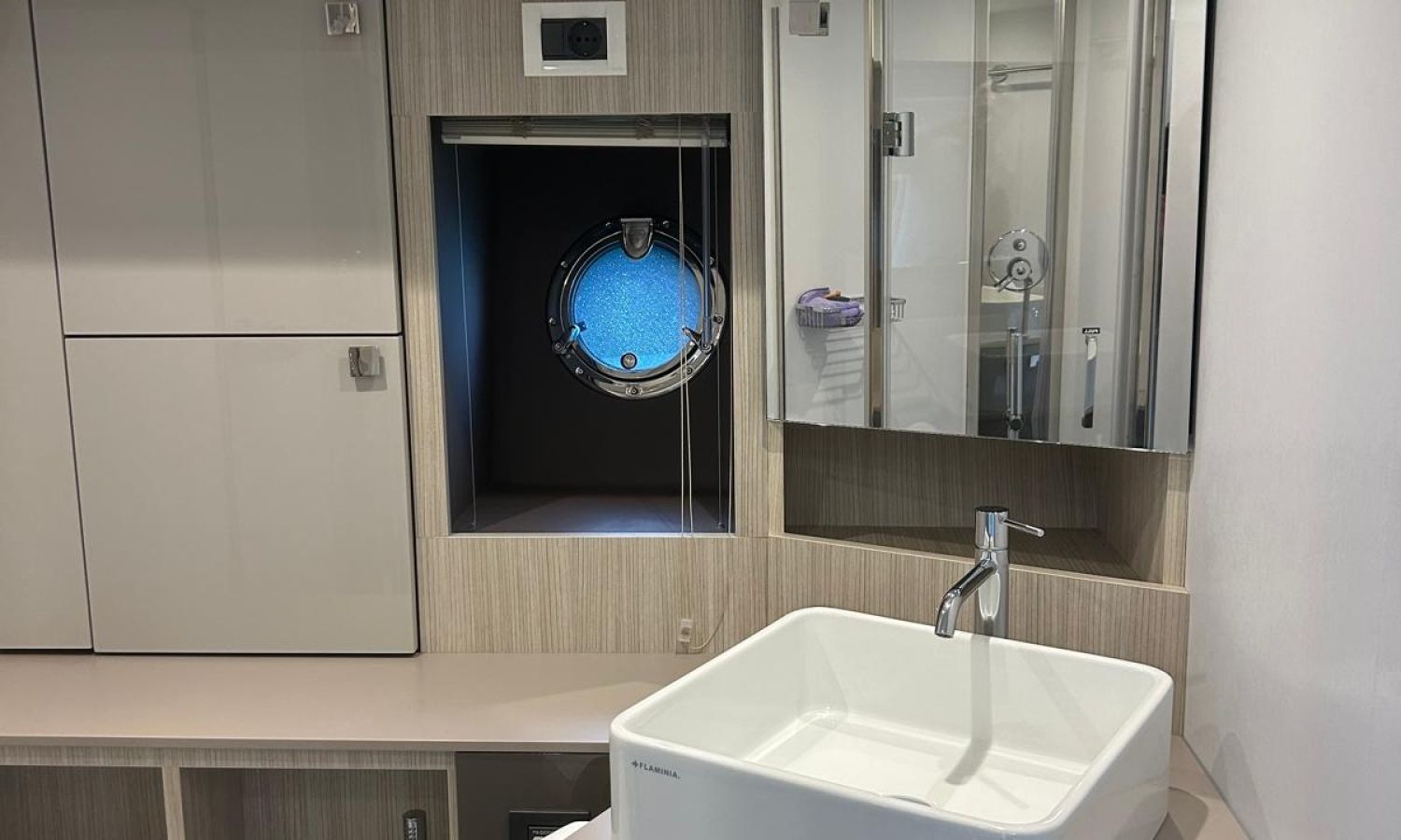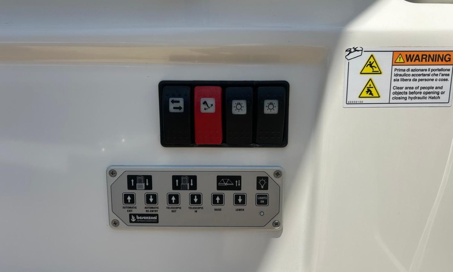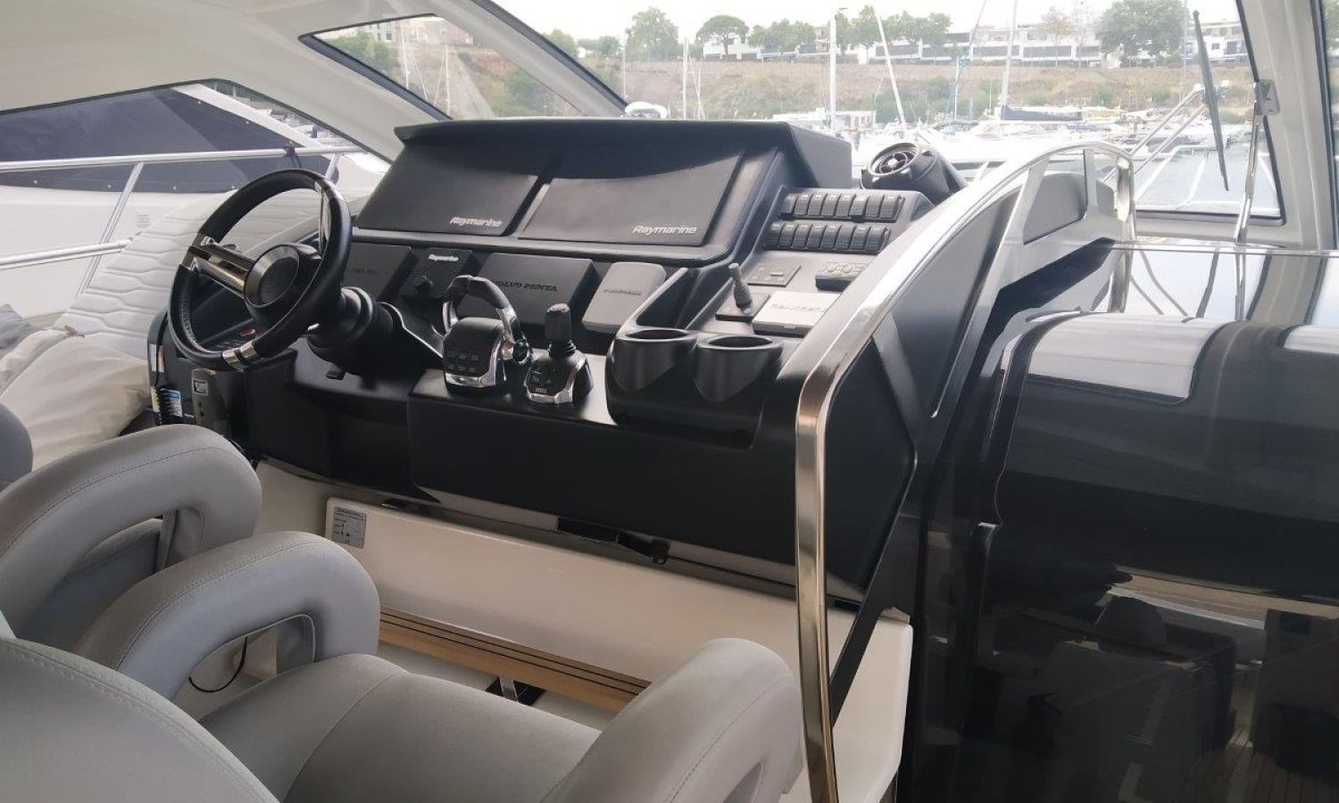 Black hard top - Kit haulage/launching for tender - Joystick control system - Electronic steering and electronic engine controls - Air conditioning 48.000 BTU in the cabins and 24.000 BTU in the cockpit, with heat pump - Crew cabin with WC and sink - Camper hood - Stern sunbathing area with cover - Electronic safe - Automatic Trim Control - Bow thruster - Search light - Generator upgrade from 13 to 20 kW - Cockpit refrigerator 65 l - Electric grill in the cockpit - Ice-maker - Teak cockpit table - Bow lights and underwater lights - Hydraulic foldaway passerelle - Electric anchor winch, chain and stainless steel Ultramarine anchor - Radio Bluetooth/USB in the living room - Radio Bluetooth/USB in master cabin - Radio Bluetooth/USB in the cockpit and bow - Gyroscopic stabilizer Seakeeper 6 - Hydraulic platform - Teak laid cockpit, platform and side stringers - Electric stern sunshade awning - Electric foldaway cockpit TV LED 28" - 2 Stern winches with warping bells - 220 V shore power - Cabins' floor in oak staves - Combi oven with microwave - Dishwasher - 4-burners cooktop in glass-ceramics - Exterior upholstery Silvertex silver colour - Hull, platform, part of the deck and garage painted in colour medusa grey - 2 GPS/Plotter - VHF - Echosounder (temperature and depth) - Autopilot - 2 Double cabins and 1 single cabin - 2 Complete bathrooms - Waste water tank - Water heater 40 l - Battery charger - Interceptor Humphree trim tabs - Bow and stern shower - Antifouling.Boat description
