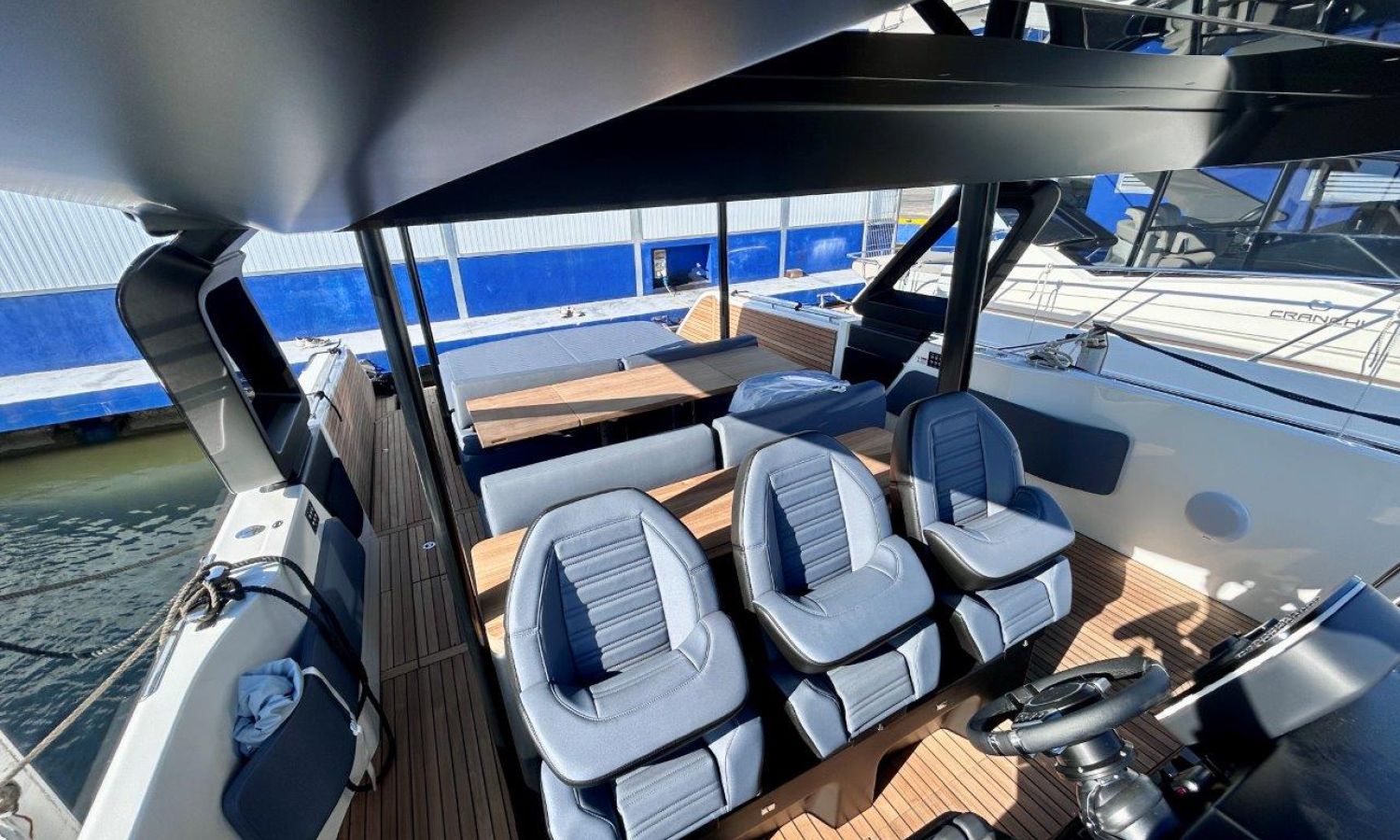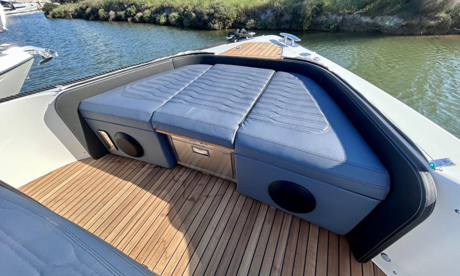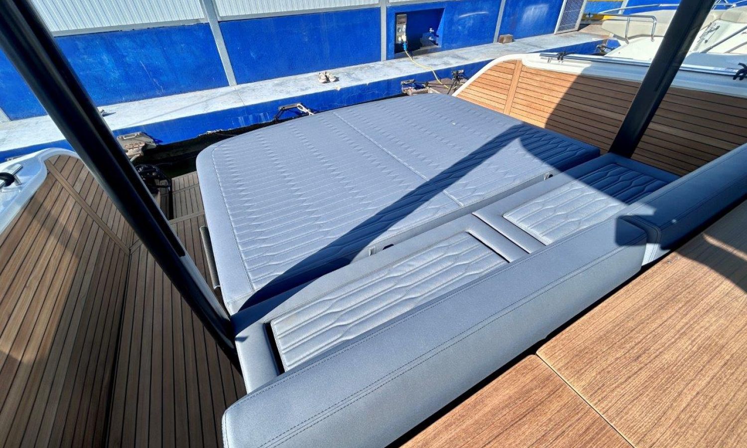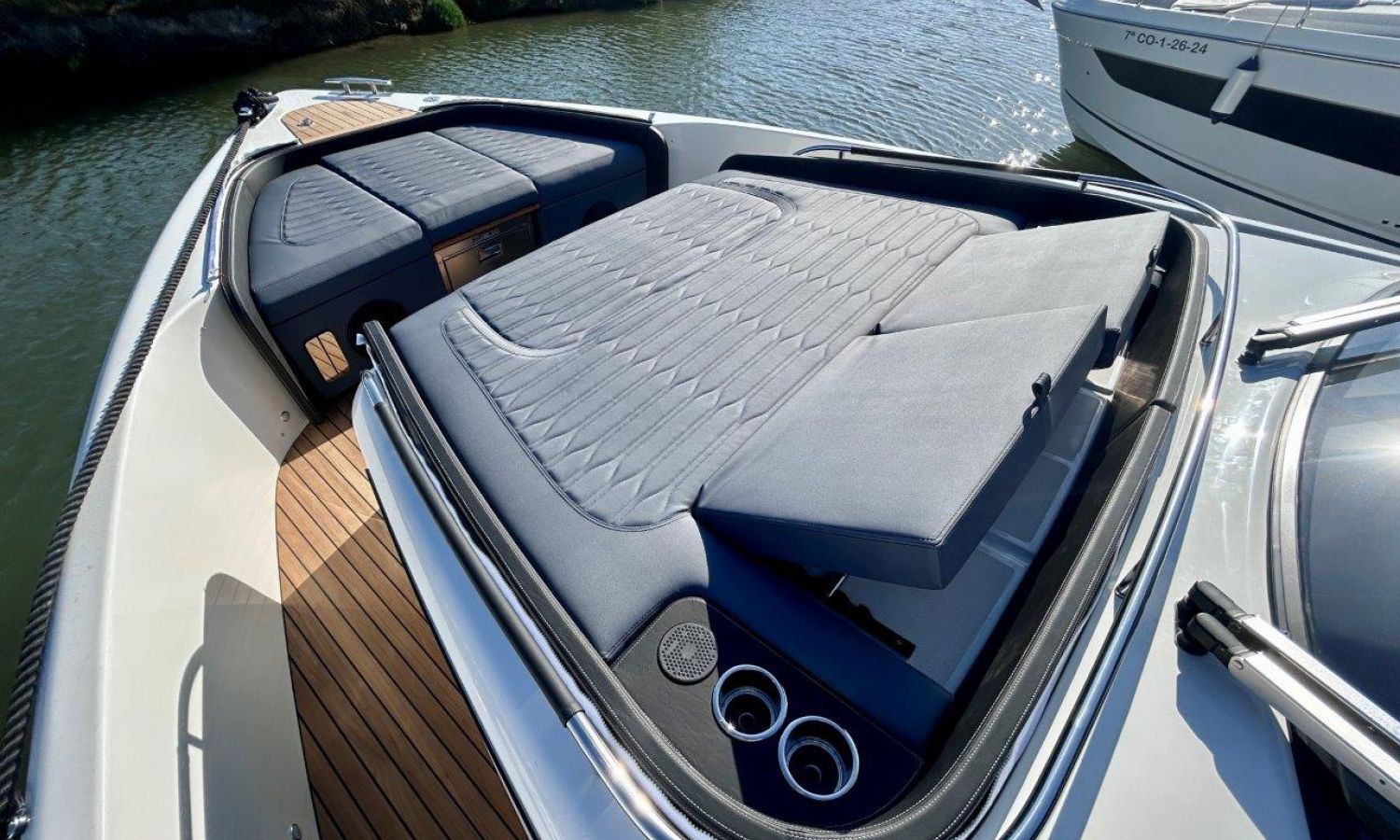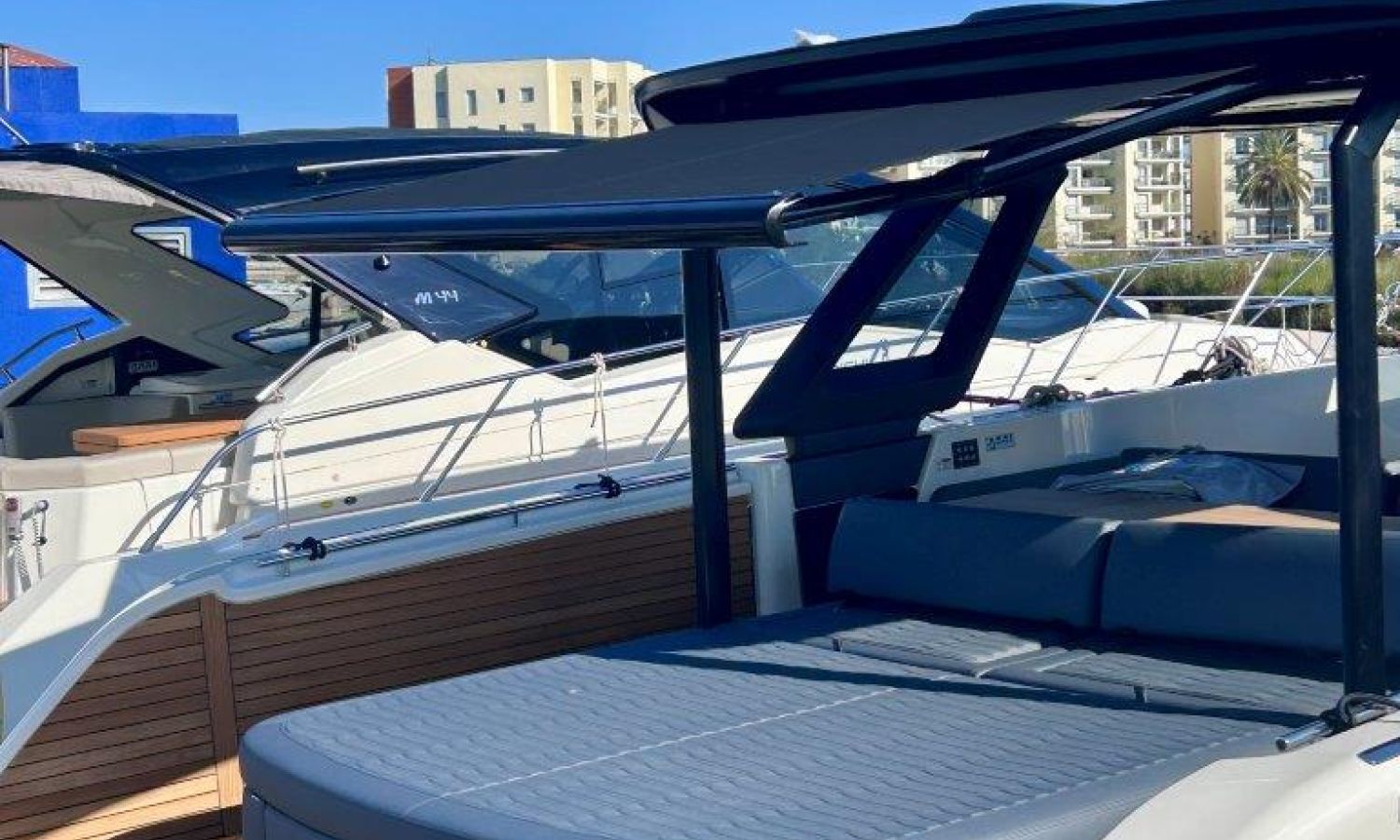 Bilge micro-suction system - Waste water tank - Air conditioning 16.000 BTU in cabins with heat pump - Set covers (for dashboard, pilot seat, stern sofa, cockpit table, cockpit wetbar and stern sun cushion) - Automatic List Control + Coordinated Turn Control - Bow thruster - Cockpit refrigerator - Generator 8 kW - Electric cockpit grill - Ice-maker - Aft lowering bulkwarks right and left - Black microperforated privacy screen with white logo A 46 Luxury Tender - Hydraulic gangway - Autopilot - Up/down hydraulic stern platform - 2 Plotter screens 16" - Teak laid cockpit and teak on aft lowering bulkwarks - Solid teak coverings on lateral stringers - Electric sunshade - T-Top - VHF - CE Certificate - Fender covers (alternative colour to standard one) - Exterior upholstery (alternative colour to standard one) - T-Top lacquered - Preparation, launch and delivery with sea trial - Transport shipyard to Costa Brava.Boat description