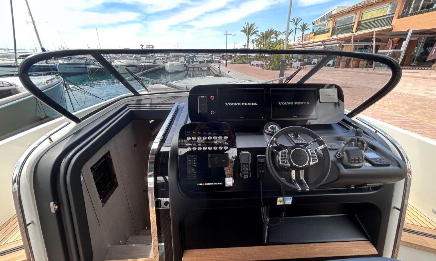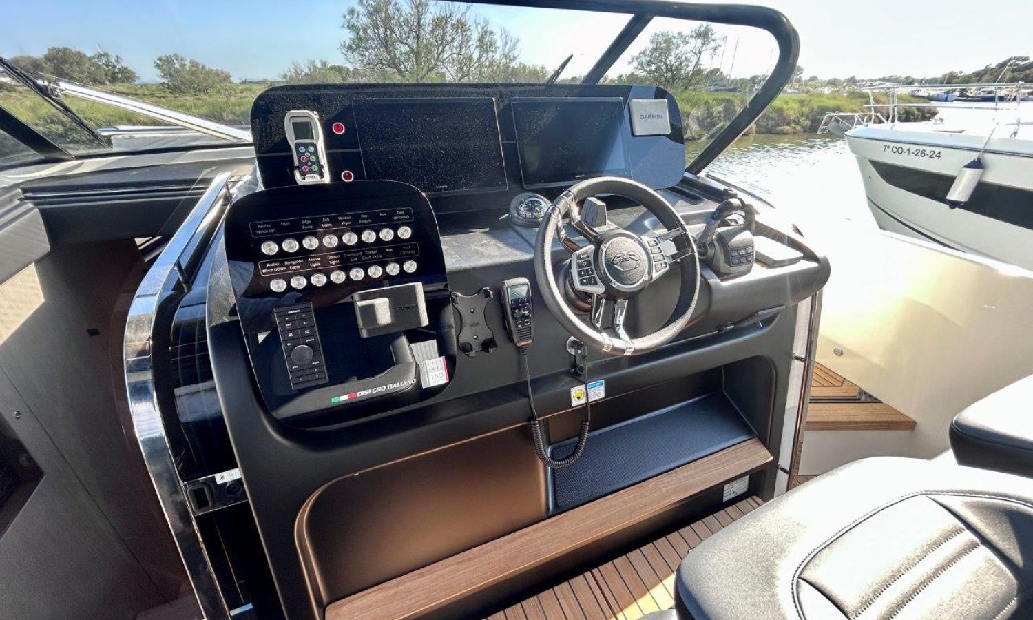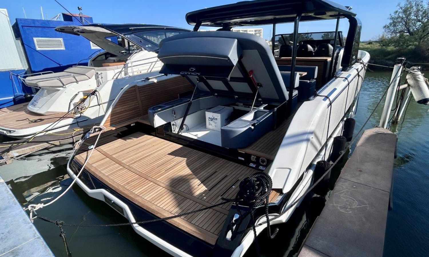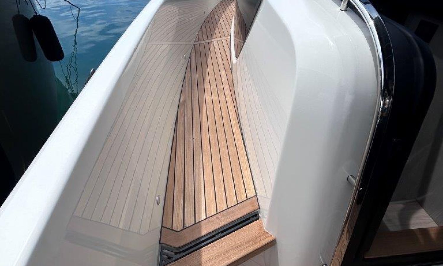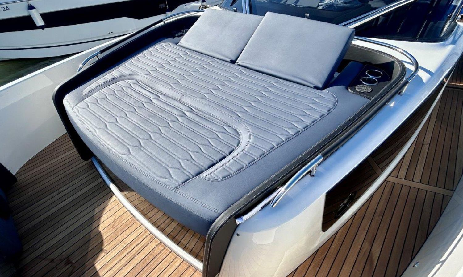 Bilge micro-suction system - Waste water tank - Air conditioning 16.000 BTU in cabins with heat pump - Set covers (for dashboard, pilot seat, stern sofa, cockpit table, cockpit wetbar and stern sun cushion) - Automatic List Control + Coordinated Turn Control - Bow thruster - Cockpit refrigerator - Generator 8 kW - Electric cockpit grill - Ice-maker - Aft lowering bulkwarks right and left - Black microperforated privacy screen with white logo A 46 Luxury Tender - Hydraulic gangway - Autopilot - Up/down hydraulic stern platform - 2 Plotter screens 16" - Teak laid cockpit and teak on aft lowering bulkwarks - Solid teak coverings on lateral stringers - Electric sunshade - T-Top - VHF - CE Certificate - Fender covers (alternative colour to standard one) - Exterior upholstery (alternative colour to standard one) - T-Top lacquered - Preparation, launch and delivery with sea trial - Transport shipyard to Costa Brava.Boat description
