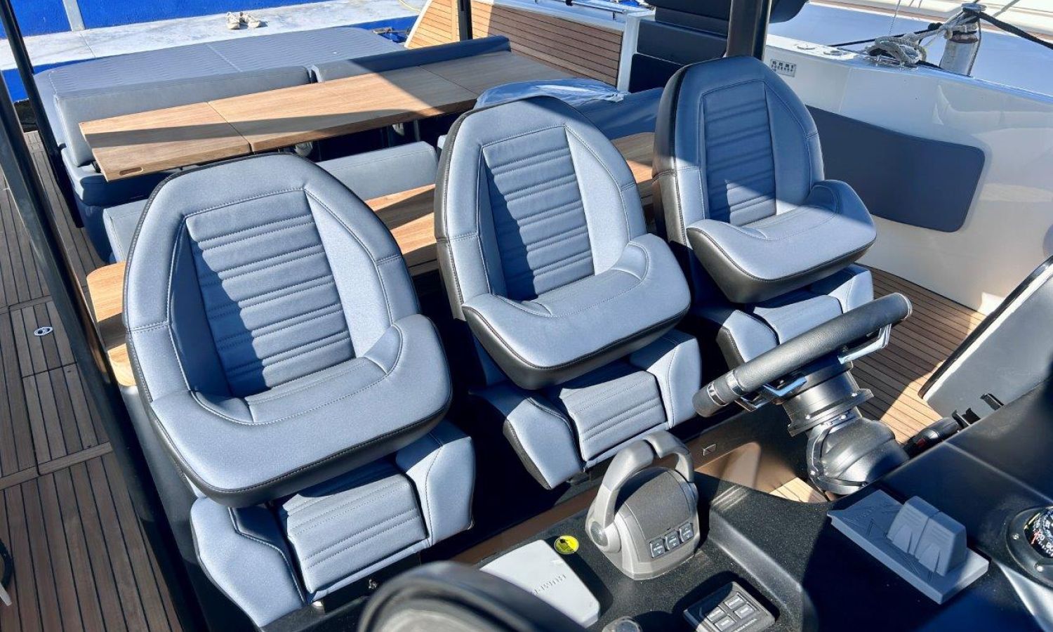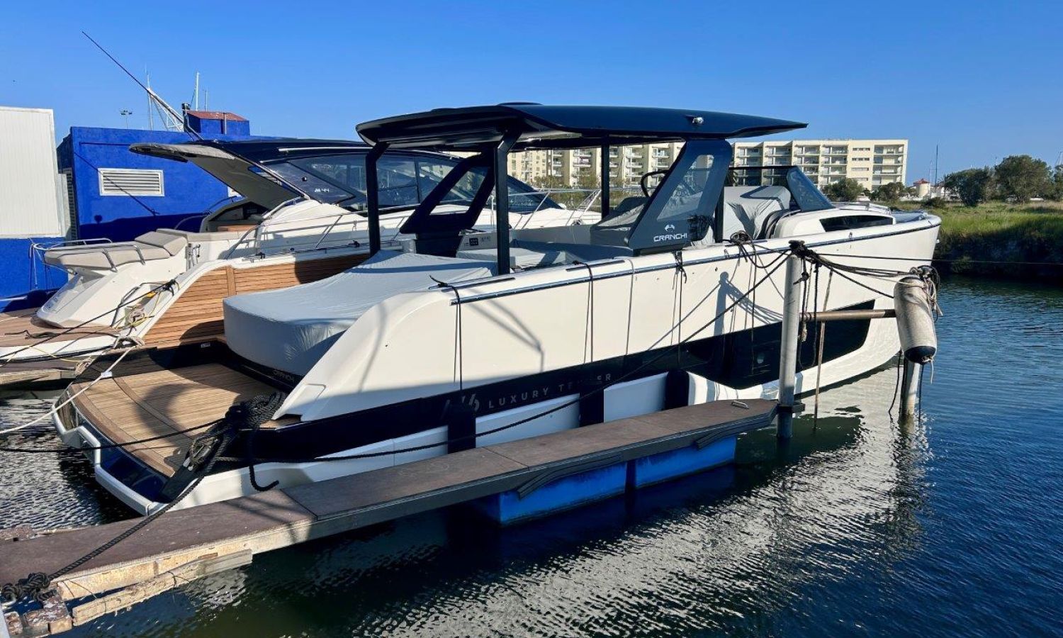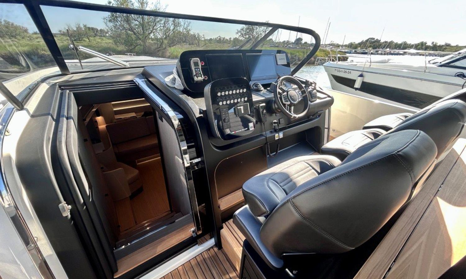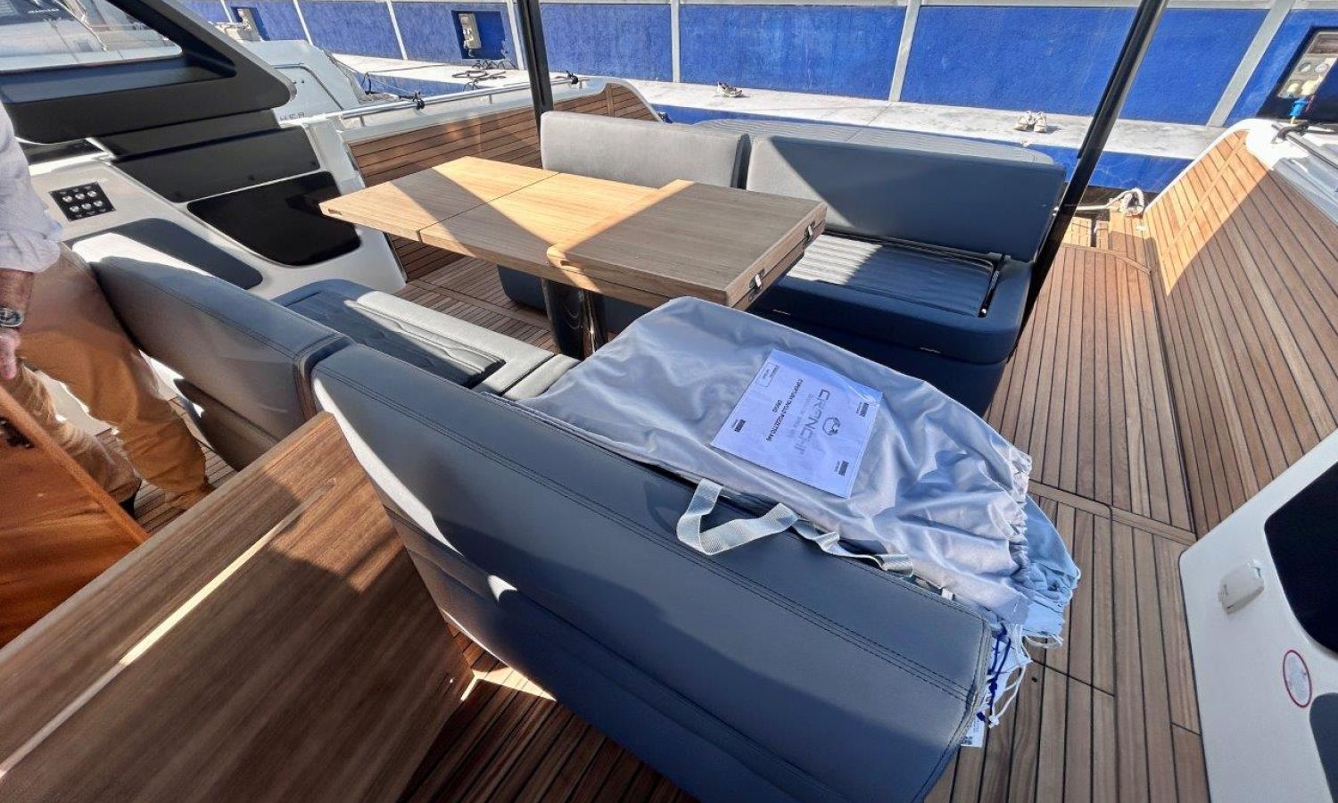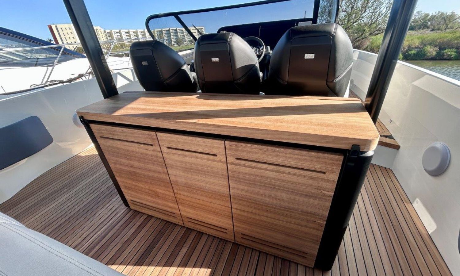 Bilge micro-suction system - Waste water tank - Air conditioning 16.000 BTU in cabins with heat pump - Set covers (for dashboard, pilot seat, stern sofa, cockpit table, cockpit wetbar and stern sun cushion) - Automatic List Control + Coordinated Turn Control - Bow thruster - Cockpit refrigerator - Generator 8 kW - Electric cockpit grill - Ice-maker - Aft lowering bulkwarks right and left - Black microperforated privacy screen with white logo A 46 Luxury Tender - Hydraulic gangway - Autopilot - Up/down hydraulic stern platform - 2 Plotter screens 16" - Teak laid cockpit and teak on aft lowering bulkwarks - Solid teak coverings on lateral stringers - Electric sunshade - T-Top - VHF - CE Certificate - Fender covers (alternative colour to standard one) - Exterior upholstery (alternative colour to standard one) - T-Top lacquered - Preparation, launch and delivery with sea trial - Transport shipyard to Costa Brava.Boat description