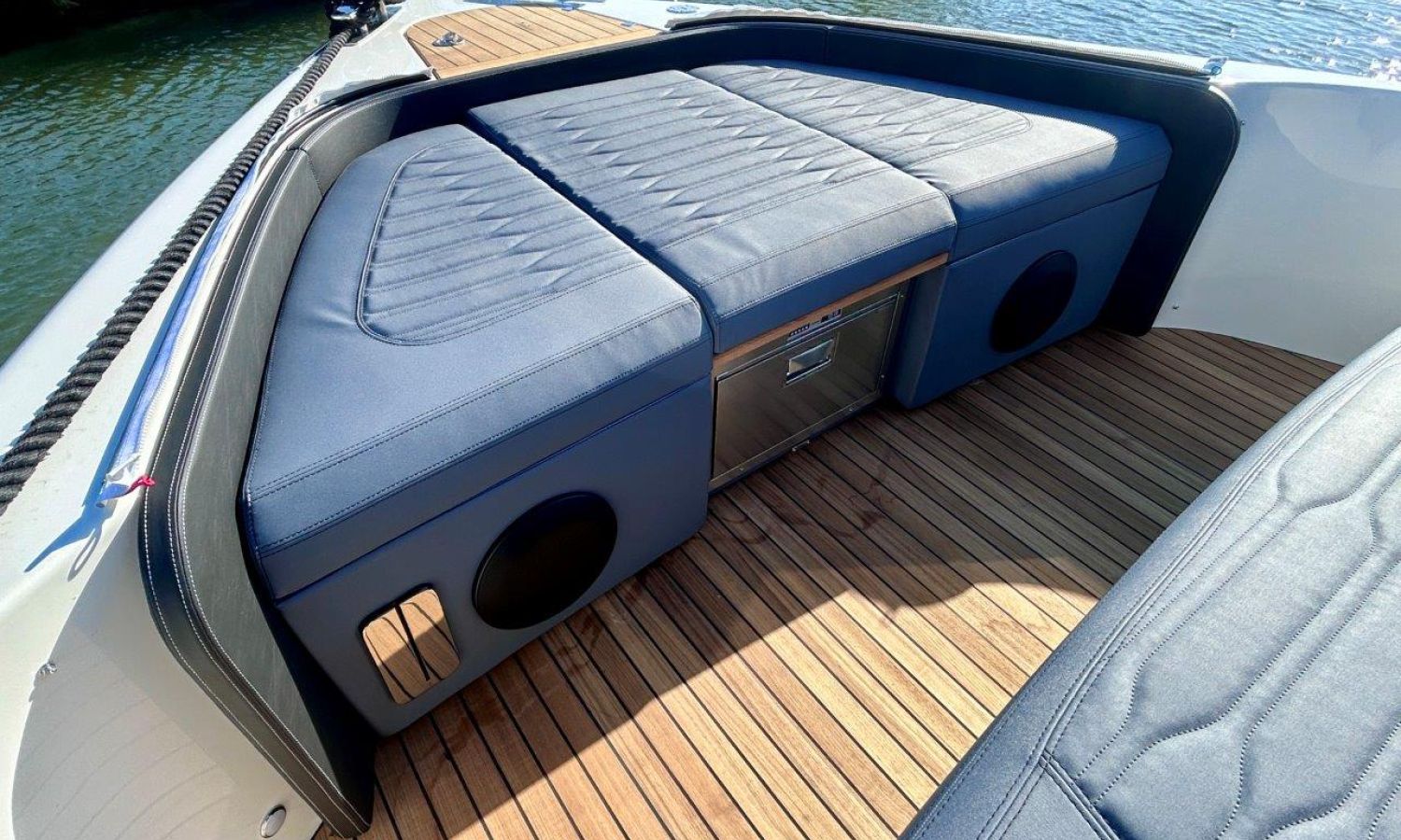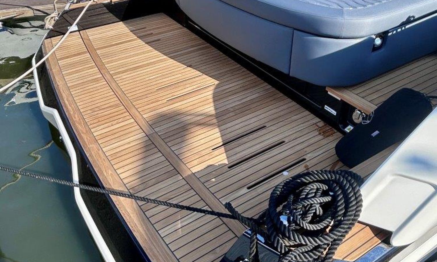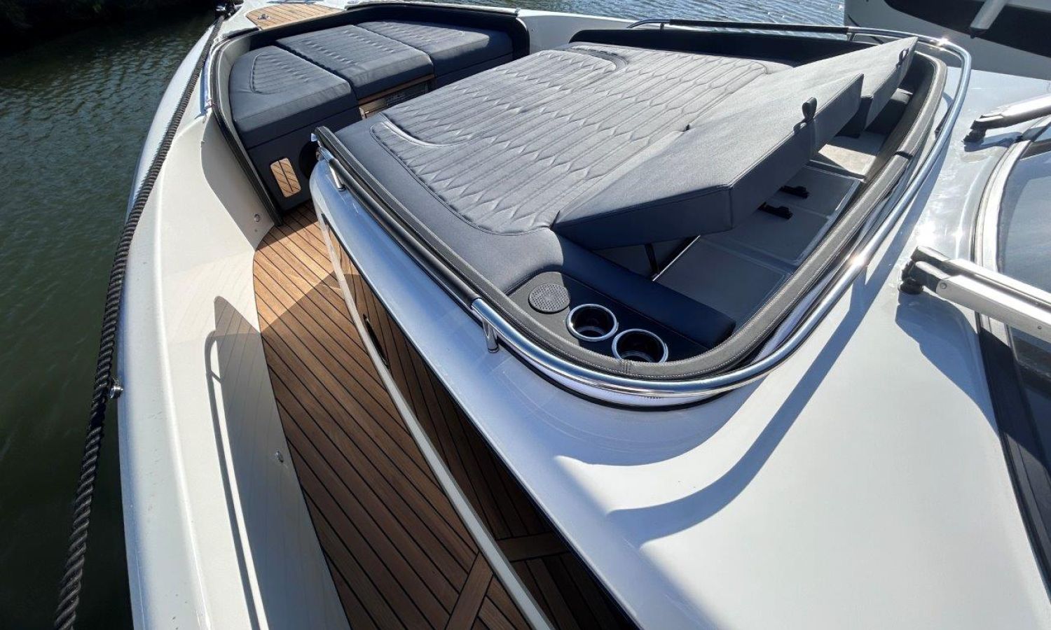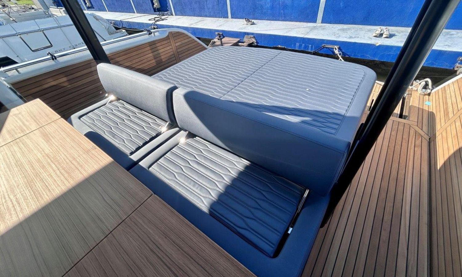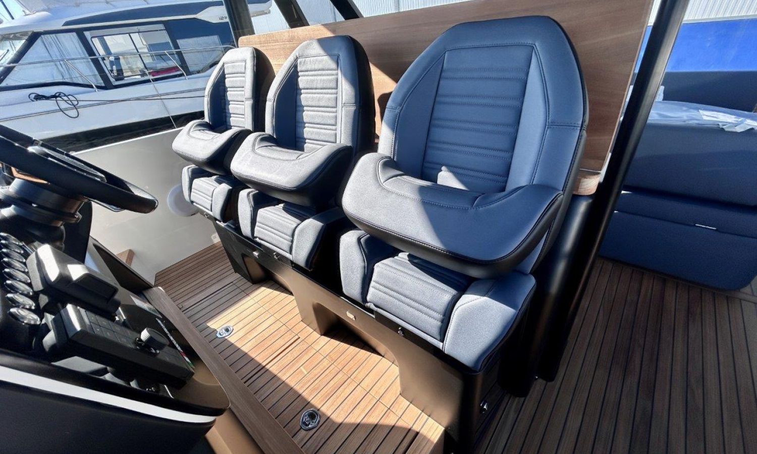 Bilge micro-suction system - Waste water tank - Air conditioning 16.000 BTU in cabins with heat pump - Set covers (for dashboard, pilot seat, stern sofa, cockpit table, cockpit wetbar and stern sun cushion) - Automatic List Control + Coordinated Turn Control - Bow thruster - Cockpit refrigerator - Generator 8 kW - Electric cockpit grill - Ice-maker - Aft lowering bulkwarks right and left - Black microperforated privacy screen with white logo A 46 Luxury Tender - Hydraulic gangway - Autopilot - Up/down hydraulic stern platform - 2 Plotter screens 16" - Teak laid cockpit and teak on aft lowering bulkwarks - Solid teak coverings on lateral stringers - Electric sunshade - T-Top - VHF - CE Certificate - Fender covers (alternative colour to standard one) - Exterior upholstery (alternative colour to standard one) - T-Top lacquered - Preparation, launch and delivery with sea trial - Transport shipyard to Costa Brava.Boat description