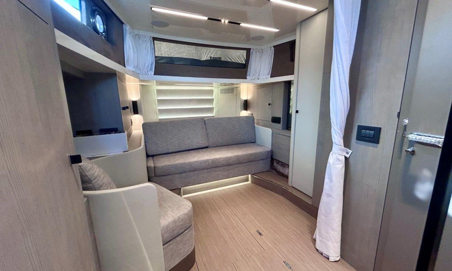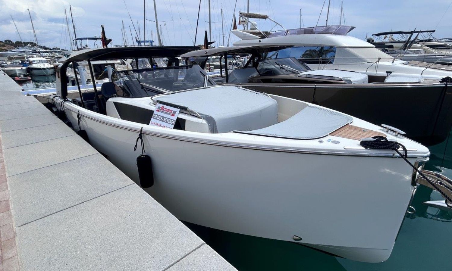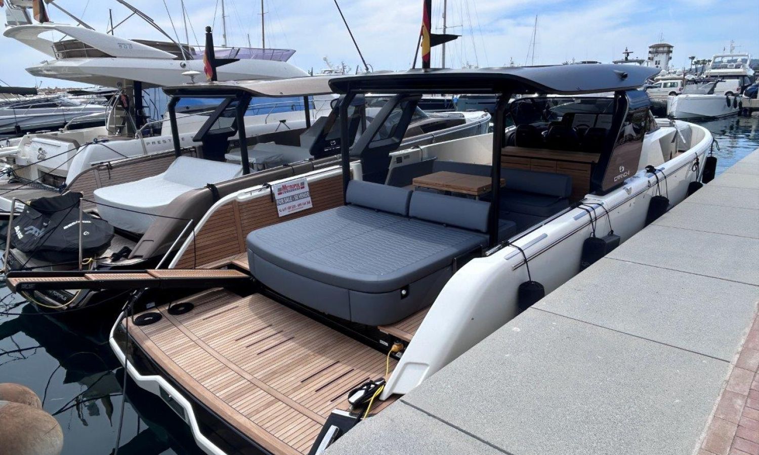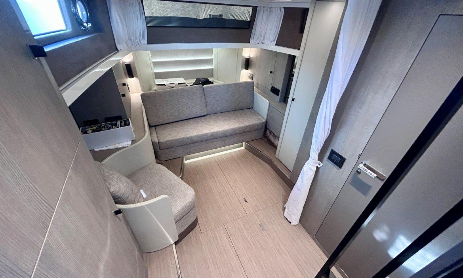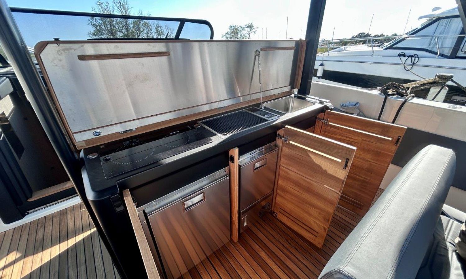 Bilge micro-suction system - Waste water tank - Air conditioning 16.000 BTU in cabins with heat pump - Set covers (for dashboard, pilot seat, stern sofa, cockpit table, cockpit wetbar and stern sun cushion) - Automatic List Control + Coordinated Turn Control - Bow thruster - Cockpit refrigerator - Generator 8 kW - Electric cockpit grill - Ice-maker - Aft lowering bulkwarks right and left - Black microperforated privacy screen with white logo A 46 Luxury Tender - Hydraulic gangway - Autopilot - Up/down hydraulic stern platform - 2 Plotter screens 16" - Teak laid cockpit and teak on aft lowering bulkwarks - Solid teak coverings on lateral stringers - Electric sunshade - T-Top - VHF - CE Certificate - Fender covers (alternative colour to standard one) - Exterior upholstery (alternative colour to standard one) - T-Top lacquered - Preparation, launch and delivery with sea trial - Transport shipyard to Costa Brava.Boat description