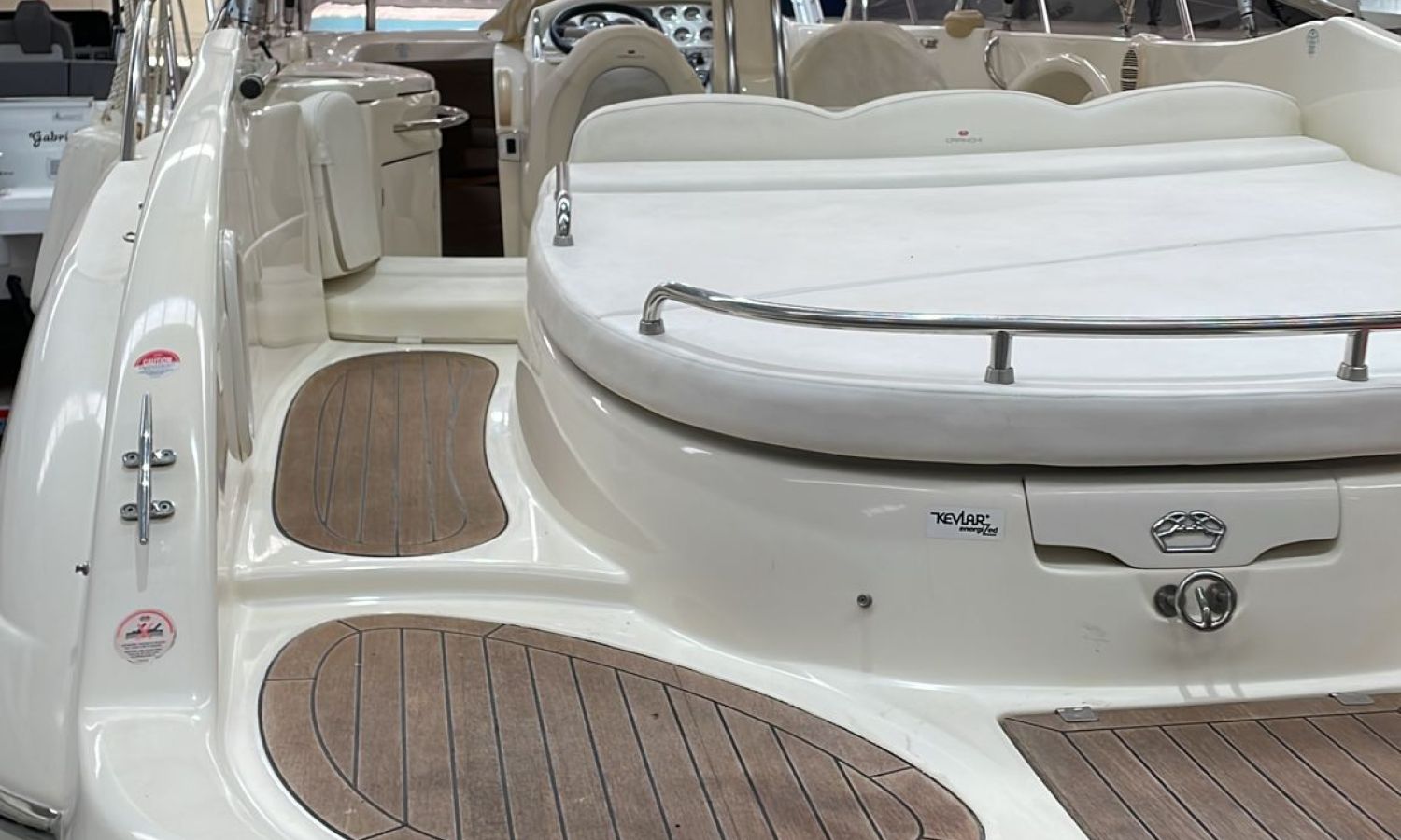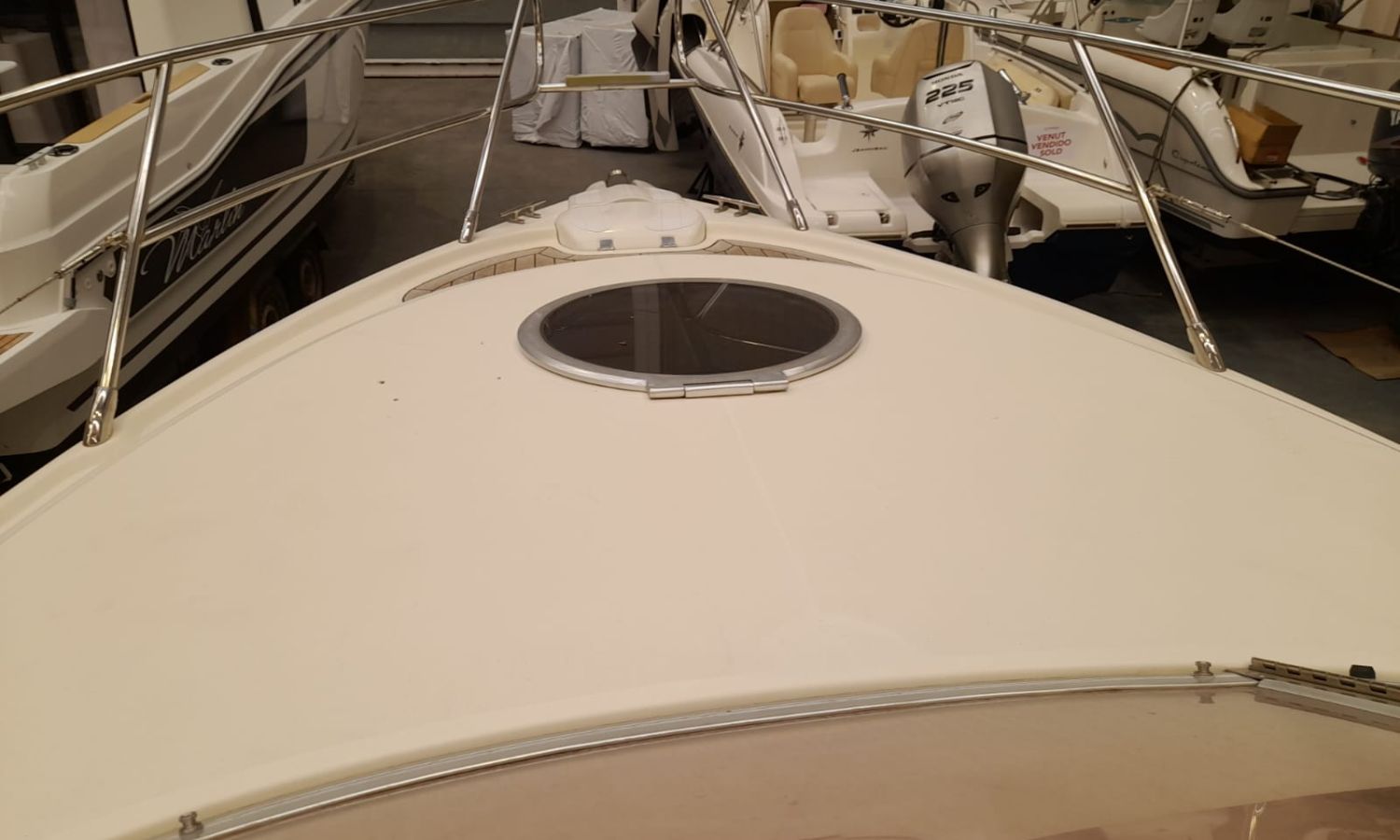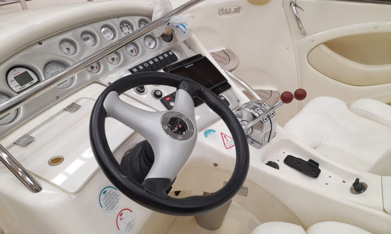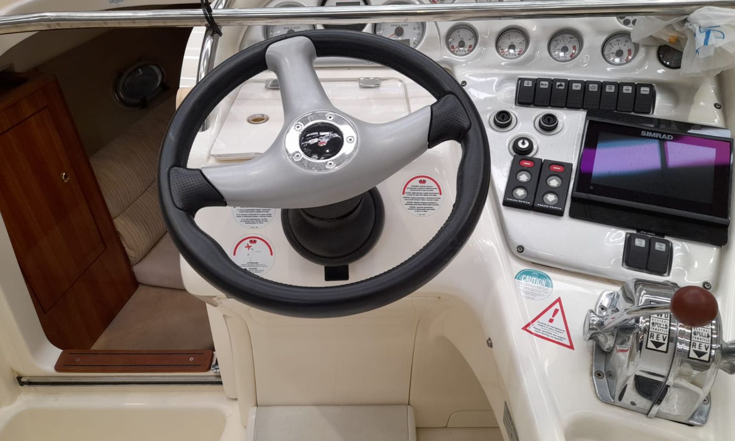 Bimini top - Stern shower - Stern platform with bathing ladder - Stern sundeck with hydraulic opening for access to the engine room - Gps/Plotter/Sondeur - VHF - Cockpit table - Offshore power 220 V. - Battery charger - Flaps - Wet-bar with sink - Cockpit refrigerator - Electric anchor winch with chain and anchor - Marine WC with waste water tank - Cabin - Cockpit cover - Antifouling.Boat description