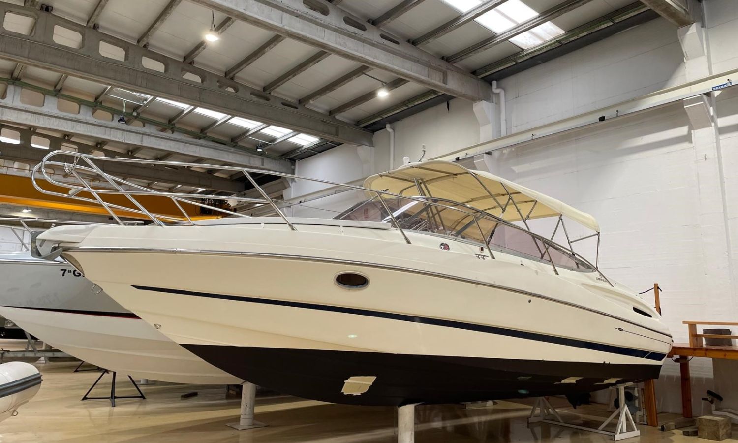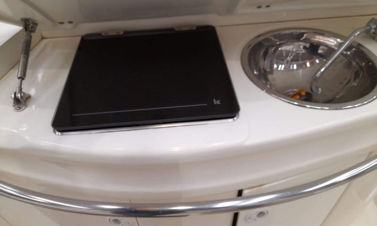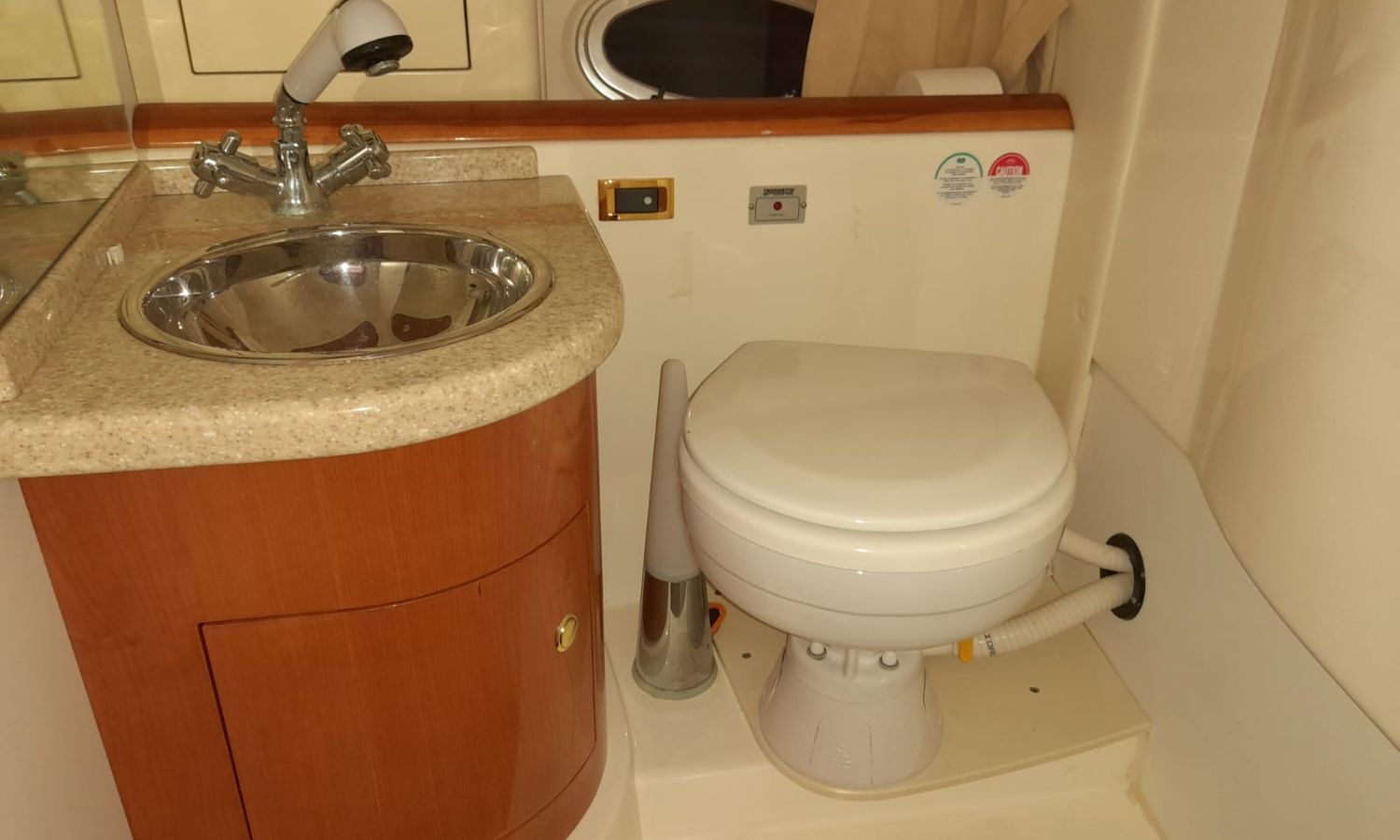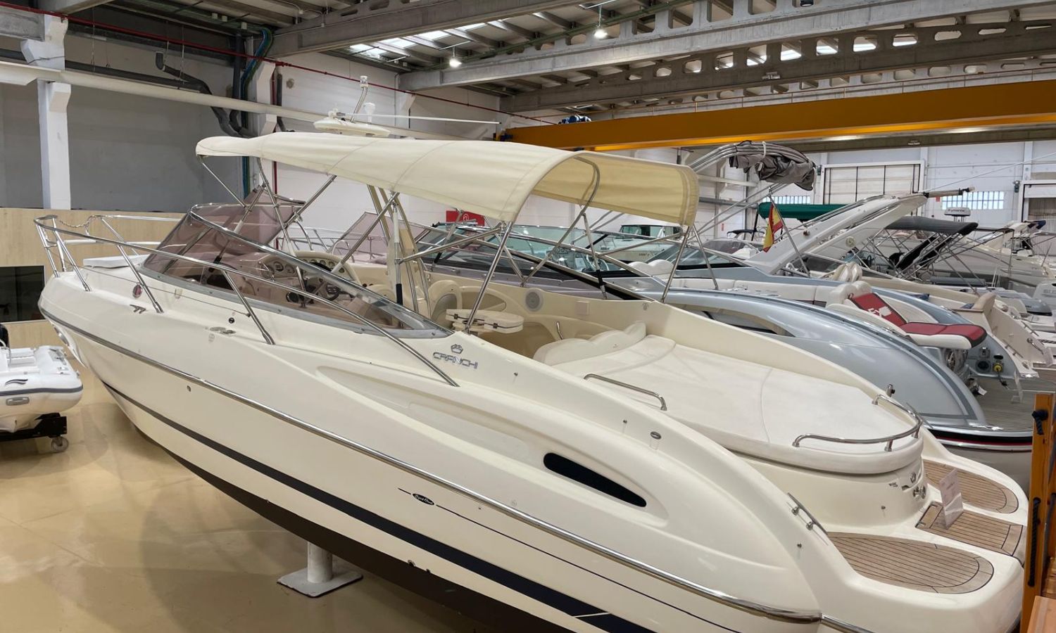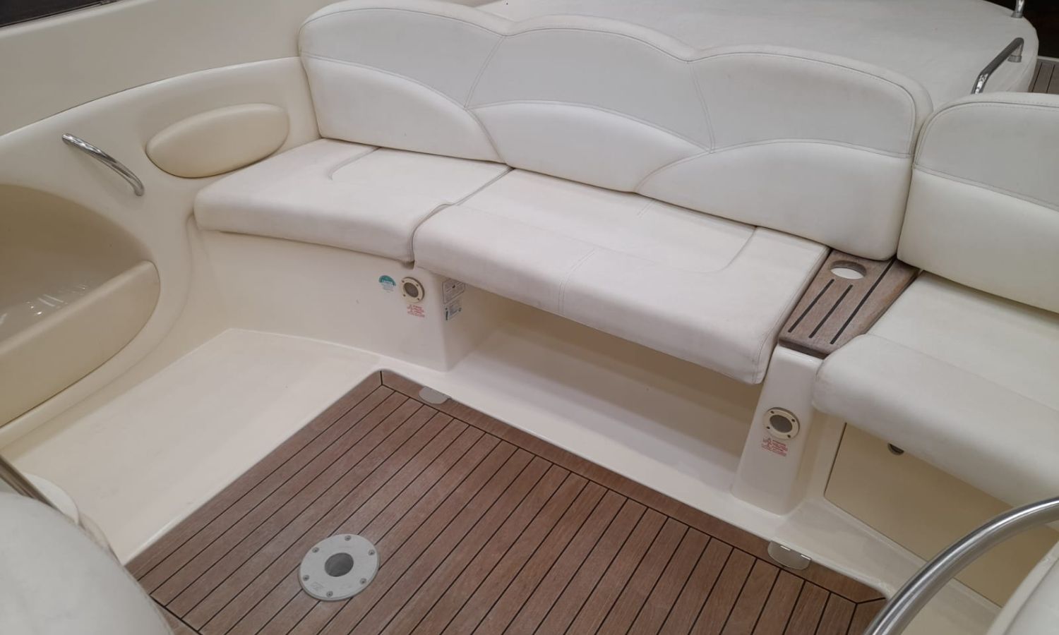 Bimini top - Stern shower - Stern platform with bathing ladder - Stern sundeck with hydraulic opening for access to the engine room - Gps/Plotter/Sondeur - VHF - Cockpit table - Offshore power 220 V. - Battery charger - Flaps - Wet-bar with sink - Cockpit refrigerator - Electric anchor winch with chain and anchor - Marine WC with waste water tank - Cabin - Cockpit cover - Antifouling.Boat description