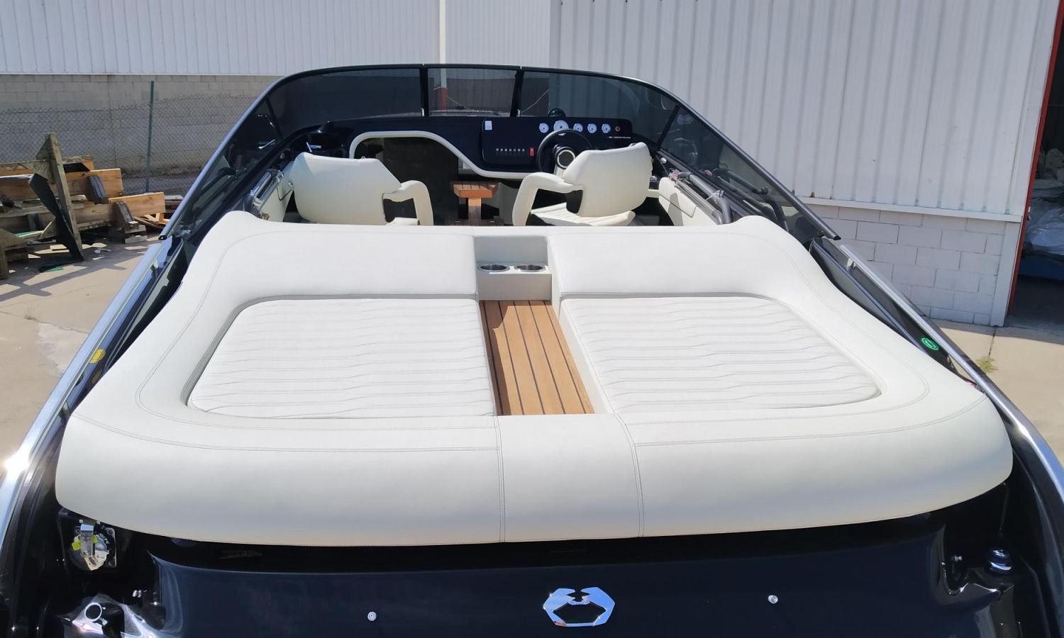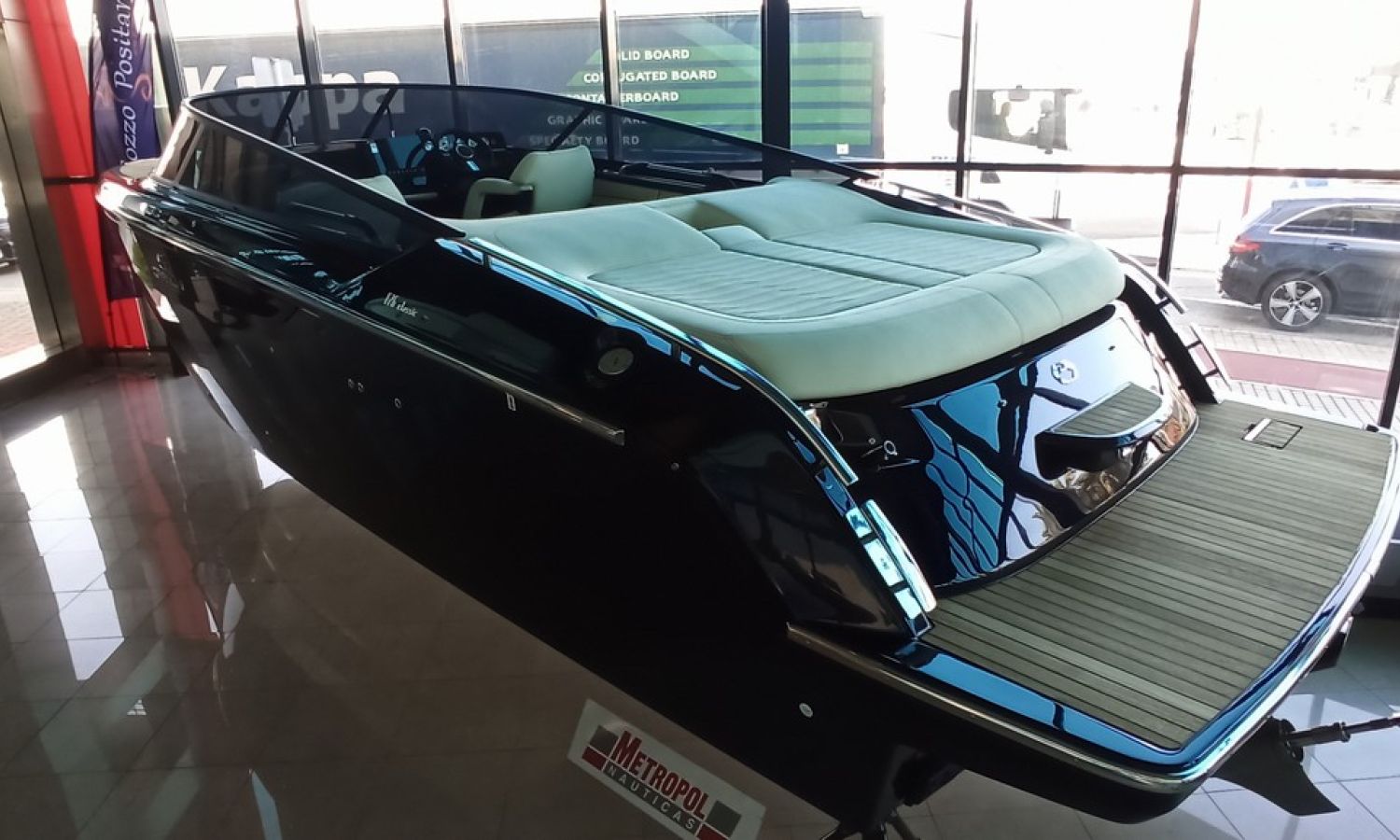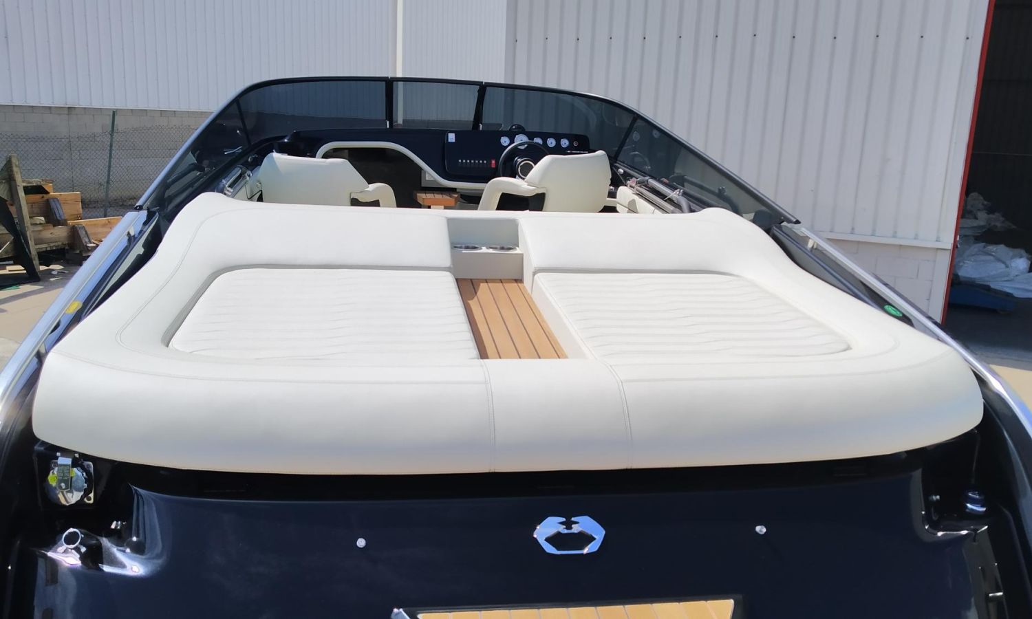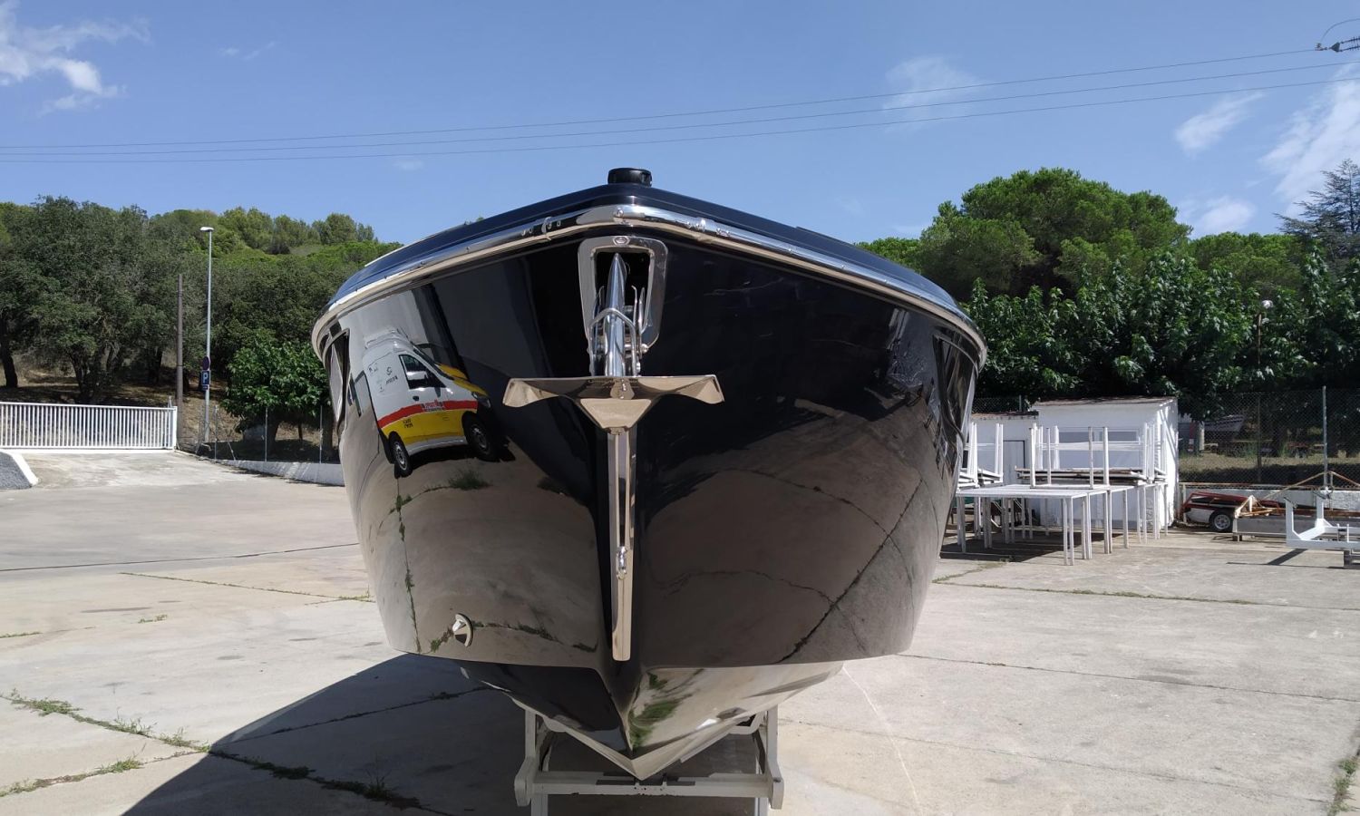 Waste water tank - Bimini top black microperforated - Bow thruster with automatic fire extinguisher - Cabin refrigerator 42 l - 230 V electric wiring system with battery charger and shore power with cable - 6 Fenders and covers - Radio Fusion Bluetooth/USB - Cockpit table with cover - Complete foredeck teak laid - Teak laid cockpit - Cockpit cover - Electric anchor winch with anchor and chain - Electric marine WC with cover - Fender covers alternative colour to standard one - Exterior upholstery Silvertex - Hull and deck colour lacquered - CE certificate and declaration of conformity - Transport shipyard to Costa Brava.Boat description