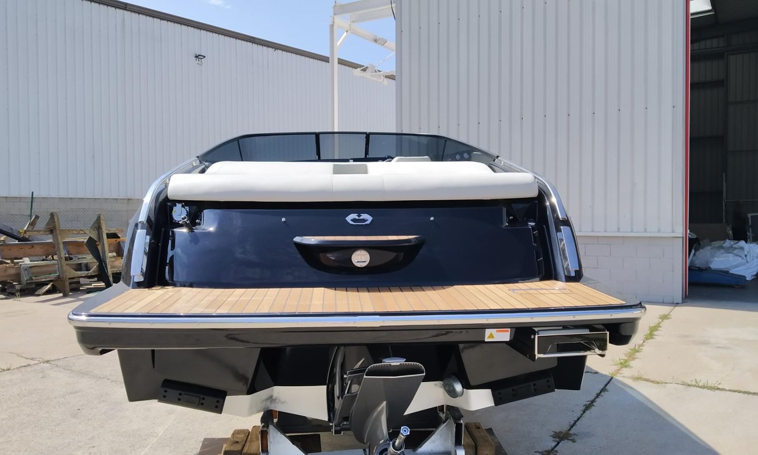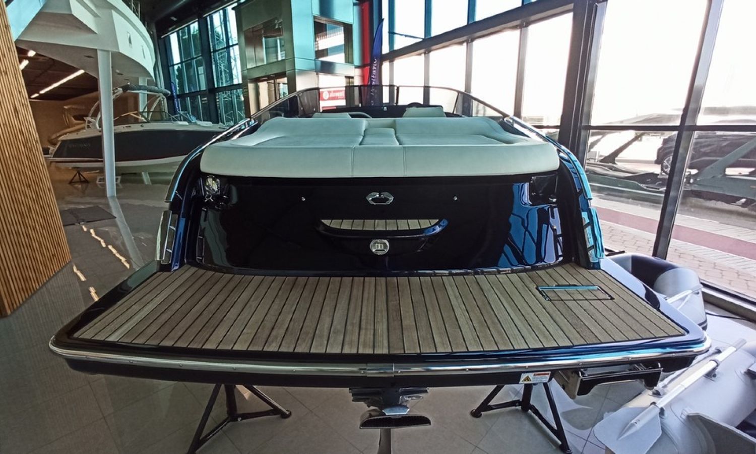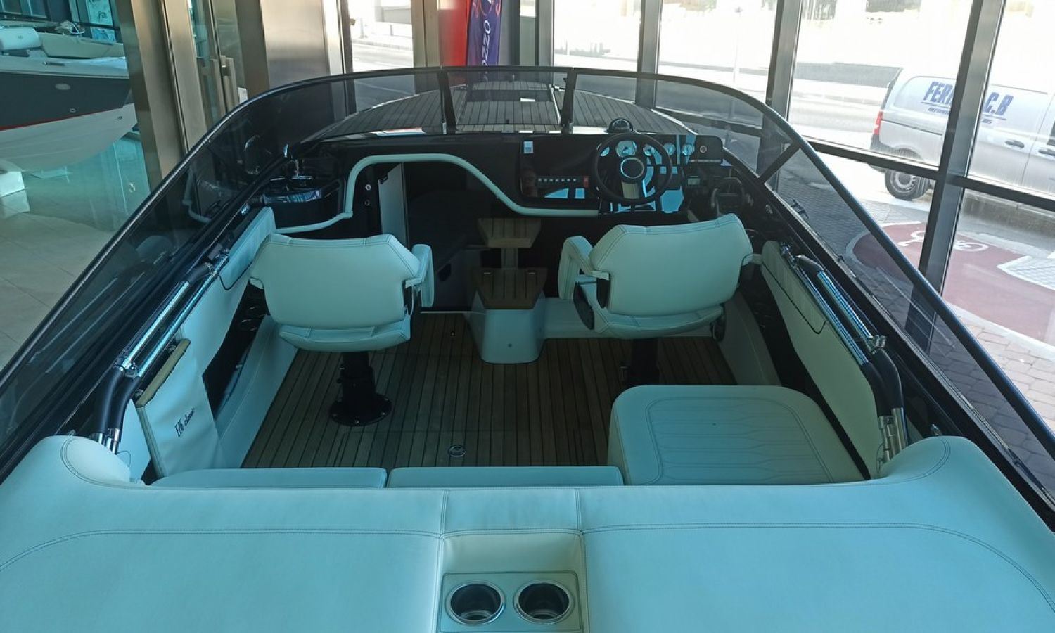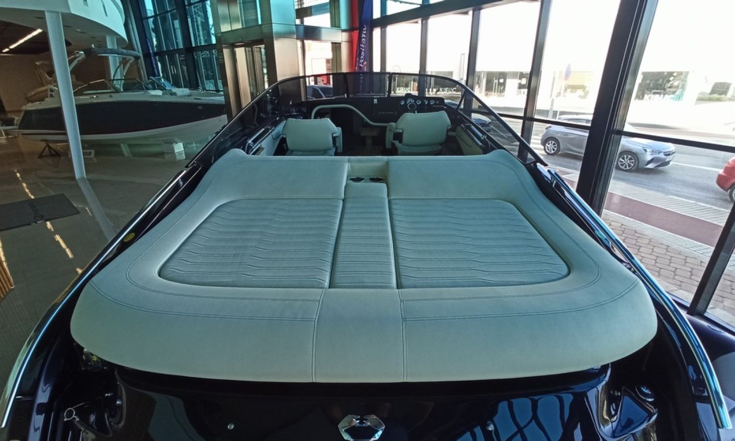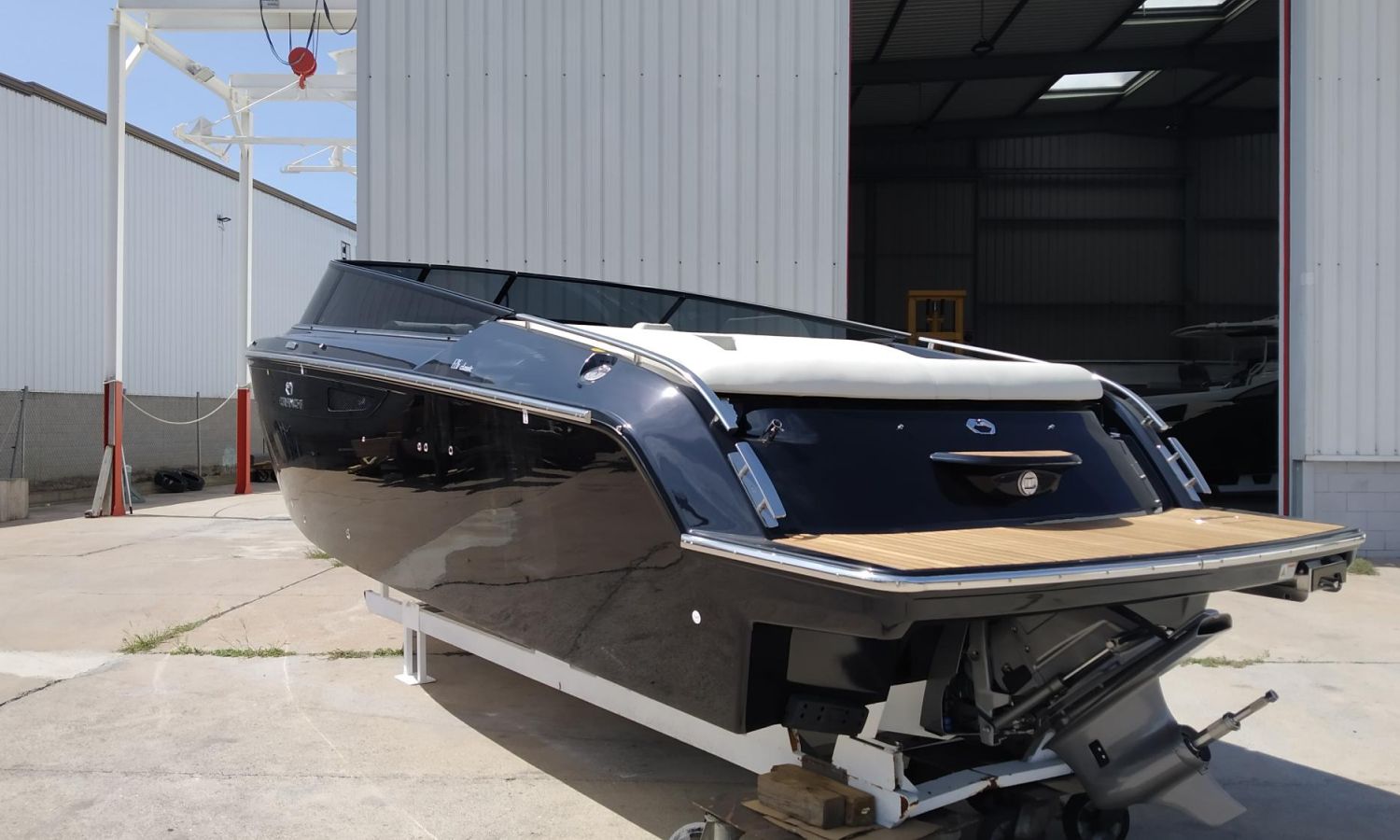 Waste water tank - Bimini top black microperforated - Bow thruster with automatic fire extinguisher - Cabin refrigerator 42 l - 230 V electric wiring system with battery charger and shore power with cable - 6 Fenders and covers - Radio Fusion Bluetooth/USB - Cockpit table with cover - Complete foredeck teak laid - Teak laid cockpit - Cockpit cover - Electric anchor winch with anchor and chain - Electric marine WC with cover - Fender covers alternative colour to standard one - Exterior upholstery Silvertex - Hull and deck colour lacquered - CE certificate and declaration of conformity - Transport shipyard to Costa Brava.Boat description