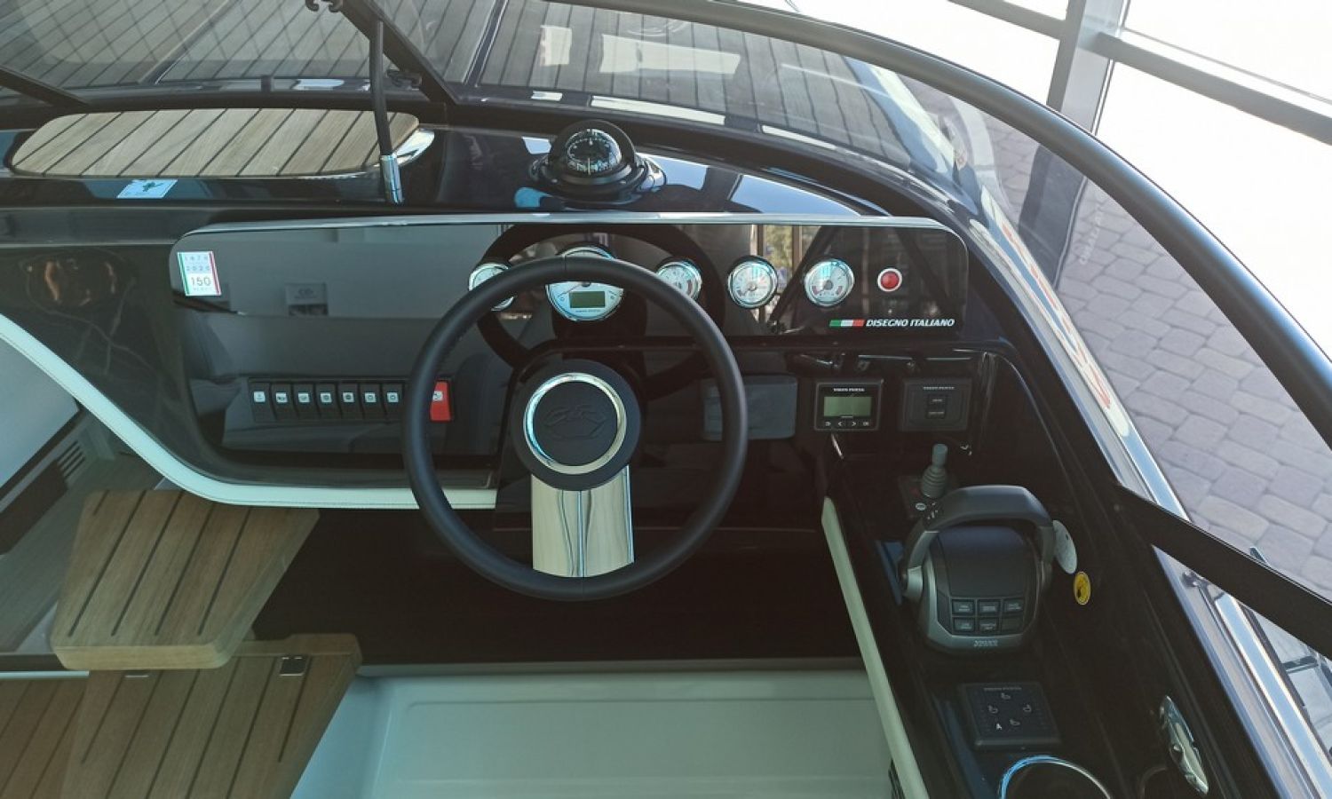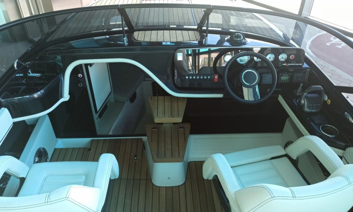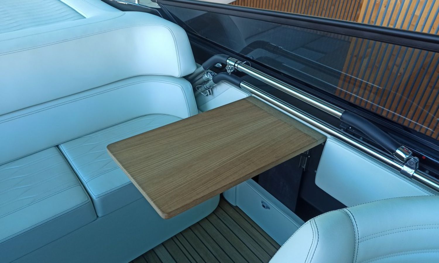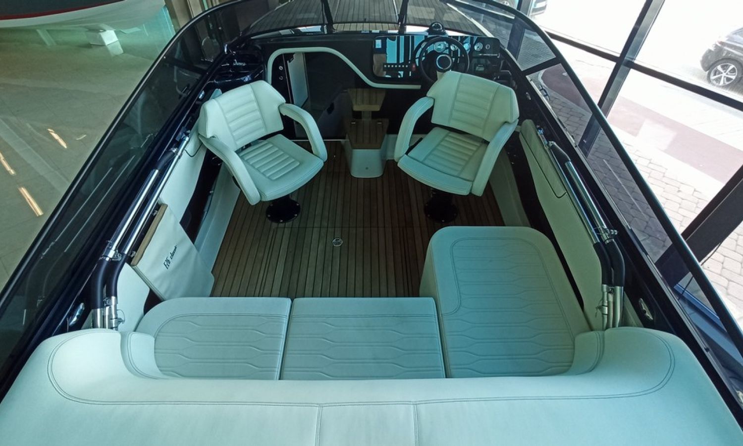 Waste water tank - Bimini top black microperforated - Bow thruster with automatic fire extinguisher - Cabin refrigerator 42 l - 230 V electric wiring system with battery charger and shore power with cable - 6 Fenders and covers - Radio Fusion Bluetooth/USB - Cockpit table with cover - Complete foredeck teak laid - Teak laid cockpit - Cockpit cover - Electric anchor winch with anchor and chain - Electric marine WC with cover - Fender covers alternative colour to standard one - Exterior upholstery Silvertex - Hull and deck colour lacquered - CE certificate and declaration of conformity - Transport shipyard to Costa Brava.Boat description