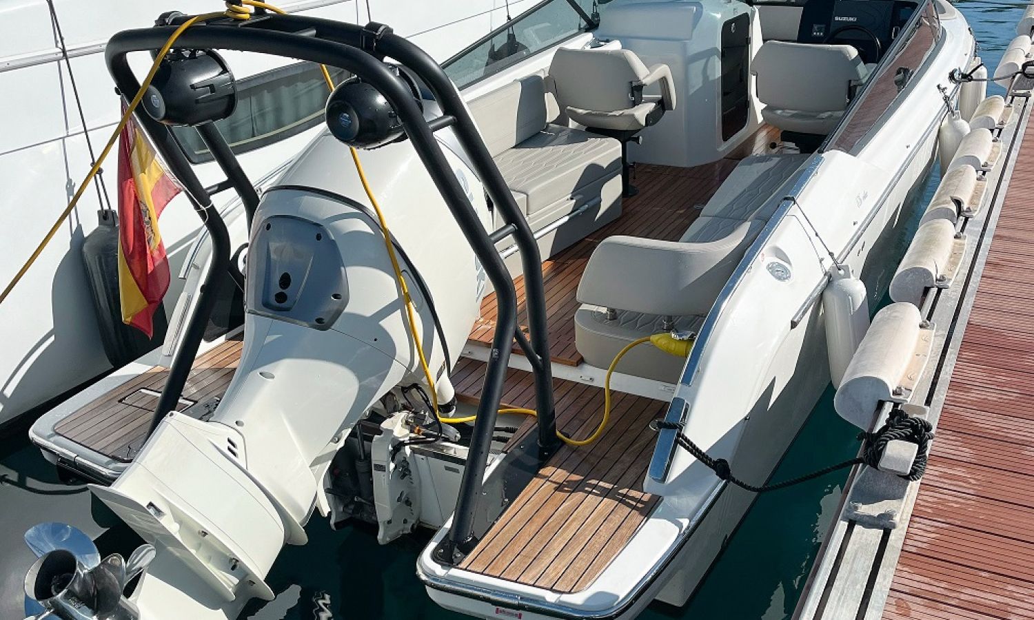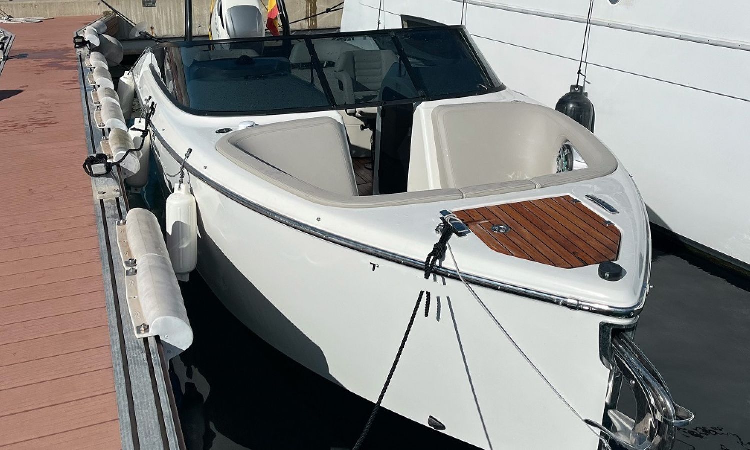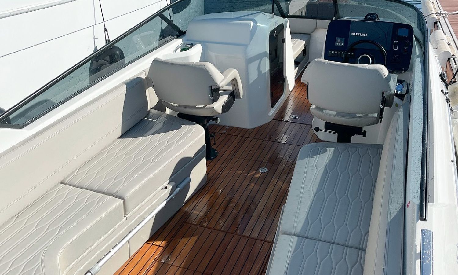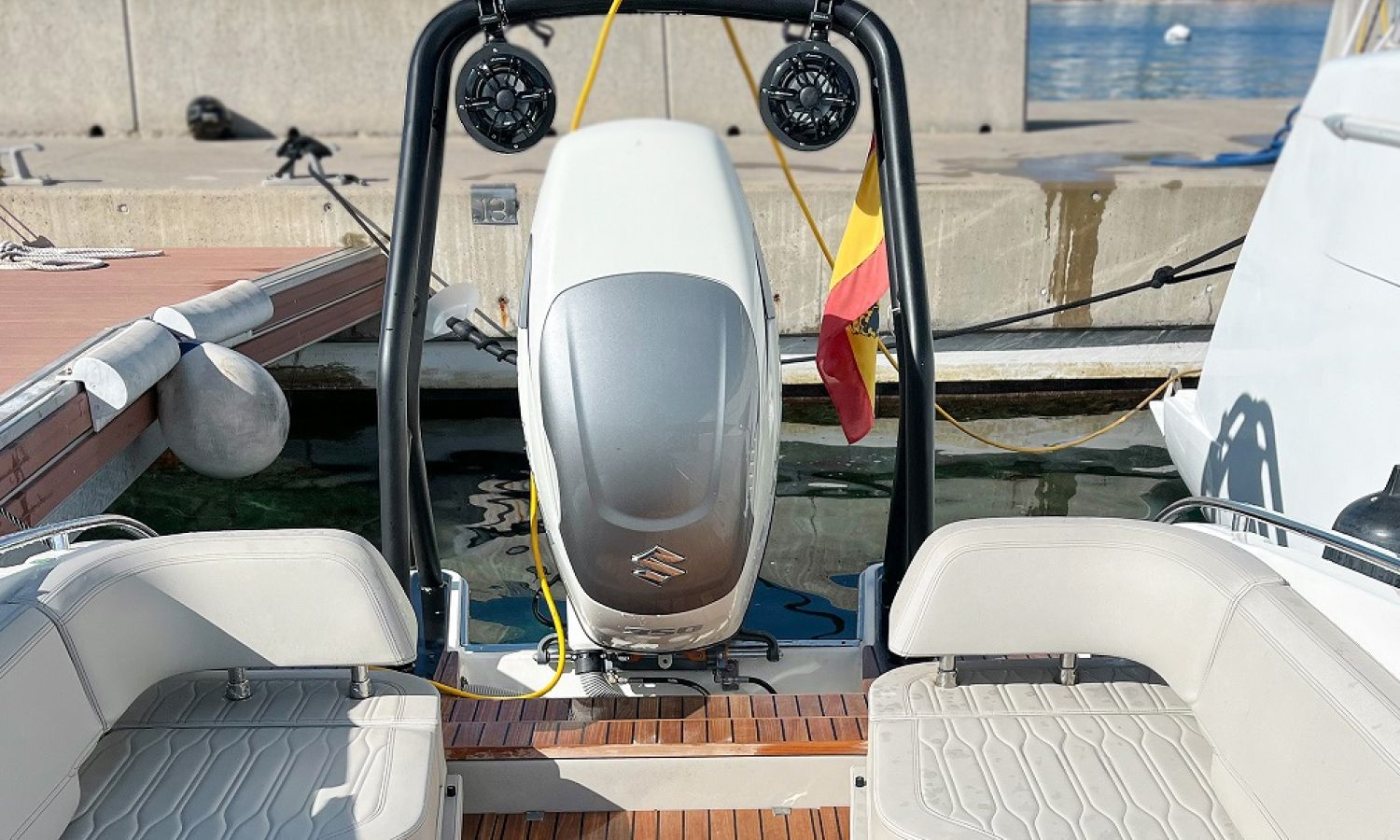 Wakeboard arch - Pack audio fusion with four speakers two fusion two pionner in the arch - Display Suzuki system with info meteo - Gps - Plotter - Bow trhuster Side-Power Sleipner - Bimini top with cover - Bow cushions - Full aft cushions - Two pilot and copilot seats with 360 º rotation - Fridge Isotherm 42 l. 12v - Blue underwater lights - Electric windlass - Stainless steel anchor - New two battery - Anchoring system fenders Quickset - Canvas camper - Teak laid cockpit - Additional lights in cockpit.Boat description