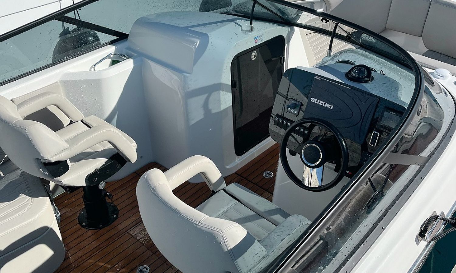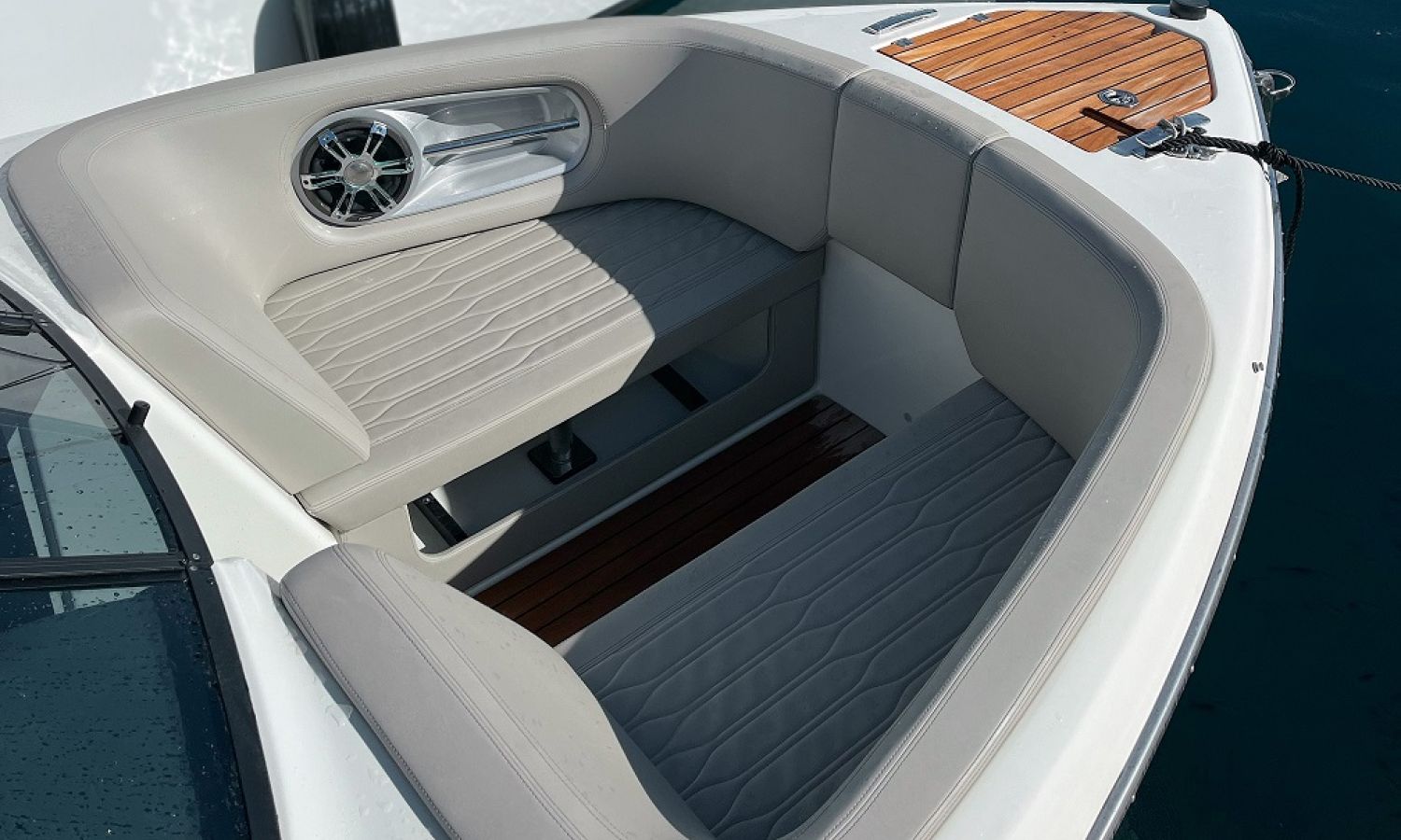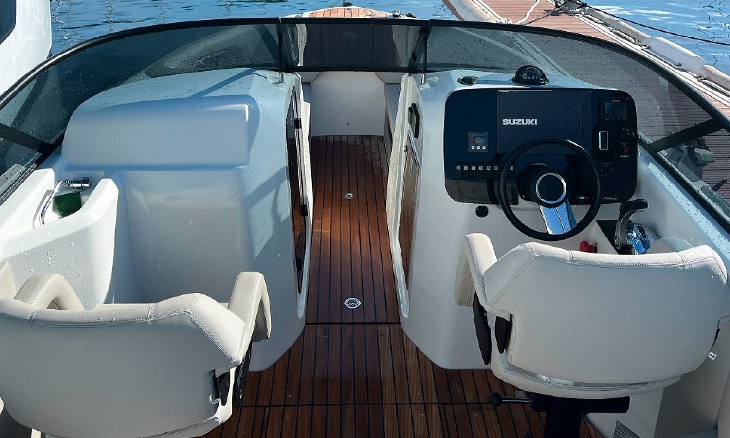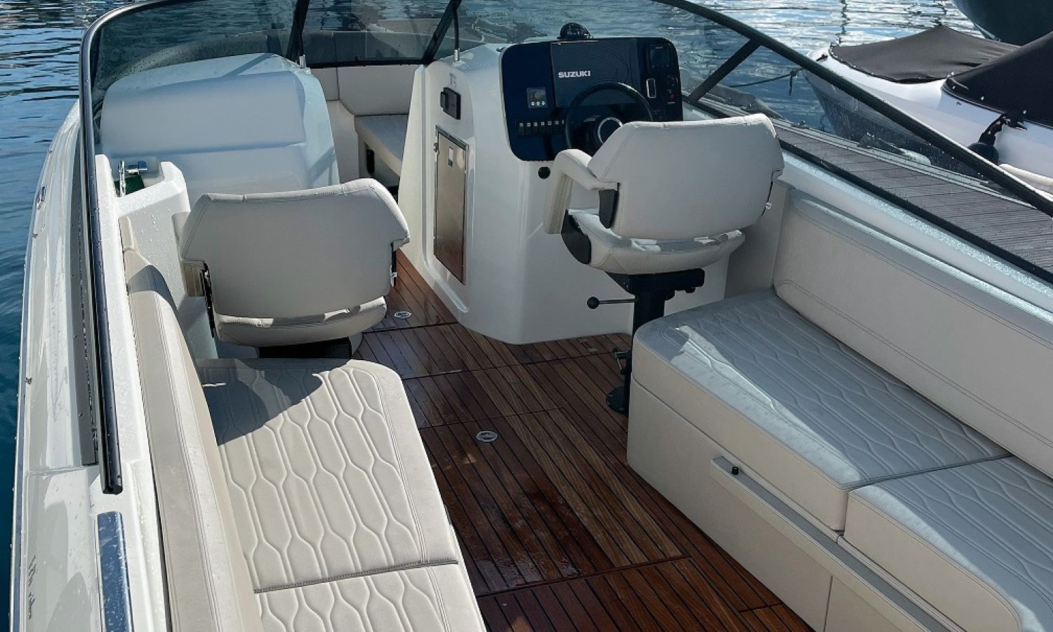 Wakeboard arch - Pack audio fusion with four speakers two fusion two pionner in the arch - Display Suzuki system with info meteo - Gps - Plotter - Bow trhuster Side-Power Sleipner - Bimini top with cover - Bow cushions - Full aft cushions - Two pilot and copilot seats with 360 º rotation - Fridge Isotherm 42 l. 12v - Blue underwater lights - Electric windlass - Stainless steel anchor - New two battery - Anchoring system fenders Quickset - Canvas camper - Teak laid cockpit - Additional lights in cockpit.Boat description