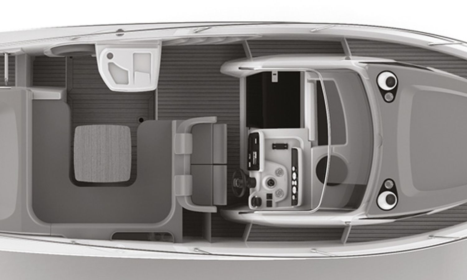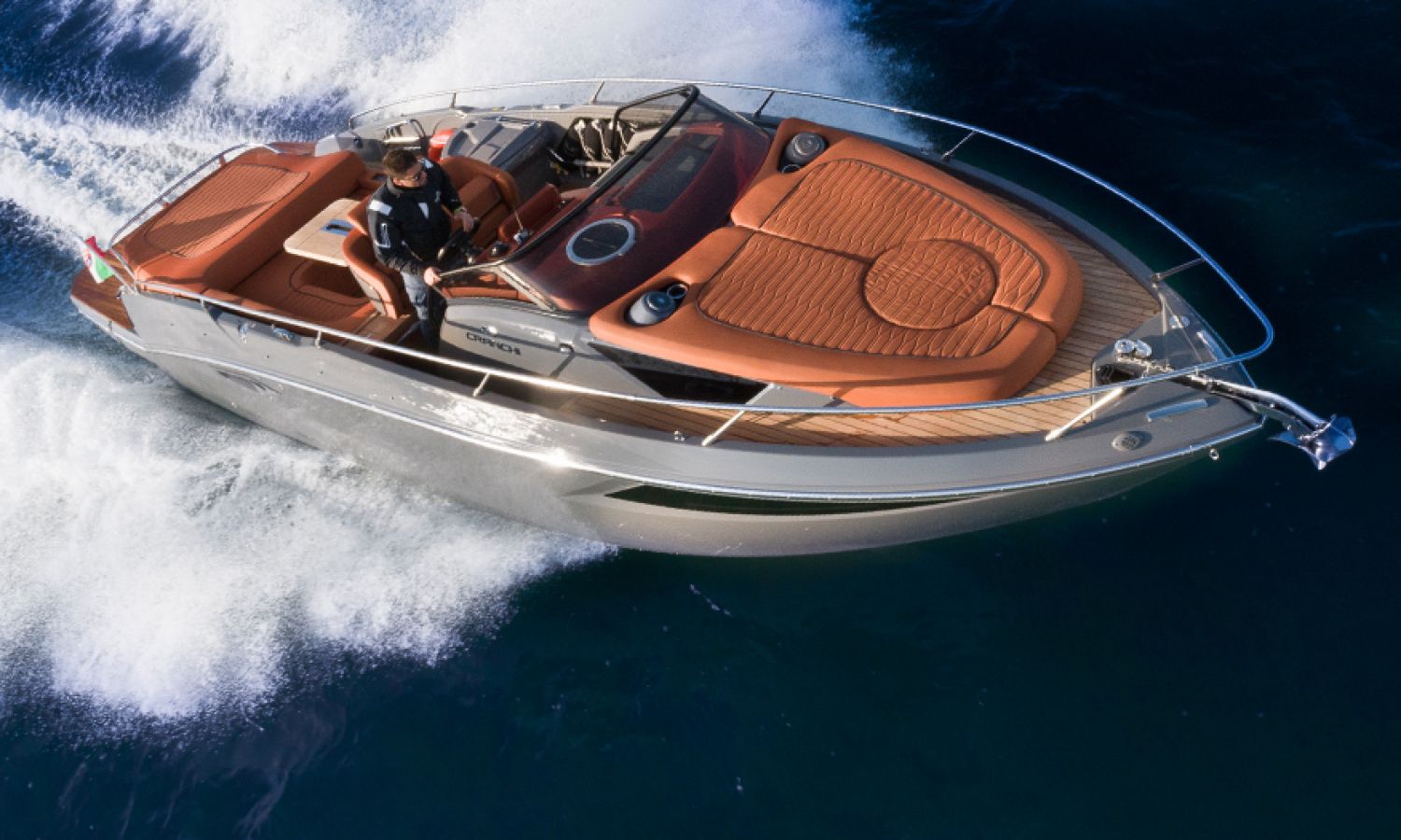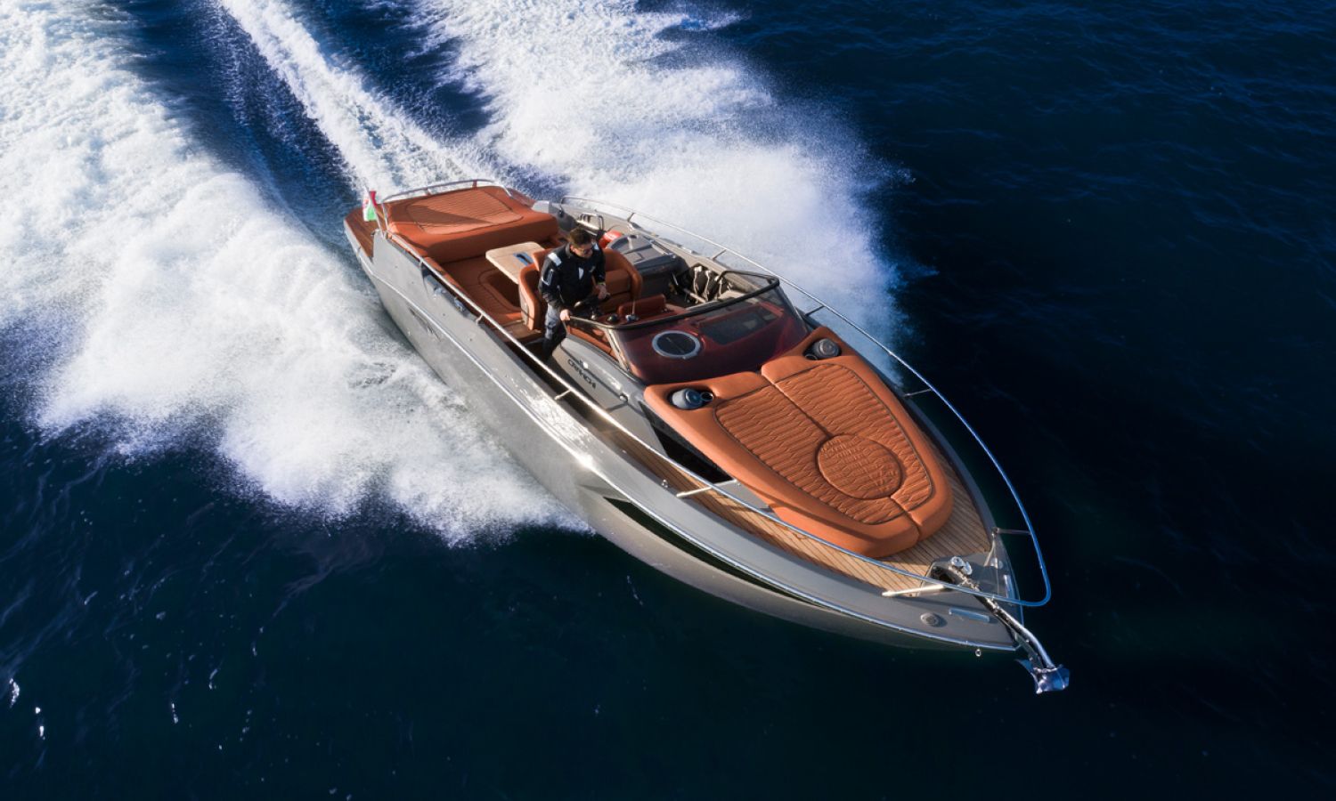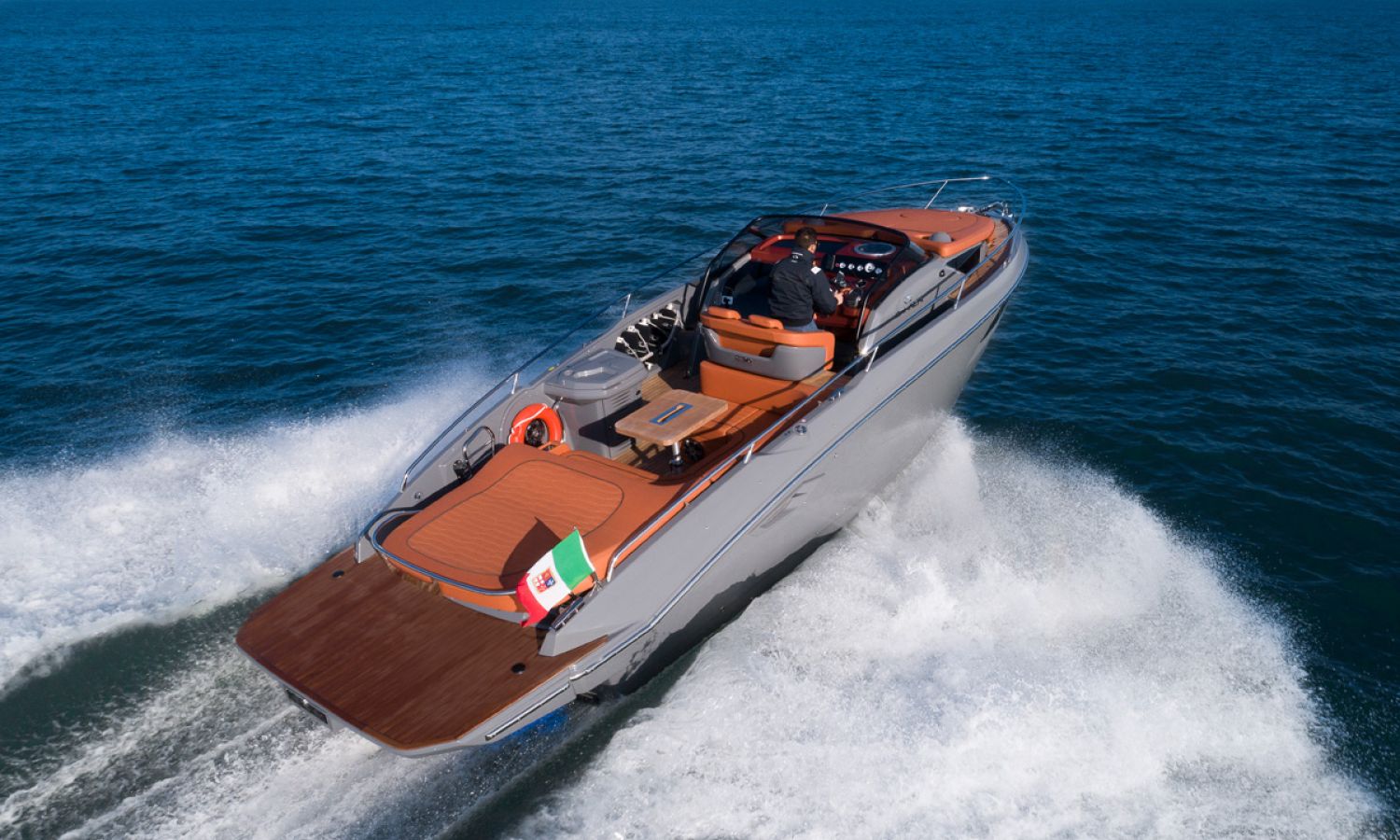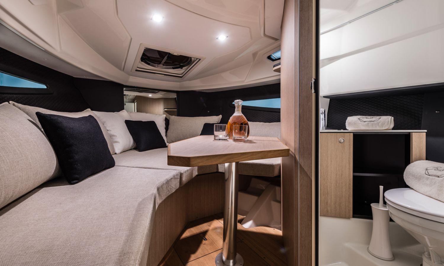 Boat of a sporty nature with a spirited and sharp line. The interior is featured with wide spaces and a separate bathroom. Outside the big sunbathing area with a wet-bar and several cockpit seats are perfect to enjoy boating.