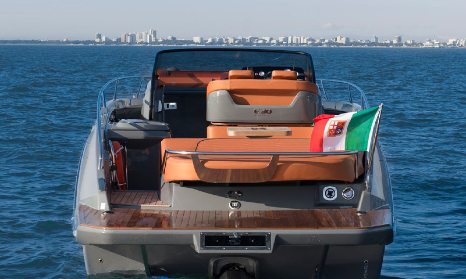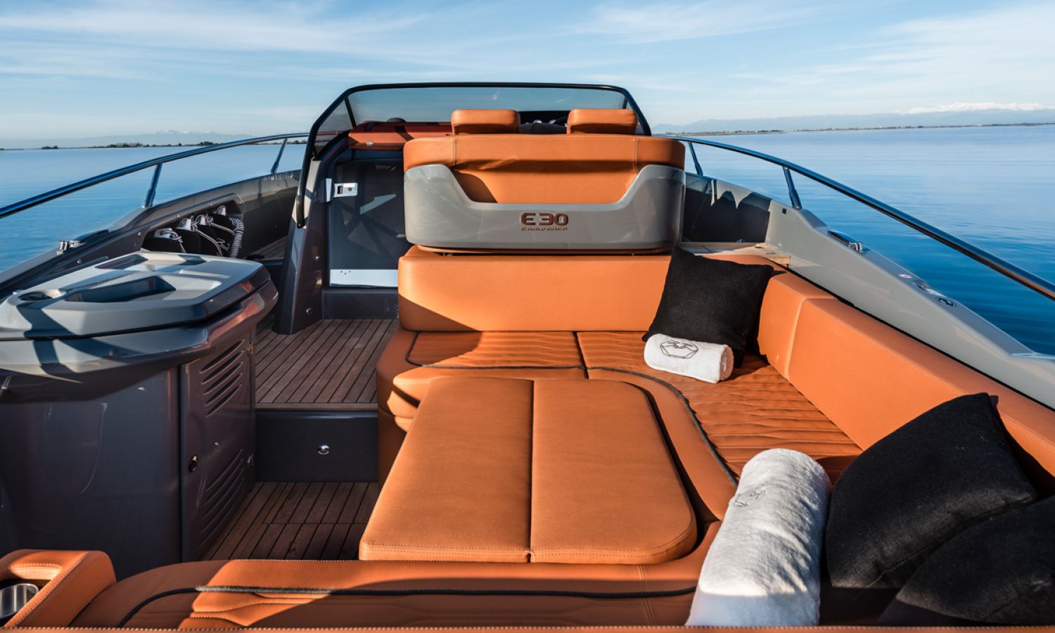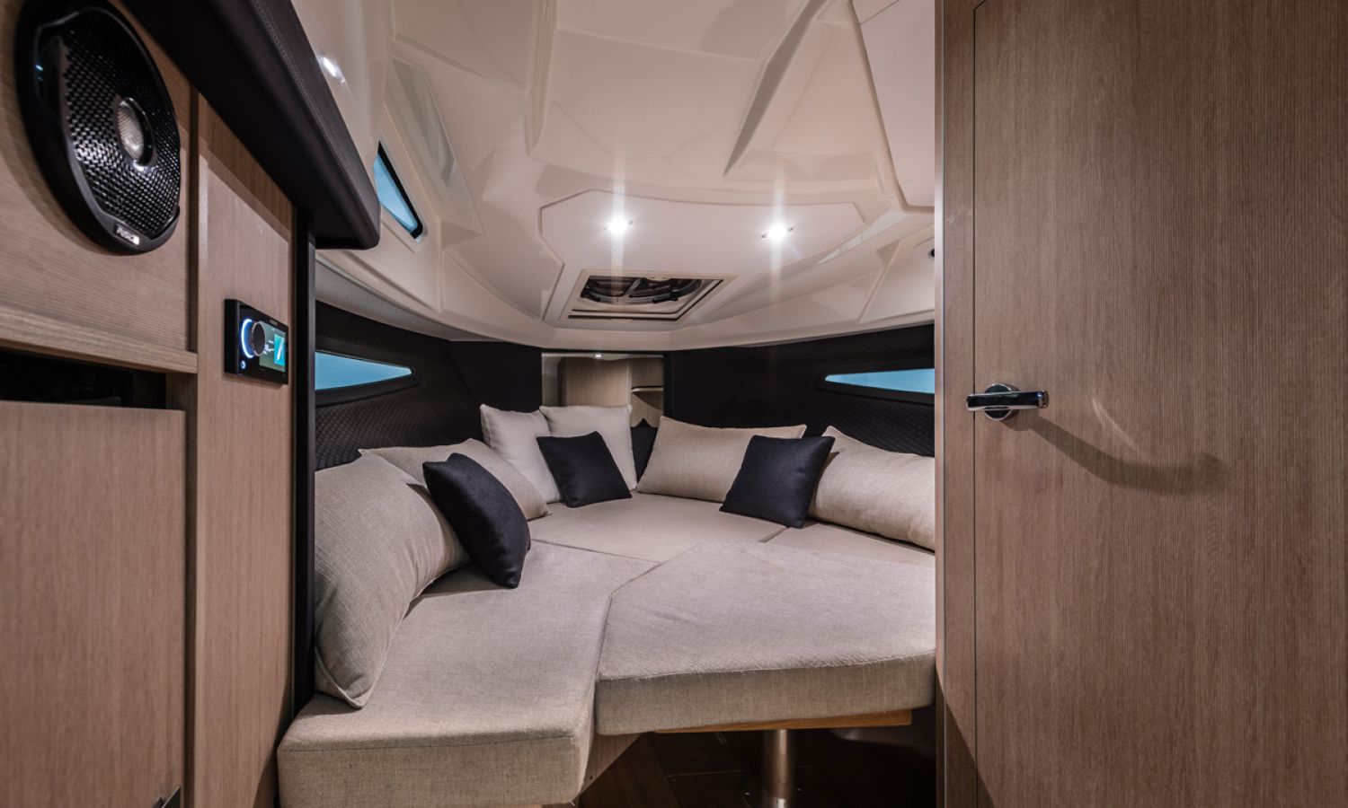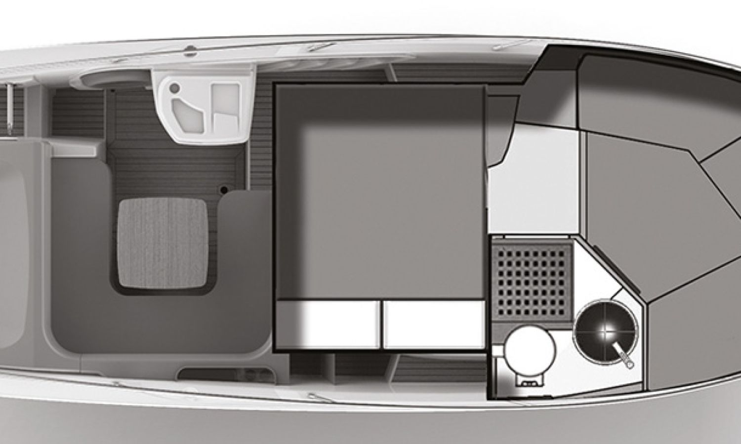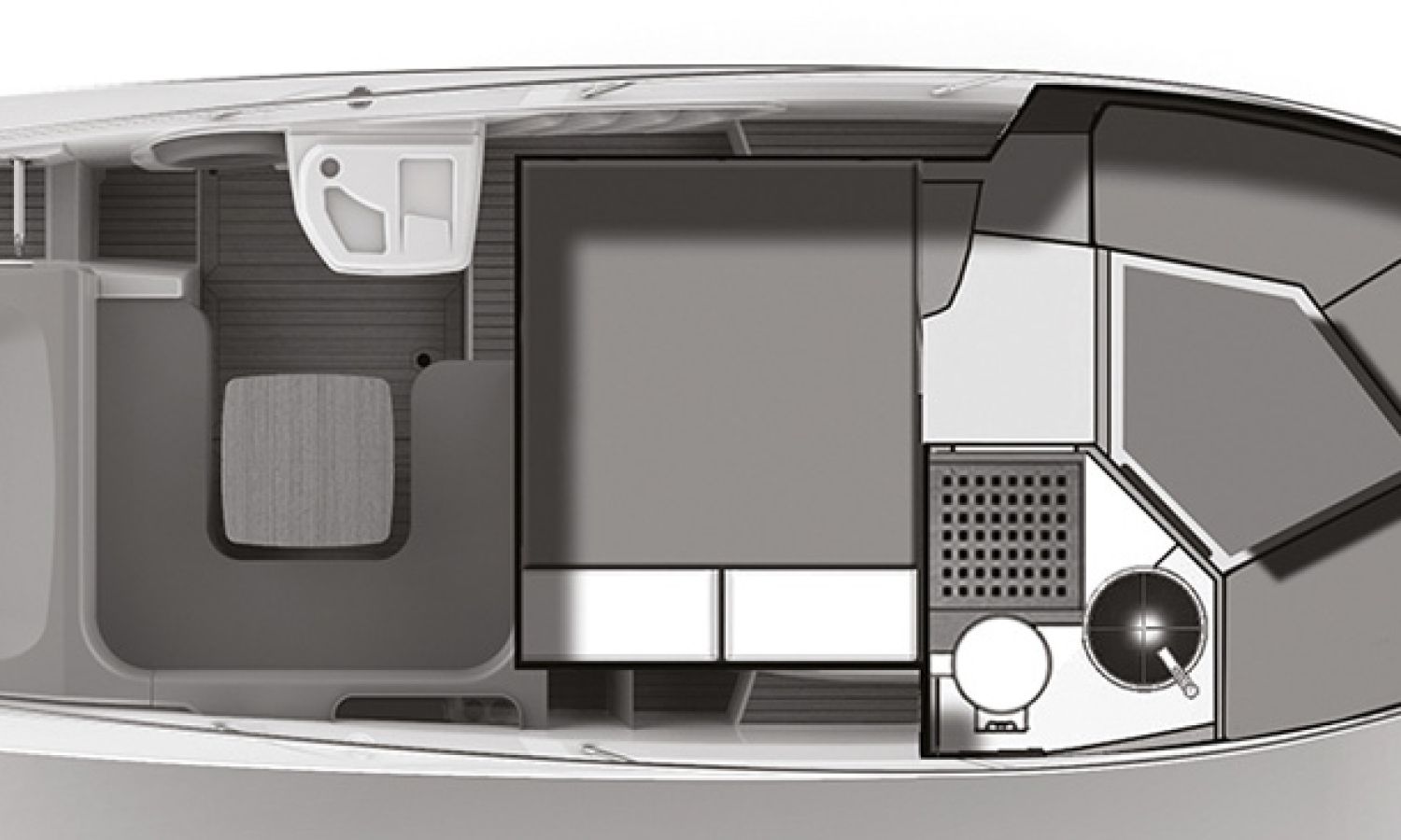 Boat of a sporty nature with a spirited and sharp line. The interior is featured with wide spaces and a separate bathroom. Outside the big sunbathing area with a wet-bar and several cockpit seats are perfect to enjoy boating.