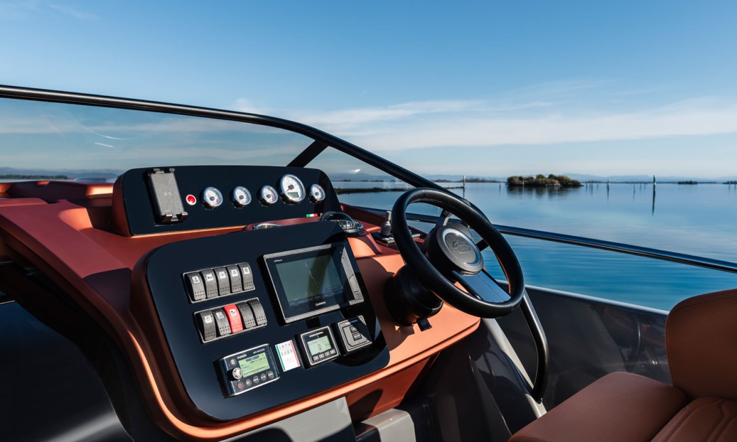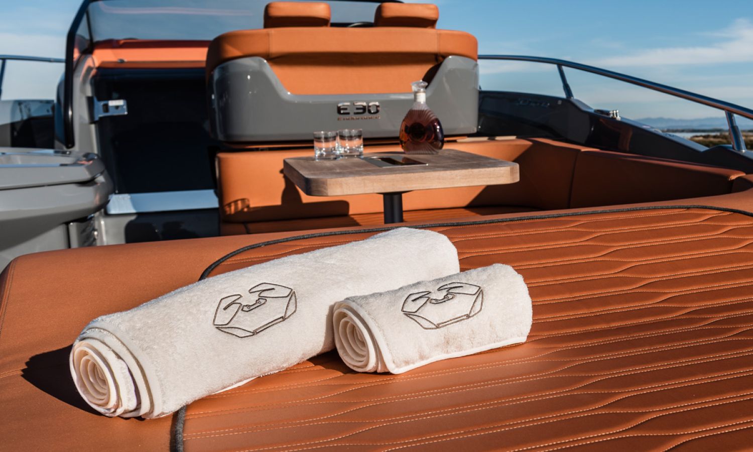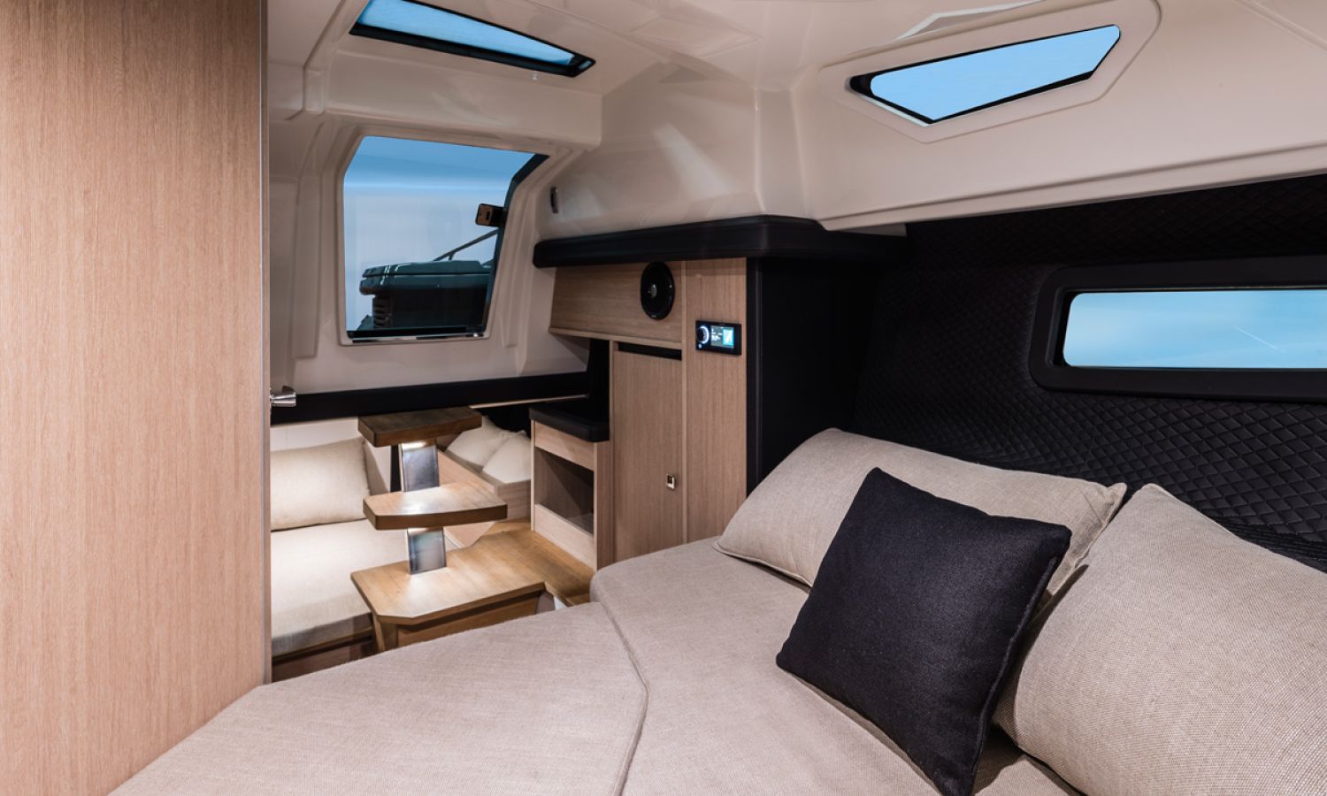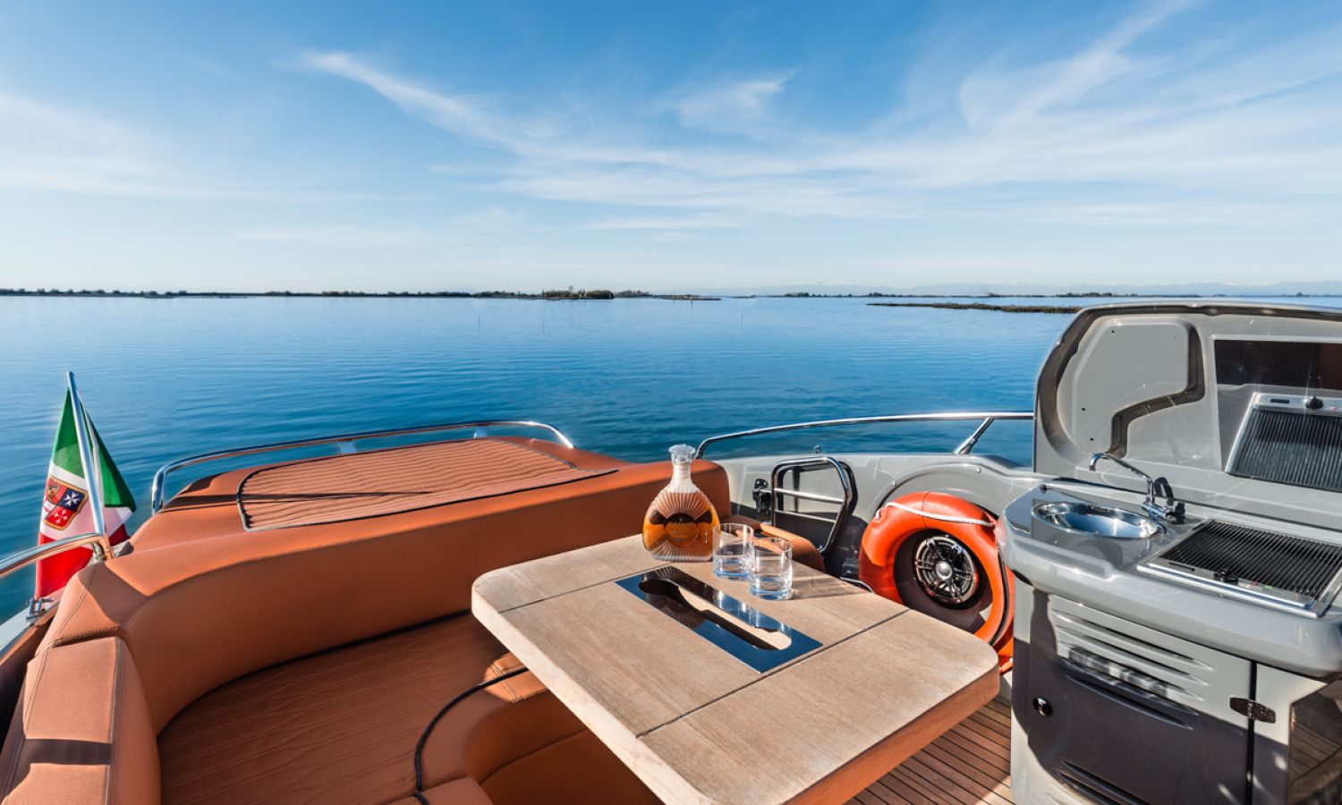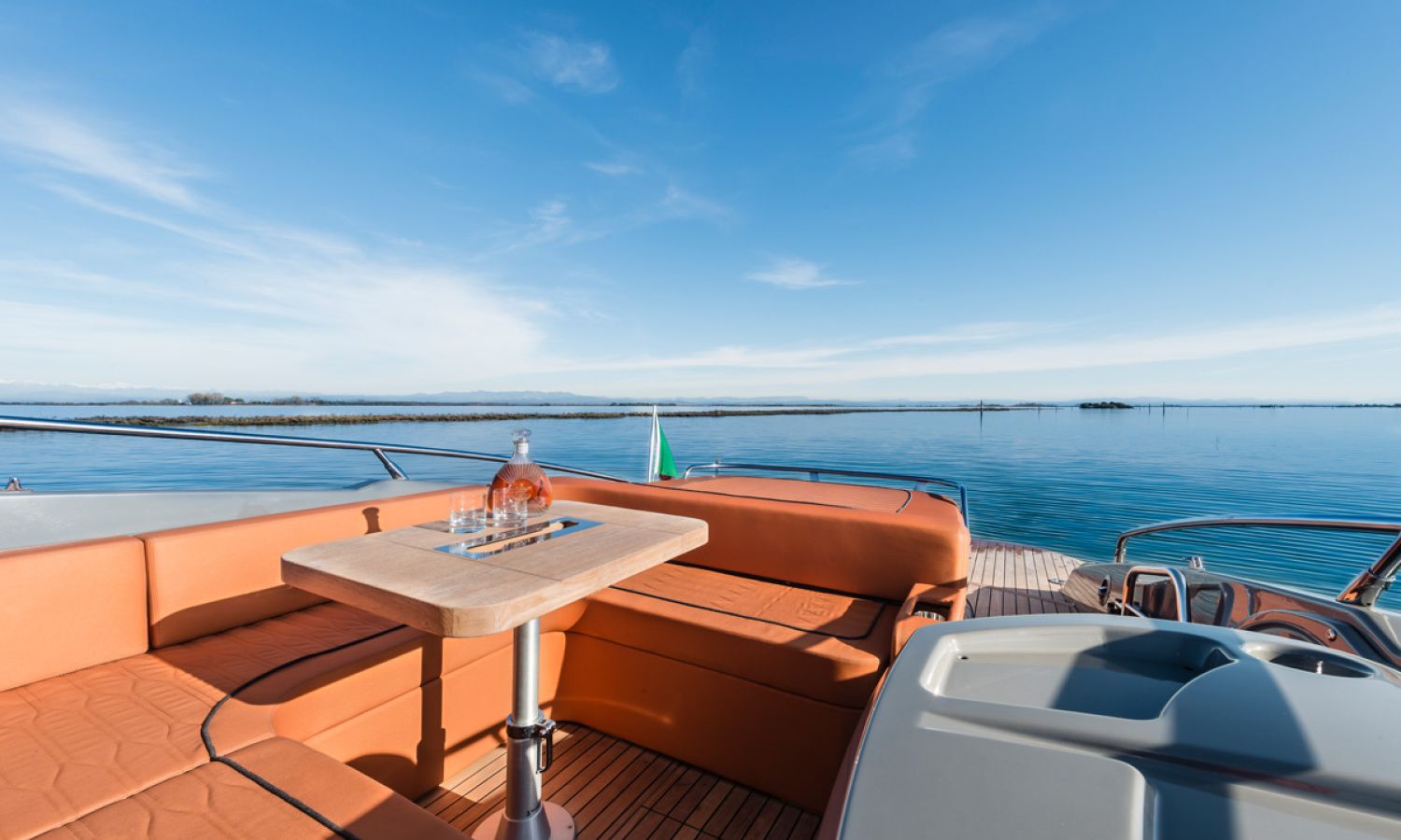 Boat of a sporty nature with a spirited and sharp line. The interior is featured with wide spaces and a separate bathroom. Outside the big sunbathing area with a wet-bar and several cockpit seats are perfect to enjoy boating.
