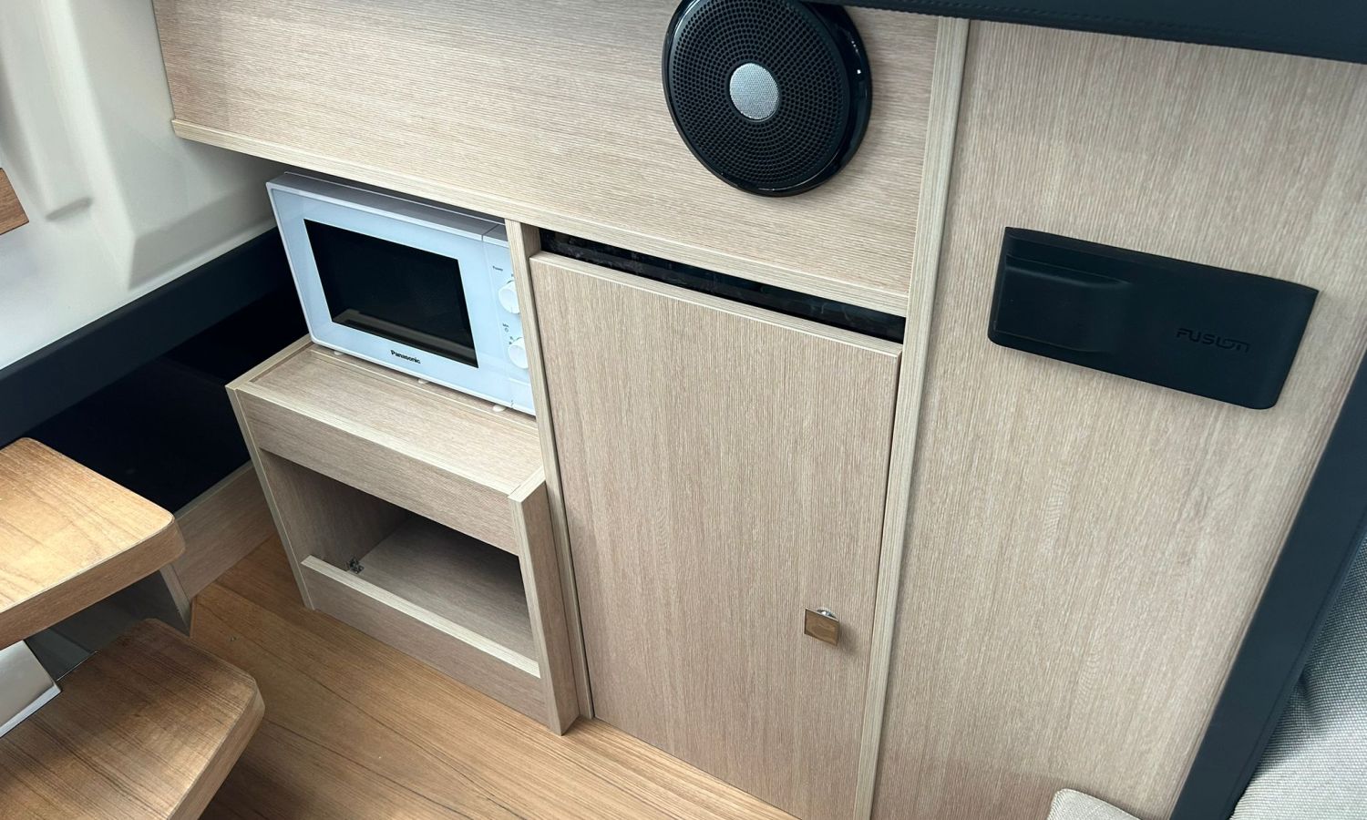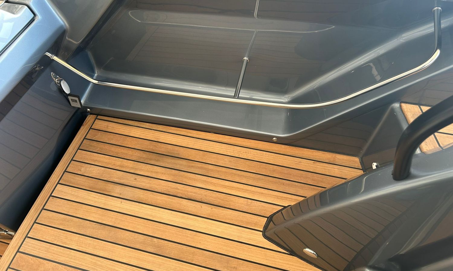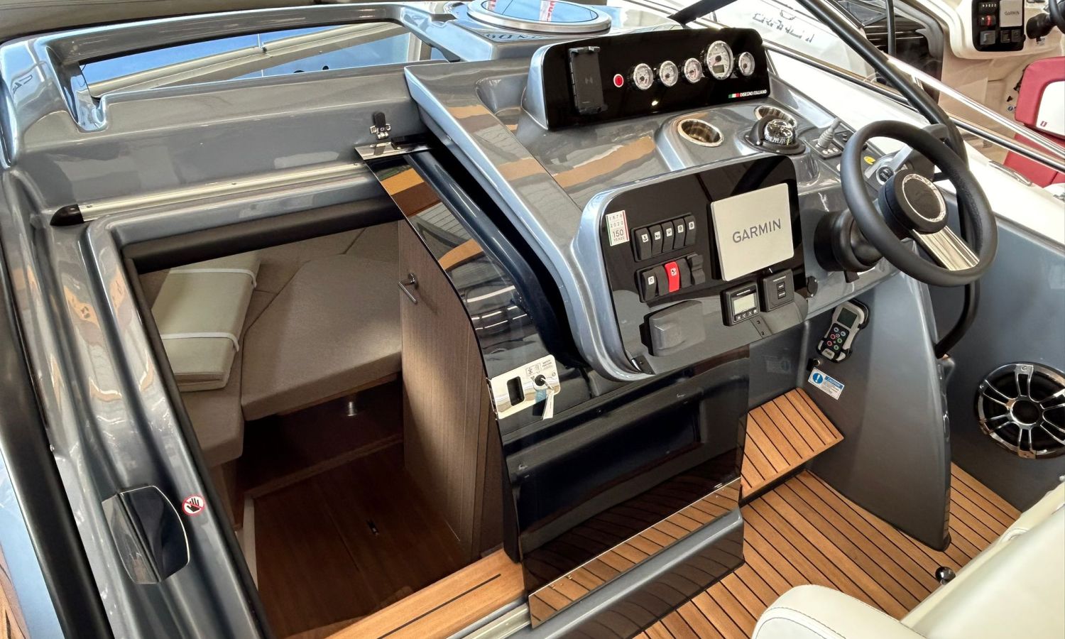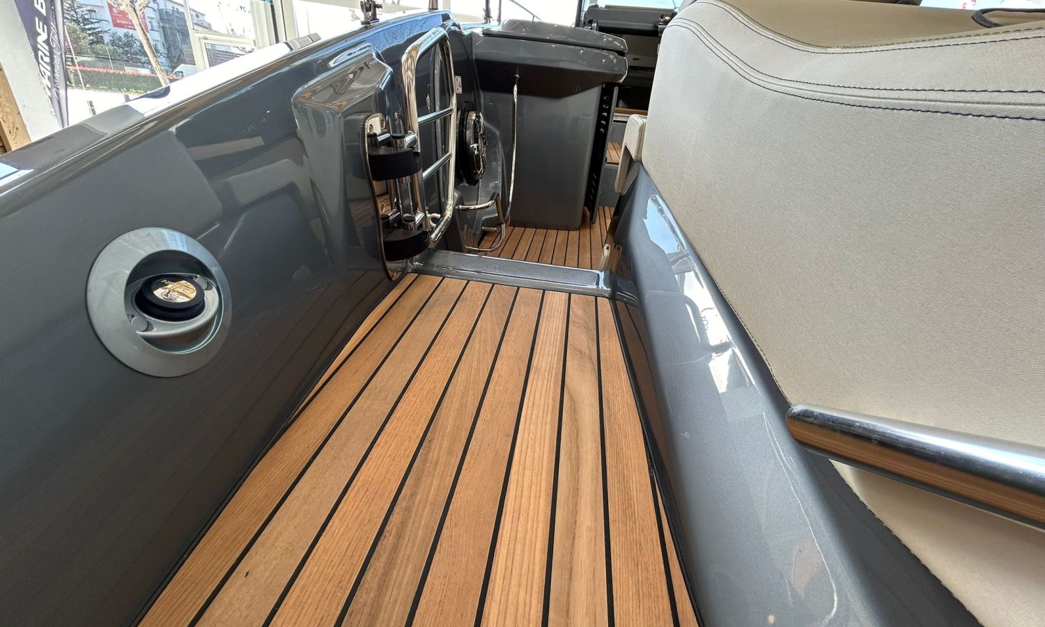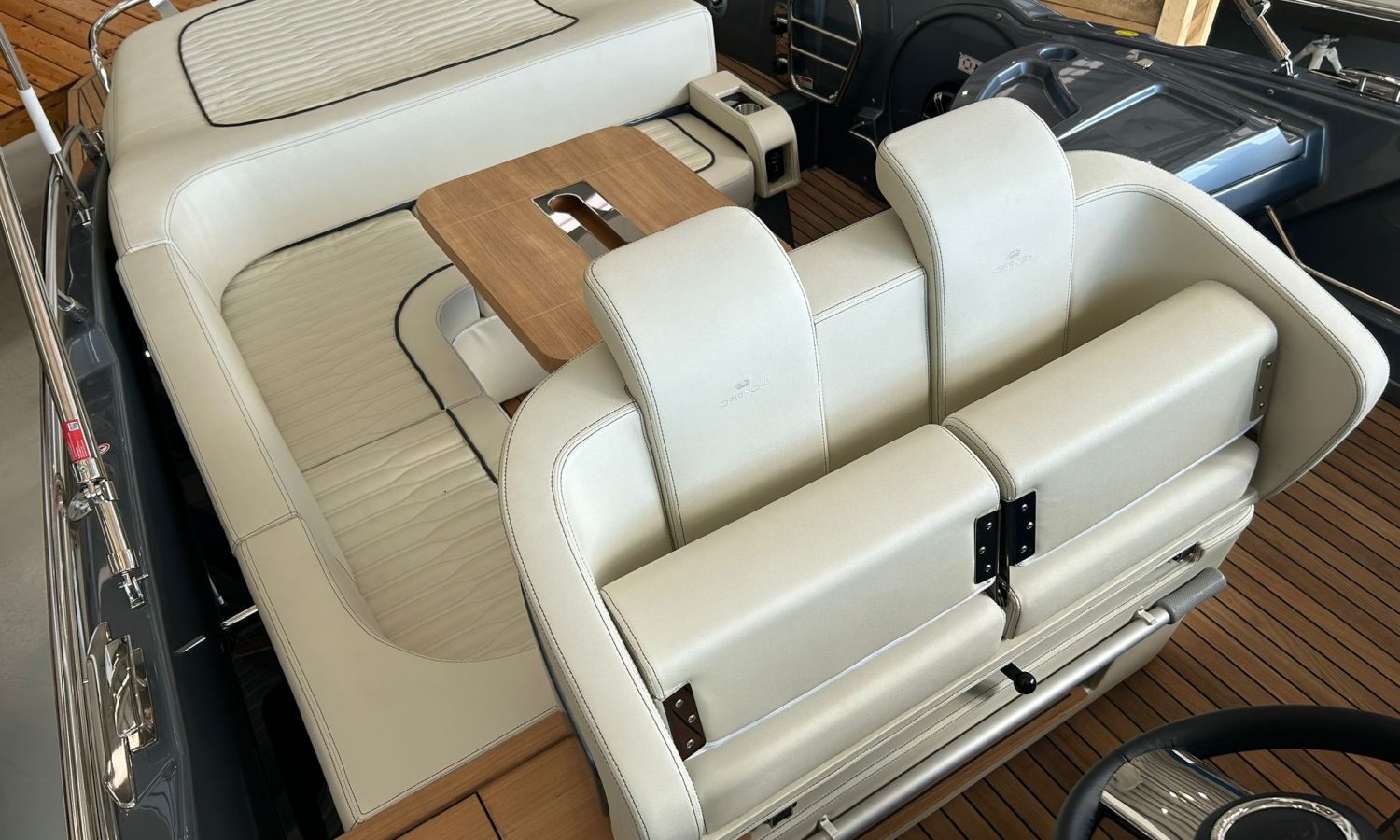 Waste water tank - Bimini top with SS frame and canvas - Bow sunbathing cushion and cover - Bow thruster - Microwave oven with furniture - Cockpit refrigerator 42 l - GPS Plotter Garmin - 230 V electric wiring system with battery charger, electrical resistance on water heater, water pressure reducer and shore power cable 32 A - Cabinet with door - Radio Fusion Bluetooth/USB with 2 speakers, amplifier, subwoofer and remote control in the cockpit and one speaker in the cabin - 2 Additional speakers on bow - Internal table convertible into bed - Solid teak coverings on lateral stringers - Teak laid cockpit - Anchor winch remote control with anchor meter counter - Cockpit cover - Electric anchor winch with chain and 12 Kg Ultramarine anchor - Copy of CE certificate and declaration of conformity - Exterior upholstery Silvertex (alternative colour to standard one) - Hull and deck colour lacquered - Transport.Boat description