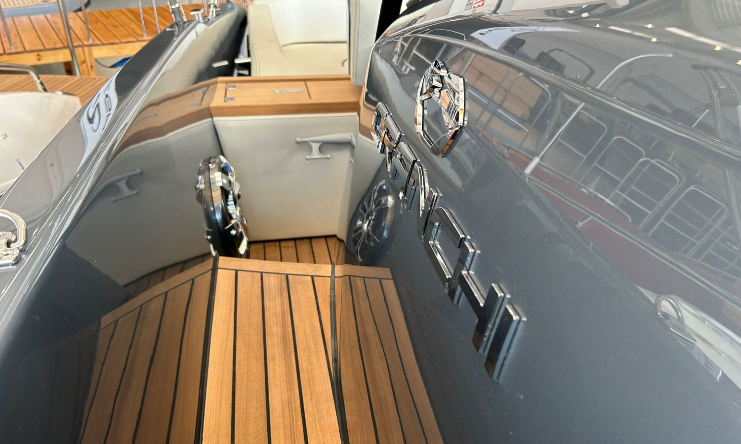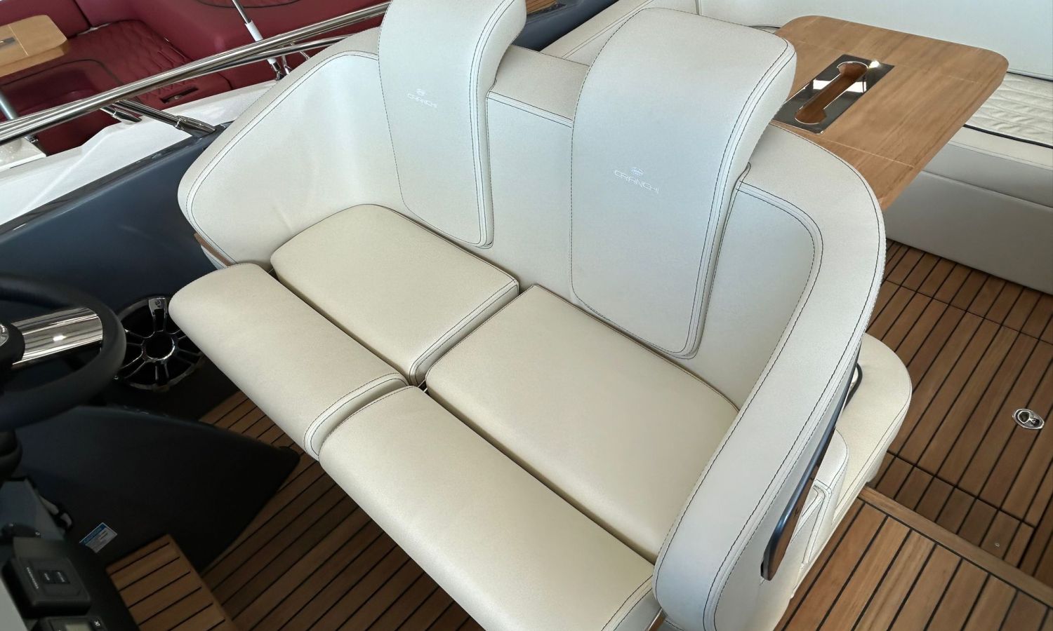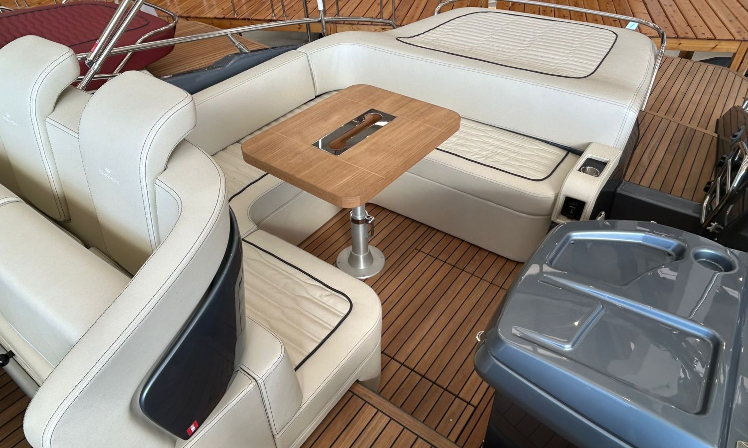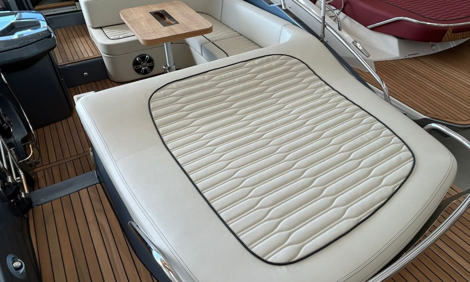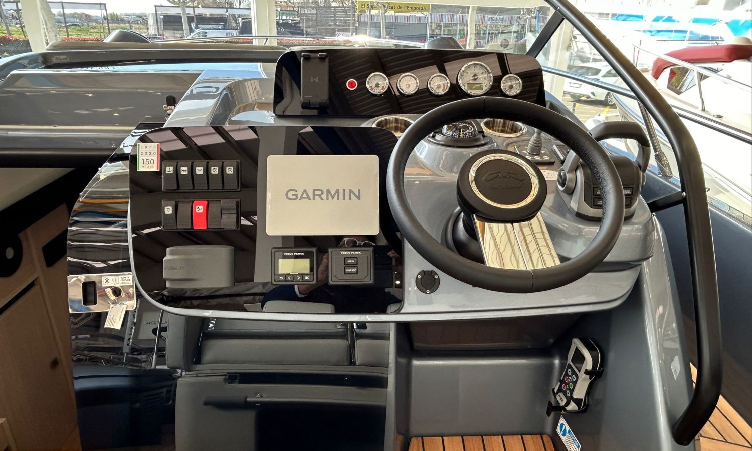 Waste water tank - Bimini top with SS frame and canvas - Bow sunbathing cushion and cover - Bow thruster - Microwave oven with furniture - Cockpit refrigerator 42 l - GPS Plotter Garmin - 230 V electric wiring system with battery charger, electrical resistance on water heater, water pressure reducer and shore power cable 32 A - Cabinet with door - Radio Fusion Bluetooth/USB with 2 speakers, amplifier, subwoofer and remote control in the cockpit and one speaker in the cabin - 2 Additional speakers on bow - Internal table convertible into bed - Solid teak coverings on lateral stringers - Teak laid cockpit - Anchor winch remote control with anchor meter counter - Cockpit cover - Electric anchor winch with chain and 12 Kg Ultramarine anchor - Copy of CE certificate and declaration of conformity - Exterior upholstery Silvertex (alternative colour to standard one) - Hull and deck colour lacquered - Transport.Boat description
