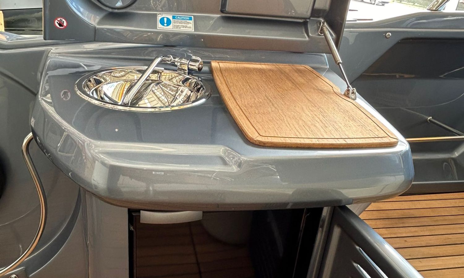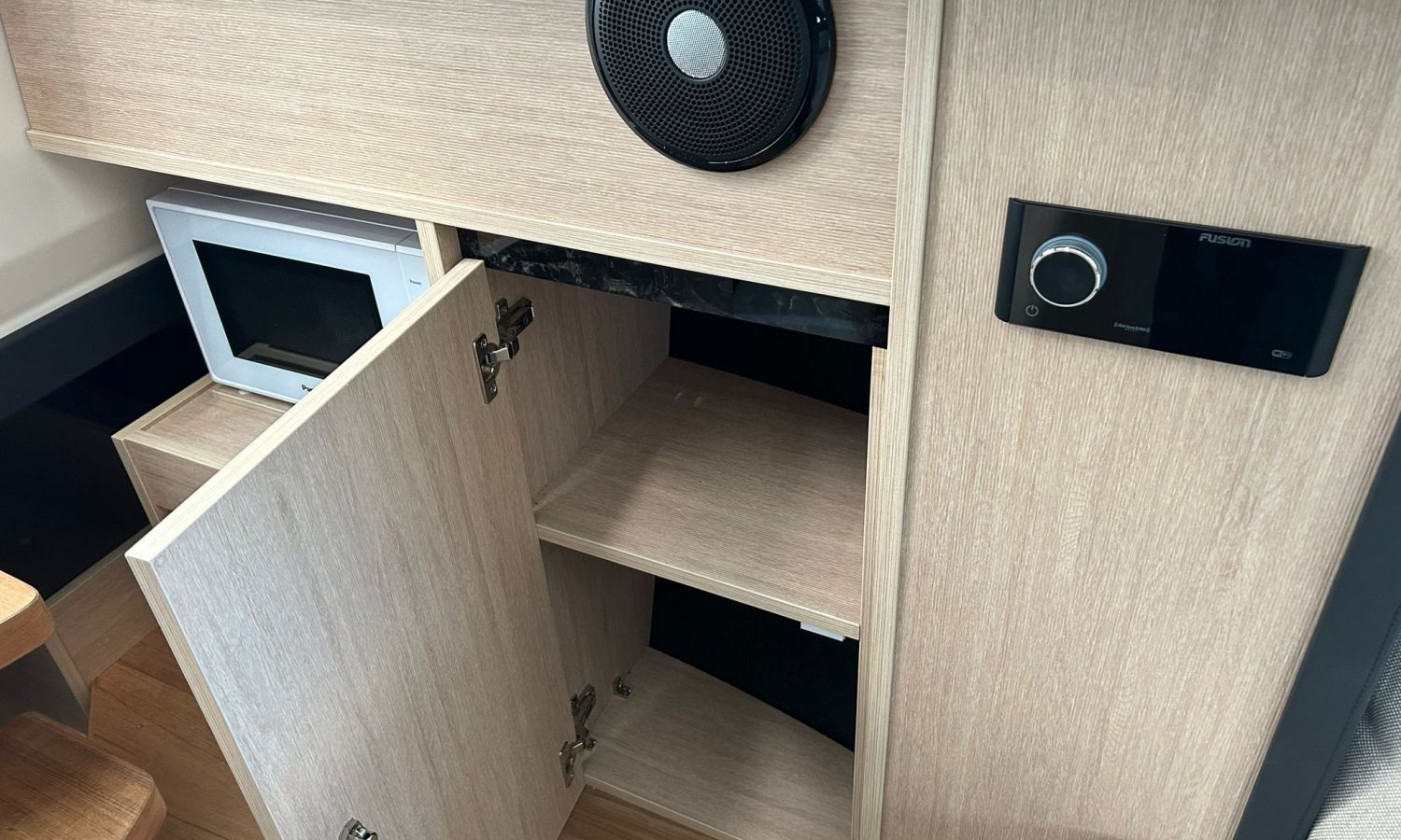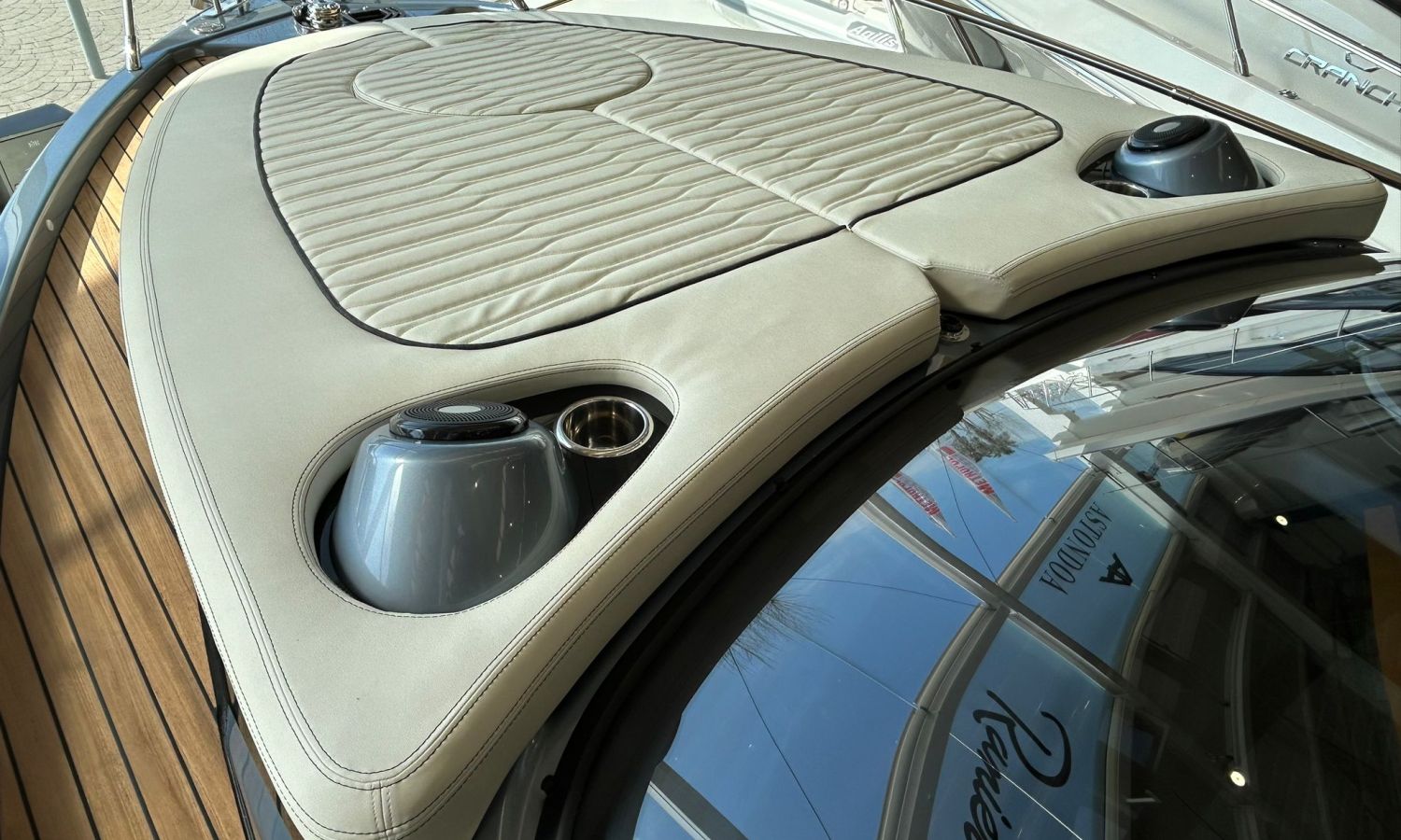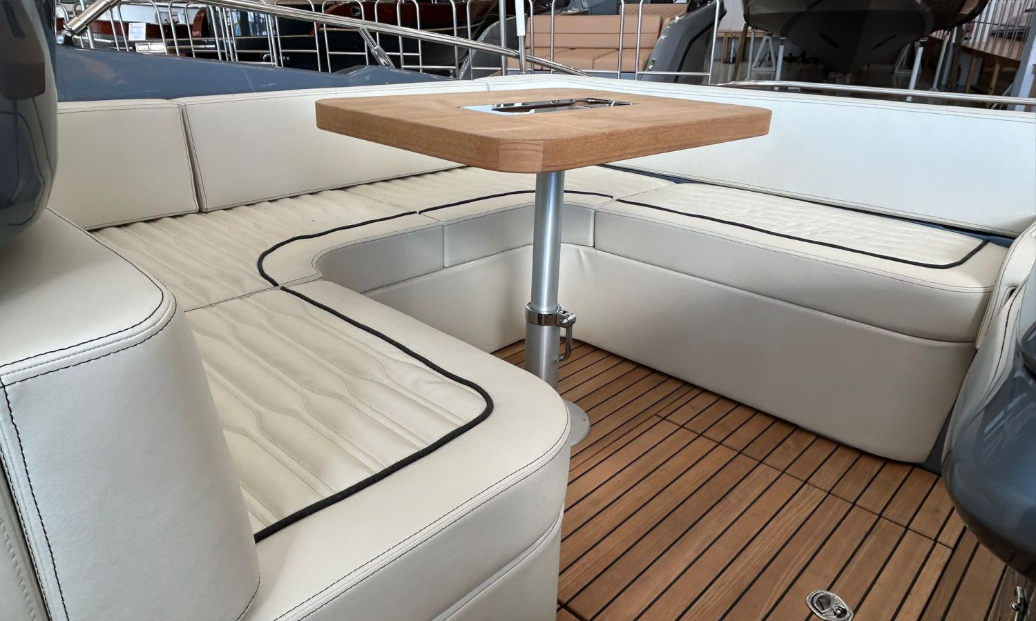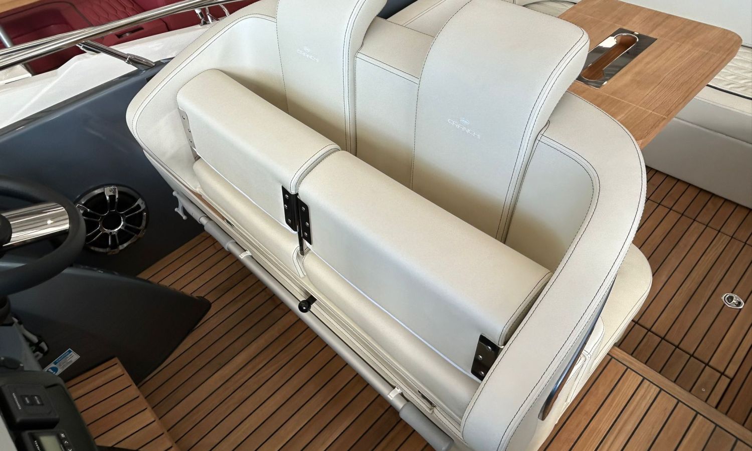 Waste water tank - Bimini top with SS frame and canvas - Bow sunbathing cushion and cover - Bow thruster - Microwave oven with furniture - Cockpit refrigerator 42 l - GPS Plotter Garmin - 230 V electric wiring system with battery charger, electrical resistance on water heater, water pressure reducer and shore power cable 32 A - Cabinet with door - Radio Fusion Bluetooth/USB with 2 speakers, amplifier, subwoofer and remote control in the cockpit and one speaker in the cabin - 2 Additional speakers on bow - Internal table convertible into bed - Solid teak coverings on lateral stringers - Teak laid cockpit - Anchor winch remote control with anchor meter counter - Cockpit cover - Electric anchor winch with chain and 12 Kg Ultramarine anchor - Copy of CE certificate and declaration of conformity - Exterior upholstery Silvertex (alternative colour to standard one) - Hull and deck colour lacquered - Transport.Boat description