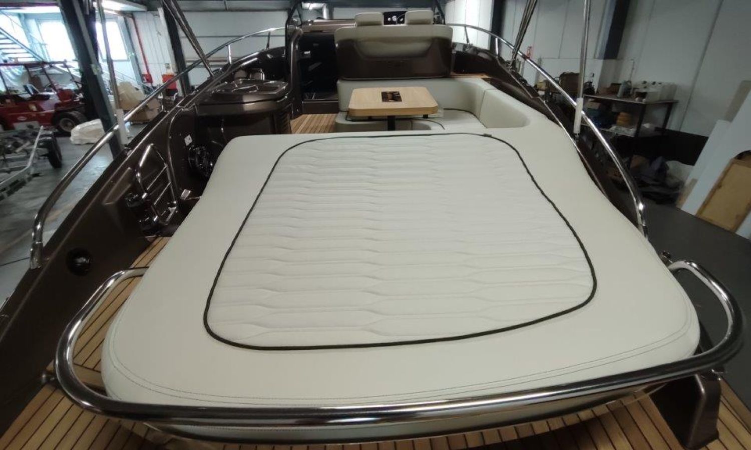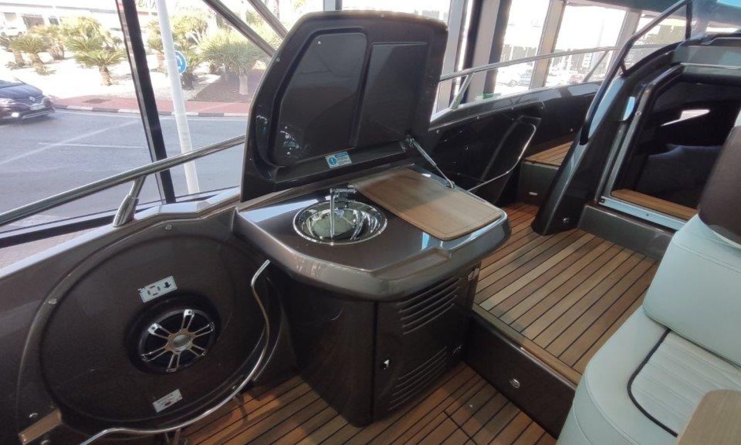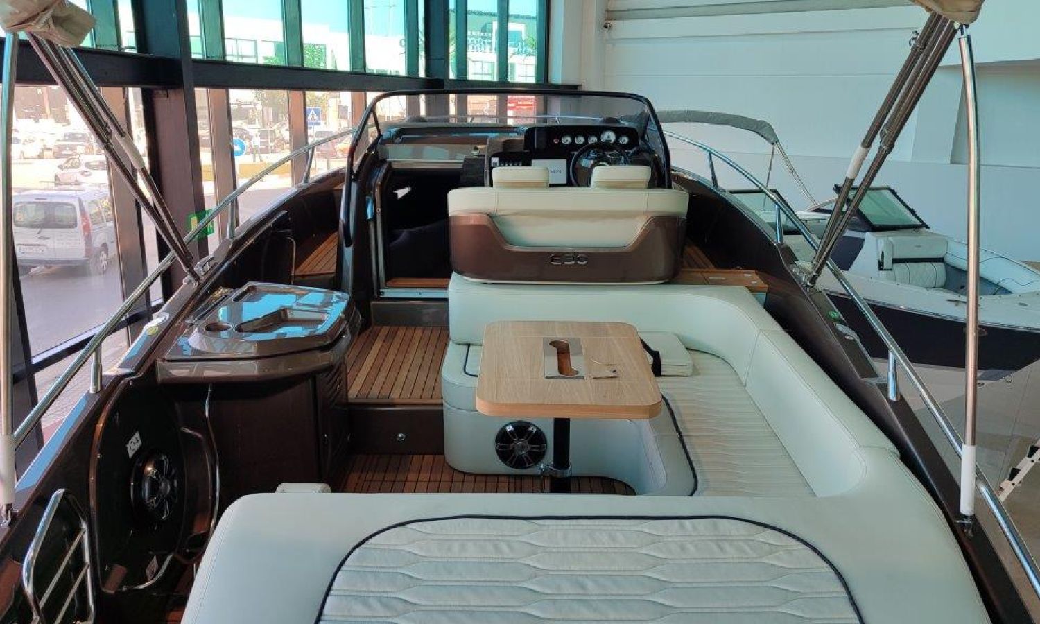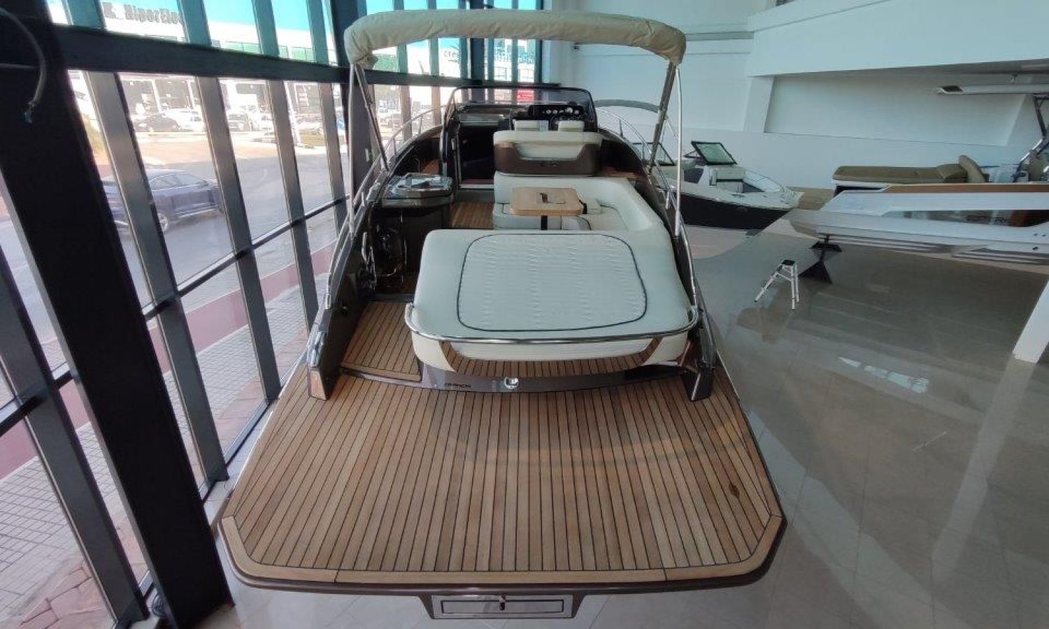 Waste water tank - Bimini top with SS frame and canvas - Bow sunbathing cushion and cover - Bow thruster - Microwave oven with furniture - Cockpit refrigerator 42 l - GPS Plotter Garmin - 230 V electric wiring system with battery charger, electrical resistance on water heater, water pressure reducer and shore power cable 32 A - Cabinet with door - 6 Fenders and fender covers - Radio Fusion Bluetooth/USB with 2 speakers, amplifier, subwoofer and remote control in the cockpit and one speaker in the cabin - 2 Additional speakers on bow - Internal table convertible into bed - Solid teak coverings on lateral stringers - Teak laid cockpit - Anchor winch remote control with anchor meter counter - Cockpit cover - Electric anchor winch with chain and 12 Kg Ultramarine anchor - Copy of CE certificate and declaration of conformity - Hood (alternative colour to standard one) - Fender covers (alternative colour to standard one) - Exterior upholstery Silvertex (alternative colour to standard one) - Hull and deck colour lacquered - Transport Italy to Costa Brava.Boat description