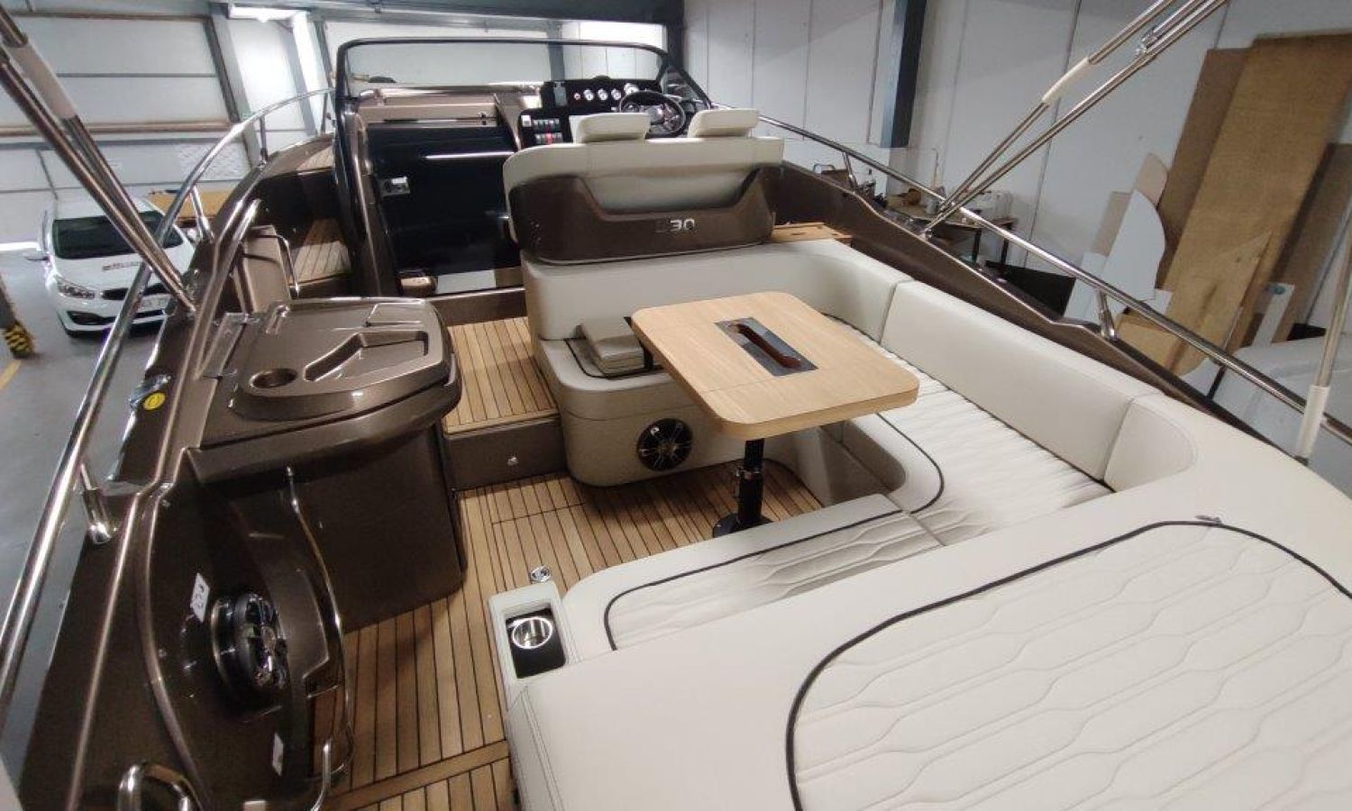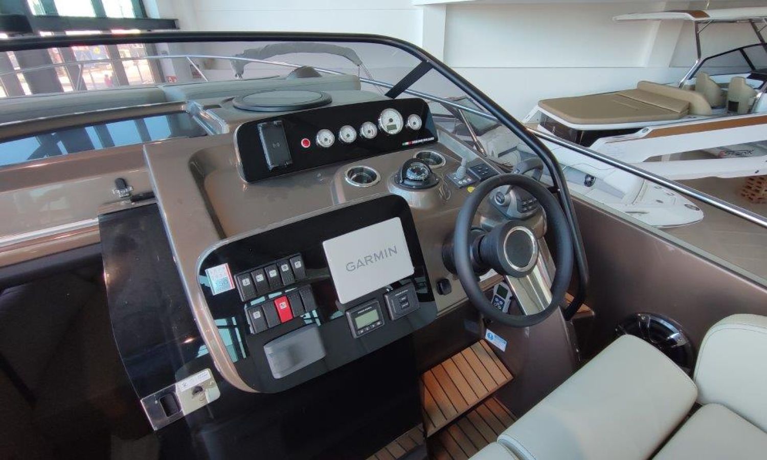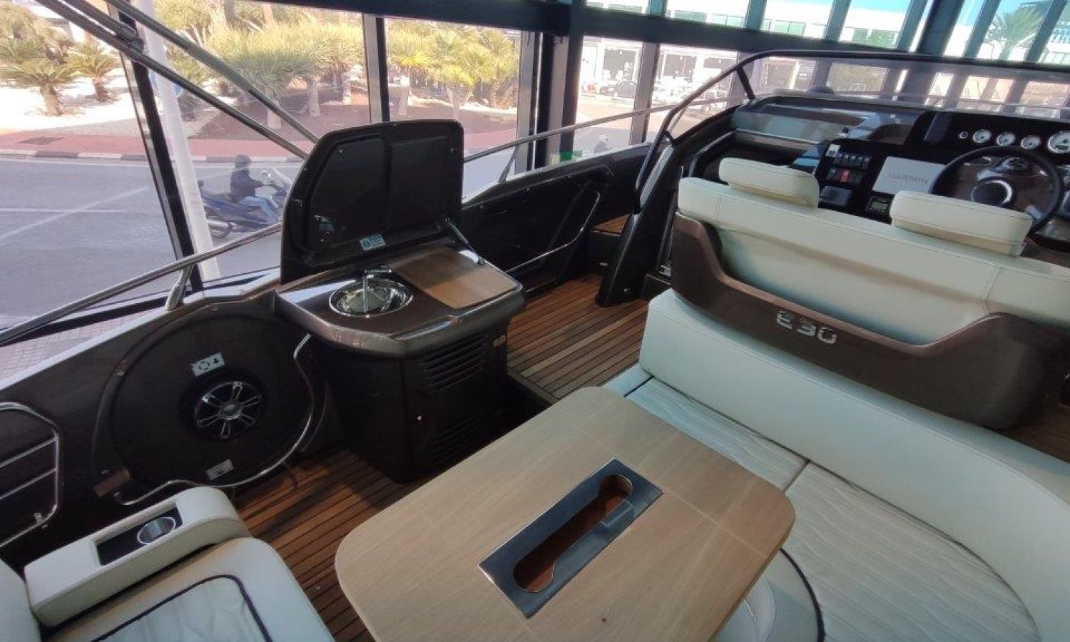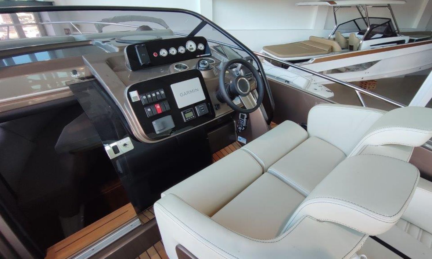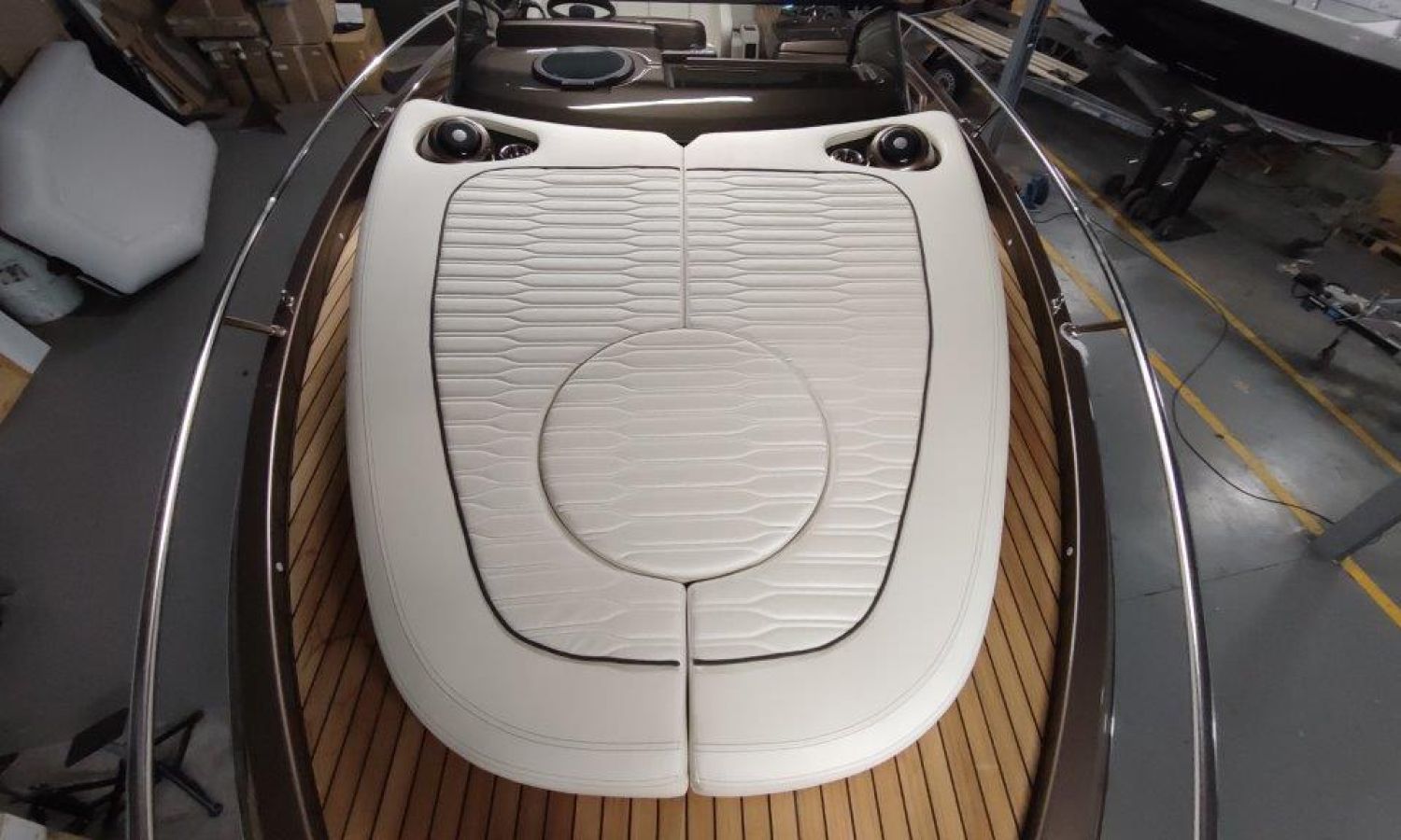 Waste water tank - Bimini top with SS frame and canvas - Bow sunbathing cushion and cover - Bow thruster - Microwave oven with furniture - Cockpit refrigerator 42 l - GPS Plotter Garmin - 230 V electric wiring system with battery charger, electrical resistance on water heater, water pressure reducer and shore power cable 32 A - Cabinet with door - 6 Fenders and fender covers - Radio Fusion Bluetooth/USB with 2 speakers, amplifier, subwoofer and remote control in the cockpit and one speaker in the cabin - 2 Additional speakers on bow - Internal table convertible into bed - Solid teak coverings on lateral stringers - Teak laid cockpit - Anchor winch remote control with anchor meter counter - Cockpit cover - Electric anchor winch with chain and 12 Kg Ultramarine anchor - Copy of CE certificate and declaration of conformity - Hood (alternative colour to standard one) - Fender covers (alternative colour to standard one) - Exterior upholstery Silvertex (alternative colour to standard one) - Hull and deck colour lacquered - Transport Italy to Costa Brava.Boat description