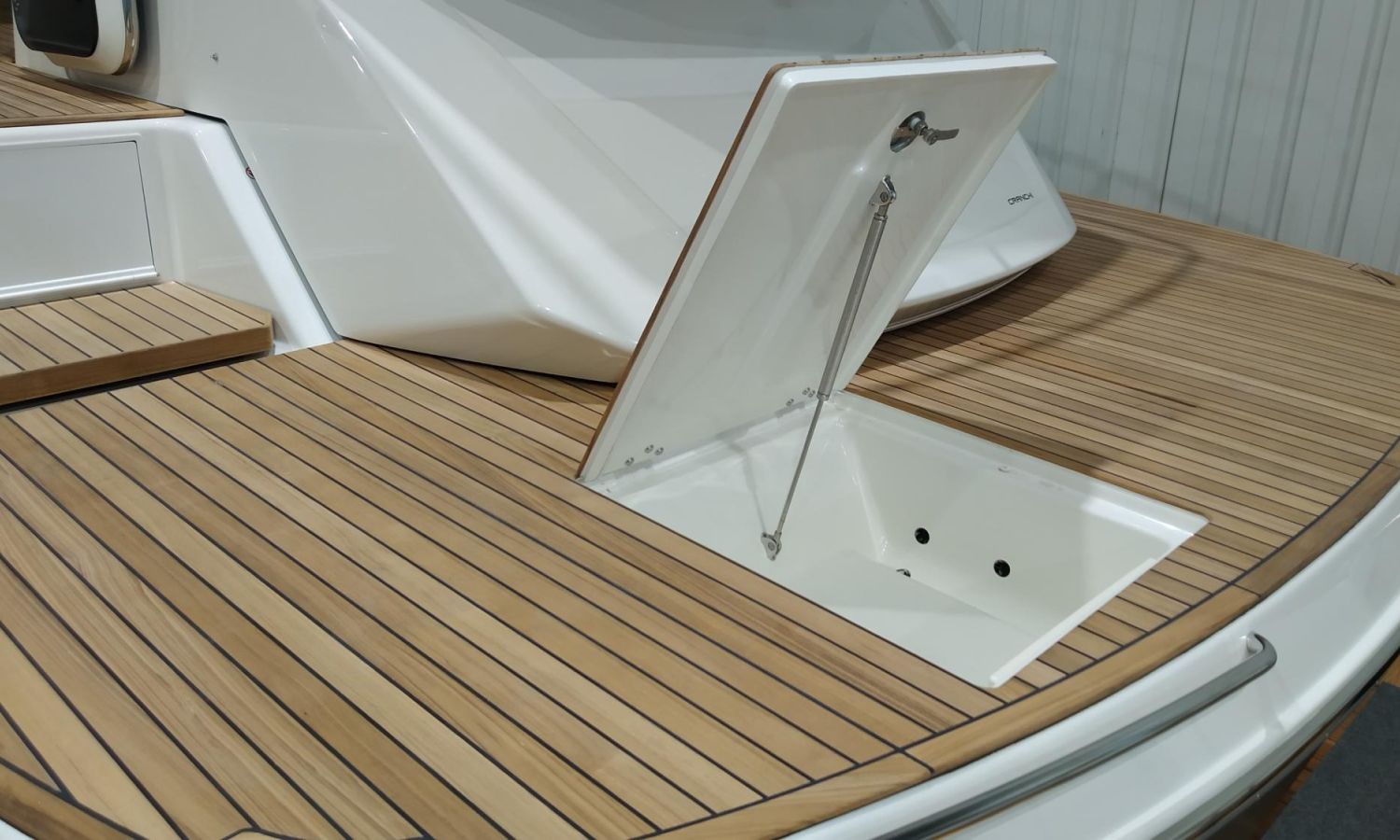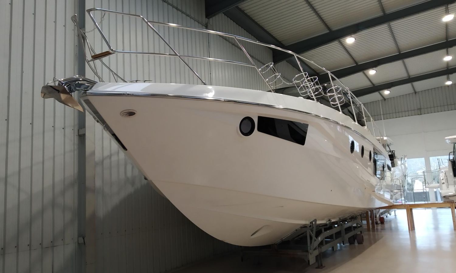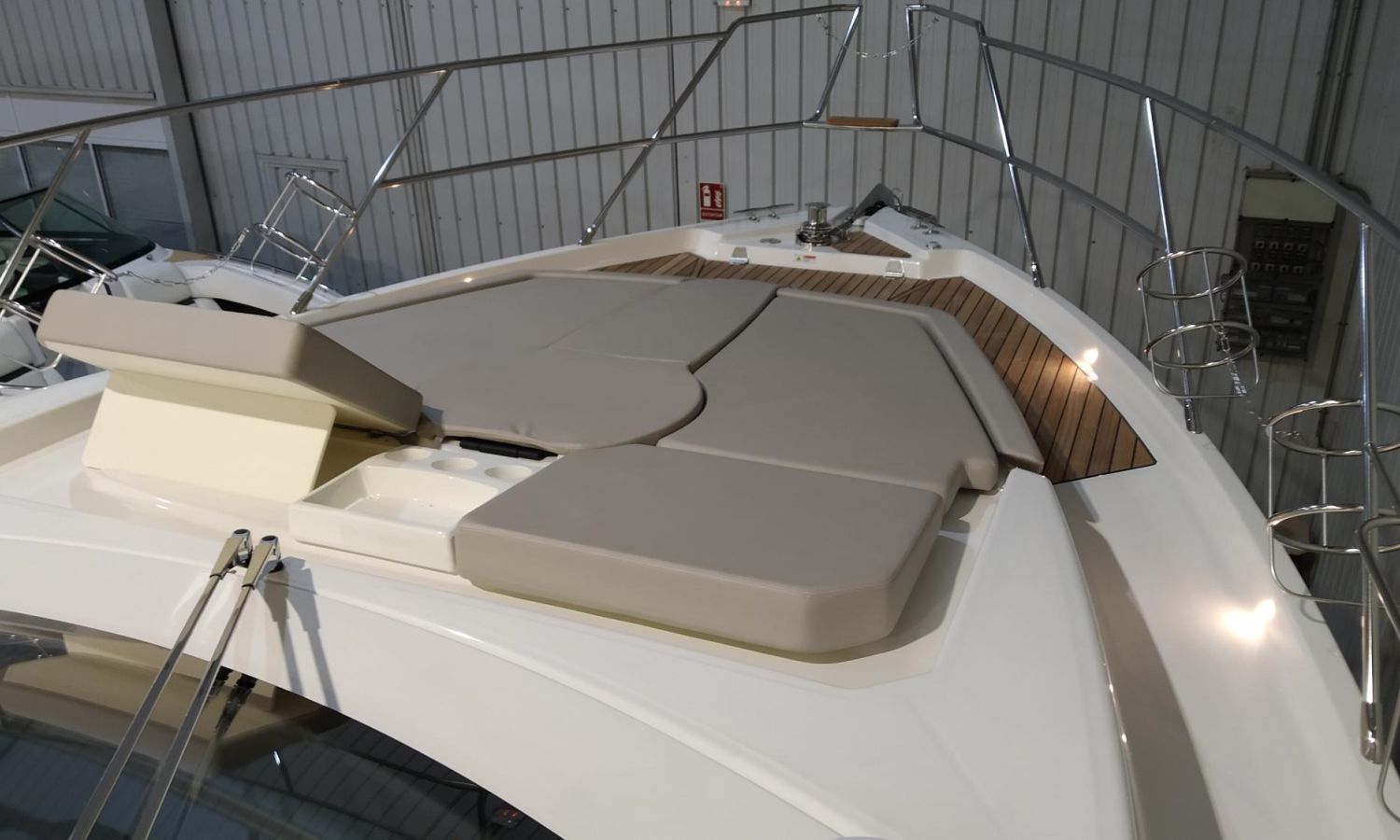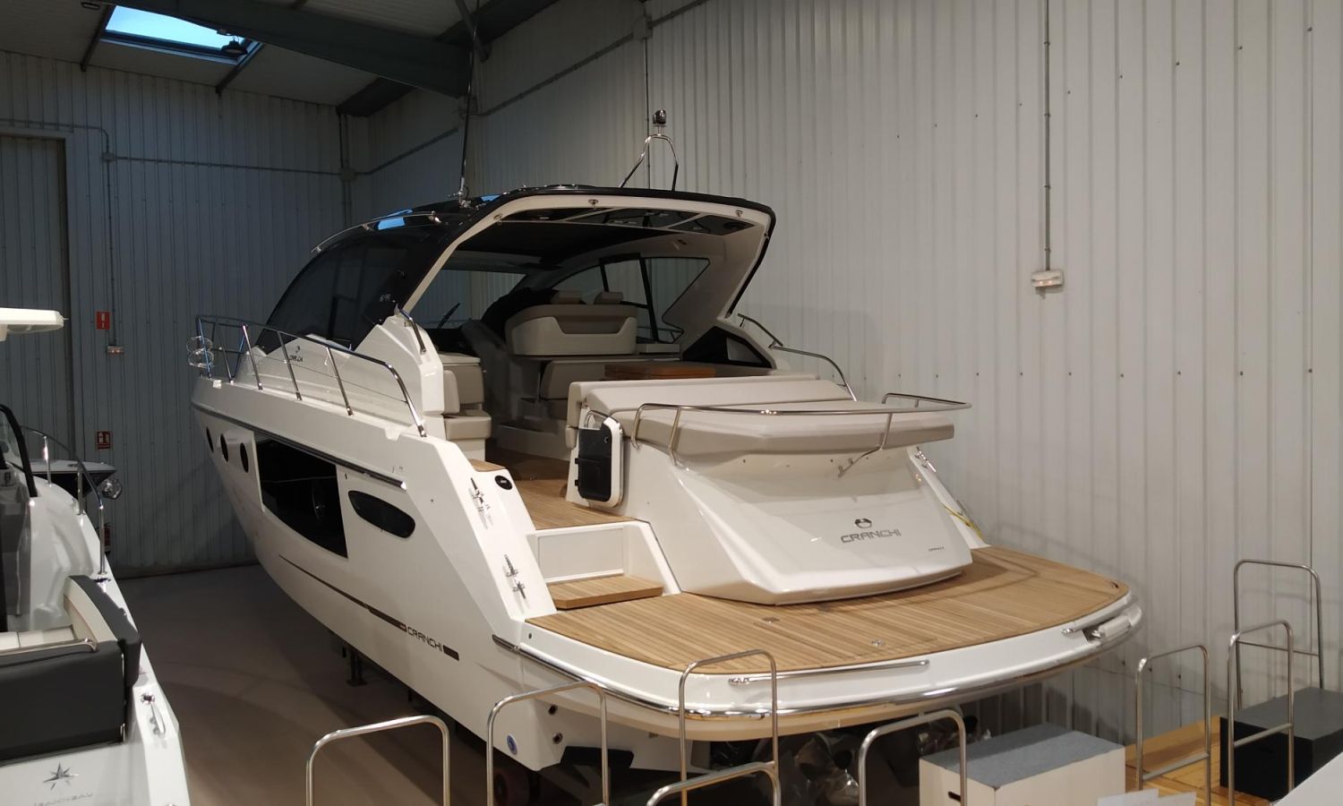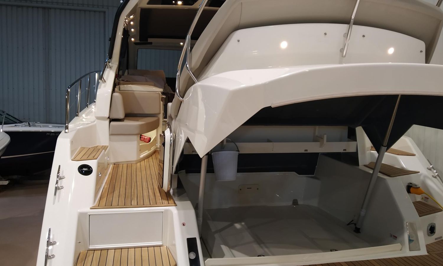 Waste water tank - Air conditioning system 16.000 BTU in cabins with heat pump - Air conditioning system 16.000 BTU cockpit cooling - Hood for complete stern closing - Bow thruster with automatic fire extinguisher - Cockpit refrigerator - GPS+ Chartplotter - 8 kW generator - Hydraulic gangway - Foldable raising platform in teak for driving position - Autopilot - Teak laid cockpit - VHF / DSC - Copy of CE certificate and declaration of conformity - Hard top colour lacquered - Preparation, launching, delivery and sea trial - Transport shipyard to Costa Brava.Boat description