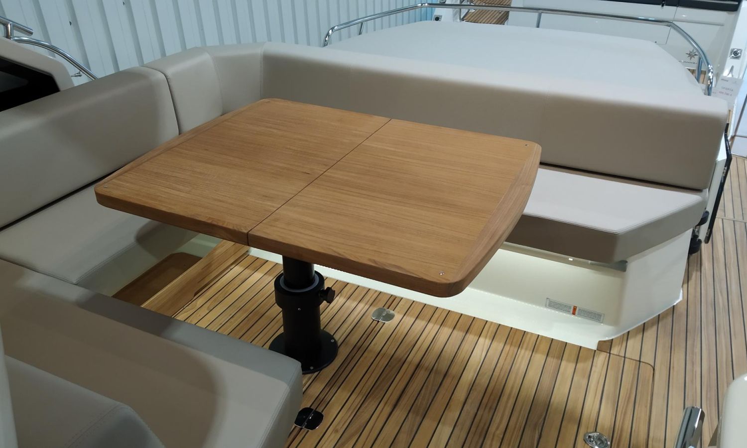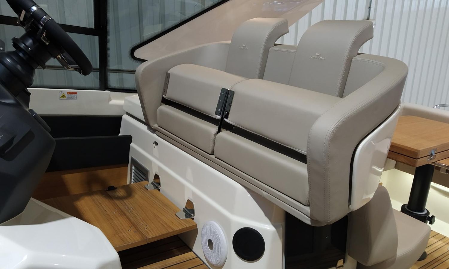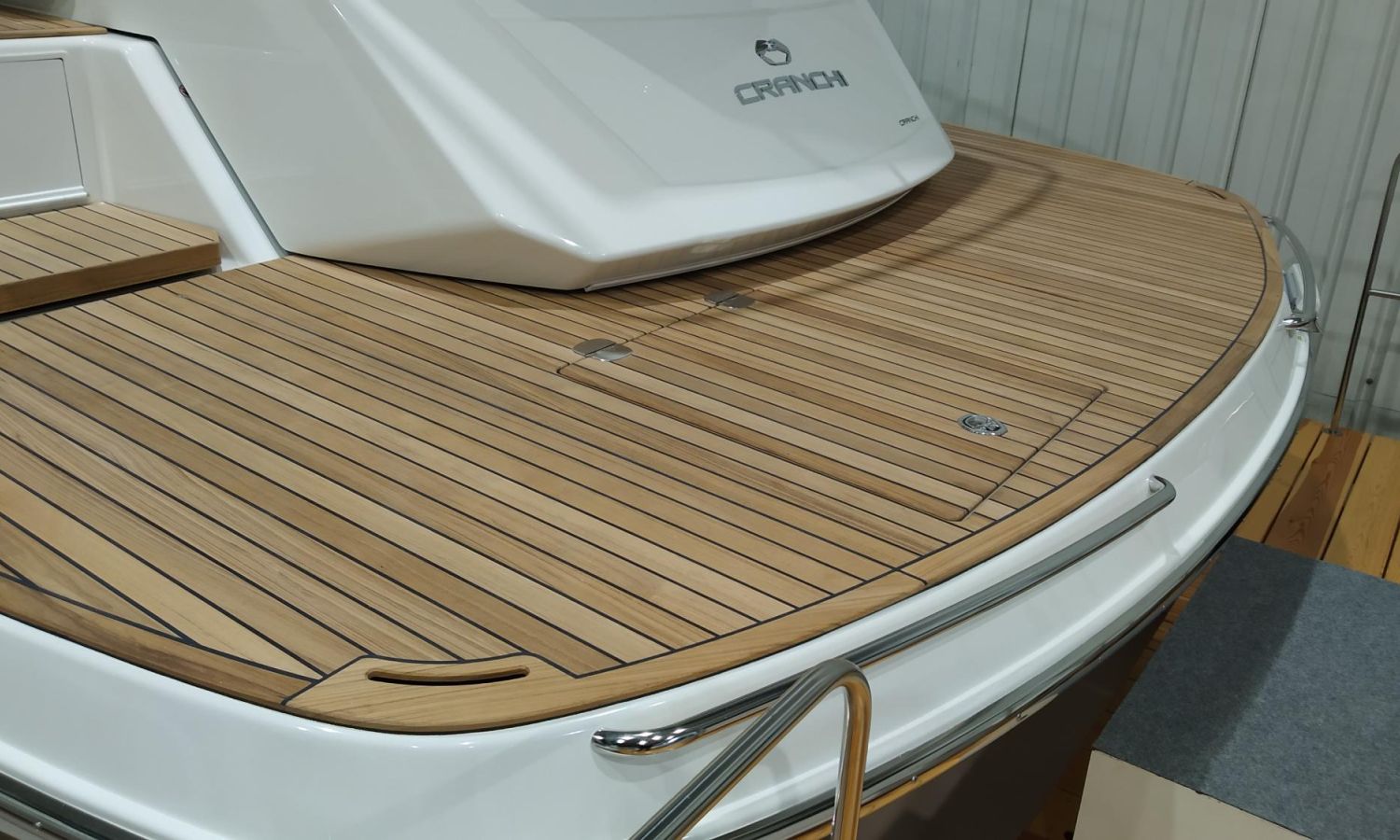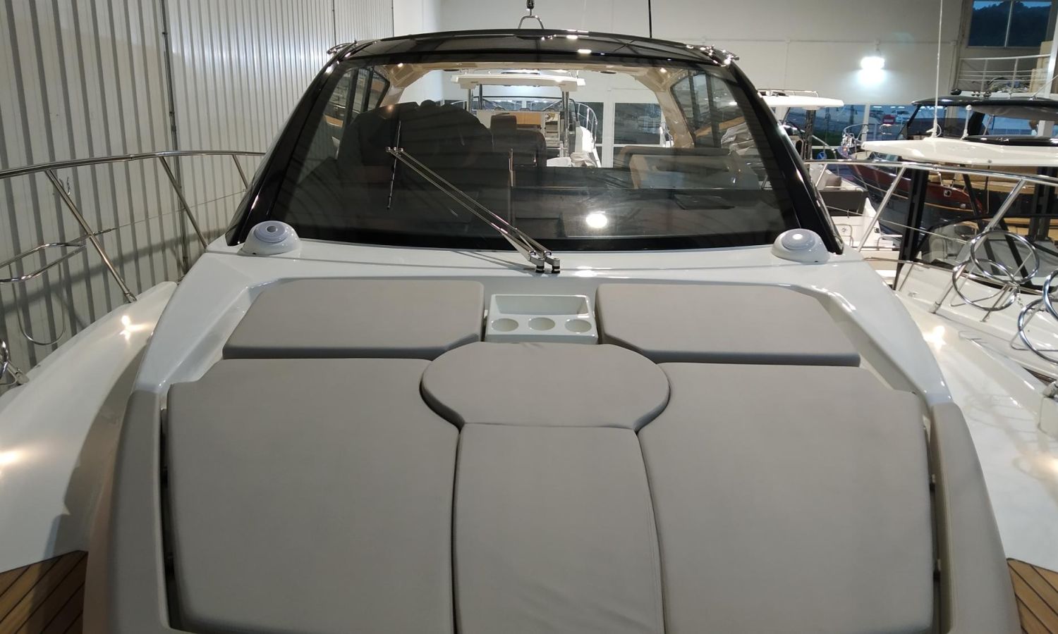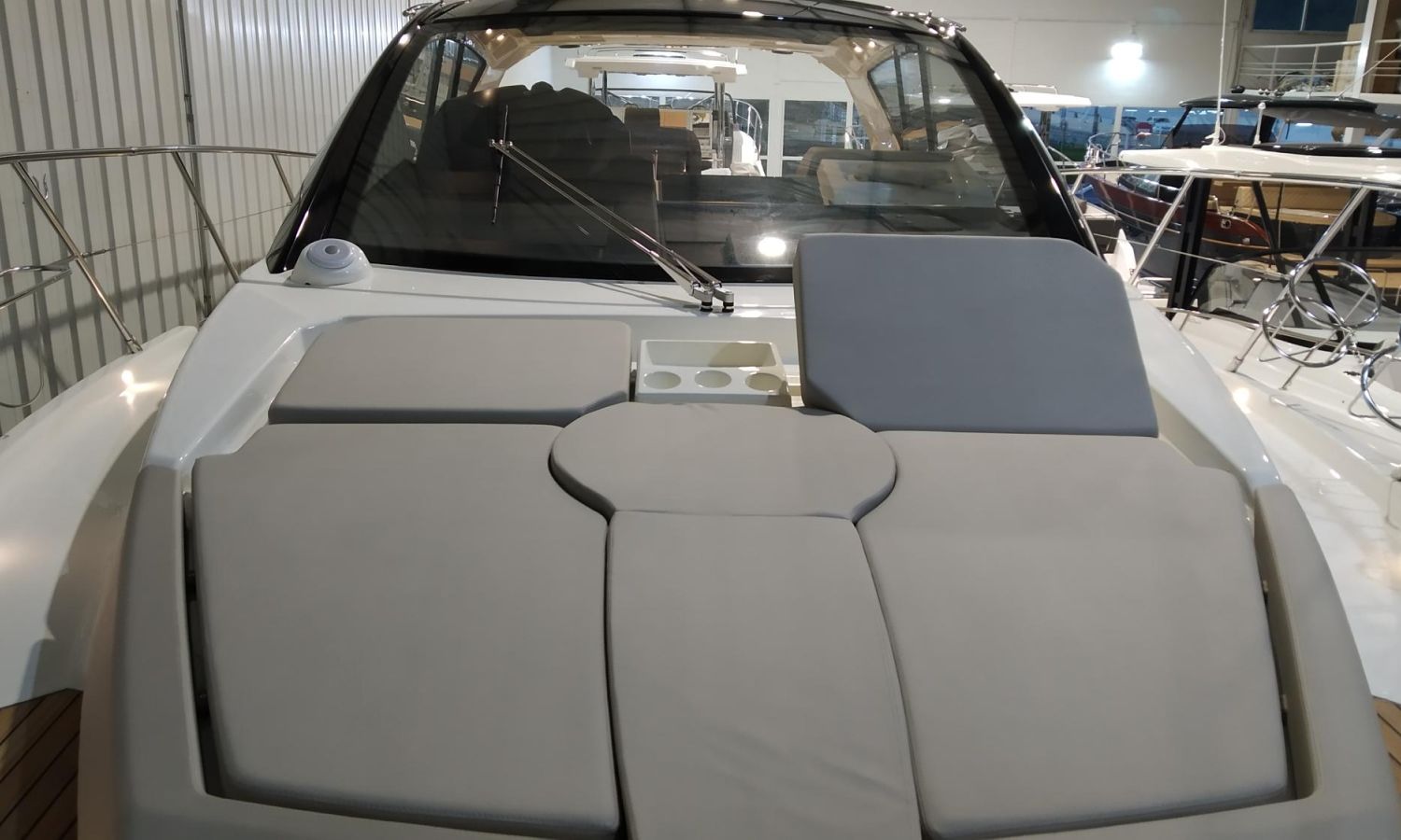 Waste water tank - Air conditioning system 16.000 BTU in cabins with heat pump - Air conditioning system 16.000 BTU cockpit cooling - Hood for complete stern closing - Bow thruster with automatic fire extinguisher - Cockpit refrigerator - GPS+ Chartplotter - 8 kW generator - Hydraulic gangway - Foldable raising platform in teak for driving position - Autopilot - Teak laid cockpit - VHF / DSC - Copy of CE certificate and declaration of conformity - Hard top colour lacquered - Preparation, launching, delivery and sea trial - Transport shipyard to Costa Brava.Boat description