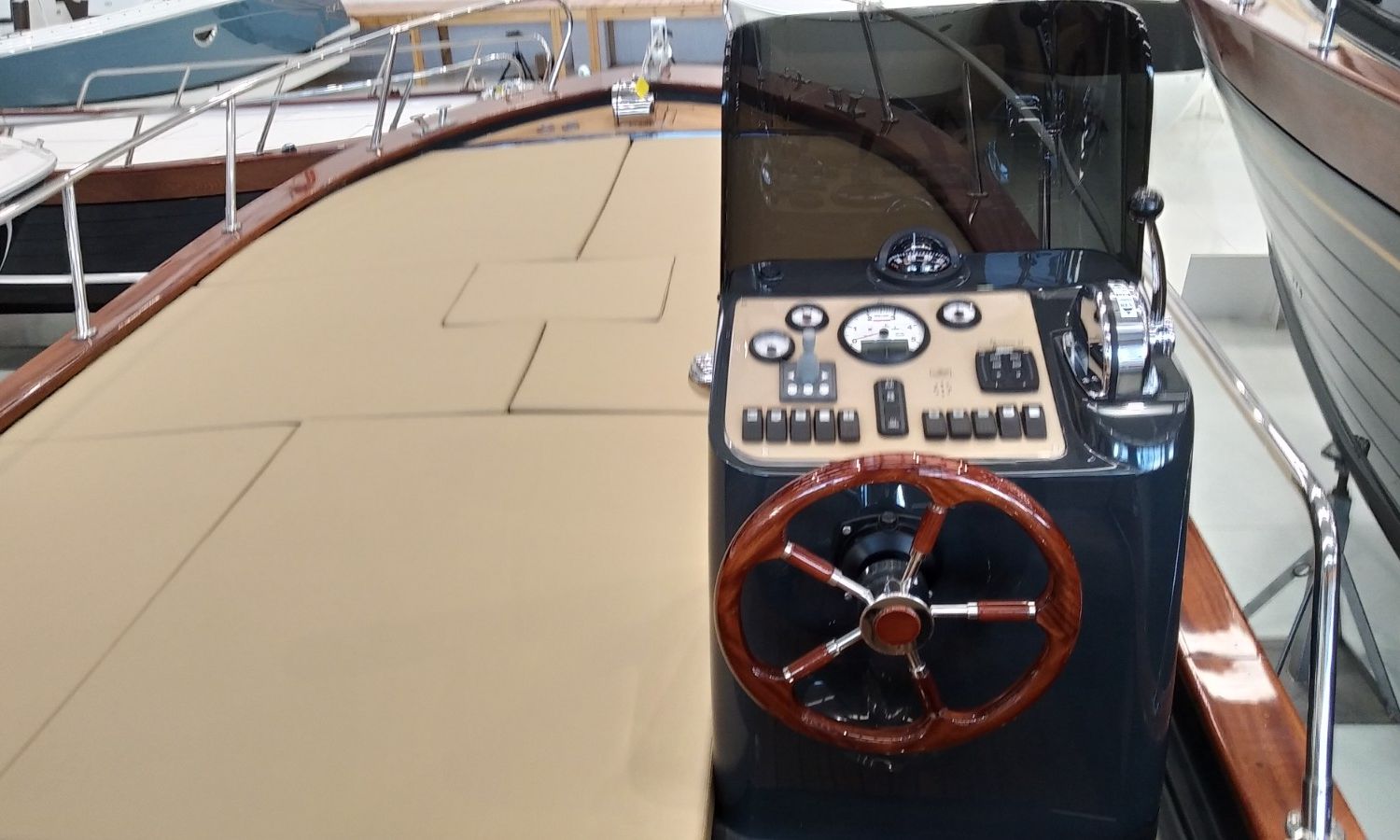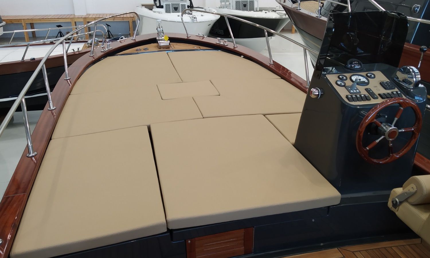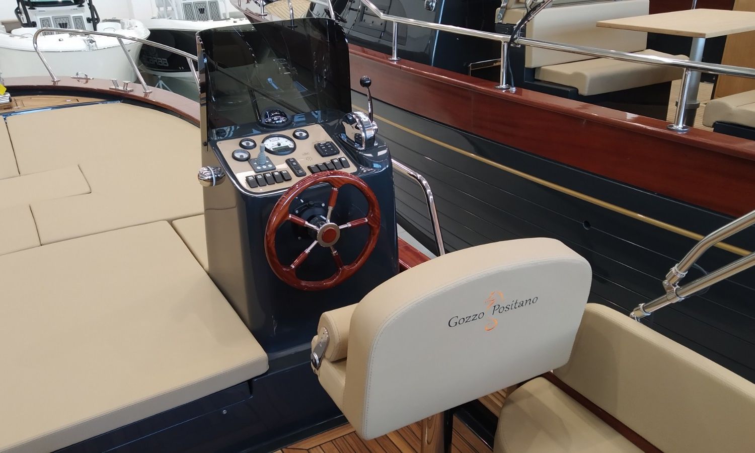 Boat being produced. Delivery February 2026. Stock photos, colours and equipment may not correspond exactly to the offered unit. Model Positano 27 of the Neapolitan shipyard Gozzo Positano of 8,22 meters in total length. Boat with big bathing platform and cabin.AST-Nº 02