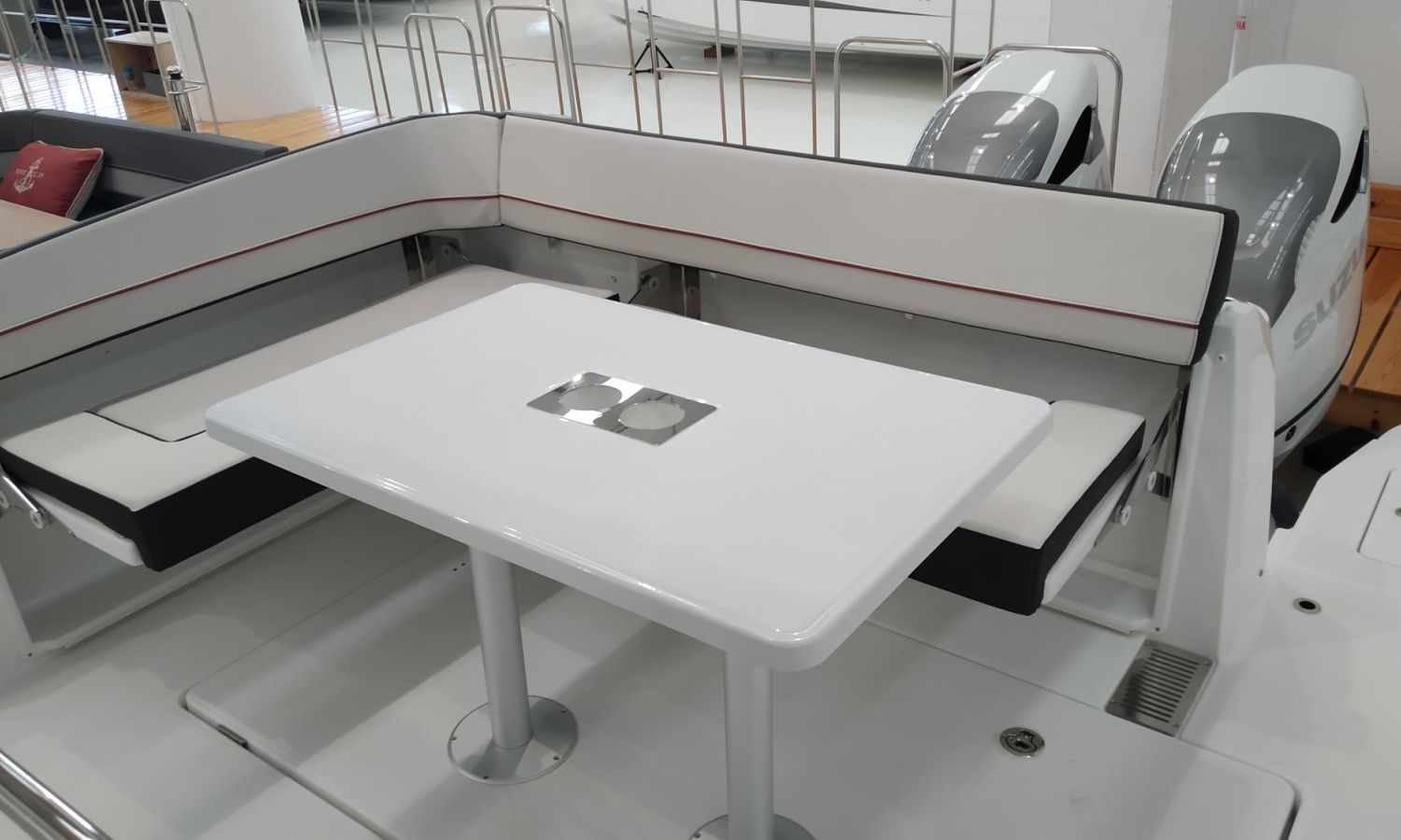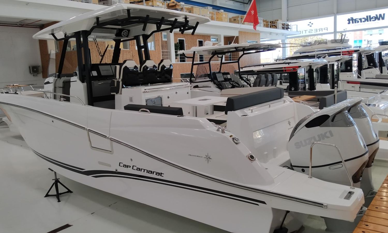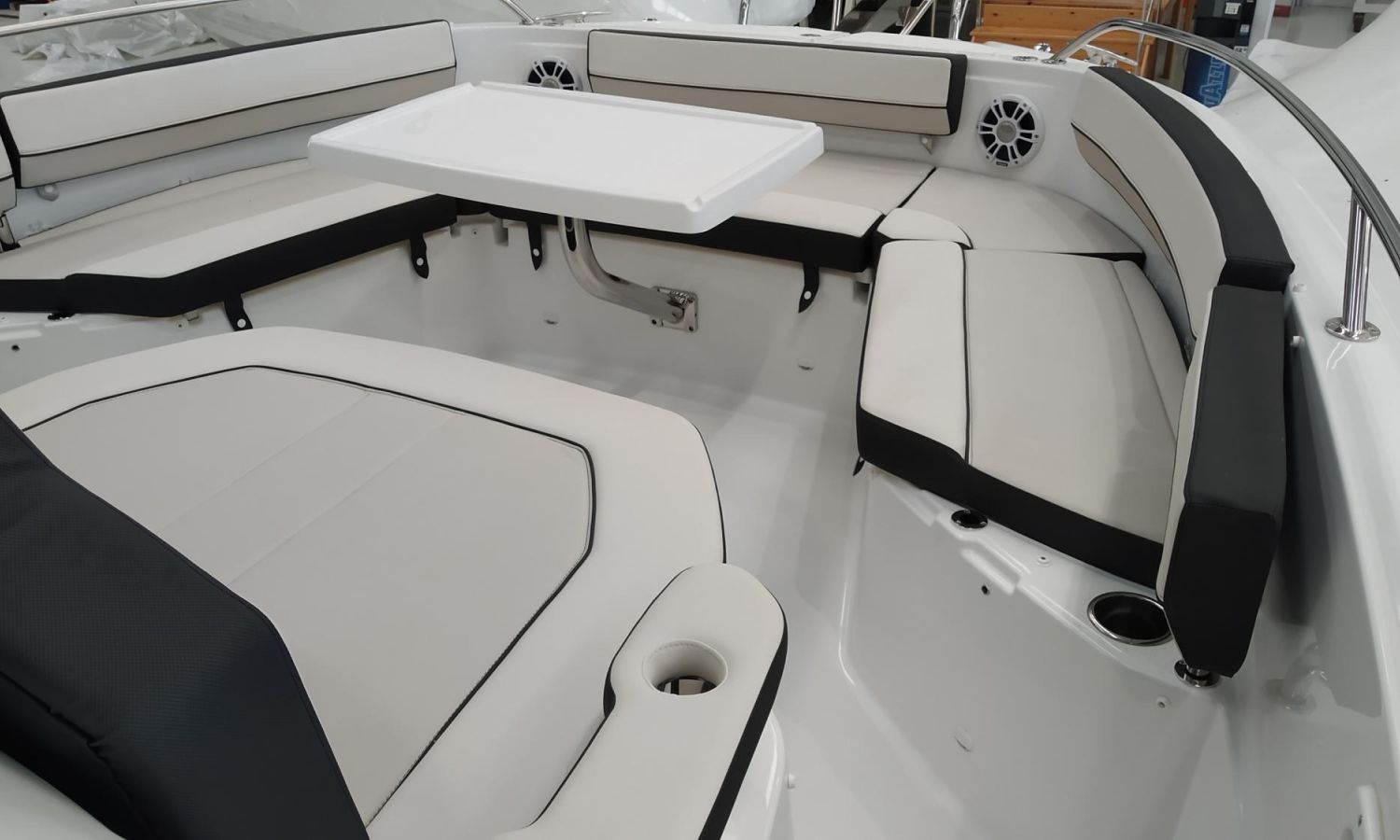 PREMIUM AUDIO PACK FOR BOAT WITH HARD TOP, UPHOLSTERY IN SALOON PVC MARLIN PURE WHITE, SET OF PROTECTIVE COVERS, SUNSHADE FOR FRONT SUNPAD, DARK SMOKE SUNSHADE FOR FRONT COCKPIT SUNWORKER, MANUAL T-TOP SLIDING HATCH, ELECTRONIC PACK GARMIN UPGRADED 2, COMFORT PACK, TRIM LEVEL PREMIERE SILVERTEX ICE, BOW THRUSTER, SEA PUMP FOR DECK WASHING, DECK SEARCHLIGHT FOR T-TOP, 2 FRONT HEADLIGHTS ON THE ROOF (2 LED LIGHT BARS), CLAXON, LUXURY FOLDING SIDE BENCH ON PORTSIDE + CUSHION, BOWPLATFORM WITH LADDER, POLYESTER SWIMMING PLATFORMS, COCKPIT TABLE POLYESTER, AUTOMATIC TRIM TABS ZIPWAKE, STORAGE RACK ON THE ROOF, GAS STOVE IN KITCHEN COCKPIT, FRONT COCKPIT GRP TABLE WITH POLYESTER, EXTRA FOR BOW SUNSHINE XXL, FRIDGE IN TUB 49L, FOLDABLE FORWARD FACING BACKRESTS IN FRONT COCKPIT, COCKPIT UPHOLSTERY SILVERTEX ICE DIAMANTE CARBON, DOUBLE BERTH COMPLEMENT IN SALOON, PRE-RIGGING ENGINE SUZUKI 2X (150-350 CV), INSTALLATION MOTOR INCLUDED, POWER STEERING SYSTEM FOR SUZUKI DUOPROP ENGINES.