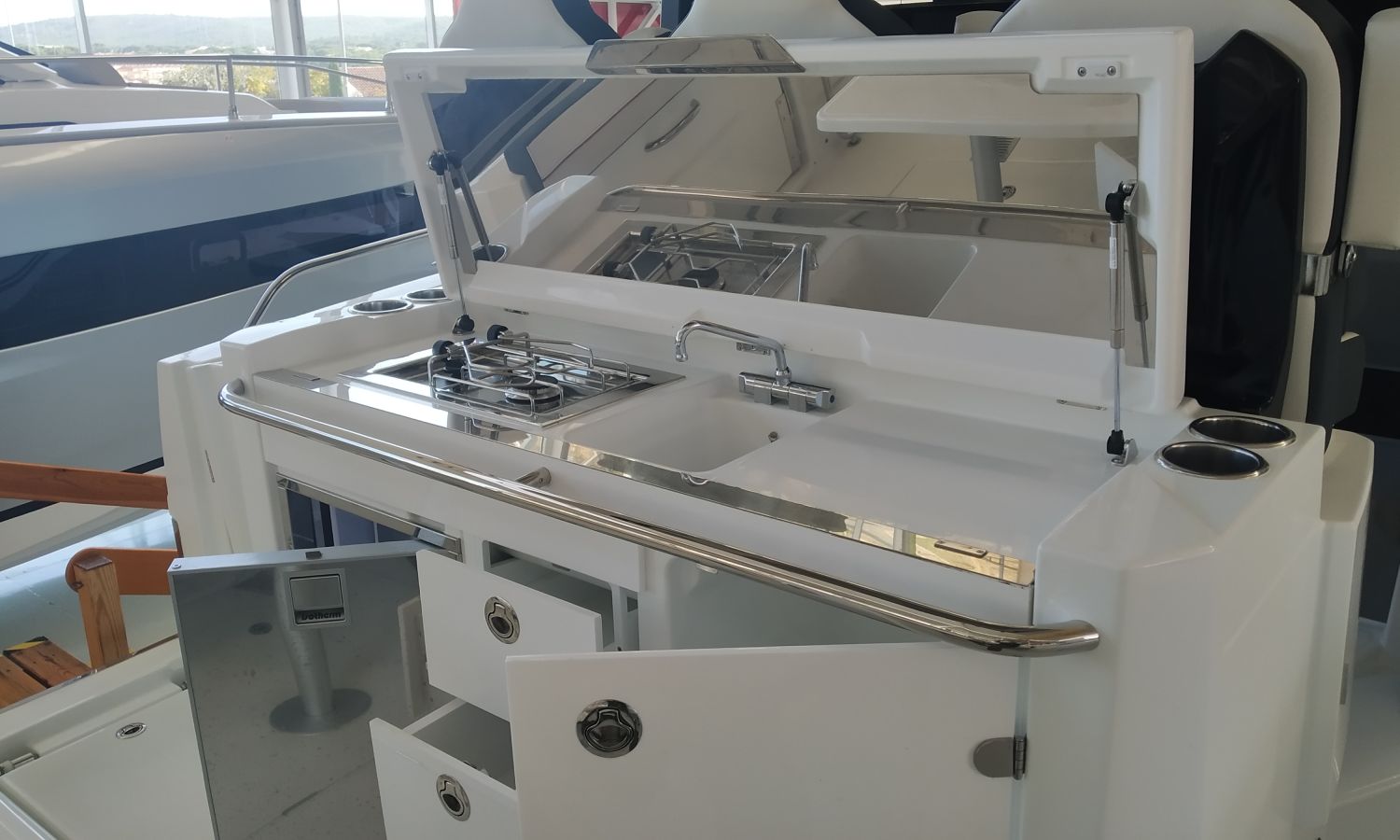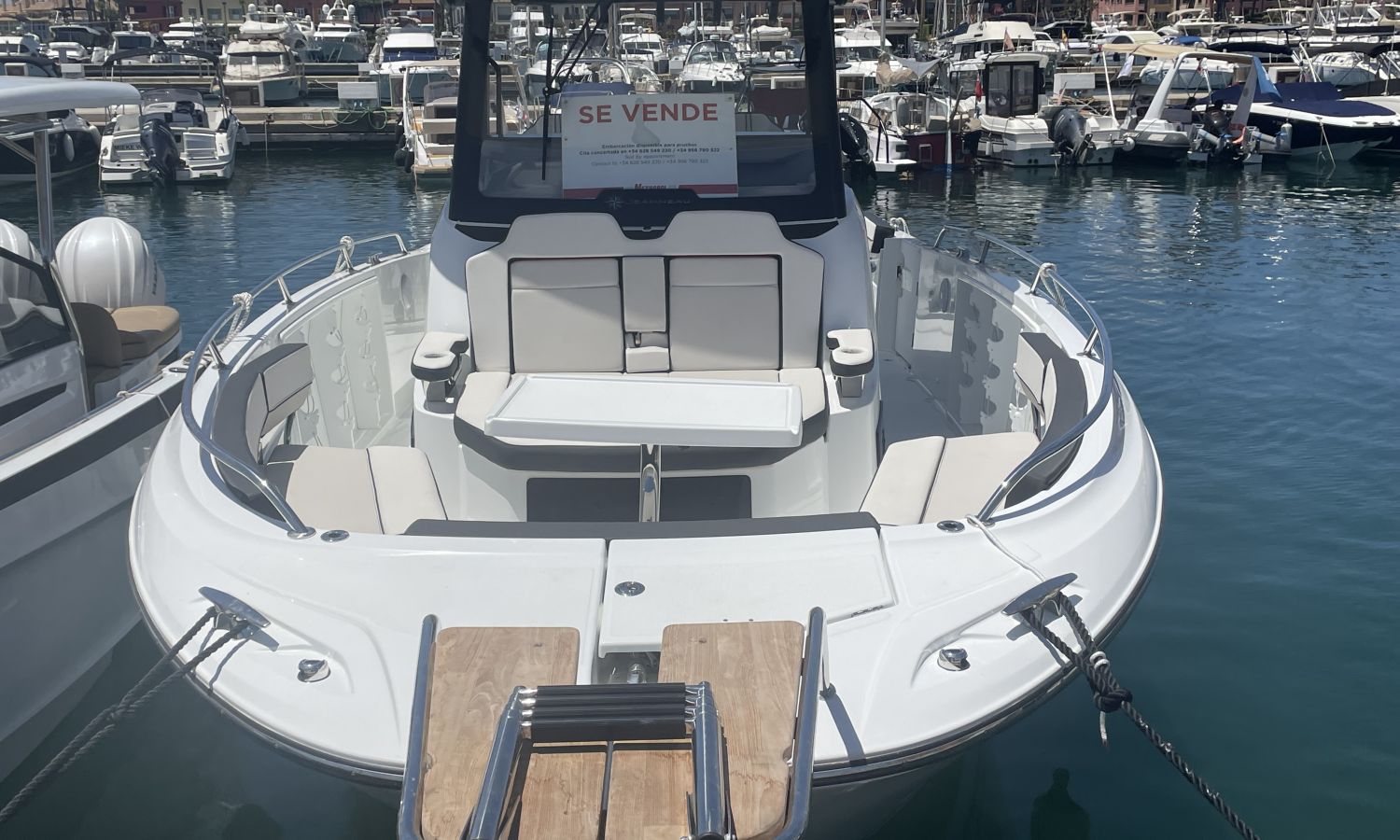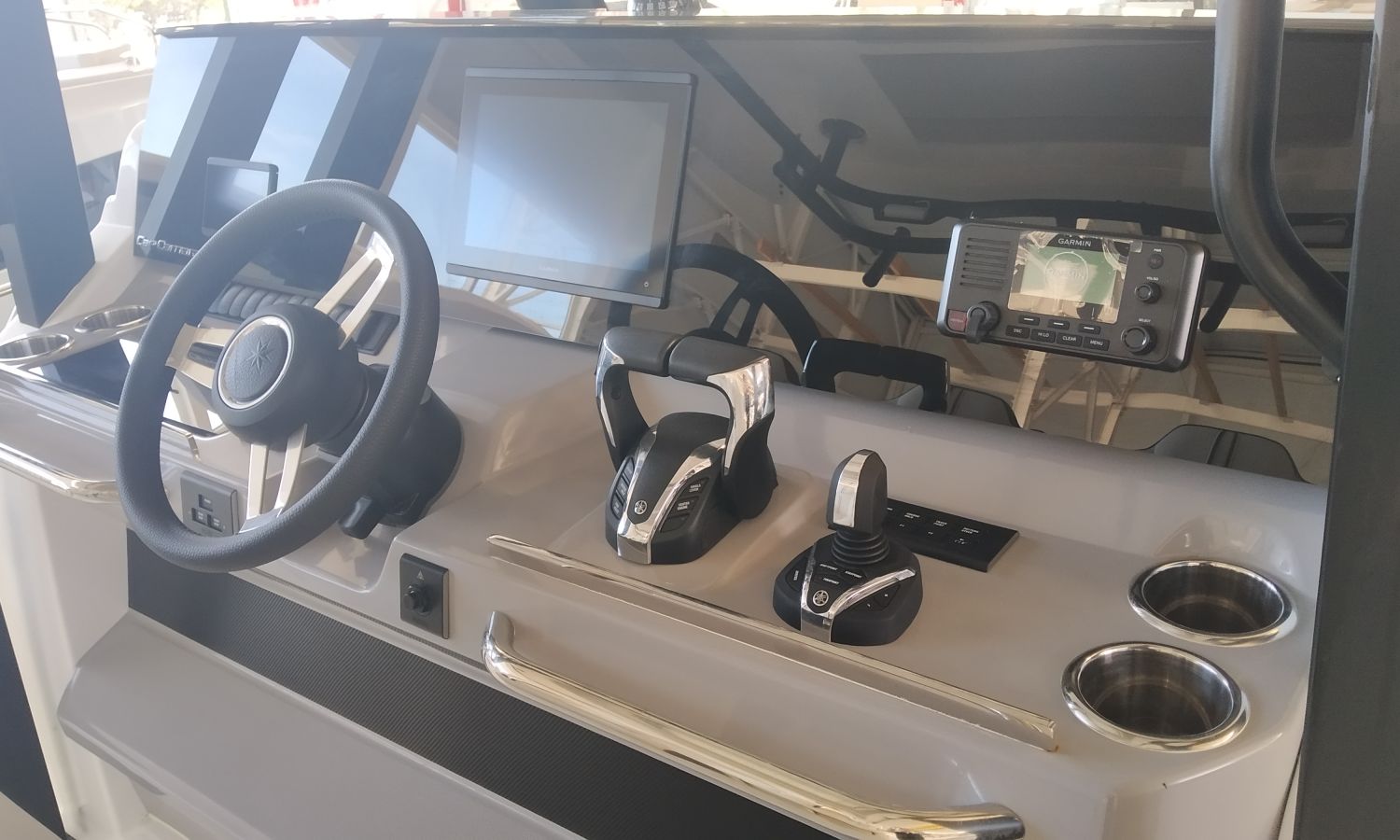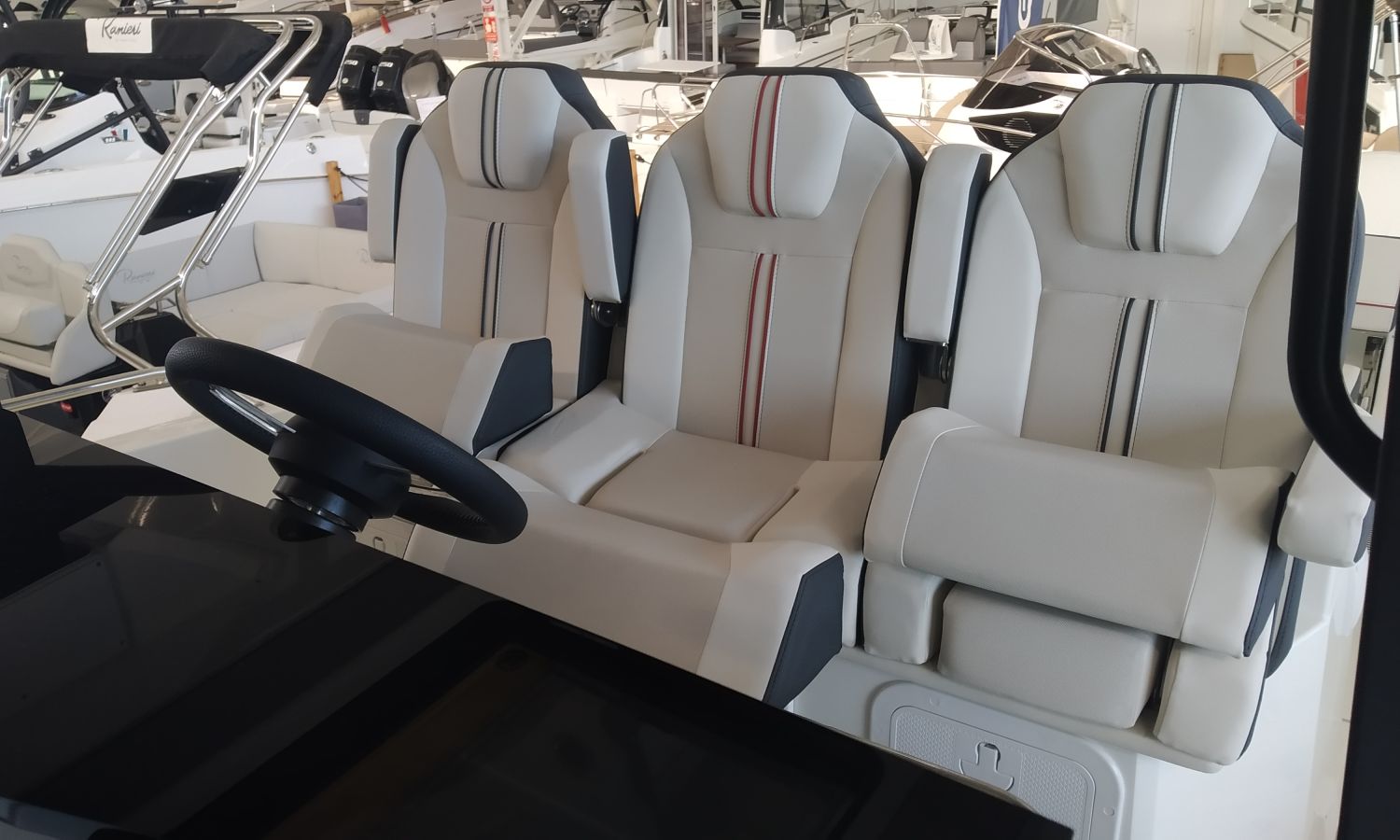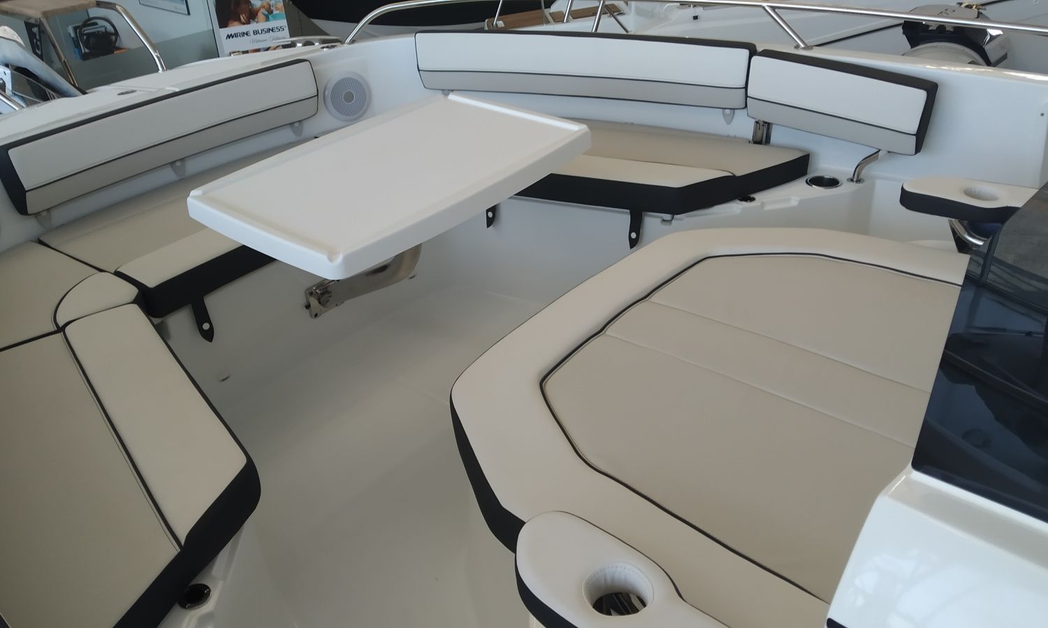 SALOON UPHOLSTERY PVC MARLIN PURE WHITE - CONSOLE AND COCKPIT BENCH COVER - BOW SUNBATHING AWNING - AFT COCKPIT AWNING - MANUAL OPENING T-TOP PANEL - ENHANCED GARMIN ELECTRONICS PACK - VHF 215 RADIO - FUSION RA210 AUDIO PACK - COMFORT PACK - PREMIERE SILVERTEX ICE EQUIPMENT LEVEL - BOW THRUSTER - DECK WASH PUMP - 2 UNDERWATER LIGHTS - 2 OVERHEAD SPOTLIGHTS (2 LED BARS) - HORN - RETRACTABLE LUXURY PORT SIDE BENCH + CUSHION - BOW PLATFORM WITH LADDER - POLYESTER SWIM PLATFORMS - POLYESTER COCKPIT TABLE - SKI MAST - ZIPWAKE AUTOMATIC FLAPS - ROOF RACK - GAS COOKER IN COCKPIT GALLEY - POLYESTER BOW COCKPIT TABLE - 49L INTERIOR FRIDGE - FOLDING BACKRESTS IN FRONT COCKPIT - COCKPIT CUSHIONS SILVERTEX ICE DIAMANTE CARBON - ADDITIONAL DOUBLE BERTH IN SALOON - CURTAINS FOR FRONT SALOON - PRE-RIGGING YAMAHA HMEX 2X 400-450 XTO ENGINE - UPGRADE YAMAHA JOYSTICK TWIN SBW - ENGINE INSTALLATION INCLUDED.Boat description