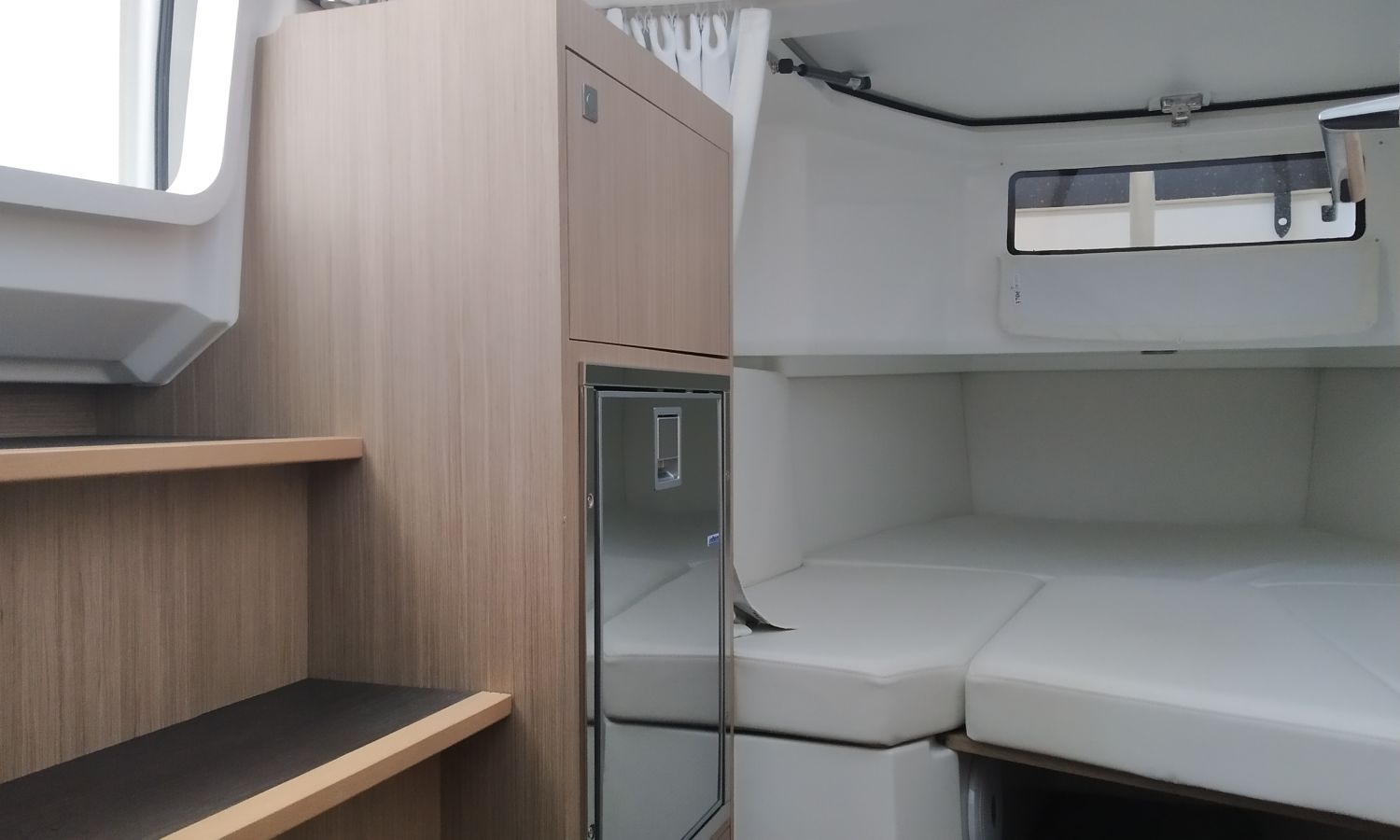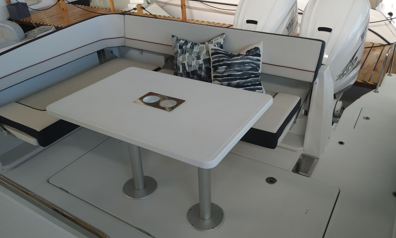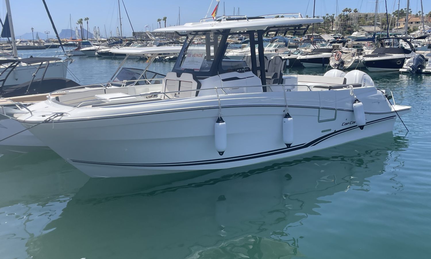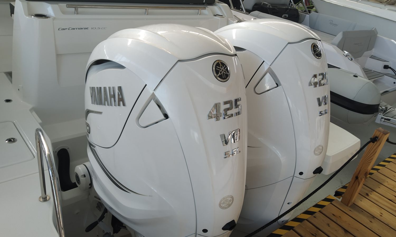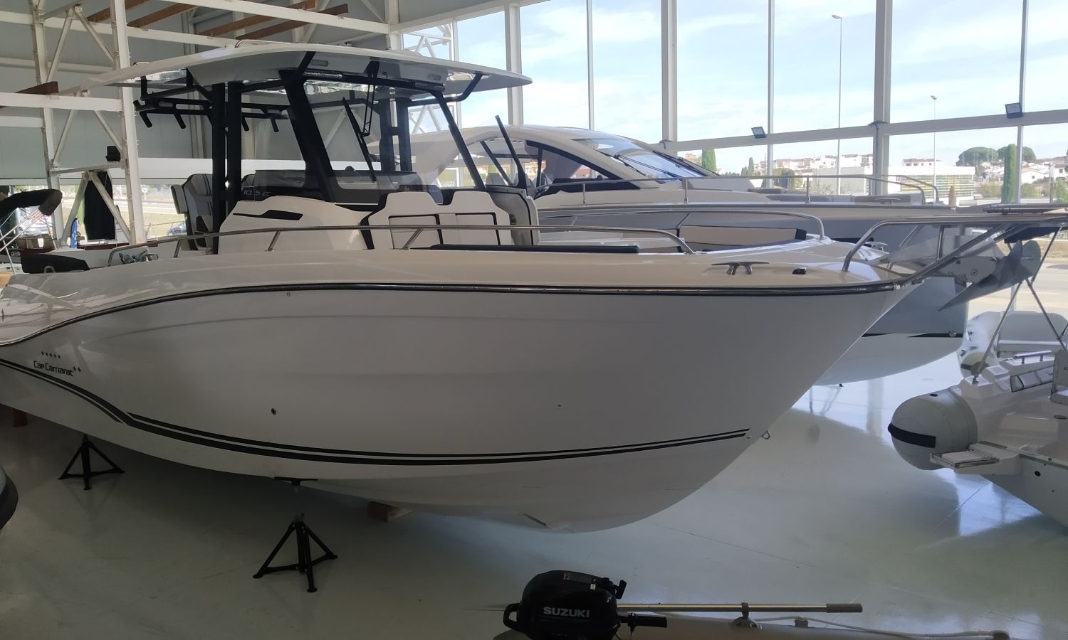 SALOON UPHOLSTERY PVC MARLIN PURE WHITE - CONSOLE AND COCKPIT BENCH COVER - BOW SUNBATHING AWNING - AFT COCKPIT AWNING - MANUAL OPENING T-TOP PANEL - ENHANCED GARMIN ELECTRONICS PACK - VHF 215 RADIO - FUSION RA210 AUDIO PACK - COMFORT PACK - PREMIERE SILVERTEX ICE EQUIPMENT LEVEL - BOW THRUSTER - DECK WASH PUMP - 2 UNDERWATER LIGHTS - 2 OVERHEAD SPOTLIGHTS (2 LED BARS) - HORN - RETRACTABLE LUXURY PORT SIDE BENCH + CUSHION - BOW PLATFORM WITH LADDER - POLYESTER SWIM PLATFORMS - POLYESTER COCKPIT TABLE - SKI MAST - ZIPWAKE AUTOMATIC FLAPS - ROOF RACK - GAS COOKER IN COCKPIT GALLEY - POLYESTER BOW COCKPIT TABLE - 49L INTERIOR FRIDGE - FOLDING BACKRESTS IN FRONT COCKPIT - COCKPIT CUSHIONS SILVERTEX ICE DIAMANTE CARBON - ADDITIONAL DOUBLE BERTH IN SALOON - CURTAINS FOR FRONT SALOON - PRE-RIGGING YAMAHA HMEX 2X 400-450 XTO ENGINE - UPGRADE YAMAHA JOYSTICK TWIN SBW - ENGINE INSTALLATION INCLUDED.Boat description