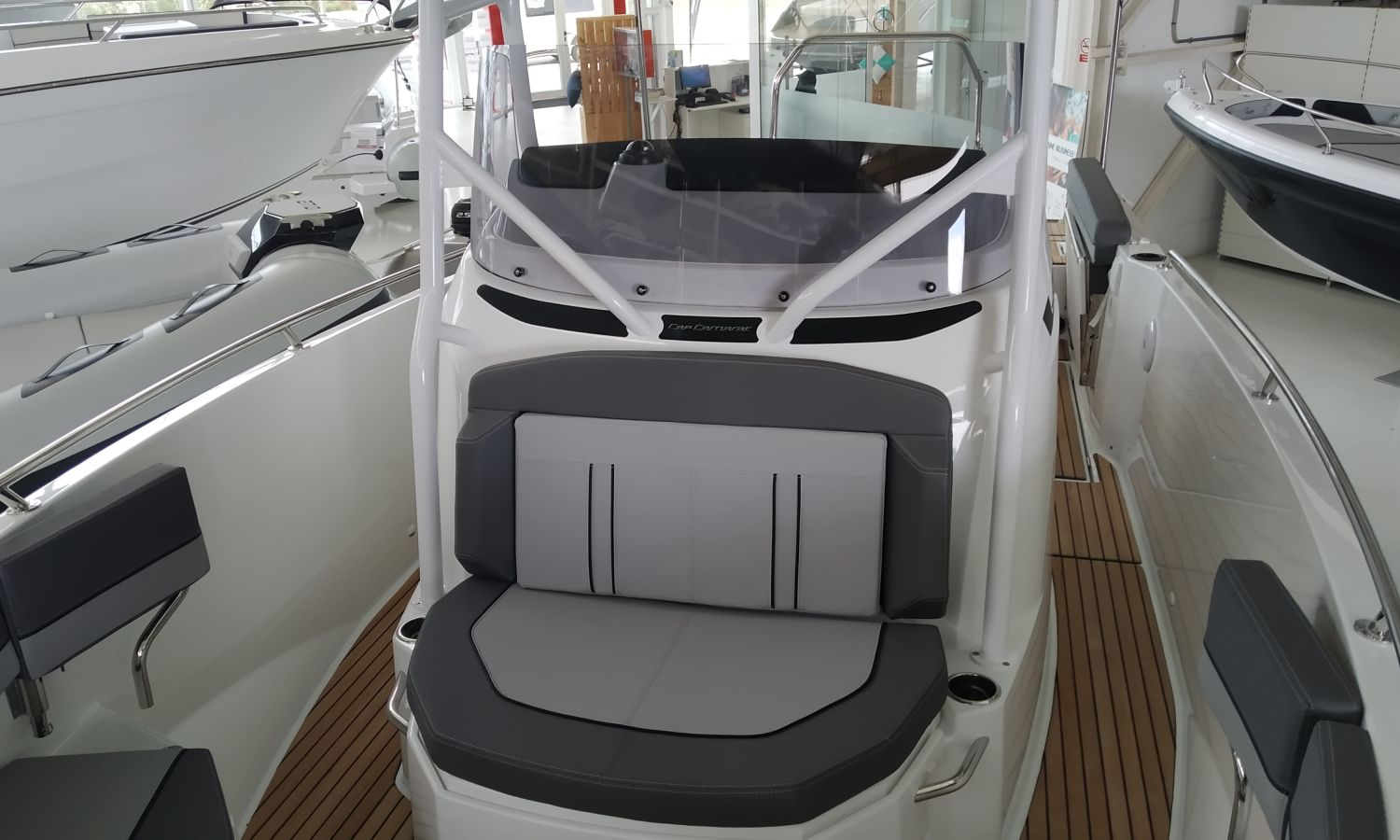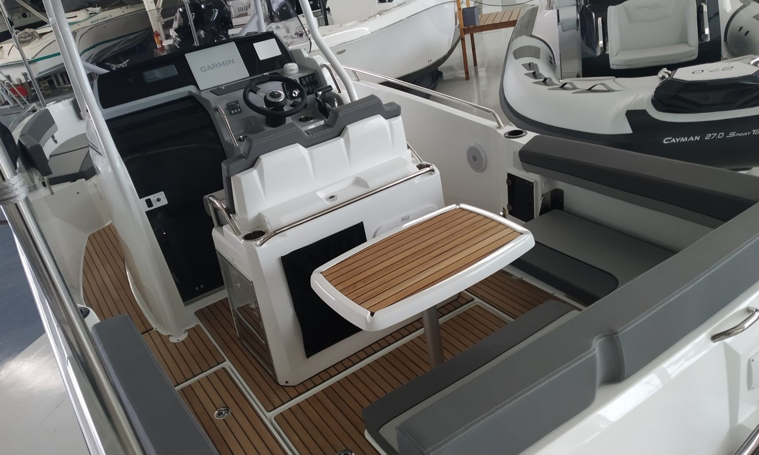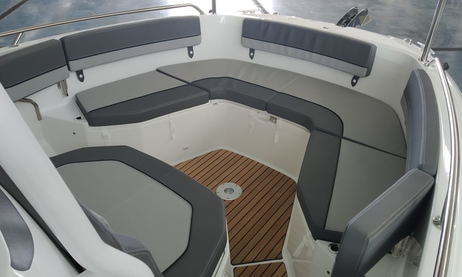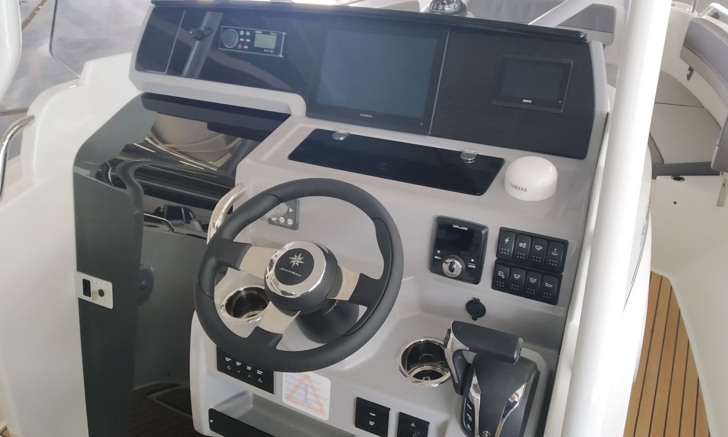 LEANING POST VERSION WITH GALLEY AND FRIDGE IN COCKPIT - RA70N FUSION AUDIO PACK - UPGRADED GARMIN ELECTRONICS PACK - T-TOP WITH POLYESTER ROOF WITH WHITE STRUCTURE - BOW COCKPIT AWNING FOR T-TOP - PREMIERE EQUIPMENT LEVEL - BOW THRUSTER - ELECTRIC WINDLASS - WINDLASS CONTROL ON DASHBOARD - SKI MAST (BOW) - 220V DOCK SOCKET + CHARGER PRE-MOUNTING - BOW SUNBATHING - "LUXE" COCKPIT TABLE - LUXE BATHING PLATFORMS WITH TEAK - BACKRESTS FOR REAR LUX COCKPIT SIDE SEATS - AUTOMATIC ZIPWAKE FLAPS - FORWARD SALOON BACKRESTS + REMOVABLE BACKRESTS - FORWARD CONSOLE BACKRESTS - MARINE WC + HOLDING TANK - DOUBLE BERTH SUPPLEMENT - FORWARD COCKPIT MATTRESS - LED COCKPIT LIGHTING - GAS COOKER AND GAS BOX IN LEANING POST - HORN - TEAK COCKPIT FLOOR IN LEANING POST VERSION - , PRE-RIGGING YAMAHA HMEX 225 - 300 SBW - TRANSPORT FROM THE SHIPYARD - COSTA-BRAVA - MOTOR INSTALLATION INCLUDED.Boat description