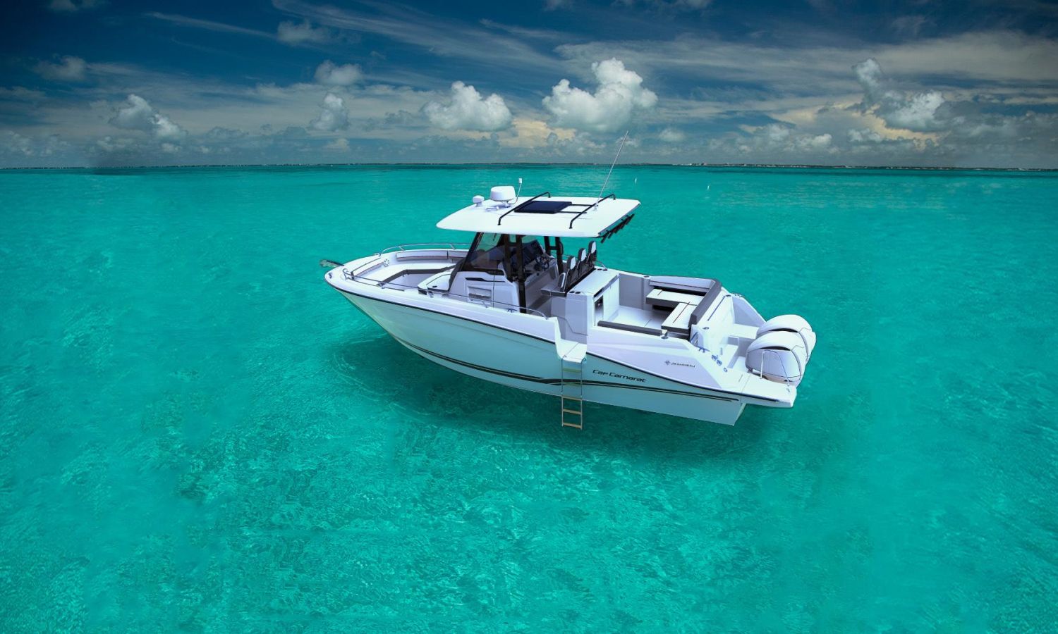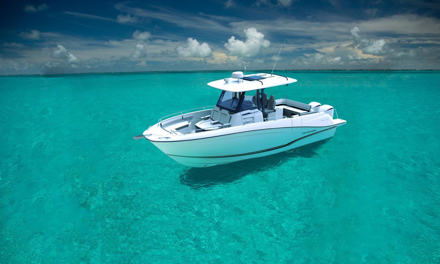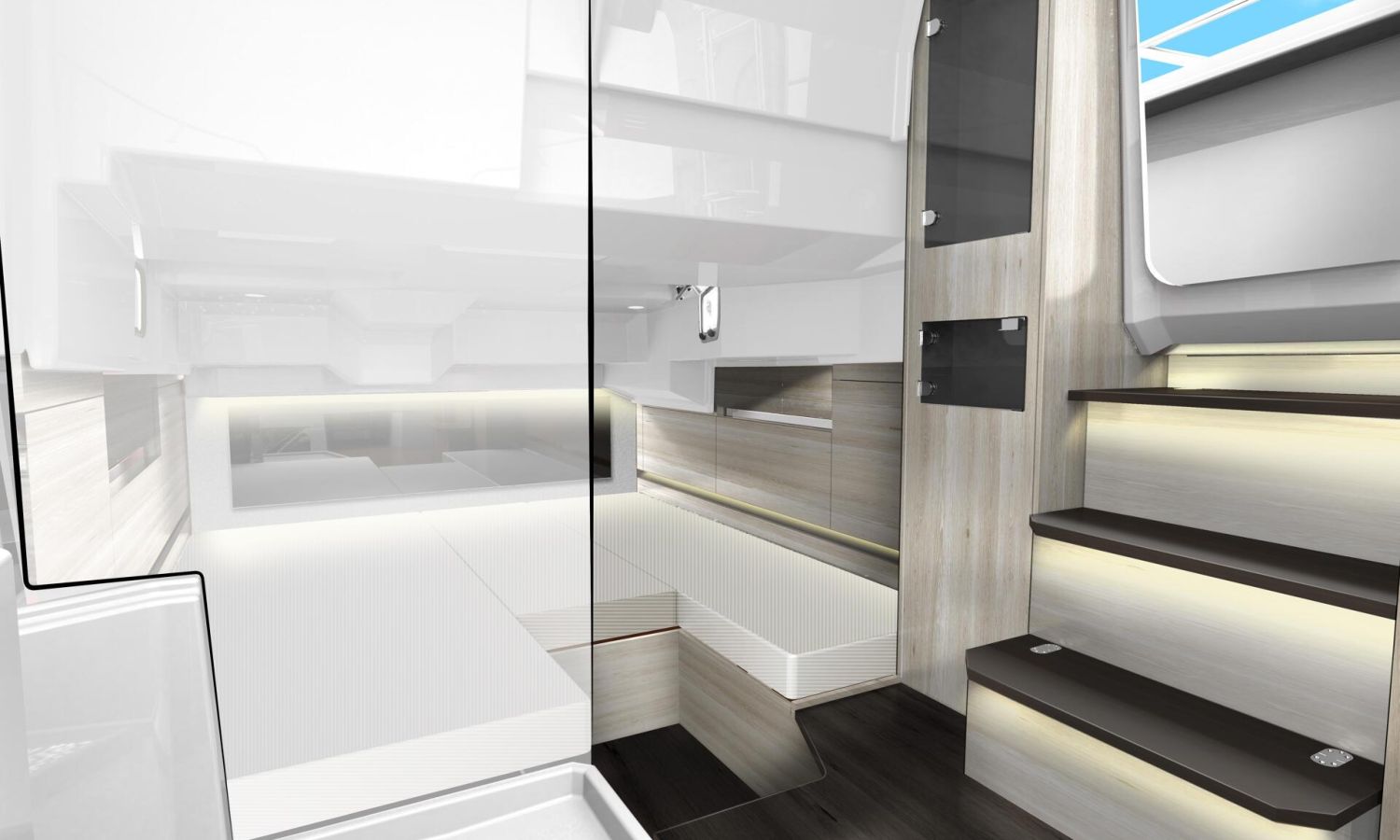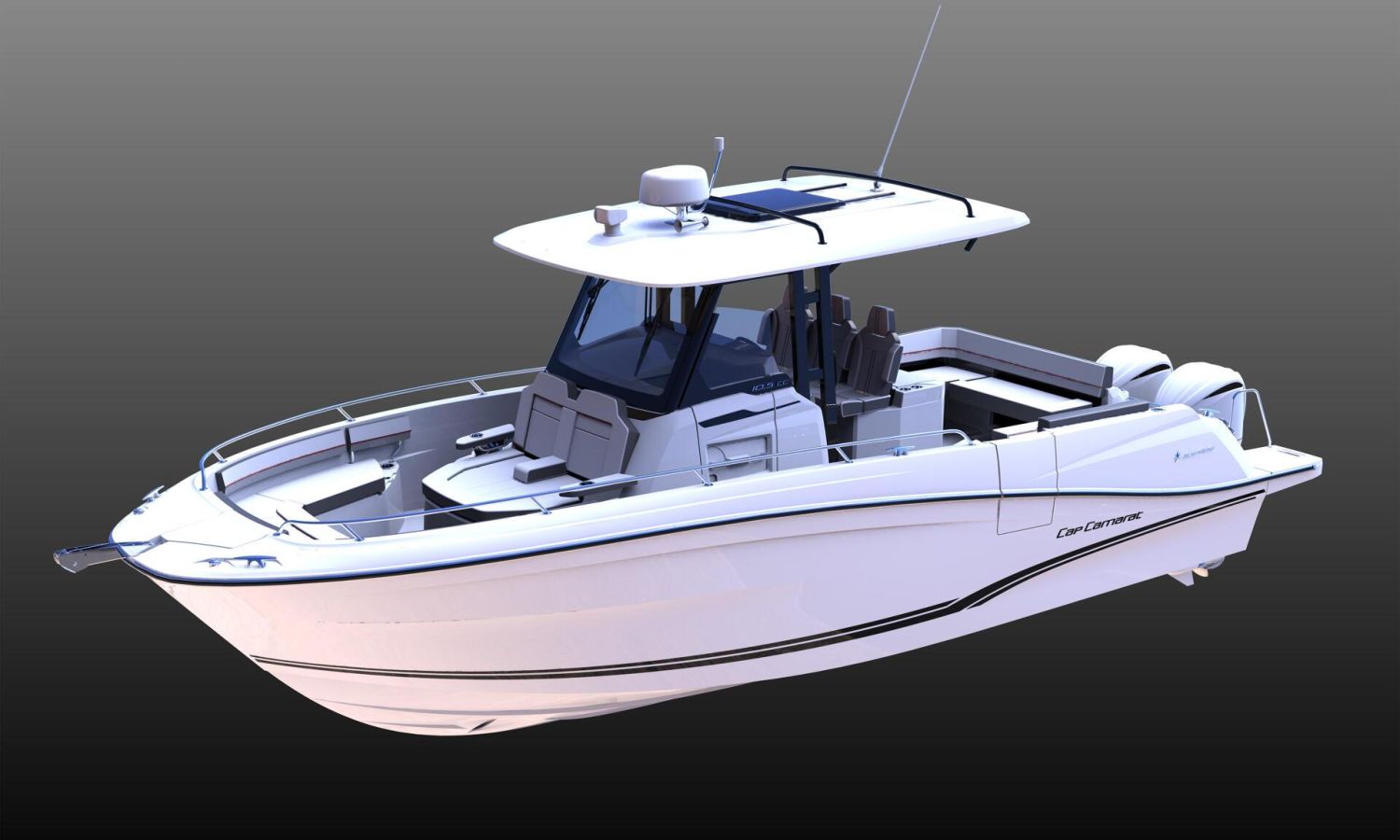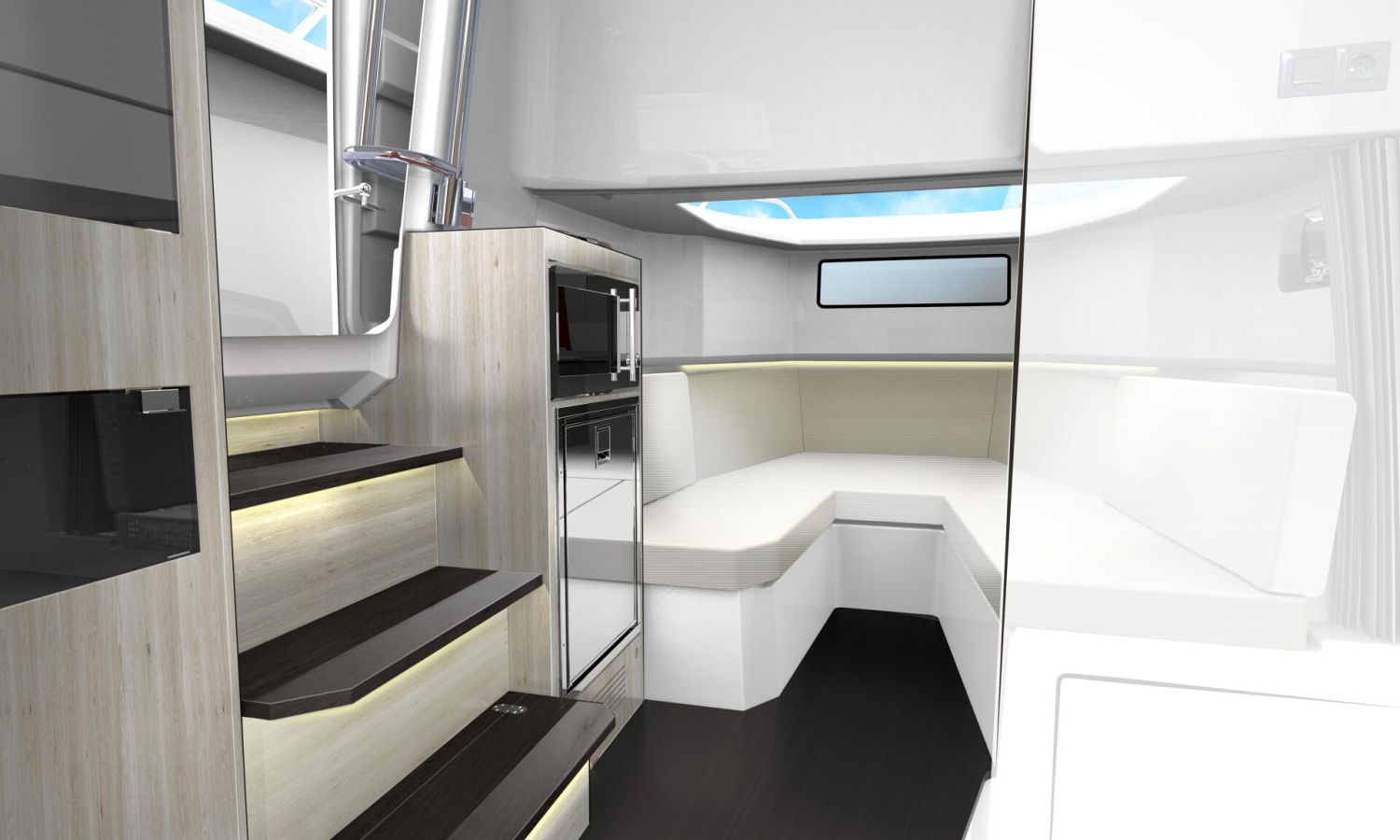 With its V-shaped hull design for excellent seakeeping, powerful twin engines, 2 x 300 HP or 2 x 425 HP with joystick, and ergonomic helm station, you will enjoy long fast runs, comfortably seated and in perfect safety.