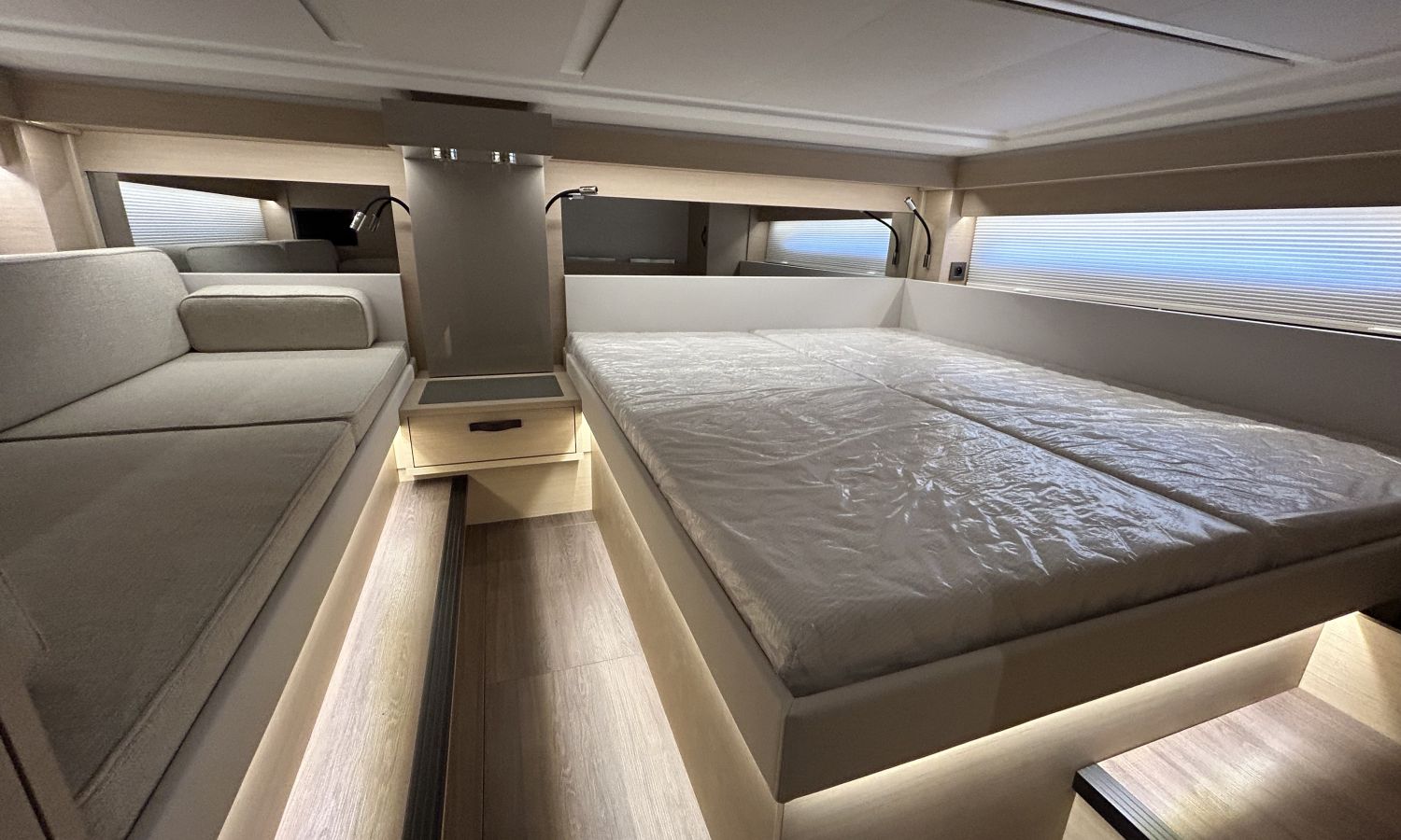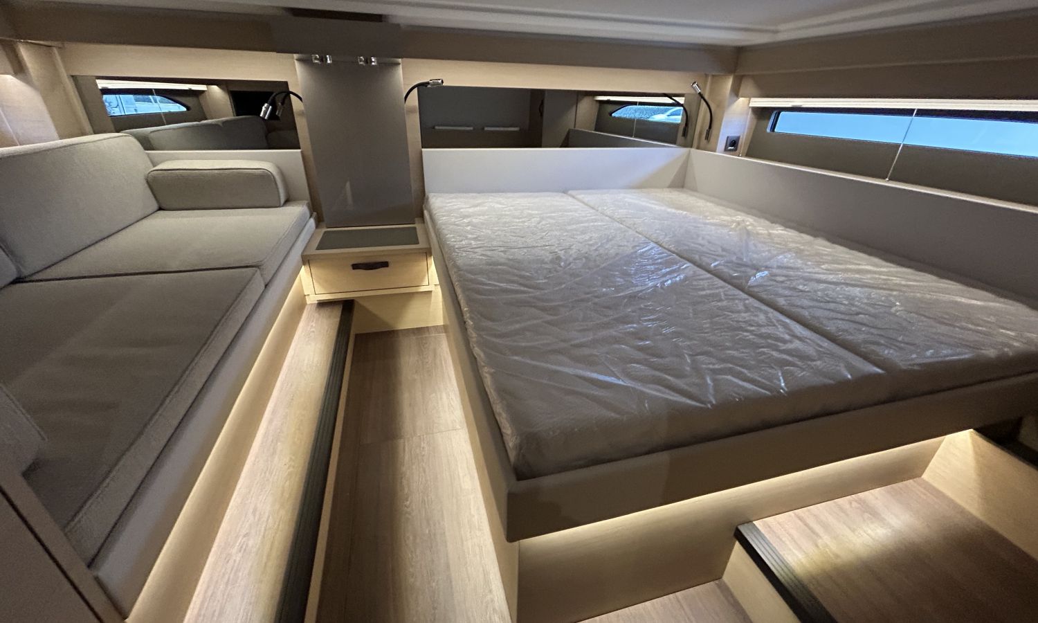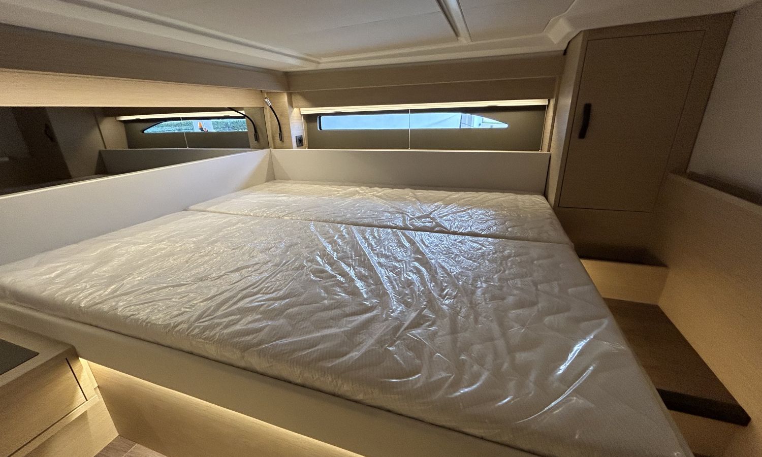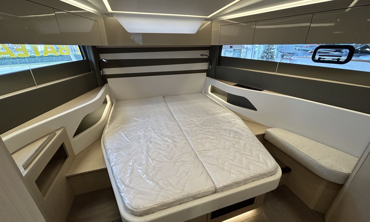 2 cabins 1 bathroom - Sportop version - Poa-deck version - Joystick - Mooring kit - Stainless steel anchor kit - Equipment level Premiere Breakfast Point - Ivory upholstery in Proa cabin - Ivory cockpit sofa - Macadamia Silvertex bathtub cushions - Pack Confort Breakfast Point White Oak - Pack electronica Raymarine Enhanced - Pack Audio Premium Fusion - Hydraulic bathing platform - Hard tank greywater 200l - 2 battery chargers 60 AH - Multifunction steering wheel - Electric pump washed in the bow (fresh and salt water) - Zipwake automatic flaps - Grill elec. + Cooking plate - Cushions in bow White Cockpit Deck and Armrests - Bow thruster - Generator for air conditioning 8.5 kW - Second refrigerator in cockpit 65l to starboard - Second refrigerator in cockpit 65l to starboard - Refrigerator Breakfast point 78l - Microwave oven - Indoor air conditioning - Converter 12/230v 2000VA - Radio VHF Raymarine RAY90 - Pilot automatic Raymarine - Raymarine control unit P70RS for autopilot - Ship control - AIS 700 transpondedror - 2 fictitious Satelite antennas - TV antenna - Hifi Fusion in bow cabin with 2 speakers - Bathtub, aisles and platform in teak - Transport Shipyard-Costa Brava - Antifouling paint - Preparation, assembly and delivery with sea trials..Boat description