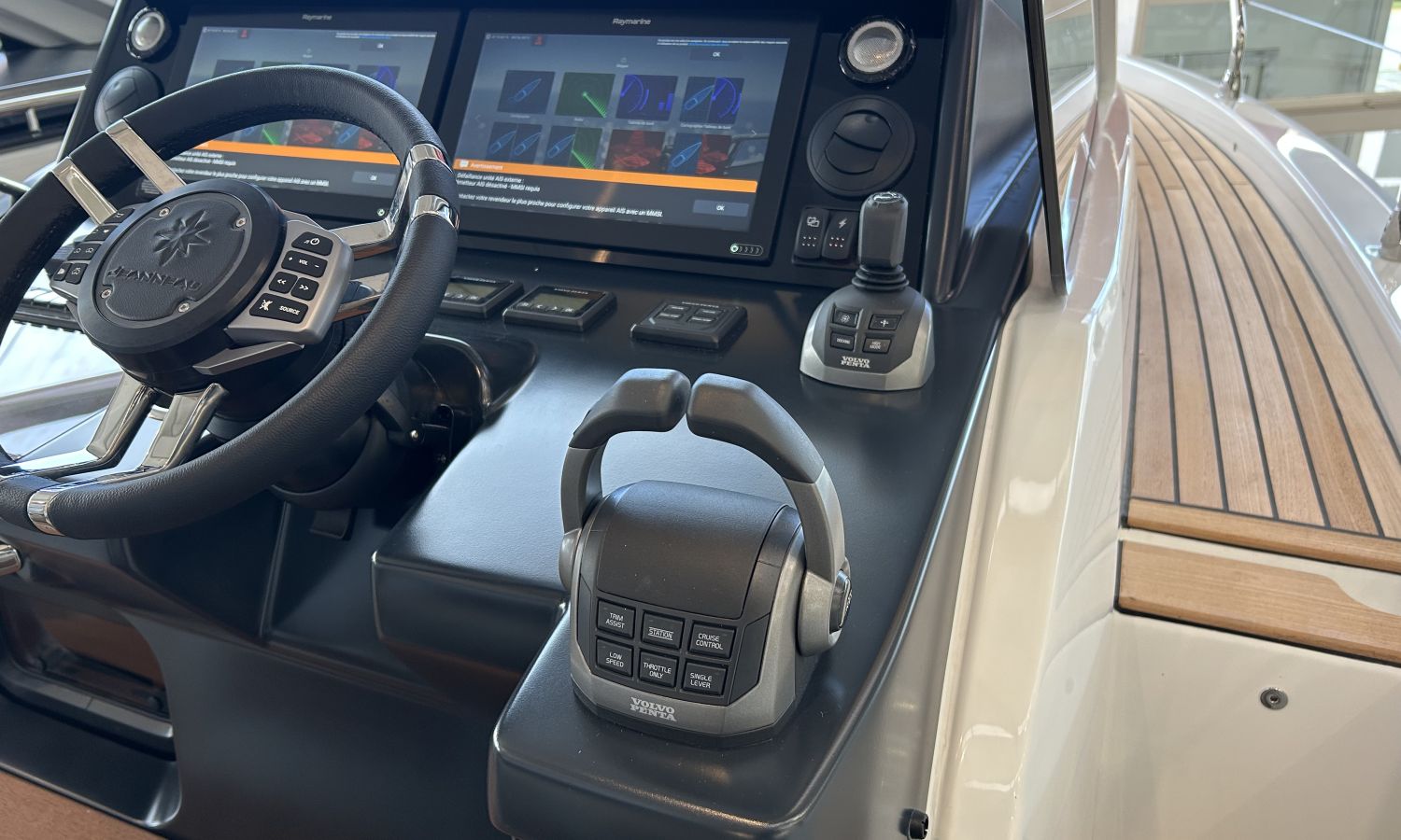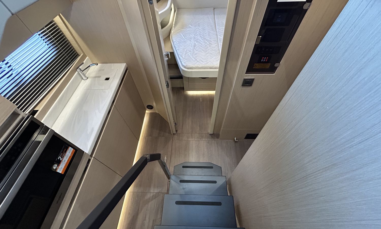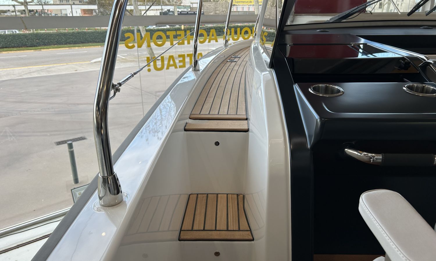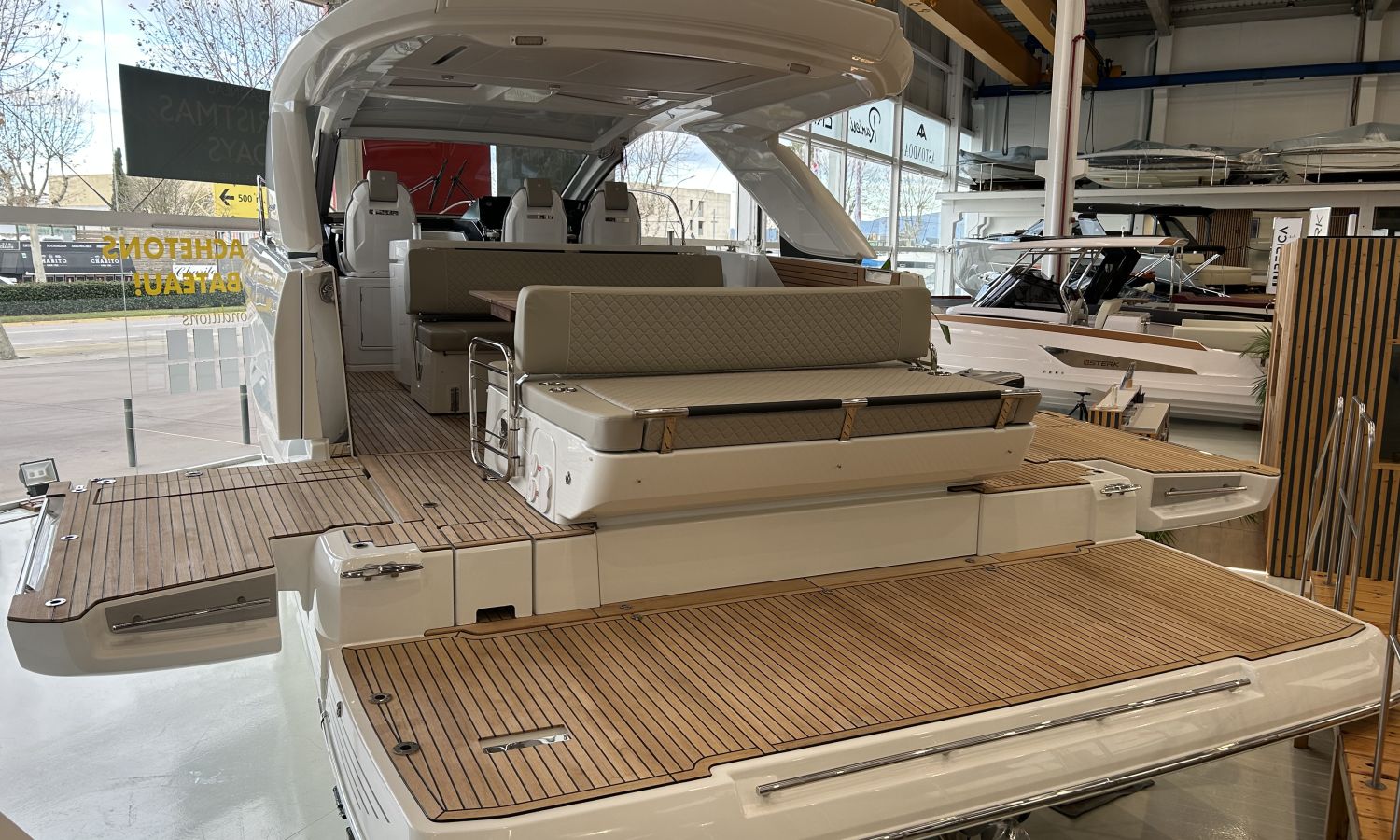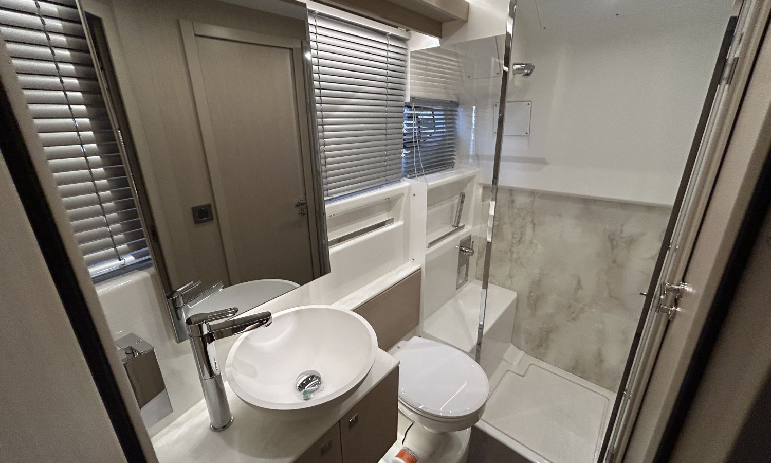 2 cabins 1 bathroom - Sportop version - Poa-deck version - Joystick - Mooring kit - Stainless steel anchor kit - Equipment level Premiere Breakfast Point - Ivory upholstery in Proa cabin - Ivory cockpit sofa - Macadamia Silvertex bathtub cushions - Pack Confort Breakfast Point White Oak - Pack electronica Raymarine Enhanced - Pack Audio Premium Fusion - Hydraulic bathing platform - Hard tank greywater 200l - 2 battery chargers 60 AH - Multifunction steering wheel - Electric pump washed in the bow (fresh and salt water) - Zipwake automatic flaps - Grill elec. + Cooking plate - Cushions in bow White Cockpit Deck and Armrests - Bow thruster - Generator for air conditioning 8.5 kW - Second refrigerator in cockpit 65l to starboard - Second refrigerator in cockpit 65l to starboard - Refrigerator Breakfast point 78l - Microwave oven - Indoor air conditioning - Converter 12/230v 2000VA - Radio VHF Raymarine RAY90 - Pilot automatic Raymarine - Raymarine control unit P70RS for autopilot - Ship control - AIS 700 transpondedror - 2 fictitious Satelite antennas - TV antenna - Hifi Fusion in bow cabin with 2 speakers - Bathtub, aisles and platform in teak - Transport Shipyard-Costa Brava - Antifouling paint - Preparation, assembly and delivery with sea trials..Boat description