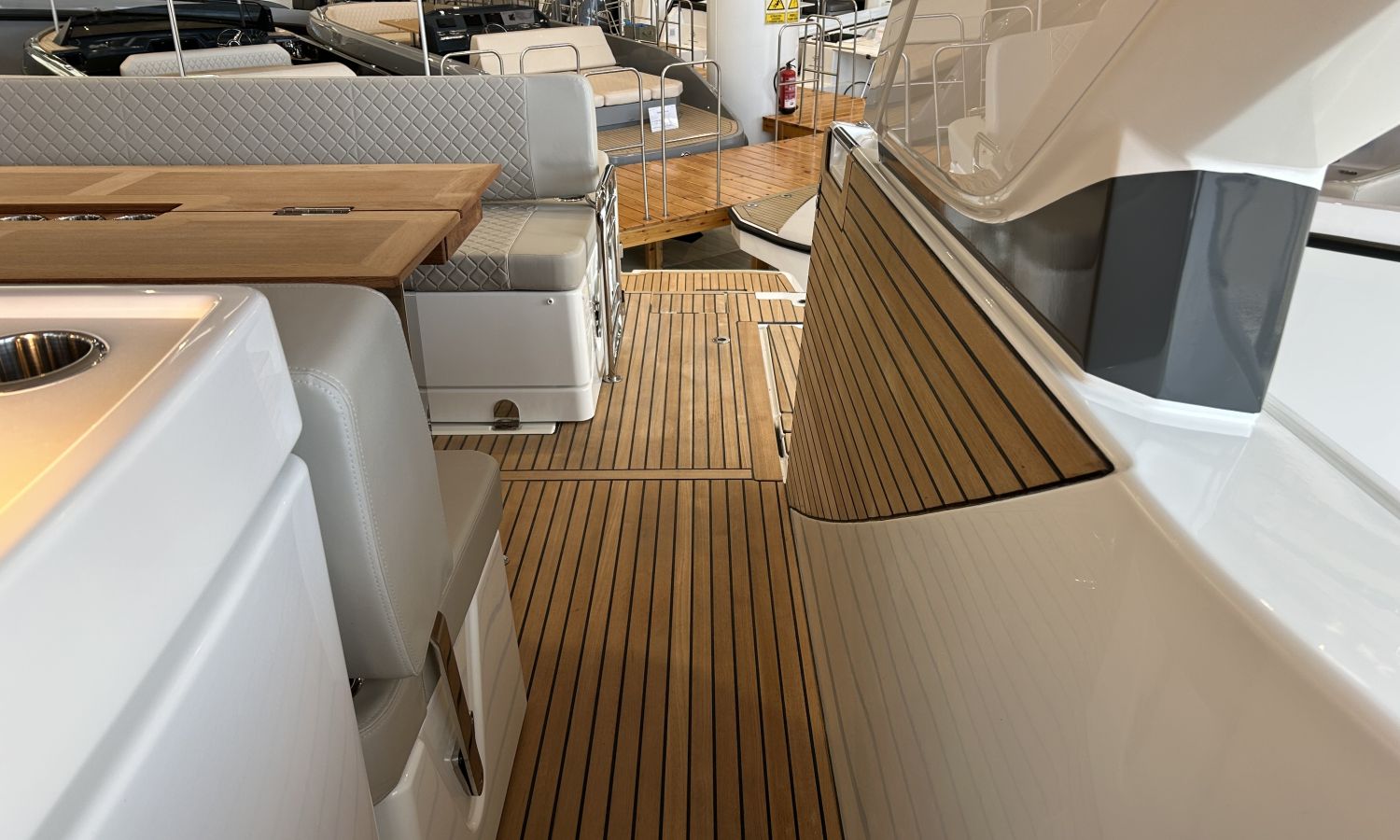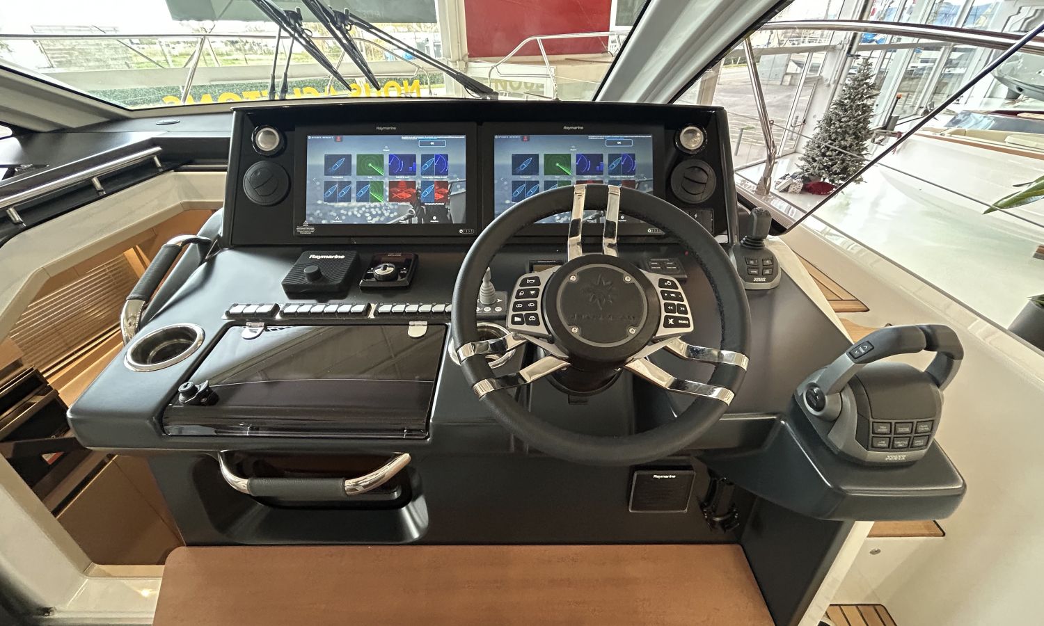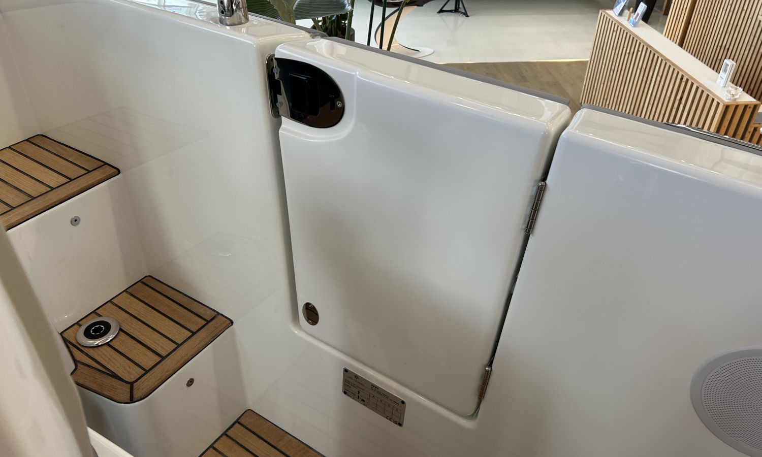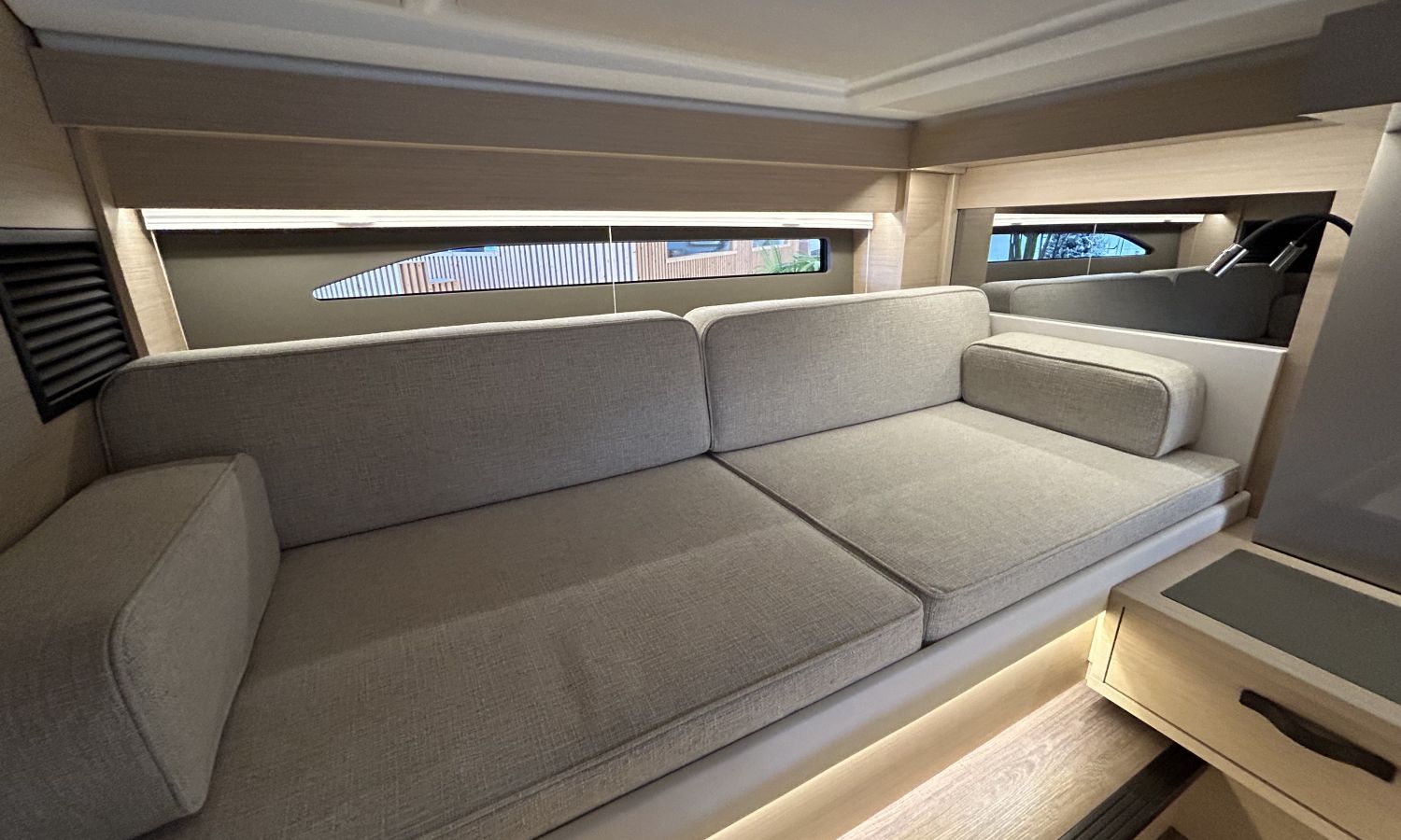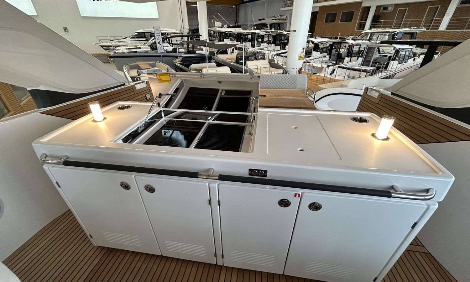 2 cabins 1 bathroom - Sportop version - Poa-deck version - Joystick - Mooring kit - Stainless steel anchor kit - Equipment level Premiere Breakfast Point - Ivory upholstery in Proa cabin - Ivory cockpit sofa - Macadamia Silvertex bathtub cushions - Pack Confort Breakfast Point White Oak - Pack electronica Raymarine Enhanced - Pack Audio Premium Fusion - Hydraulic bathing platform - Hard tank greywater 200l - 2 battery chargers 60 AH - Multifunction steering wheel - Electric pump washed in the bow (fresh and salt water) - Zipwake automatic flaps - Grill elec. + Cooking plate - Cushions in bow White Cockpit Deck and Armrests - Bow thruster - Generator for air conditioning 8.5 kW - Second refrigerator in cockpit 65l to starboard - Second refrigerator in cockpit 65l to starboard - Refrigerator Breakfast point 78l - Microwave oven - Indoor air conditioning - Converter 12/230v 2000VA - Radio VHF Raymarine RAY90 - Pilot automatic Raymarine - Raymarine control unit P70RS for autopilot - Ship control - AIS 700 transpondedror - 2 fictitious Satelite antennas - TV antenna - Hifi Fusion in bow cabin with 2 speakers - Bathtub, aisles and platform in teak - Transport Shipyard-Costa Brava - Antifouling paint - Preparation, assembly and delivery with sea trials..Boat description