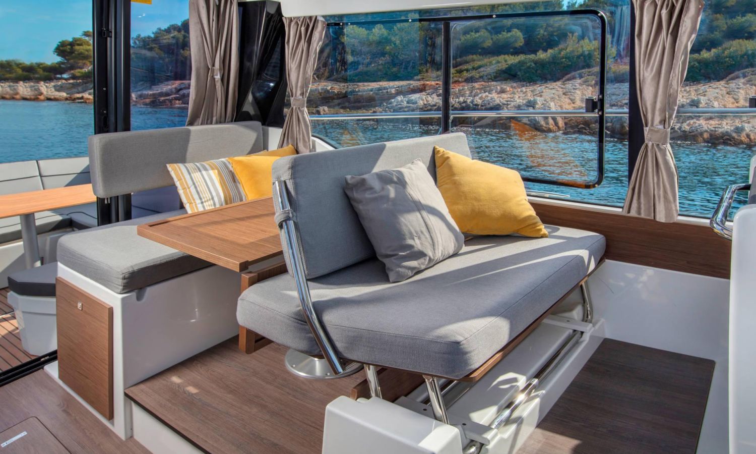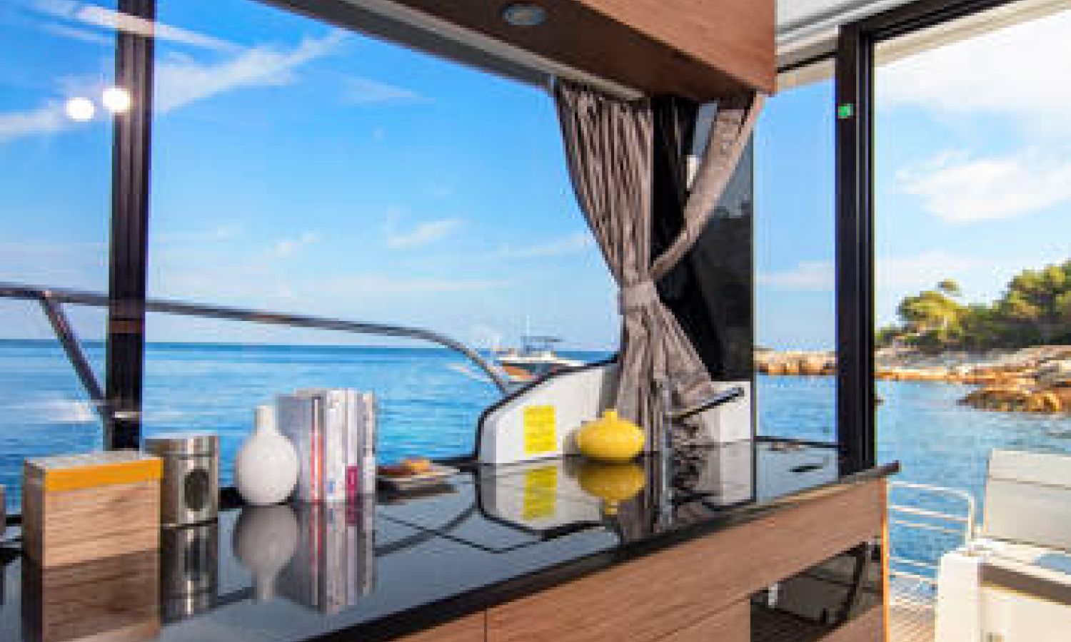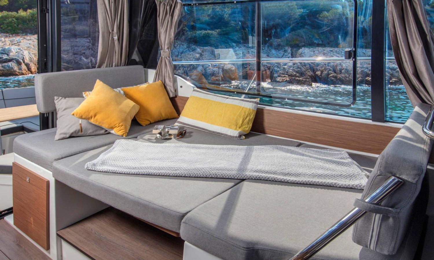 The FLYBRIDGE includes a forward sundeck and a folding copilot bench seat. The bench seat can be transformed into a sun lounger or an XXL sundeck, according to preference! The FLYBRIDGE also includes multiple storage solutions and can accommodate an optional Bimini.