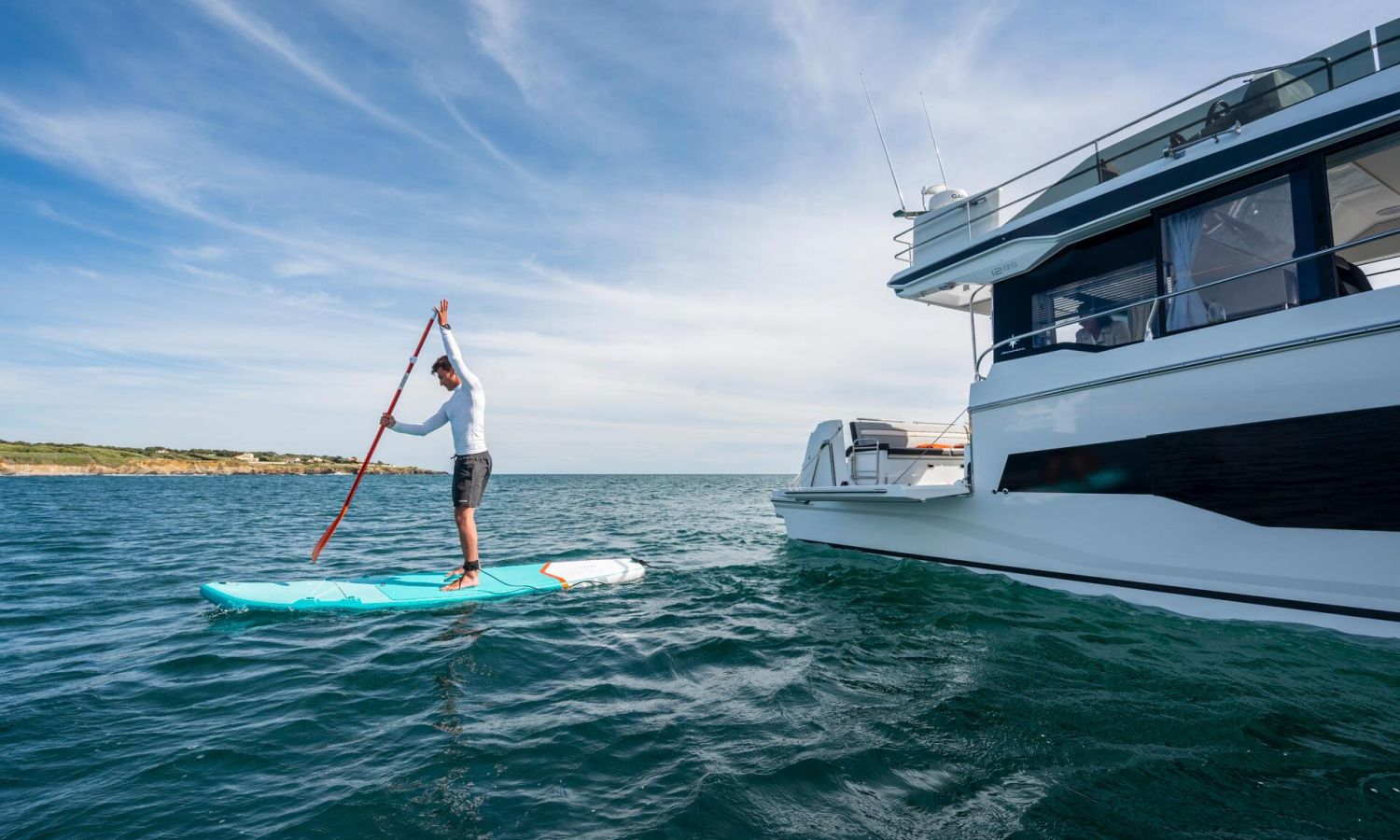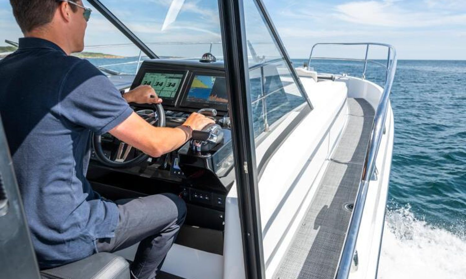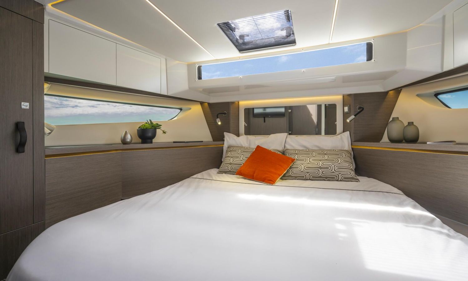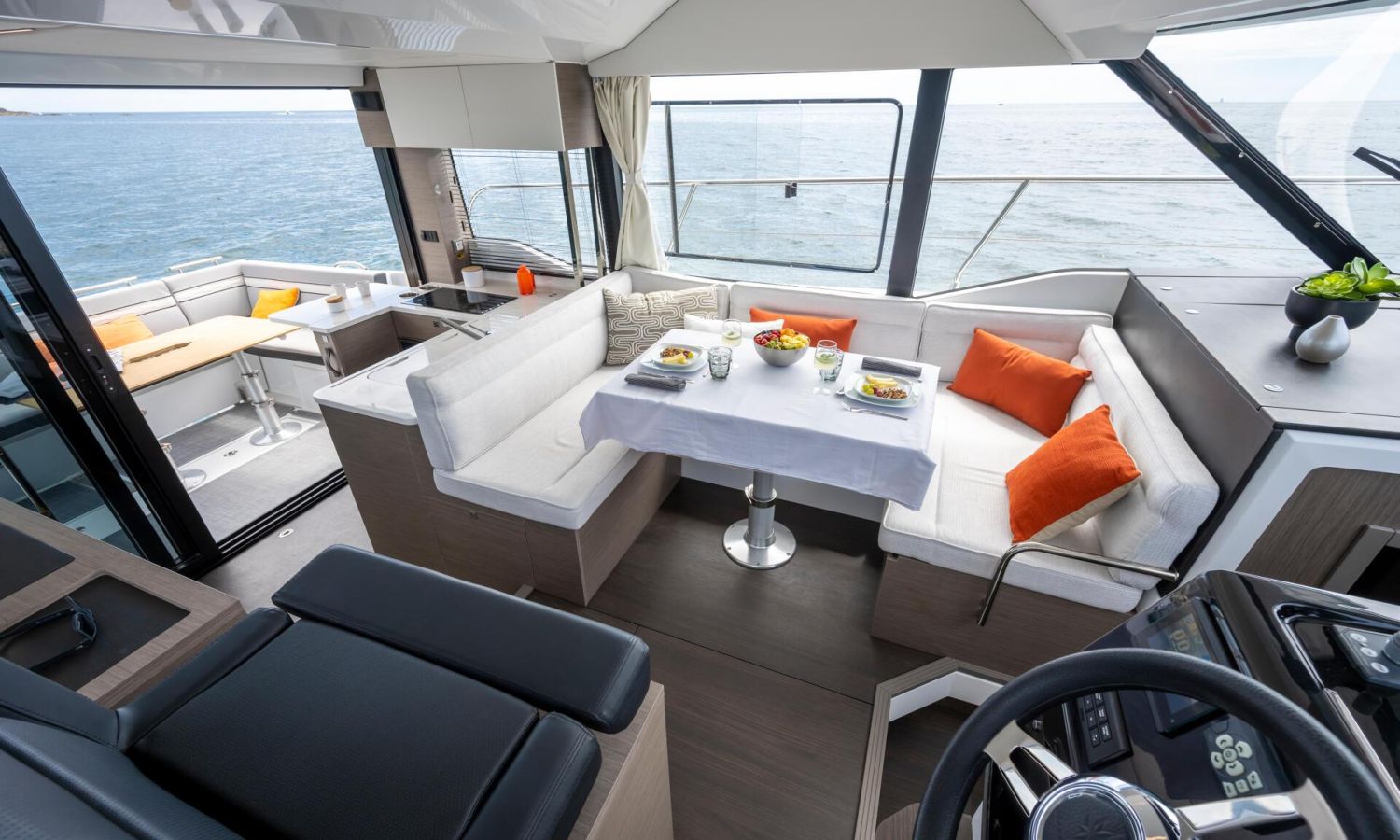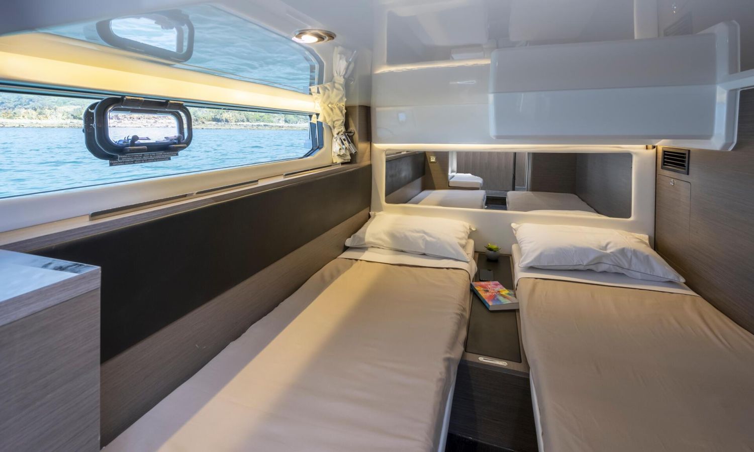 You'll fall in love with her contemporary, elegant lines, featuring new windows in the hull. This signature feature by Jeanneau lends an exclusive style to the flagship of this historic line, equipped with triple 300 HP engines.