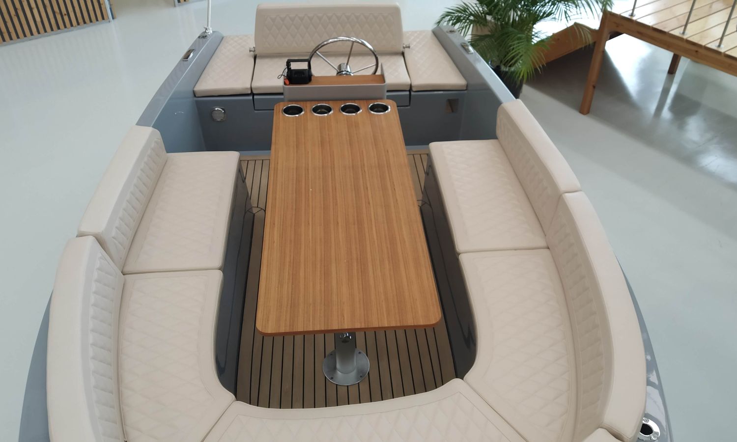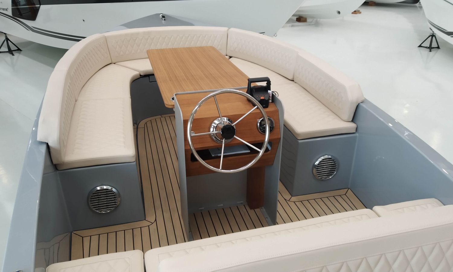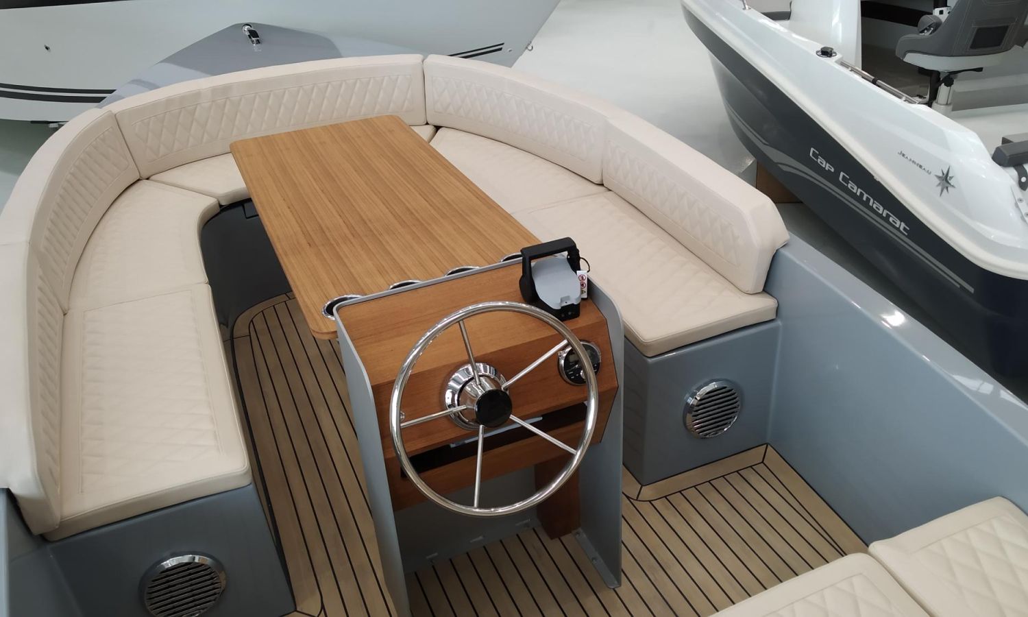 Hull custom colour Titanium (RAL 7045) - Hima type canopy - Swim ladder - Navigation lights - Rear co-pilot seat - Pilot seat back - Bow solarium cushions - Bathroom ladder - Coasters on bathtub table - Grey fender list - Daimond Stitched Leadther Cream (BG 3151) - Transport Shipyard-Costa-Brava.Boat description