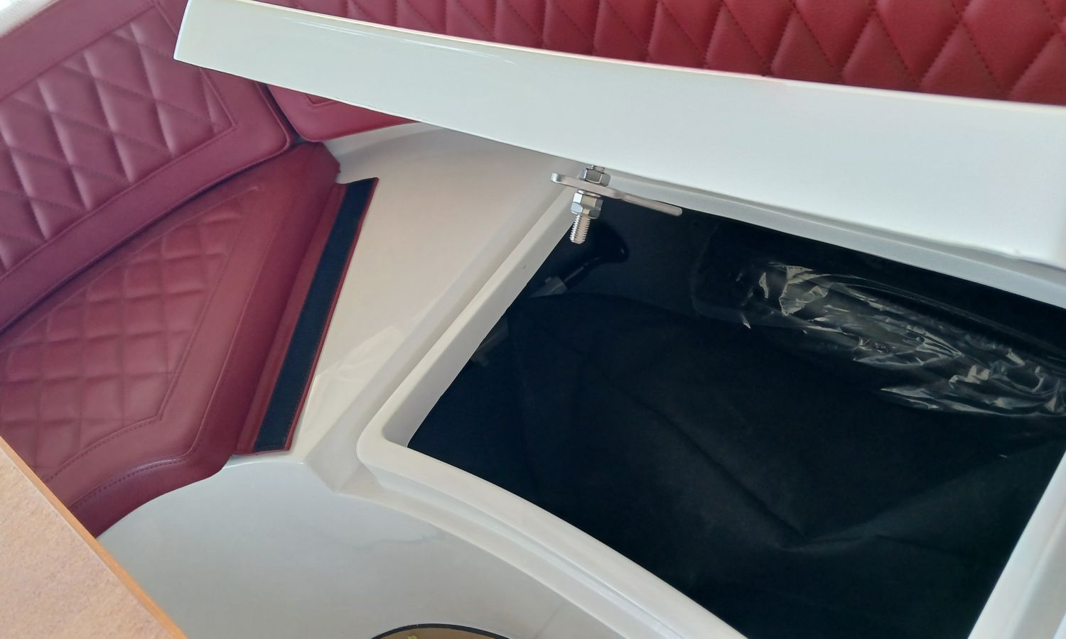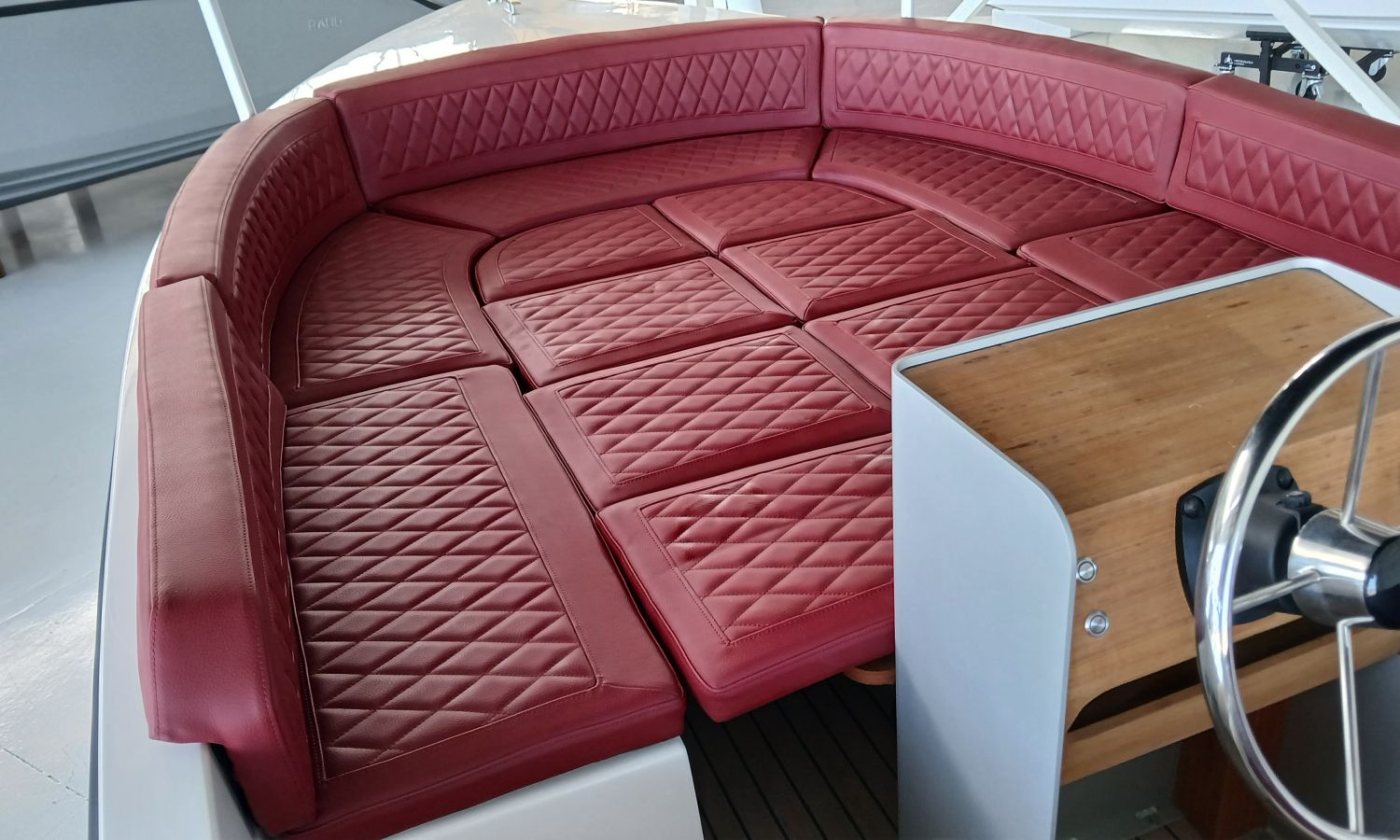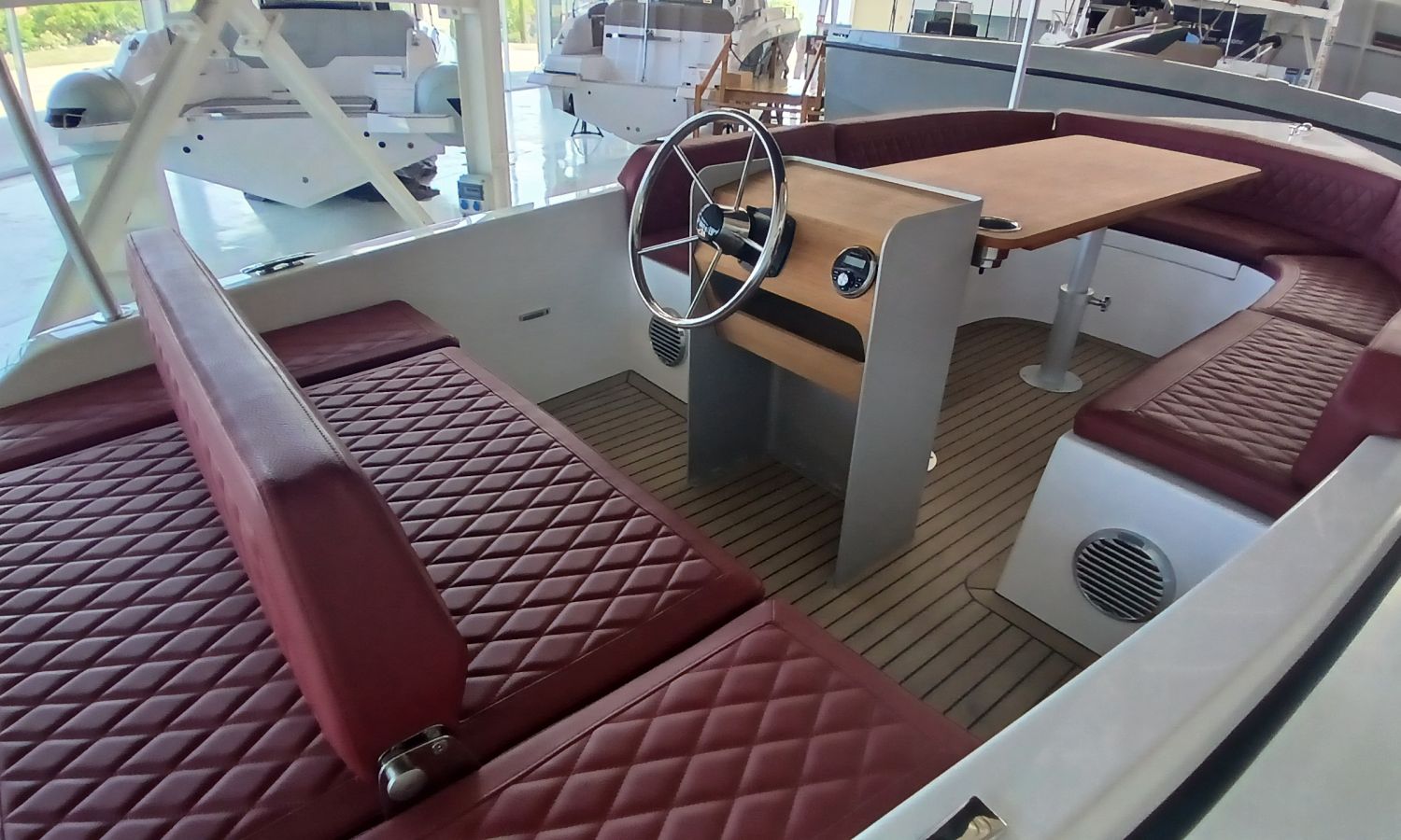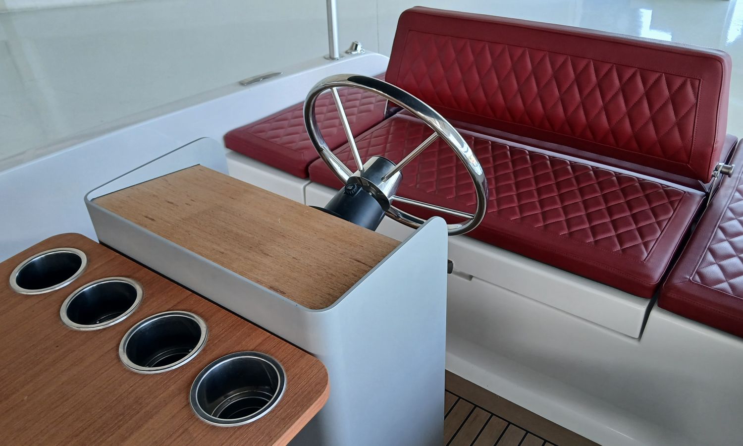 Hull custom colour White - Hima type canopy - Full anchorage cover - Swim ladder - Navigation lights - Rear co-pilot seat - Pilot seat back - Coasters - Bow solarium cushions - Fenders - Bathroom ladder - Coasters on bathtub table - Cockpit Led lights - Daimond Stitched Leadther Burgundy (BG 3161) - Transport Shipyard-Costa-Brava.Boat description