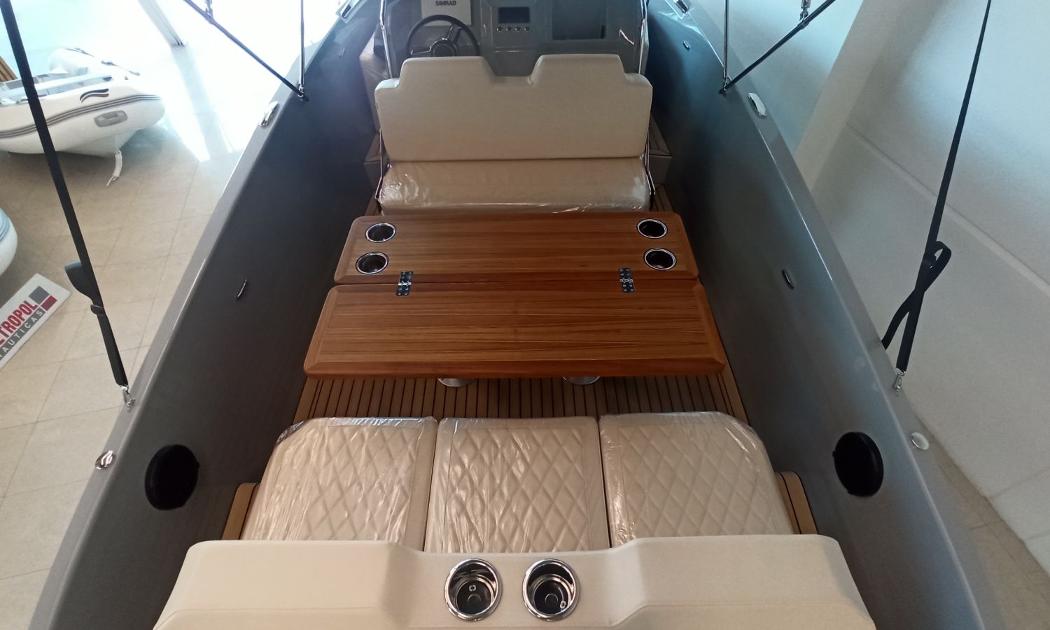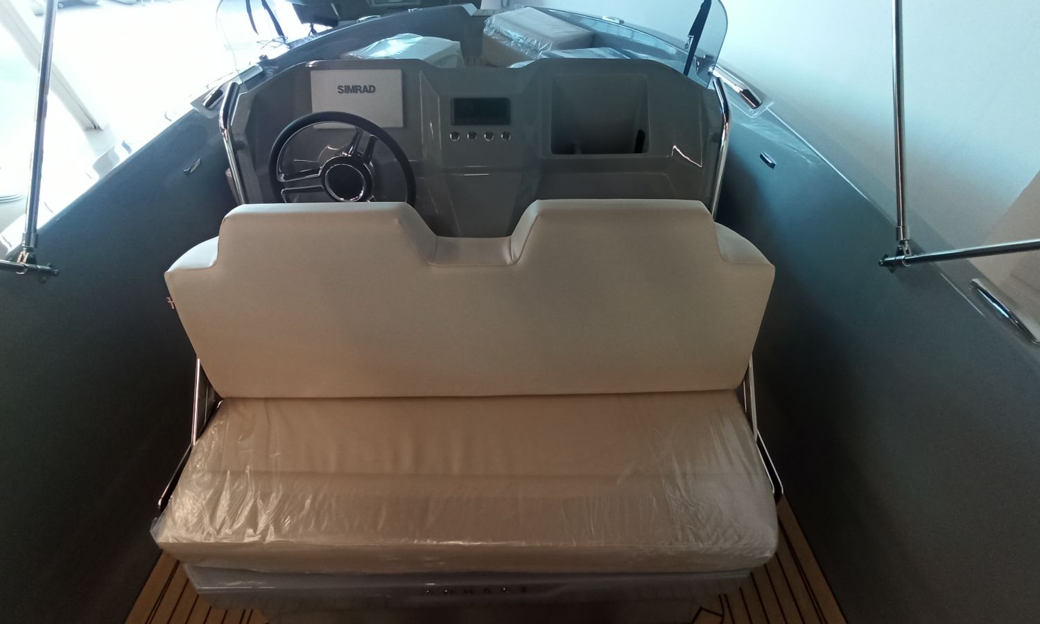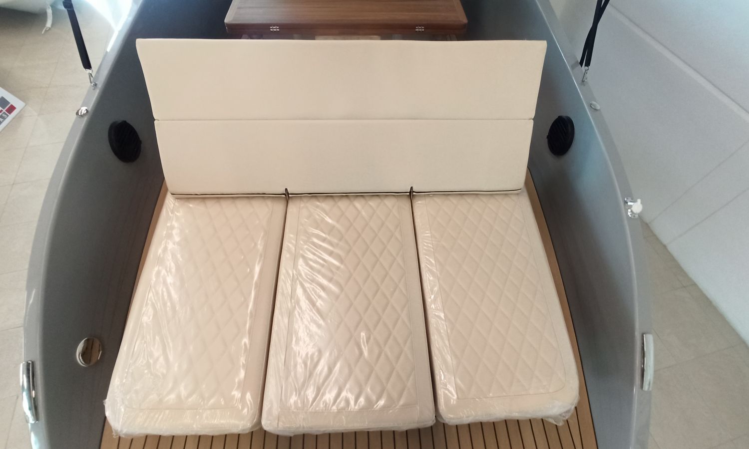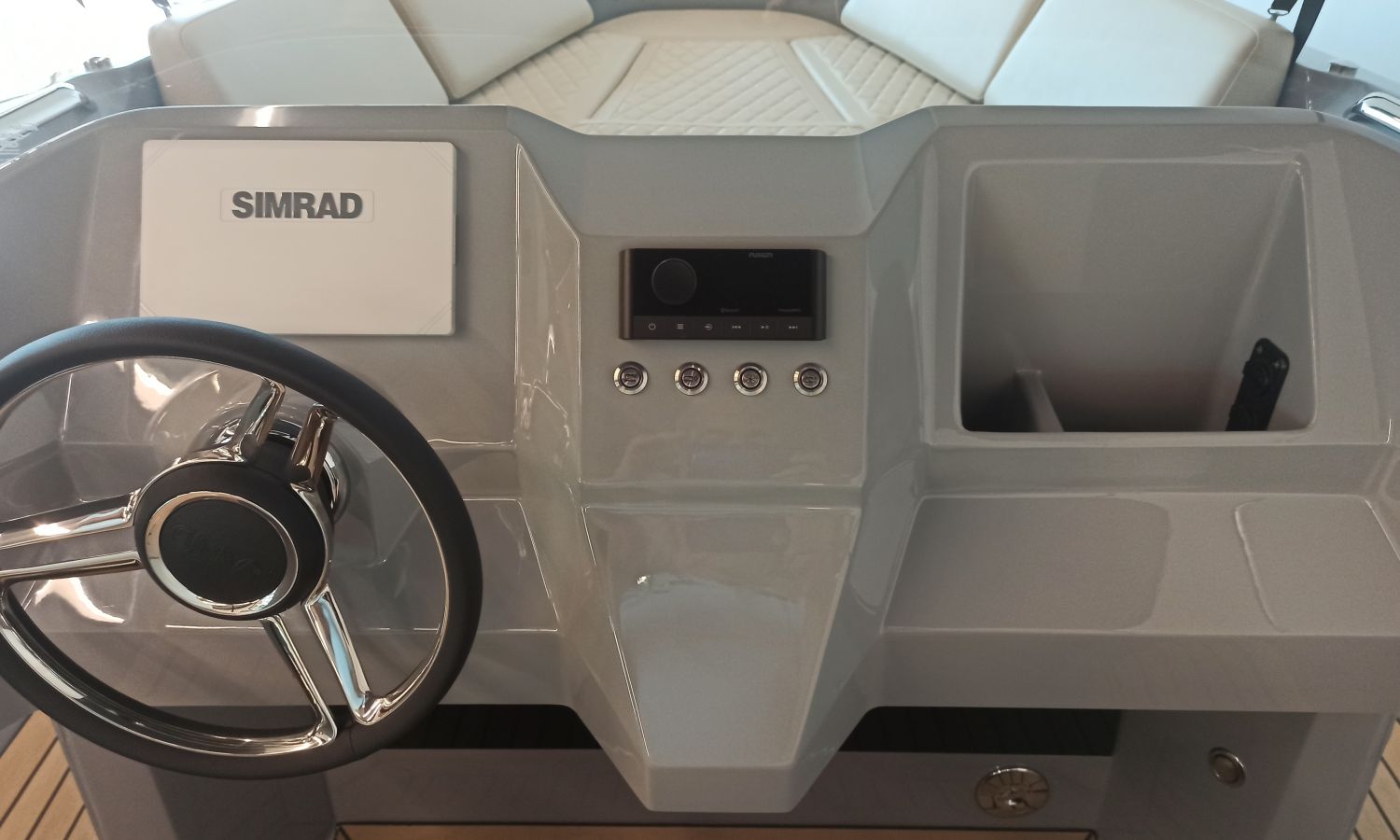 HULL COLOUR TITANIUM - DIAMOND CREEM UPHOLSTERY - WATER SPORTS HOOK - 4 STAINLESS STEEL CUP HOLDERS ON COCKPIT TABLE - STERN SHOWER - FENDERS + BRACKETS - LED LIGHTING IN COCKPIT - PREMIUM BATHING LADDER - BOW SUNDECK - BATTERY CHARGER - SUNDECK IN COCKPIT - FRIDGE IN BOW HATCH - BIMINI TOP - AUTOMATIC FLAPS-,SHIPYARD TRANSPORT - COSTA-BRAVA - MOTOR INSTALLATION + PRE-RIGGING -Boat description