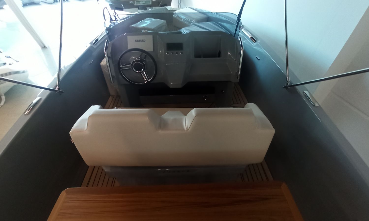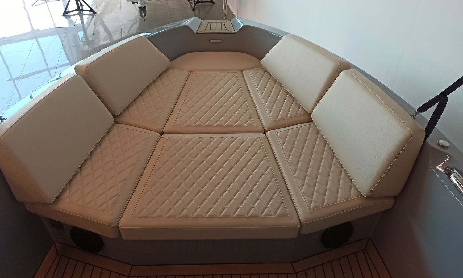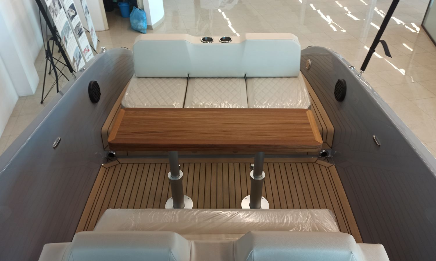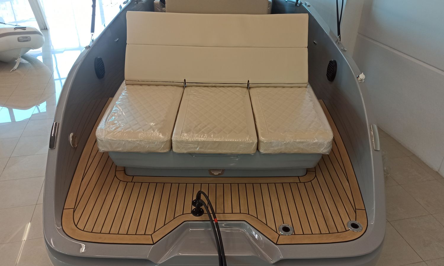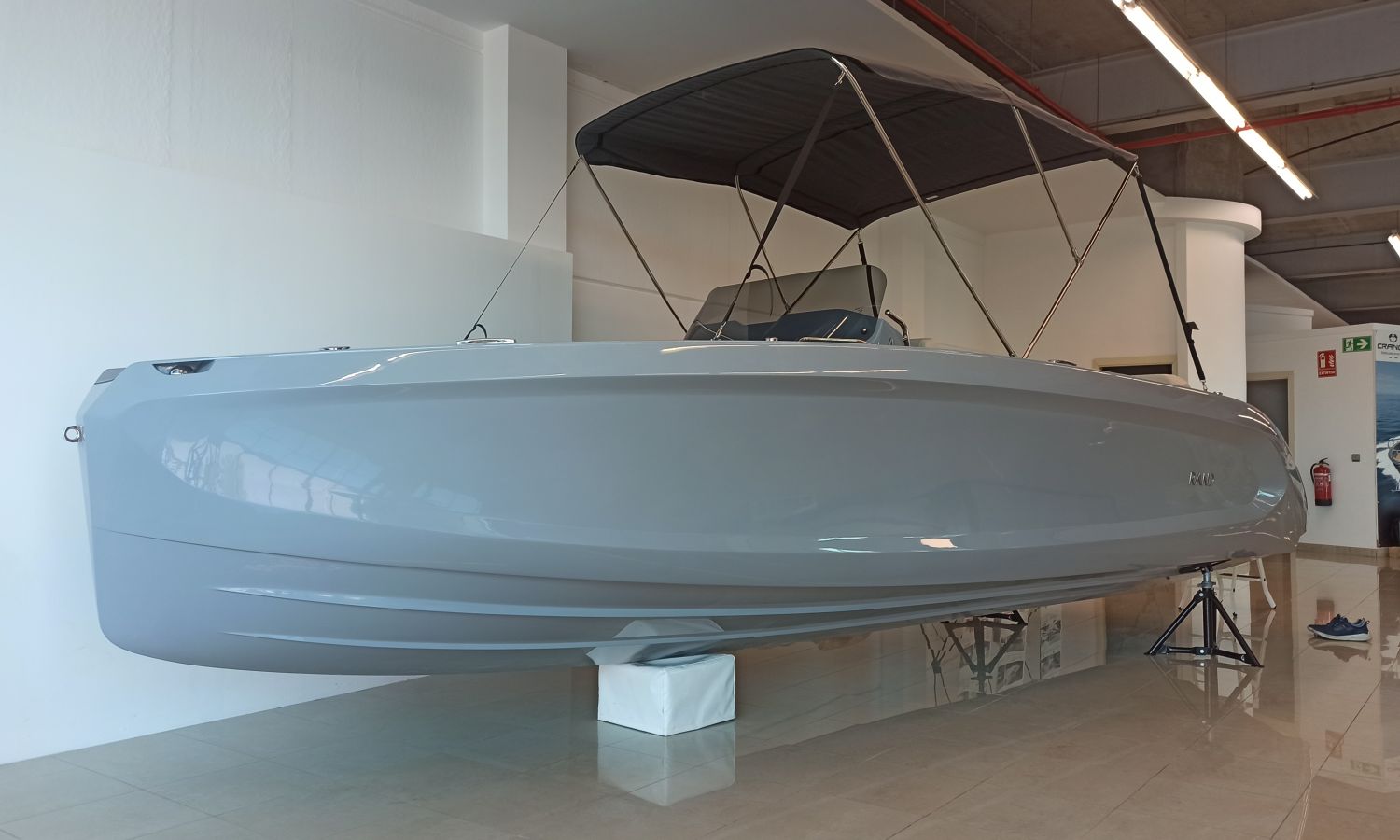 HULL COLOUR TITANIUM - DIAMOND CREEM UPHOLSTERY - WATER SPORTS HOOK - 4 STAINLESS STEEL CUP HOLDERS ON COCKPIT TABLE - STERN SHOWER - FENDERS + BRACKETS - LED LIGHTING IN COCKPIT - PREMIUM BATHING LADDER - BOW SUNDECK - BATTERY CHARGER - SUNDECK IN COCKPIT - FRIDGE IN BOW HATCH - BIMINI TOP - AUTOMATIC FLAPS-,SHIPYARD TRANSPORT - COSTA-BRAVA - MOTOR INSTALLATION + PRE-RIGGING -Boat description