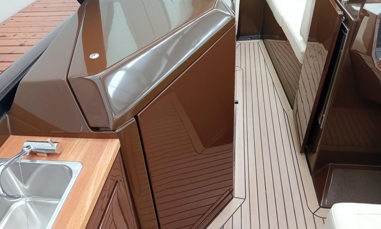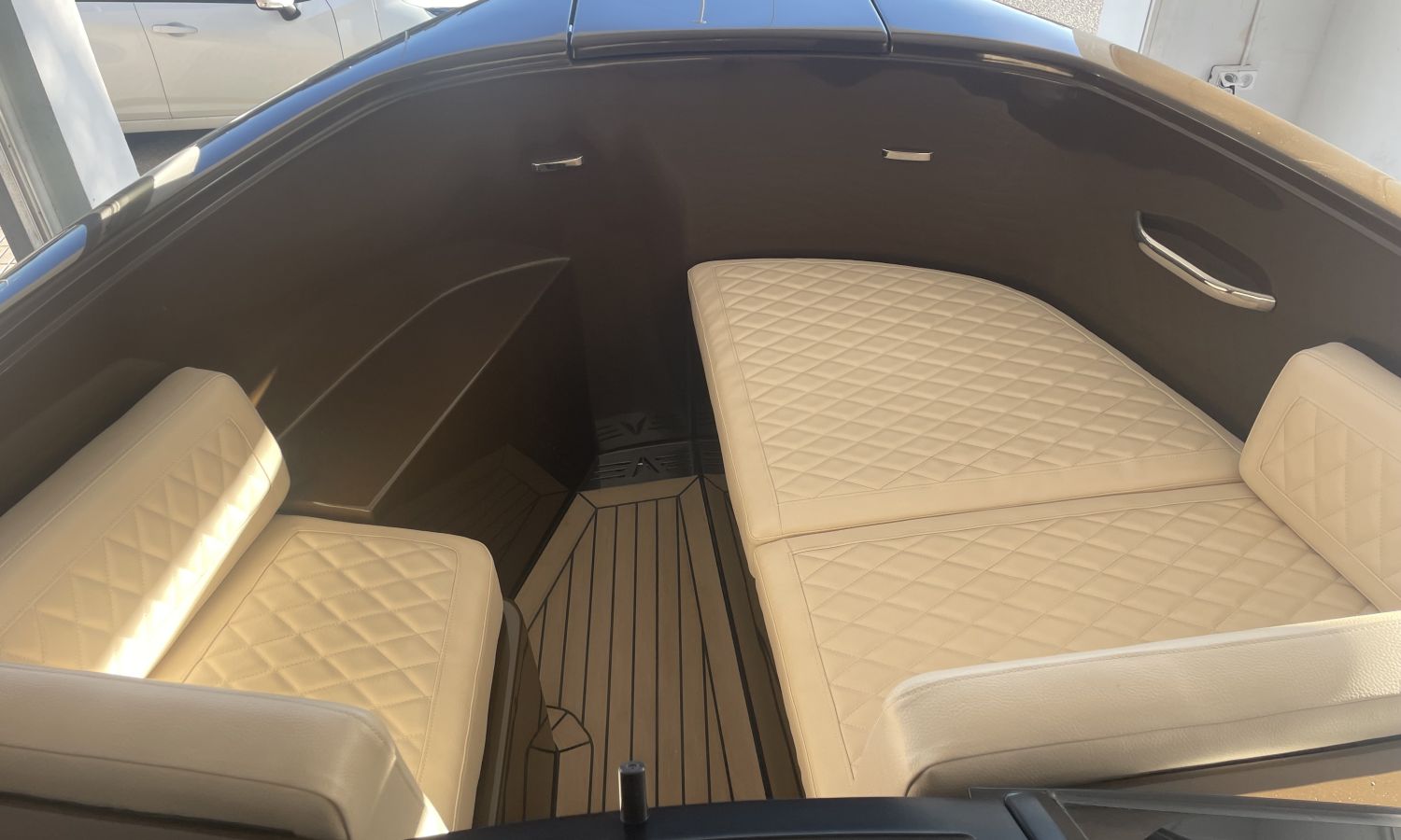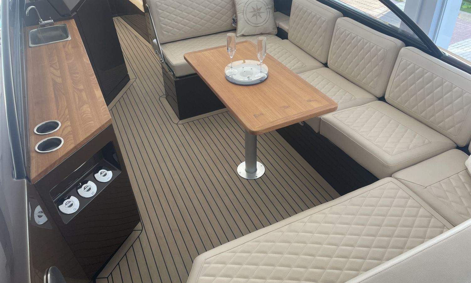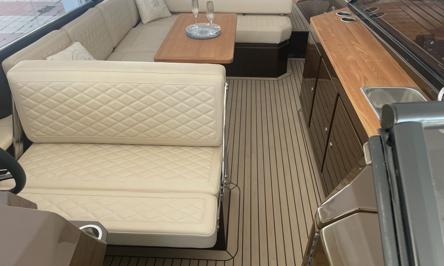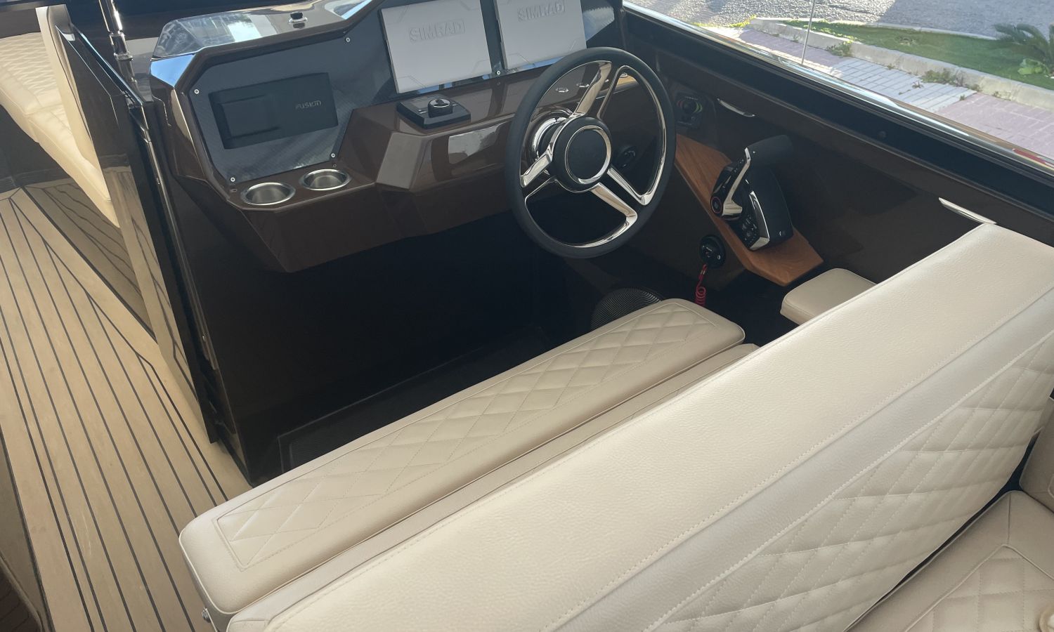 HULL COLOUR SEPIA BROWN (RAL 8014) - UPHOLSTERY IN DIAMANT CREAM (BG 3151) - FLAGPOLE WITH COVER - GALLEY UNIT ON PORT SIDE WITH SINK AND TAP - PRESSURISED WATER SYSTEM WITH COCKPIT SHOWER AND ELECTRIC MARINE TOILET WITH HOLDING TANK - BOW THRUSTER - B&O PREMIUM SYSTEM AUDIO SYSTEM - PREMIUM LED LIGHTING PACKAGE - ELECTRIC WINDLASS WITH ANCHOR AND CHAIN - SKI HOOK - LUXE COOLER - 2ND LUXE COOLER - PREMIUM BATHING LADDER - ZIPWAKE AUTOMATIC TRIM TABS - DEPTH SENSOR - MOORING COVER - OVERHEAD BATTERY SYSTEM - 2 220V PORT SOCKETS - INVERTER - BATTERY CHARGER - SHIPYARD-COSTA-BRAVA TRANSPORT.