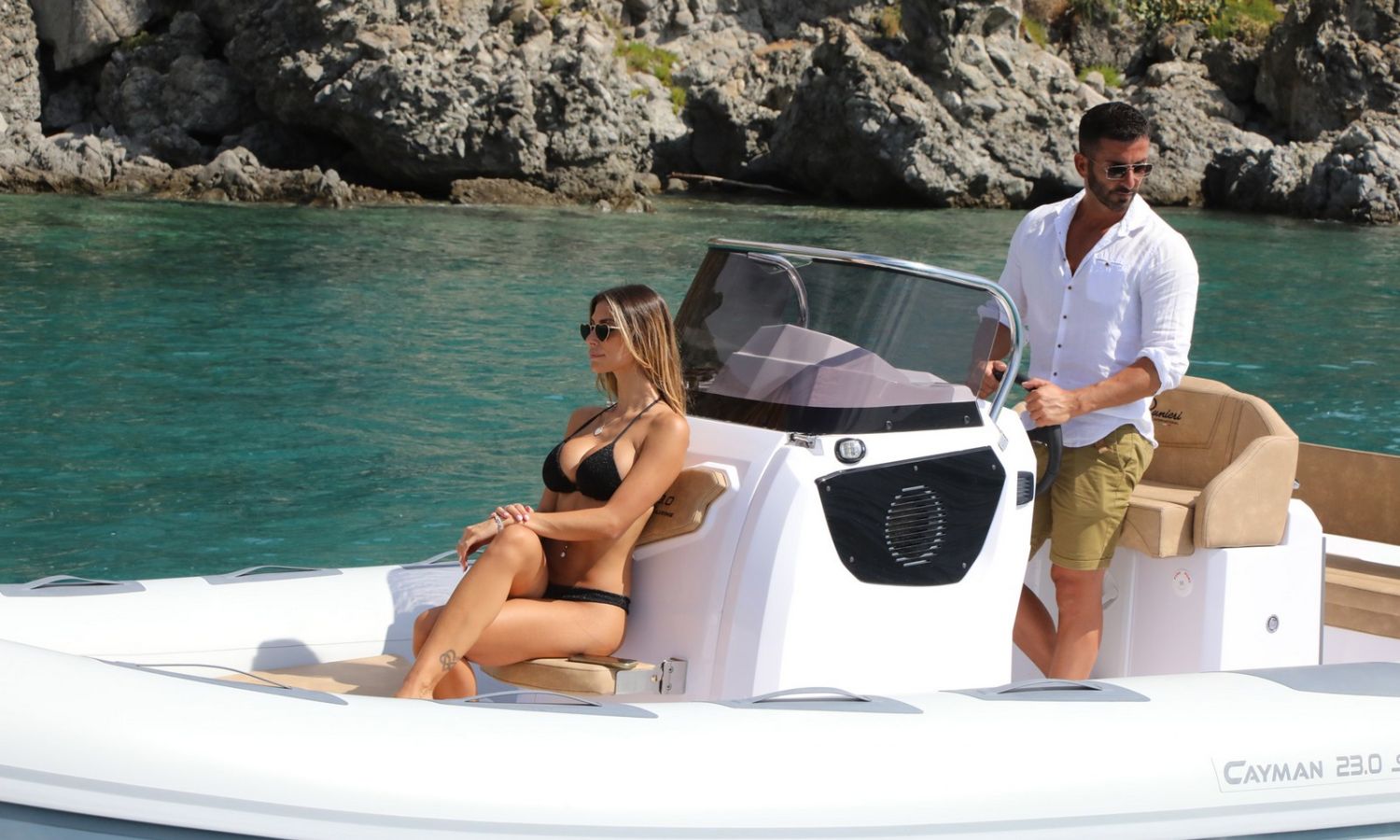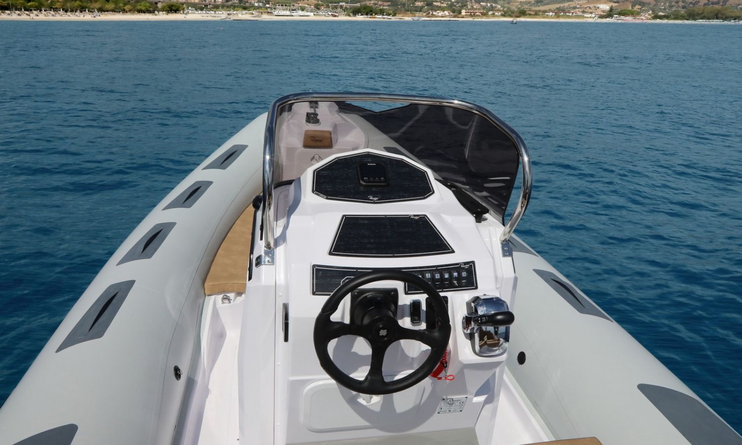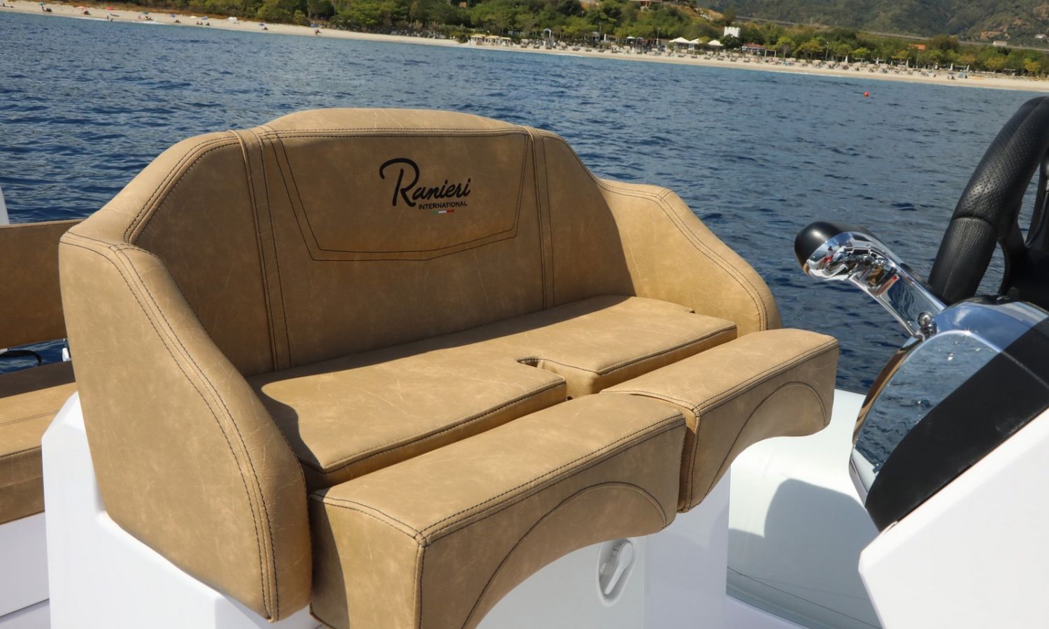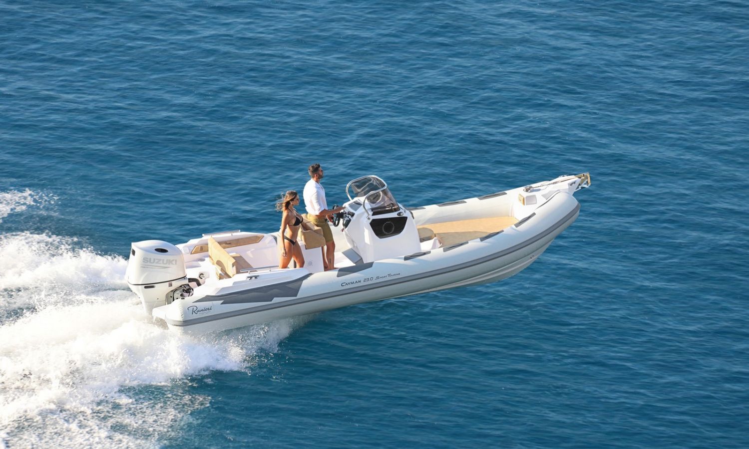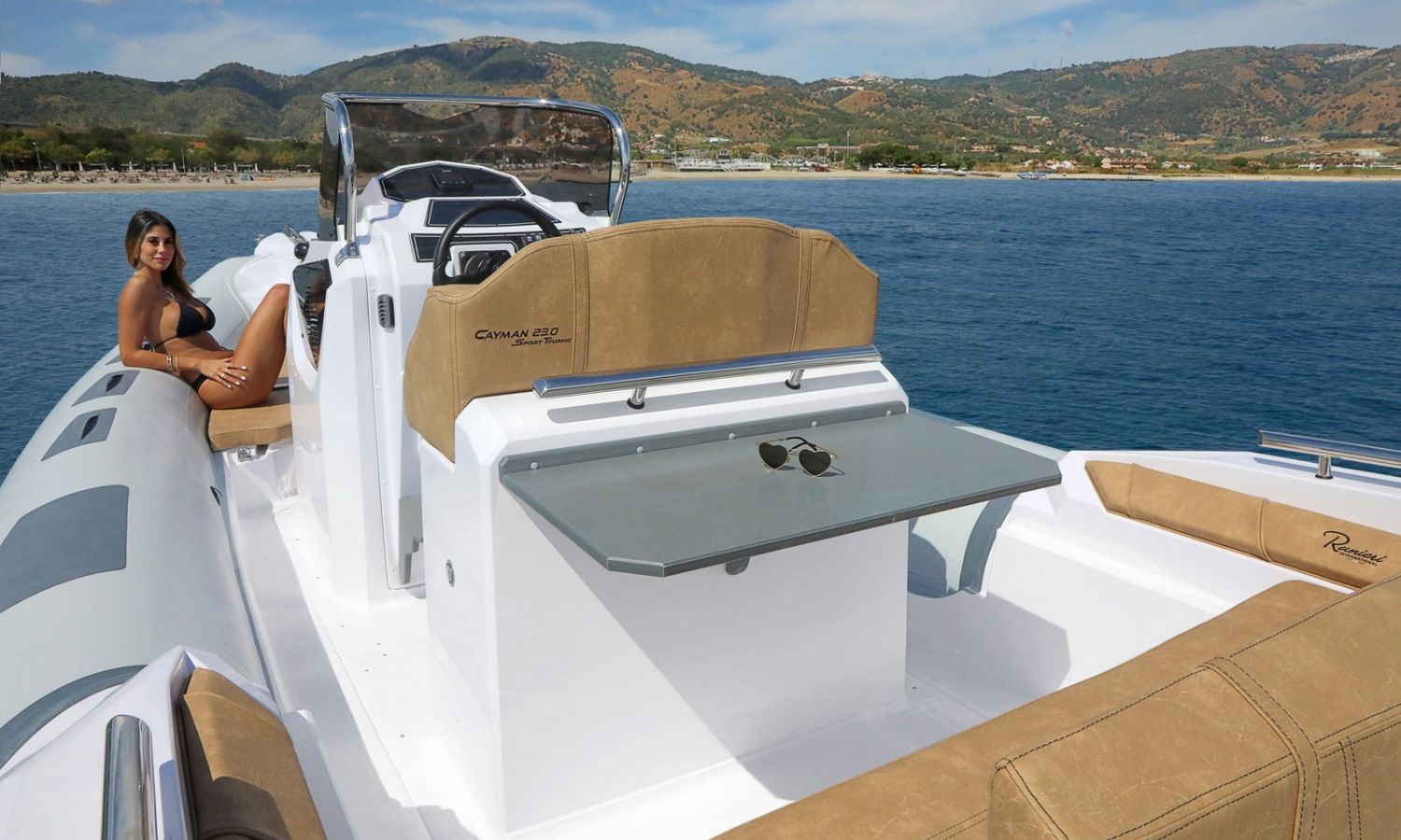 This Ranieri Cayman 23.0 is the smallest of the Sport Touring range. But big on performance and sporty design!Some standard accessories of this model are the complete console with Luxury dashboard, the wide bow sundeck with cushions, navigation lights, electrical panel, fiberglass stern platforms with telescopic ladder, several storage lockers, battery switch, hydraulic steering, etc.