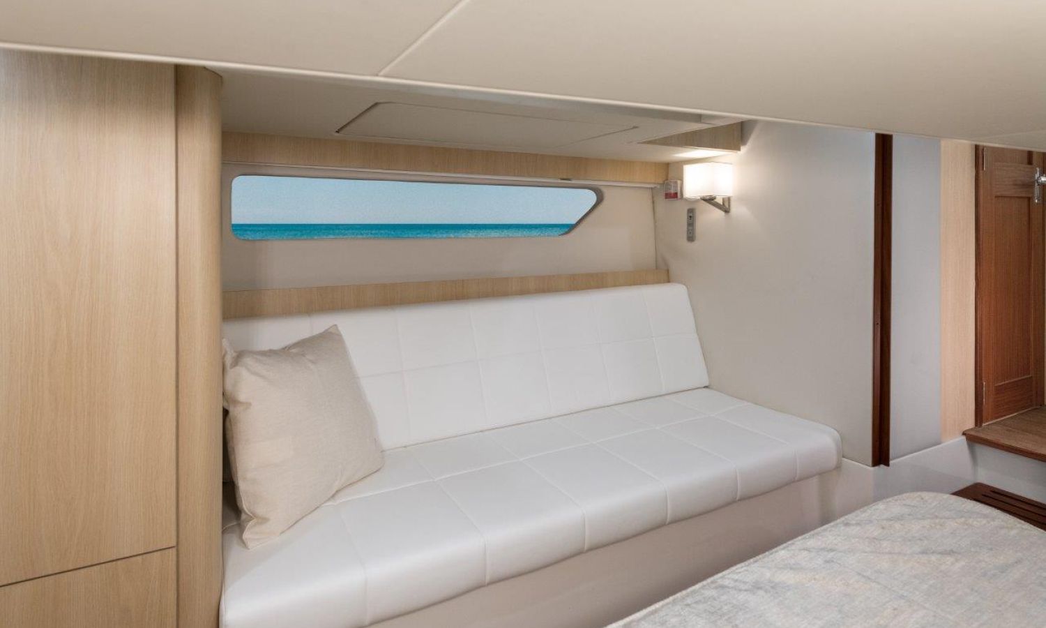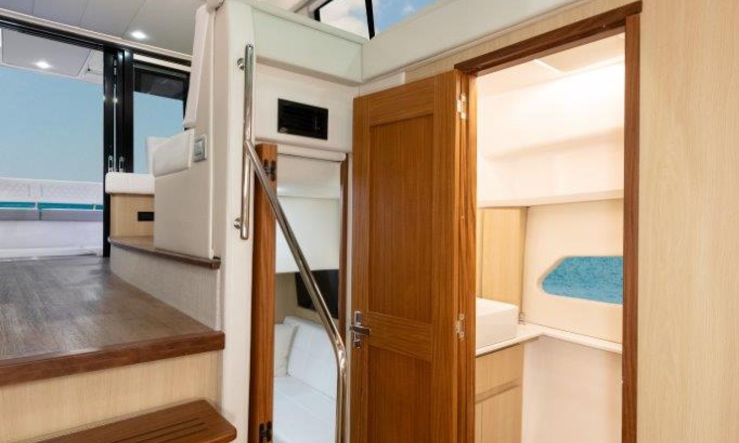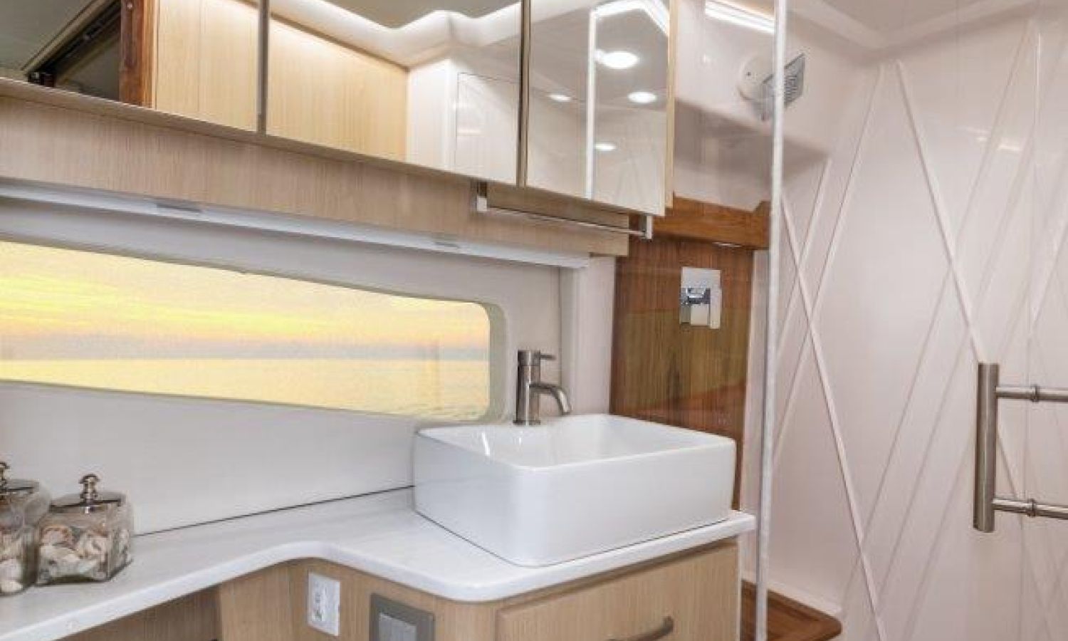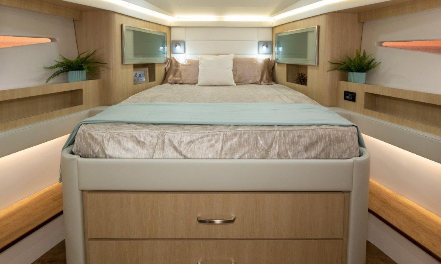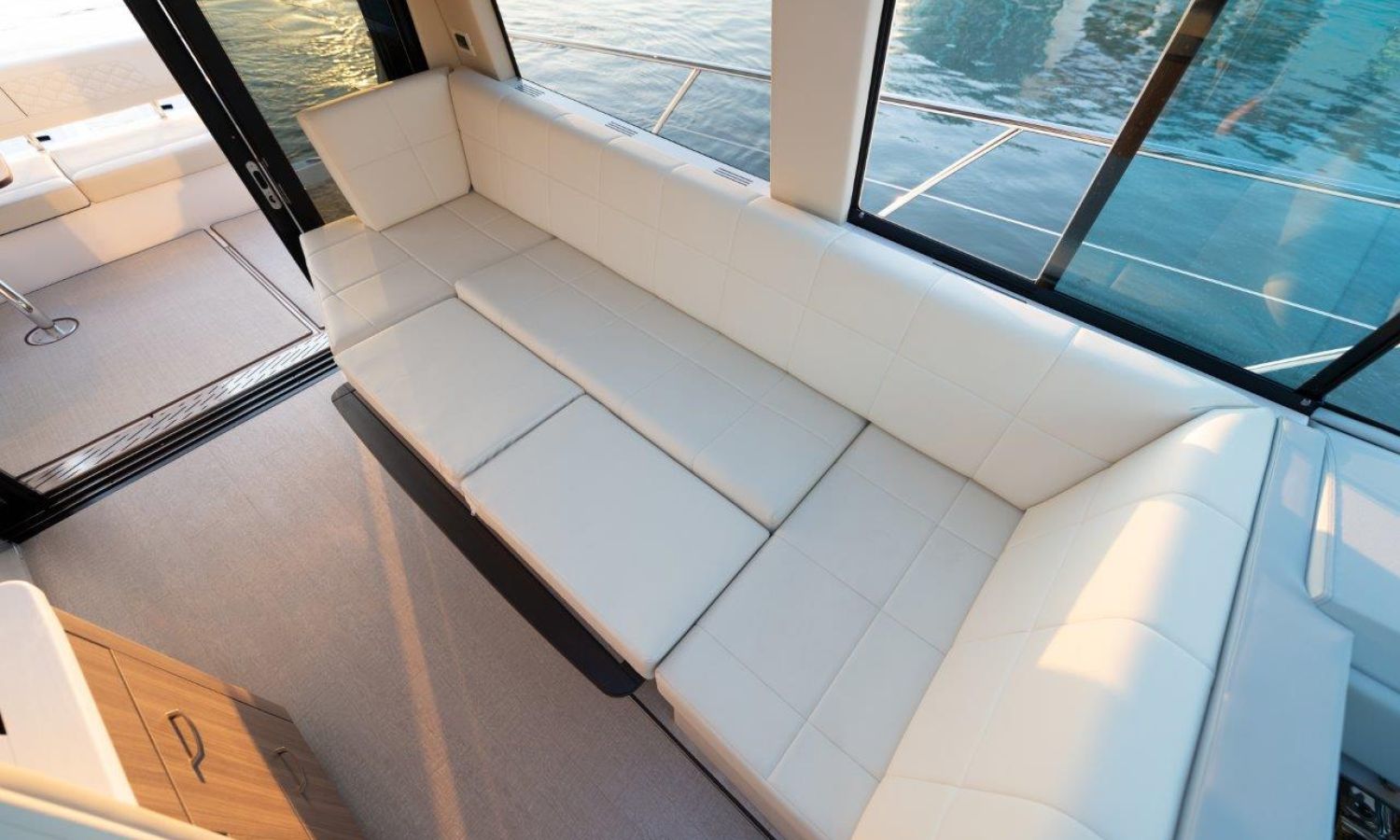 Open up new horizons with the 42 XO. Its beautifully crafted cabin features a spacious layout with options of a second head or lower refreshment center. The standard on-suite head boasts of premium materials and a separate walk-in shower. Upstairs, the full-beam retractable hardtop, opening side windows, and sliding glass doors combine the upper salon and aft patio to ultimately embrace outdoor living and entertaining.